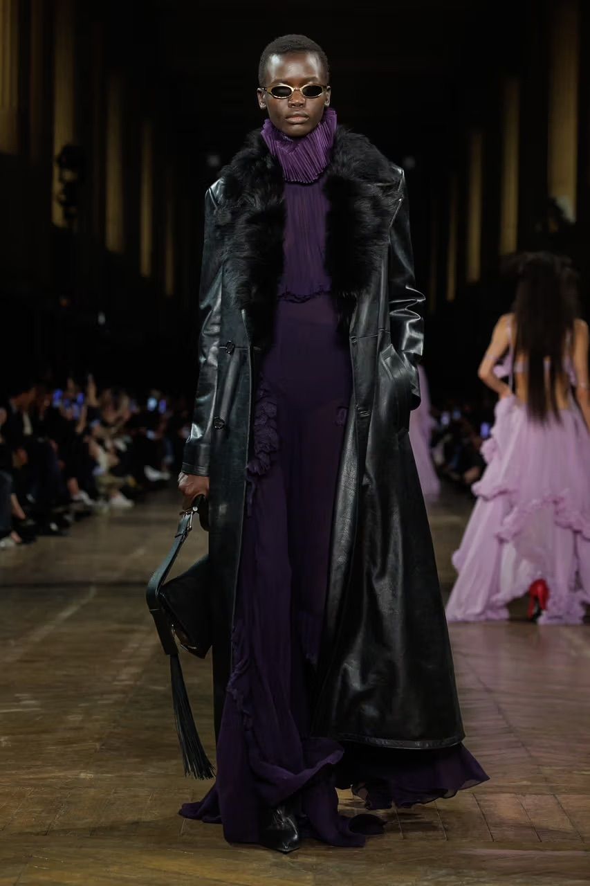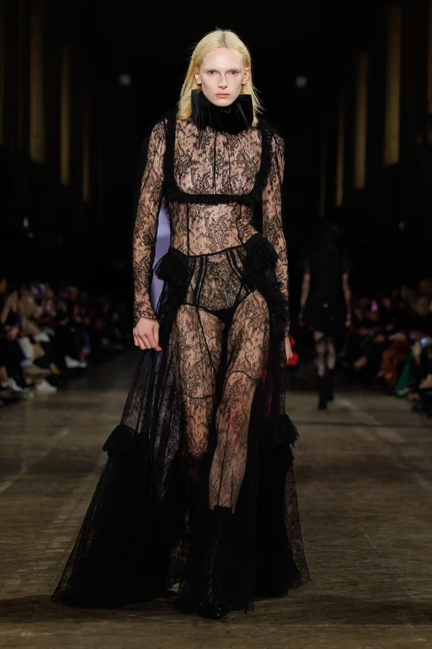I colletti vittoriani sono stati protagonisti della collezione FW25 di Seán McGirr per McQueen. Affascinato dall’immagine del dandy maledetto, McGirr ha realizzato colletti alti in pizzo che quasi schermavano il viso: il tessuto era piegato a fisarmonica come fosse una sorta di ventaglio circolare. I flâner di questa sfilata, come definiti dallo stesso McGirr, indossano camicie con jabot e polsi ricoperti da ruche portate sotto mantelli, abbinate a cappelli a falda larga realizzati da Philip Treacy, ispirati ai personaggi dei romanzi di Oscar Wilde e, in modo particolare, all’immagine della bellezza misteriosa e malvagia di Dorian Gray. Questa fascinazione per i costumi d’epoca costituisce parte del DNA del brand. Alexander McQueen ha sempre arricchito le sue sfilate con riferimenti all’abbigliamento tipico del periodo elisabettiano e vittoriano sin dalla sua prima collezione di debutto del 1992 intitolata Jack the Ripper Stalks His Victim nella quale ritroviamo il frock coat, il cappotto con coda (una sorta di frac ante litteram) tipico di quel periodo storico ricoperto da una stampa con fili spinati. A tal proposito, Lady Gaga nel videoclip di Abracadabra ha scelto un look volutamente ispirato ad un abito di Alexander McQueen risalente a una collezione dello stilista inglese per Givenchy. Recentemente, per il suo show da headliner al Coachella, la "Mother of Monsters" ha indossato una gorgiera fatta di spine appuntite su un abito dalle silhouette elisabettiane “rosso bloody mary” ispirato alla figura di Lady Macbeth, con un’ enorme gonna che in realtà si apriva come un sipario e nascondeva un’impalcatura a forma di gabbia dentro la quale si esibiva il corpo di ballo.