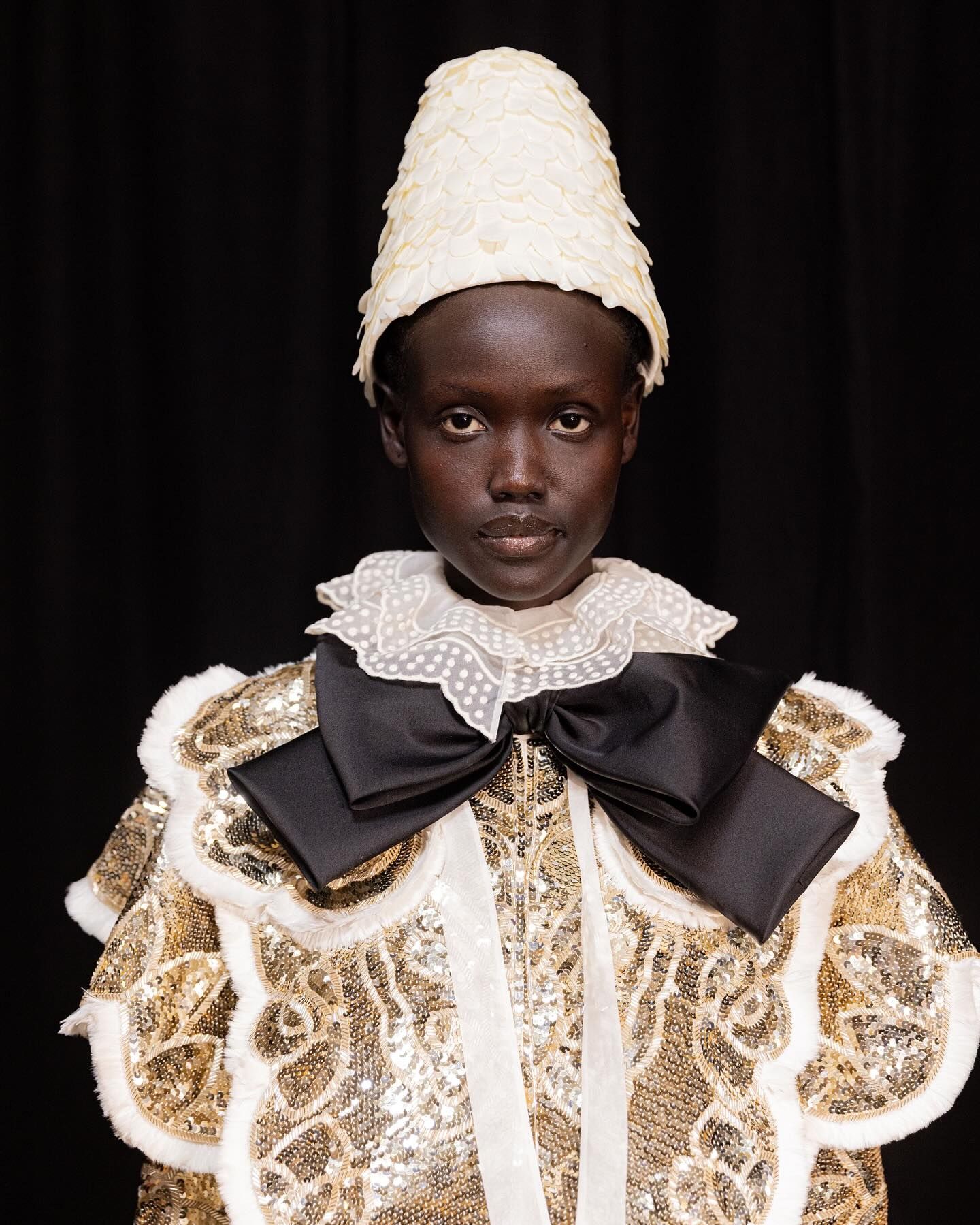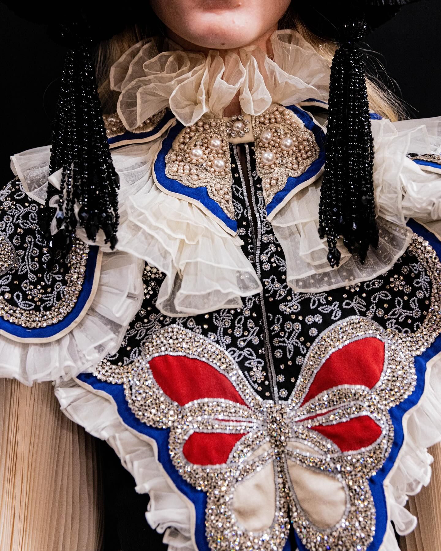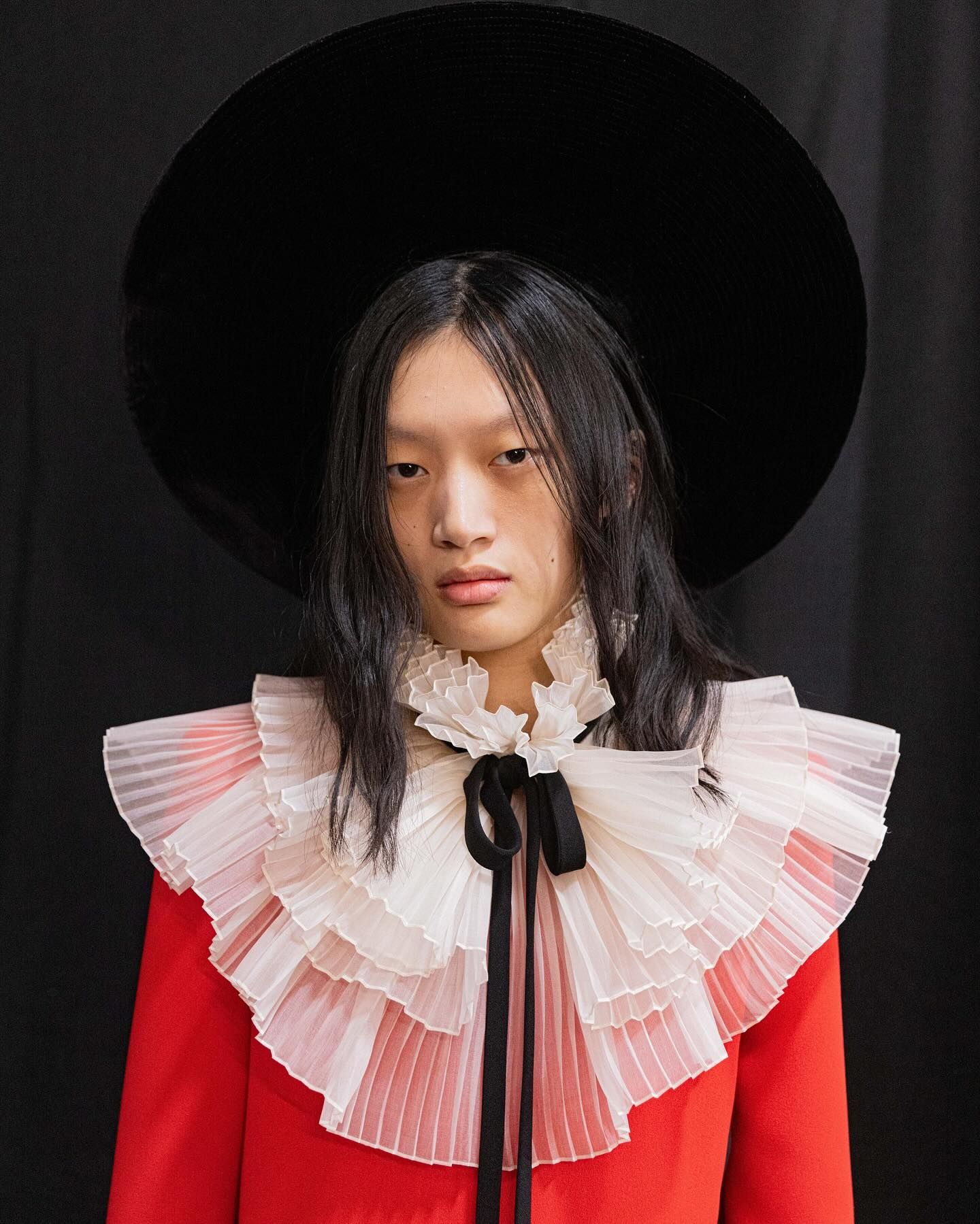 Complice il ritorno del gotico, del medieval core e dell’estetica dandy, si può osservare nelle collezioni presentate durante le ultime fashion week l’utilizzo di ruff collar – colletti con ruche declinati dai designer nelle loro varianti storiche. L’emergere di questo specifico trend ci permette di riflettere su come tale oggetto sia interconnesso con estetiche storiche differenti, che a loro volta si sono manifestate oggi come micro trend contemporanei, nelle quali il colletto aveva usi e significati precisi. Questo accessorio, che evoca l’immagine di una regalità austera, ma anche dello sfarzo e del gioco, ha affascinato i creativi del fashion system che l’hanno reinterpretato contaminandolo con capi quotidiani e contemporanei. Nel cinquecento, questi colletti plissettati adornavano le scollature delle camicie di uomini e donne appartenenti prevalentemente a classi agiate. Durante la golden age, questi accessori vennero impreziositi con gioielli e ricami e costringevano chi li portava ad assumere una posizione altezzosa, ma estremamente scomoda tanto che alla corte dei reali inglesi dovettero inventare degli utensili e posate speciali per lo svolgimento delle attività quotidiane. Con il passare del tempo, i ruff collar tornarono ad essere portati in una versione più comoda e leggera e non furono indossati solo dai nobili, ma divennero anche elemento decorativo dei costumi di pagliacci e giullari di corte, oltre a costituire un simbolo identificativo di alcune maschere tradizionali del carnevale come Arlecchino e Pulcinella. Per questo motivo, questi accessori storici sono conosciuti oggi anche come clown collar o colletti alla Pierrot.