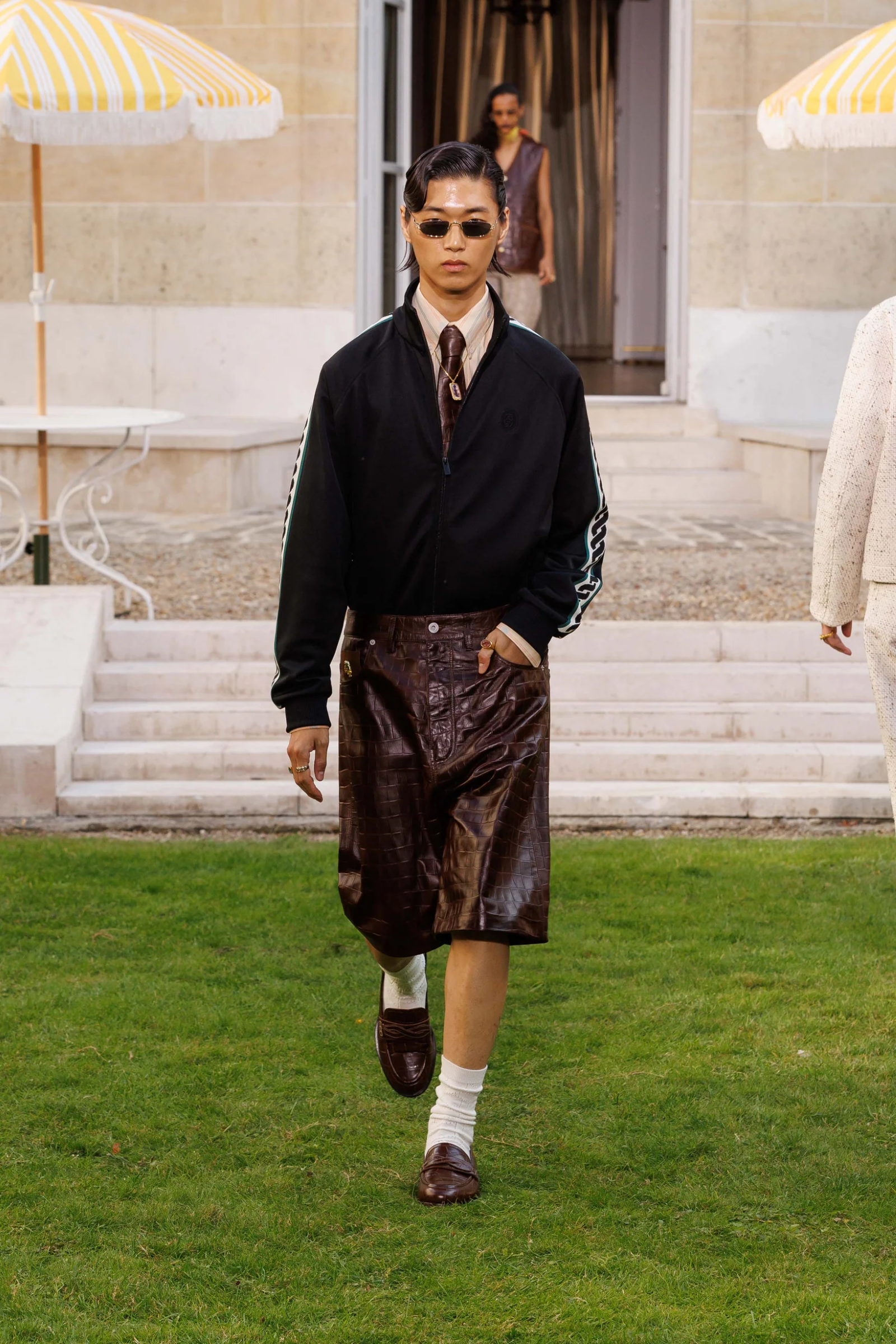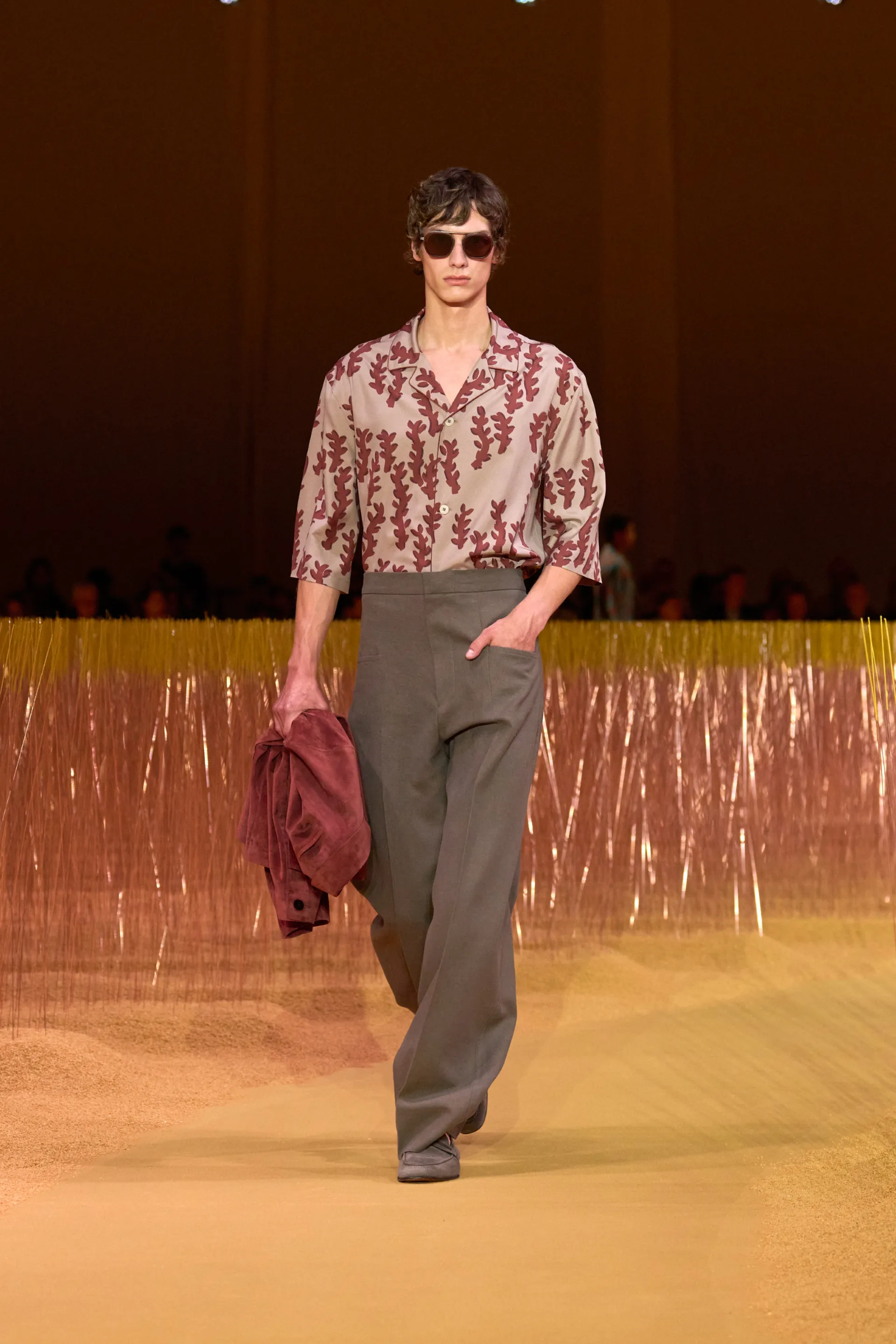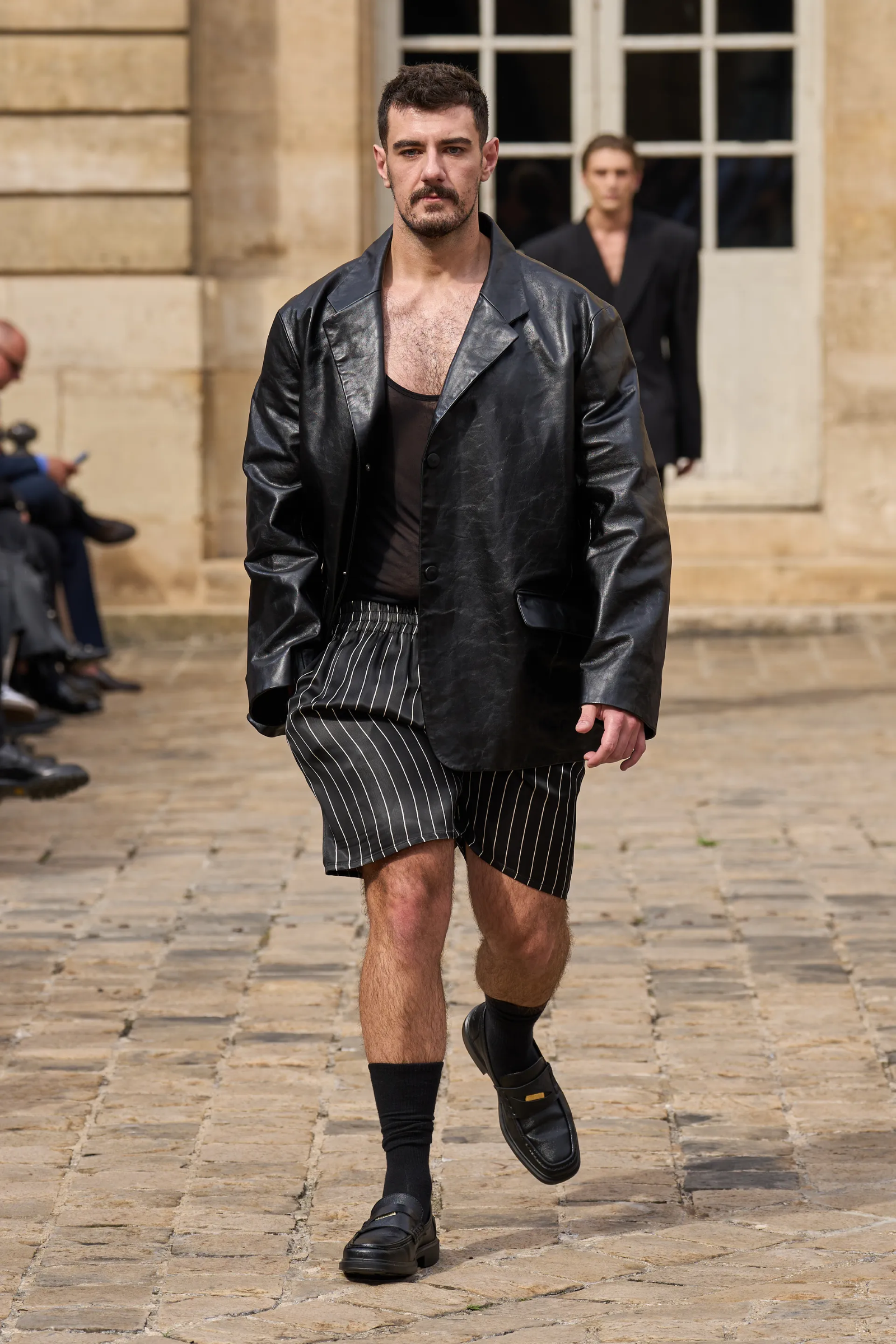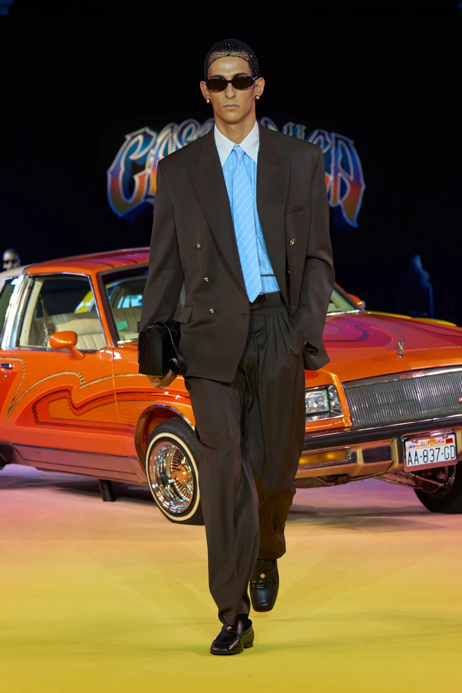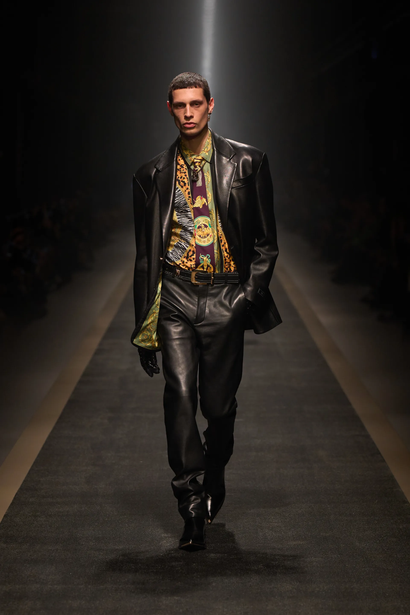 Le tracce di questa influenza si possono ritrovare più facilmente non solo nello stile promosso da pagine come @uniformdisplay, dove il preppy e l’estetica utility si incontrano in un tripudio di pantaloni oversize, camicie con pattern vivaci, track jacket indossate con pantaloni di sartoria, mocassini abbinati a jorts e via dicendo; ma anche nelle collezioni delle ultime stagioni dove l’originario spirito iper-mascolino dello stile de I Soprano è diventato uno strumento di decostruzione della mascolinità stessa. Nelle scorse stagioni, ad esempio, abbiamo visto un forte ritorno delle camicie à-la-Tony Soprano tanto da brand insospettabili come Hermès o Zegna, dove queste camicie o polo in maglia erano protagoniste degli show SS25, sia da brand più abituati a estetiche più vistose come Dolce&Gabbana, Amiri, MSGM e Aimè Leon Dore. Altri brand come ad esempio Magliano o Our Legacy, ma anche Marine Serre ma anche Casablanca o il messicano Campillo, hanno portato in passerella completi grigi e molto ampi abbinati a strati sottostanti dai colori contrastanti o addirittura in pelle, cercando quel senso quasi materico di “invecchiato” che è lo stesso dei molti completi visti nelle puntate de I Soprano. Da Louis Vuitton, nella Pre-Fall 2025, c'era un accappatoio che Tony avrebbe sicuramente indossato. Anche severi blouson e blazer di pelle hanno avuto il loro momento, specialmente da Versace, combinati a camicie di seta variopinte, da Dsquared2 e da Lemaire, ma soprattutto da LGN – Louis Gabriel Nouchi che ha anche fatto indossare la sua giacca di pelle a un modello plus-size la cui fisicità era la medesima di quella dei protagonisti della serie. Ma forse è stata la track jacket a emergere come pezzo più caldo: era ovviamente da Balenciaga e da Martine Rose – ma soprattutto da Willy Chavarria, designer la cui sensibilità e le cui silhouette maschili sarebbero perfette per un odierno remake de I Soprano.