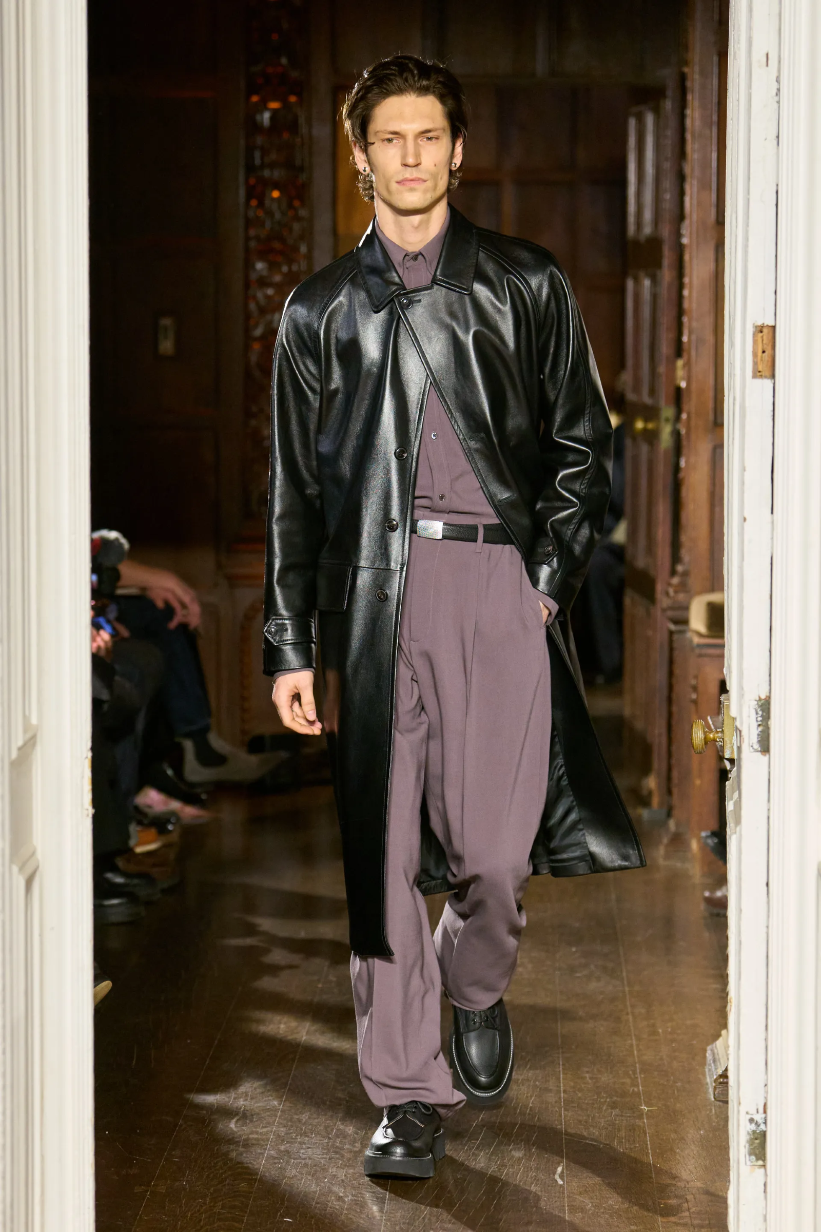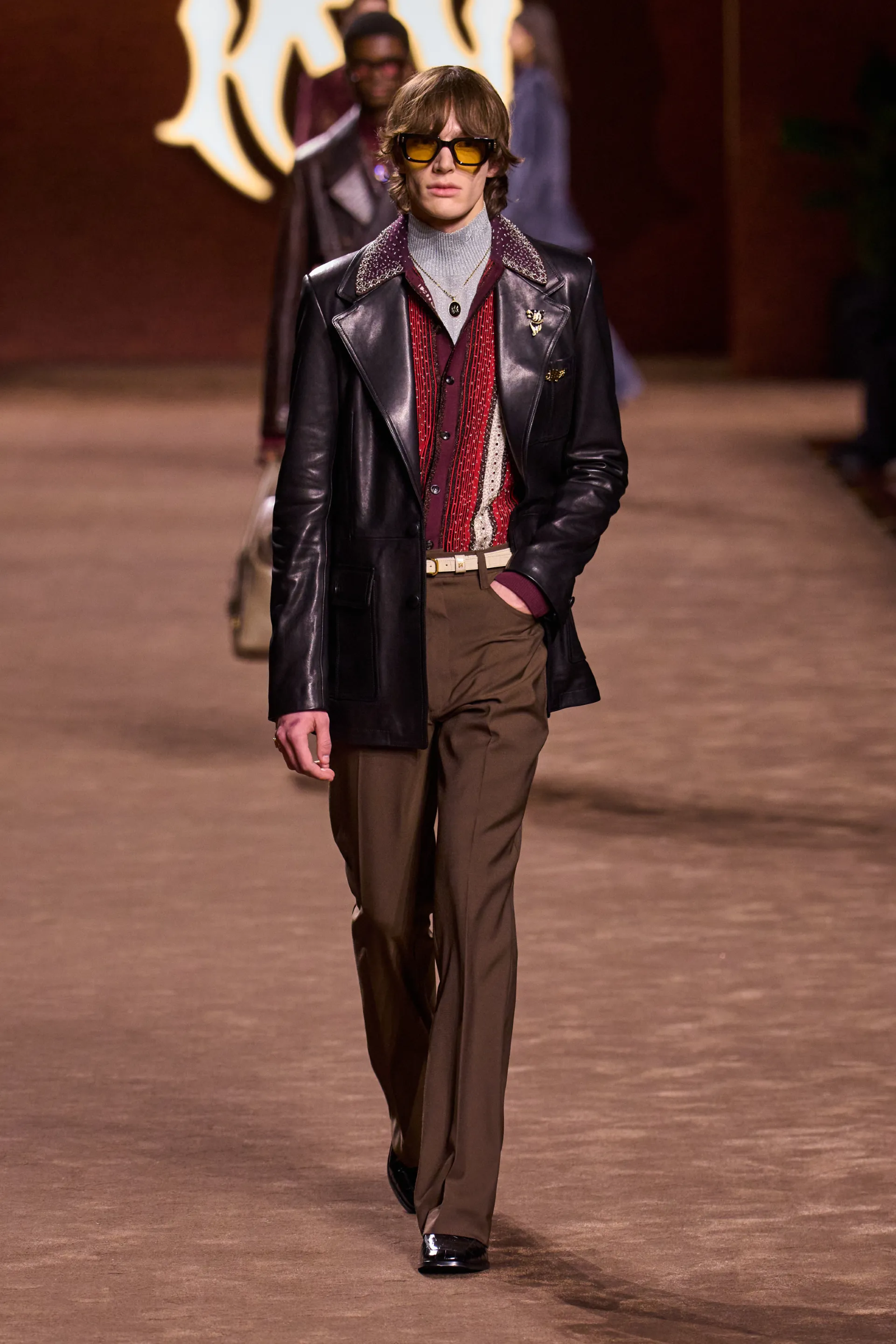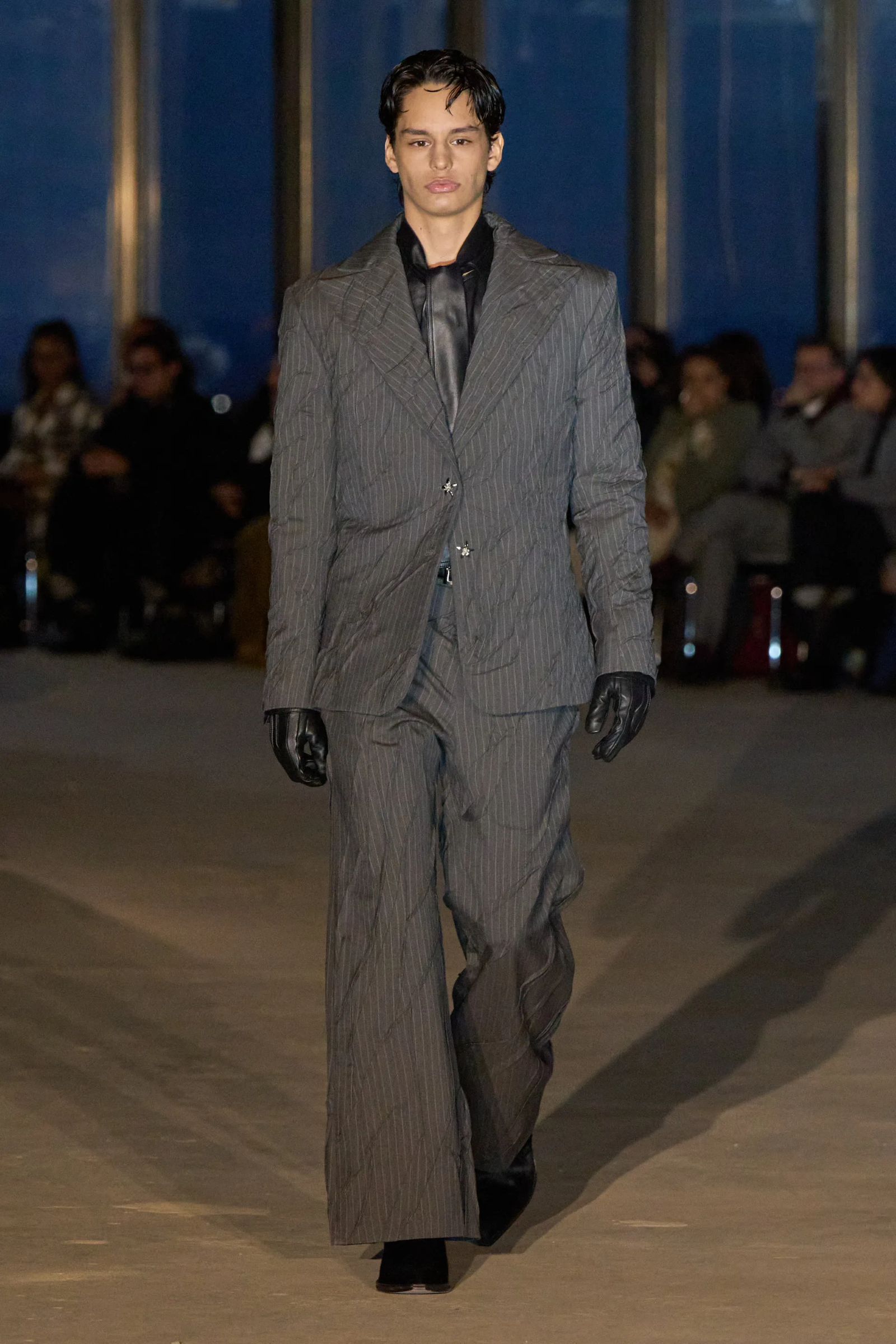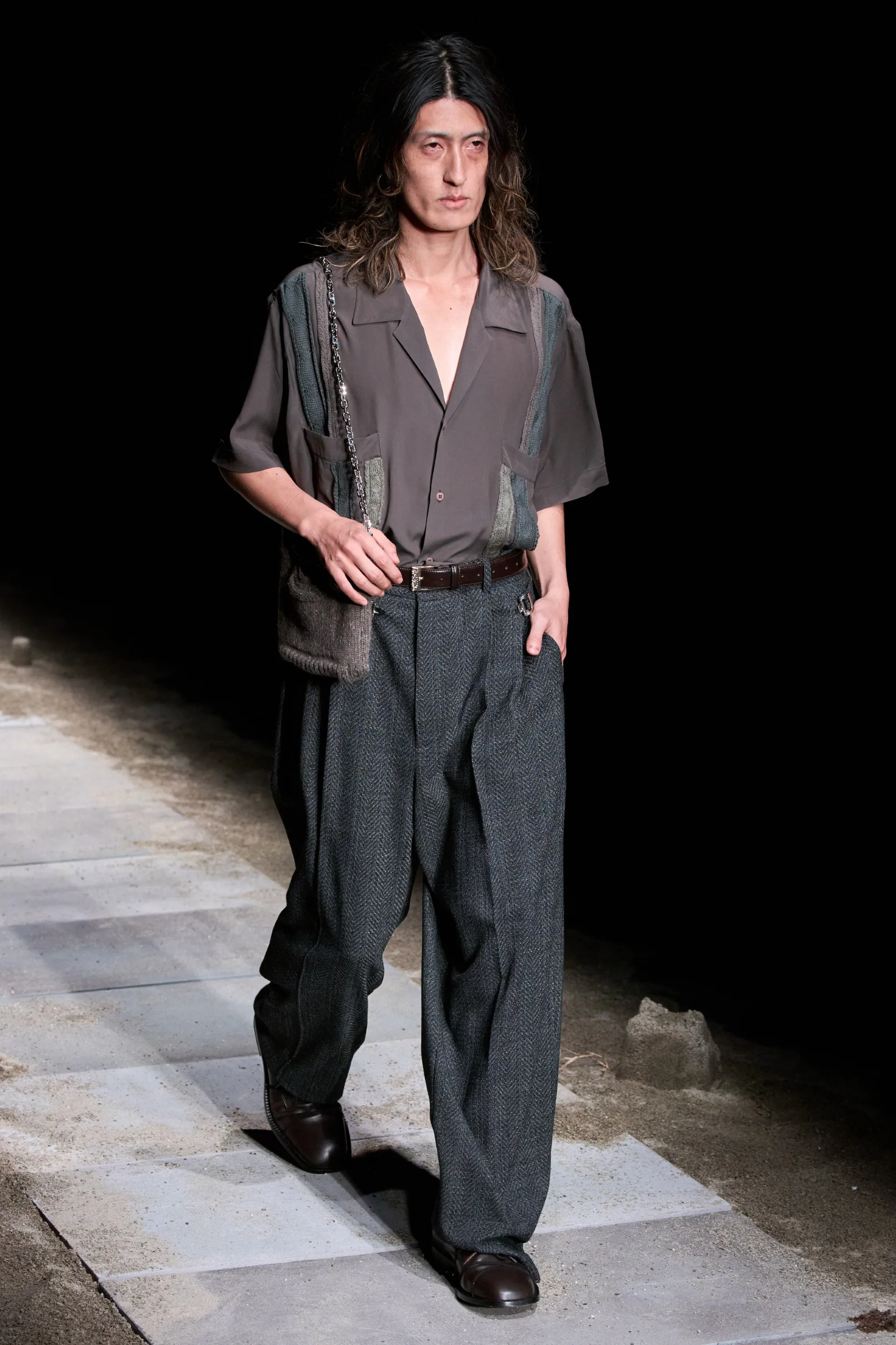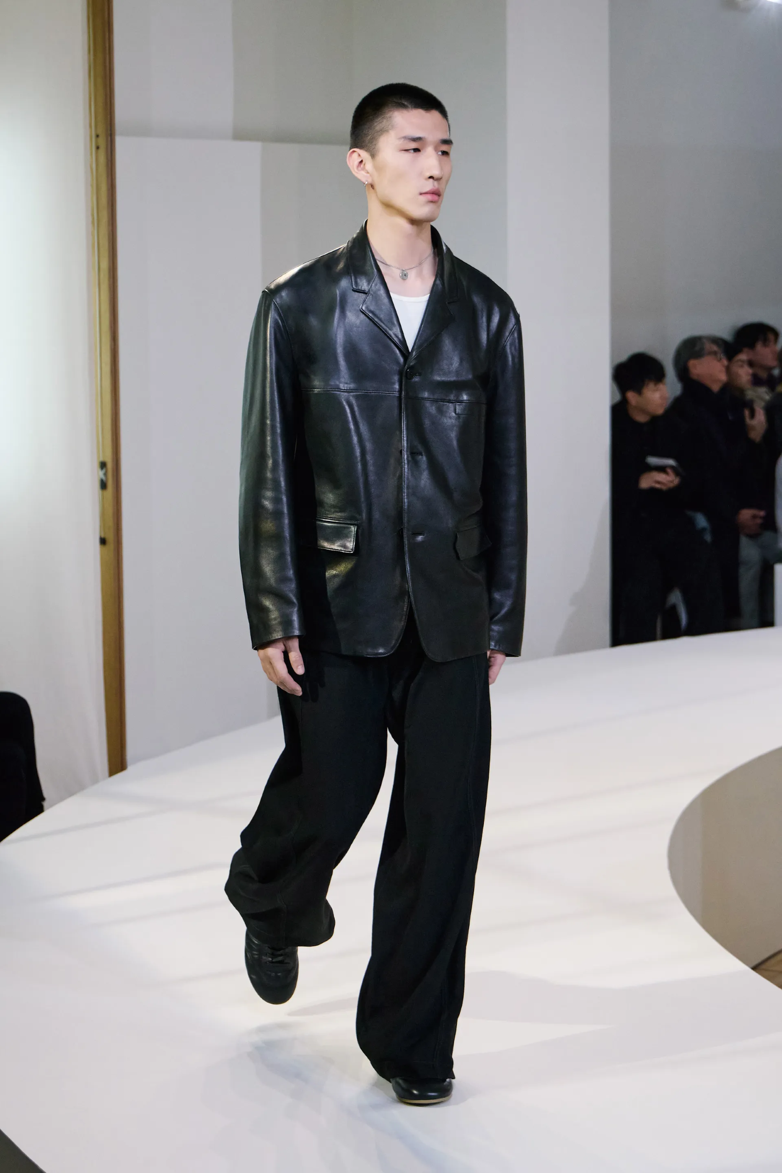 Le tracce di questa influenza si possono ritrovare più facilmente non solo nello stile promosso da pagine come @uniformdisplay, dove il preppy e l’estetica utility si incontrano in un tripudio di pantaloni oversize, camicie con pattern vivaci, track jacket indossate con pantaloni di sartoria, mocassini abbinati a jorts e via dicendo; ma anche nelle collezioni delle ultime stagioni dove l’originario spirito iper-mascolino dello stile de I Soprano è diventato uno strumento di decostruzione della mascolinità stessa. Nelle scorse stagioni, ad esempio, abbiamo visto un forte ritorno delle camicie à-la-Tony Soprano tanto da brand insospettabili come Hermès o Zegna, dove queste camicie o polo in maglia erano protagoniste degli show SS25, sia da brand più abituati a estetiche più vistose come Dolce&Gabbana, Amiri, MSGM e Aimè Leon Dore. Altri brand come ad esempio Magliano o Our Legacy, ma anche Marine Serre ma anche Casablanca o il messicano Campillo, hanno portato in passerella completi grigi e molto ampi abbinati a strati sottostanti dai colori contrastanti o addirittura in pelle, cercando quel senso quasi materico di “invecchiato” che è lo stesso dei molti completi visti nelle puntate de I Soprano. Da Louis Vuitton, nella Pre-Fall 2025, c'era un accappatoio che Tony avrebbe sicuramente indossato. Anche severi blouson e blazer di pelle hanno avuto il loro momento, specialmente da Versace, combinati a camicie di seta variopinte, da Dsquared2 e da Lemaire, ma soprattutto da LGN – Louis Gabriel Nouchi che ha anche fatto indossare la sua giacca di pelle a un modello plus-size la cui fisicità era la medesima di quella dei protagonisti della serie. Ma forse è stata la track jacket a emergere come pezzo più caldo: era ovviamente da Balenciaga e da Martine Rose – ma soprattutto da Willy Chavarria, designer la cui sensibilità e le cui silhouette maschili sarebbero perfette per un odierno remake de I Soprano.