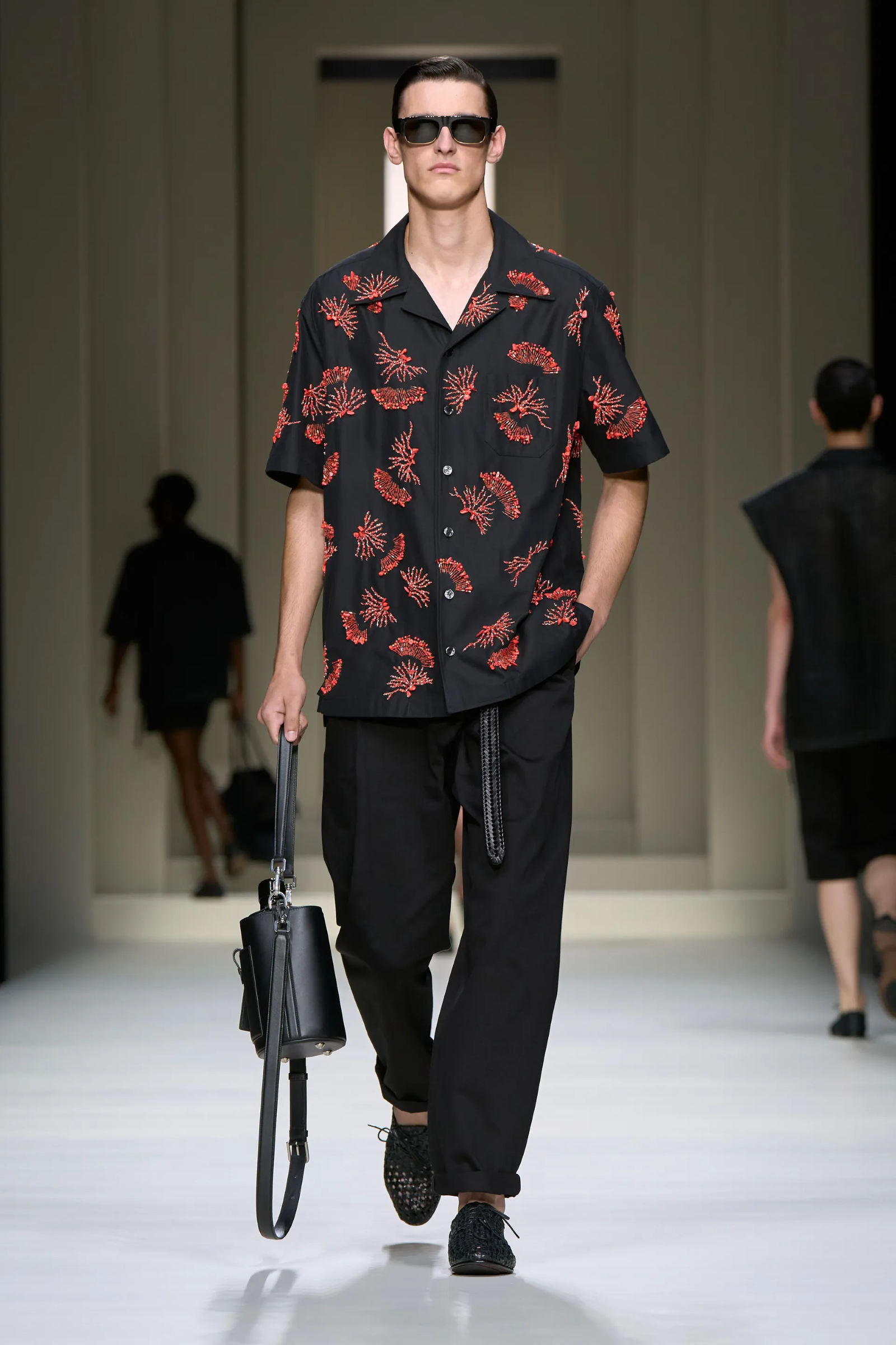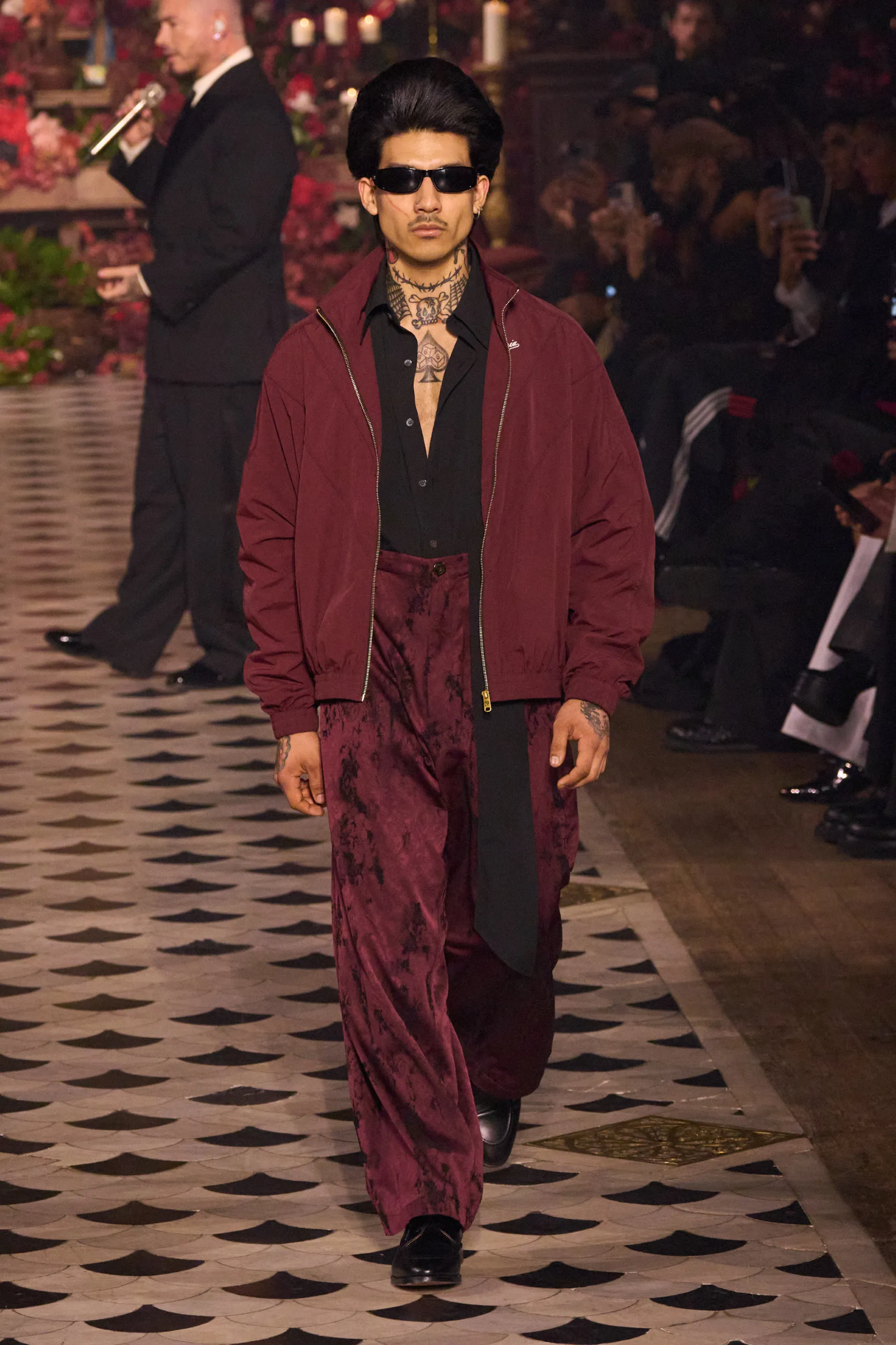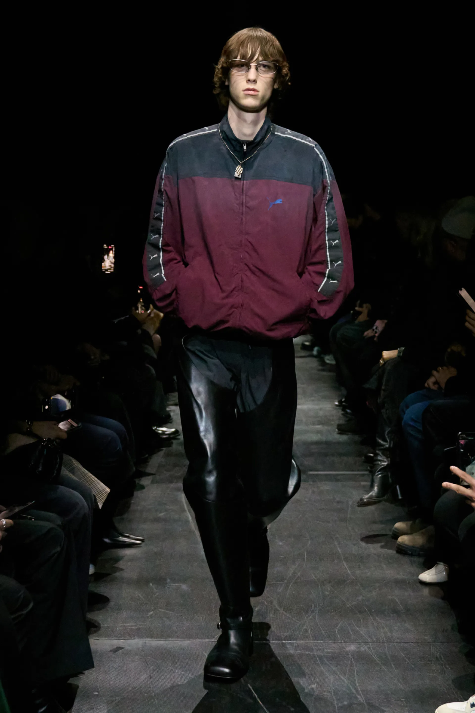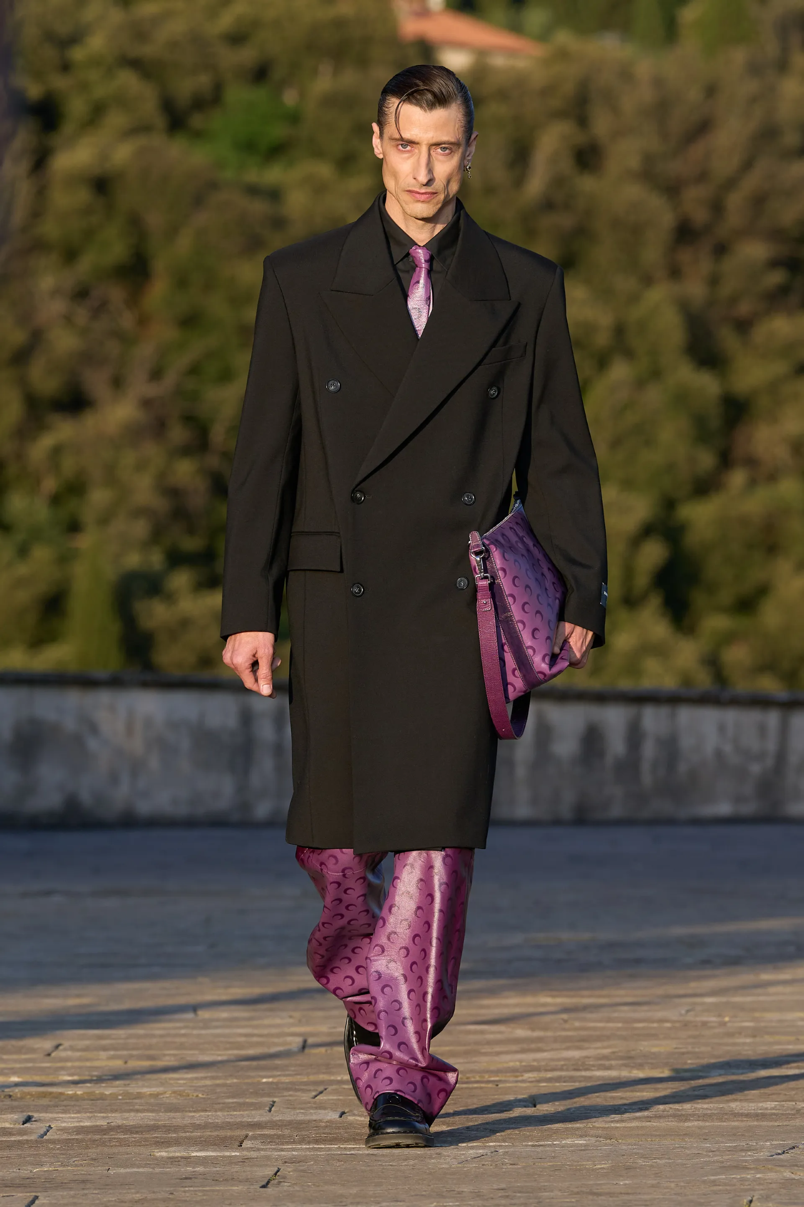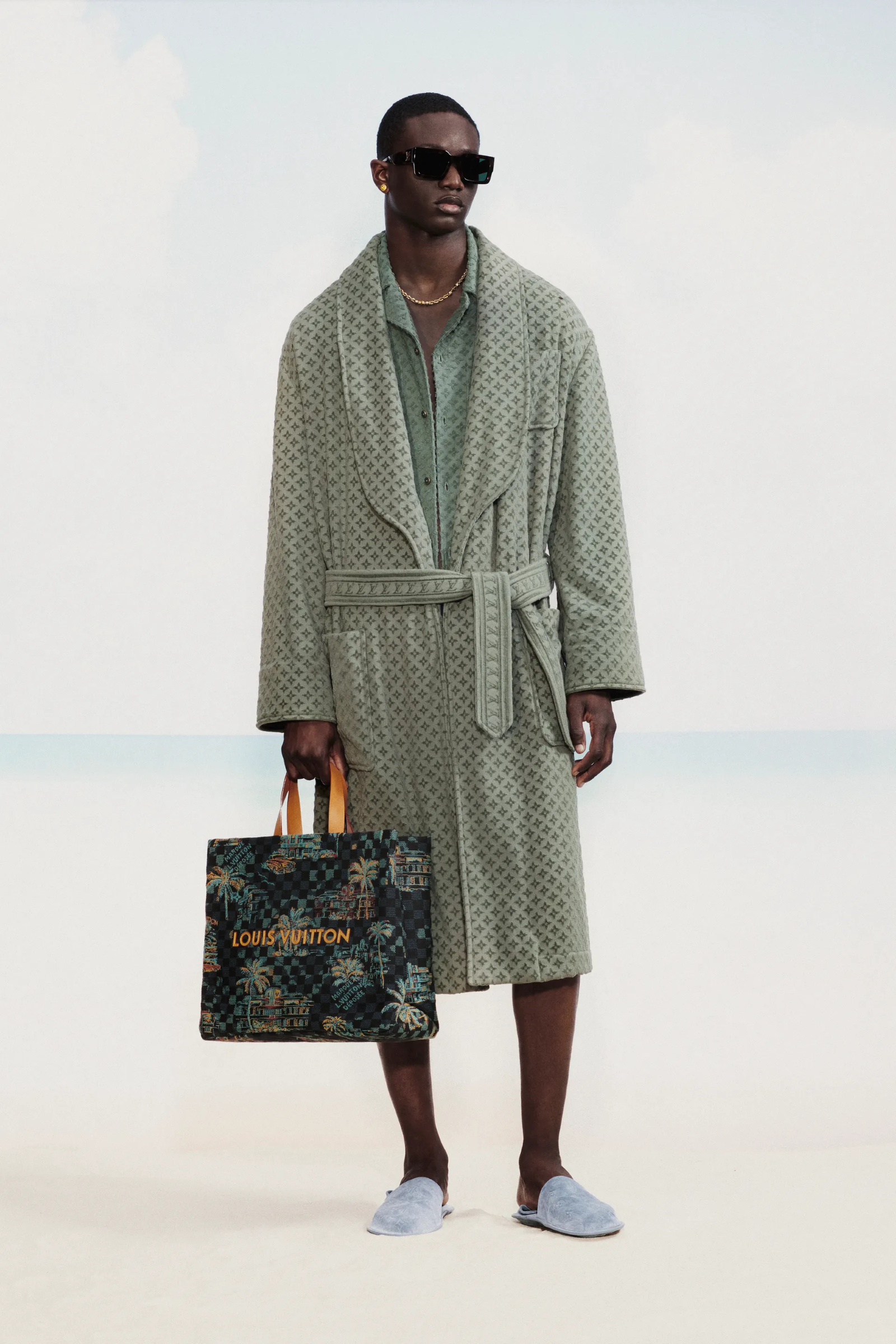 Le tracce di questa influenza si possono ritrovare più facilmente non solo nello stile promosso da pagine come @uniformdisplay, dove il preppy e l’estetica utility si incontrano in un tripudio di pantaloni oversize, camicie con pattern vivaci, track jacket indossate con pantaloni di sartoria, mocassini abbinati a jorts e via dicendo; ma anche nelle collezioni delle ultime stagioni dove l’originario spirito iper-mascolino dello stile de I Soprano è diventato uno strumento di decostruzione della mascolinità stessa. Nelle scorse stagioni, ad esempio, abbiamo visto un forte ritorno delle camicie à-la-Tony Soprano tanto da brand insospettabili come Hermès o Zegna, dove queste camicie o polo in maglia erano protagoniste degli show SS25, sia da brand più abituati a estetiche più vistose come Dolce&Gabbana, Amiri, MSGM e Aimè Leon Dore. Altri brand come ad esempio Magliano o Our Legacy, ma anche Marine Serre ma anche Casablanca o il messicano Campillo, hanno portato in passerella completi grigi e molto ampi abbinati a strati sottostanti dai colori contrastanti o addirittura in pelle, cercando quel senso quasi materico di “invecchiato” che è lo stesso dei molti completi visti nelle puntate de I Soprano. Da Louis Vuitton, nella Pre-Fall 2025, c'era un accappatoio che Tony avrebbe sicuramente indossato. Anche severi blouson e blazer di pelle hanno avuto il loro momento, specialmente da Versace, combinati a camicie di seta variopinte, da Dsquared2 e da Lemaire, ma soprattutto da LGN – Louis Gabriel Nouchi che ha anche fatto indossare la sua giacca di pelle a un modello plus-size la cui fisicità era la medesima di quella dei protagonisti della serie. Ma forse è stata la track jacket a emergere come pezzo più caldo: era ovviamente da Balenciaga e da Martine Rose – ma soprattutto da Willy Chavarria, designer la cui sensibilità e le cui silhouette maschili sarebbero perfette per un odierno remake de I Soprano.