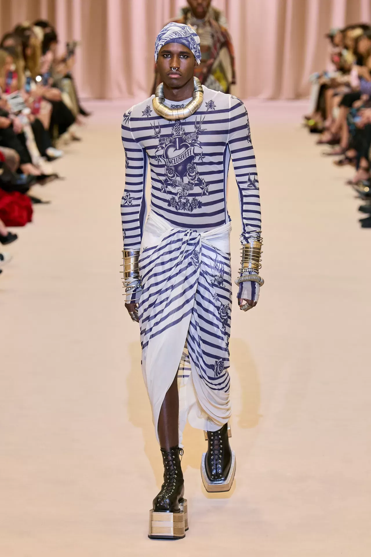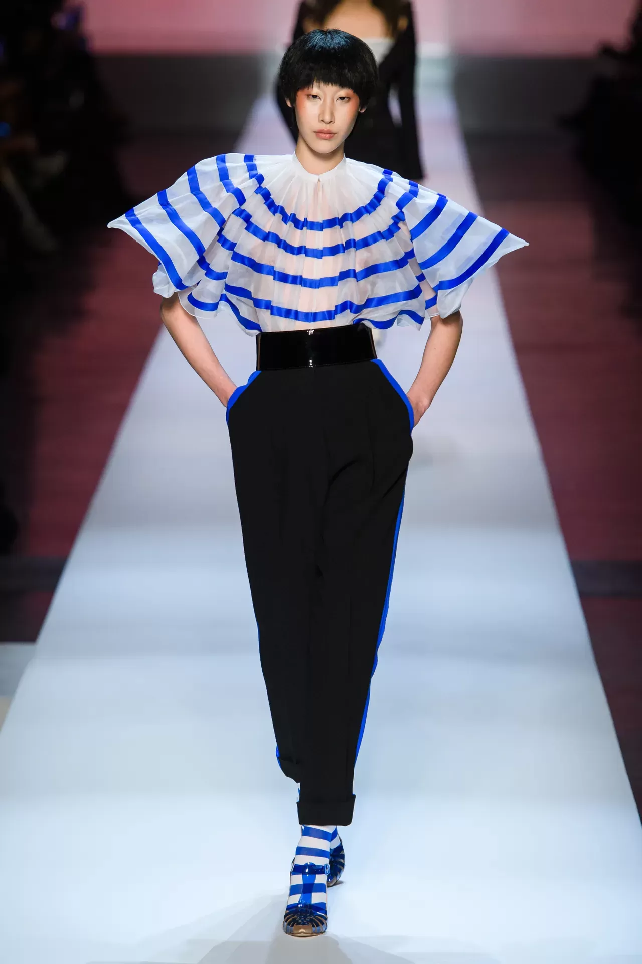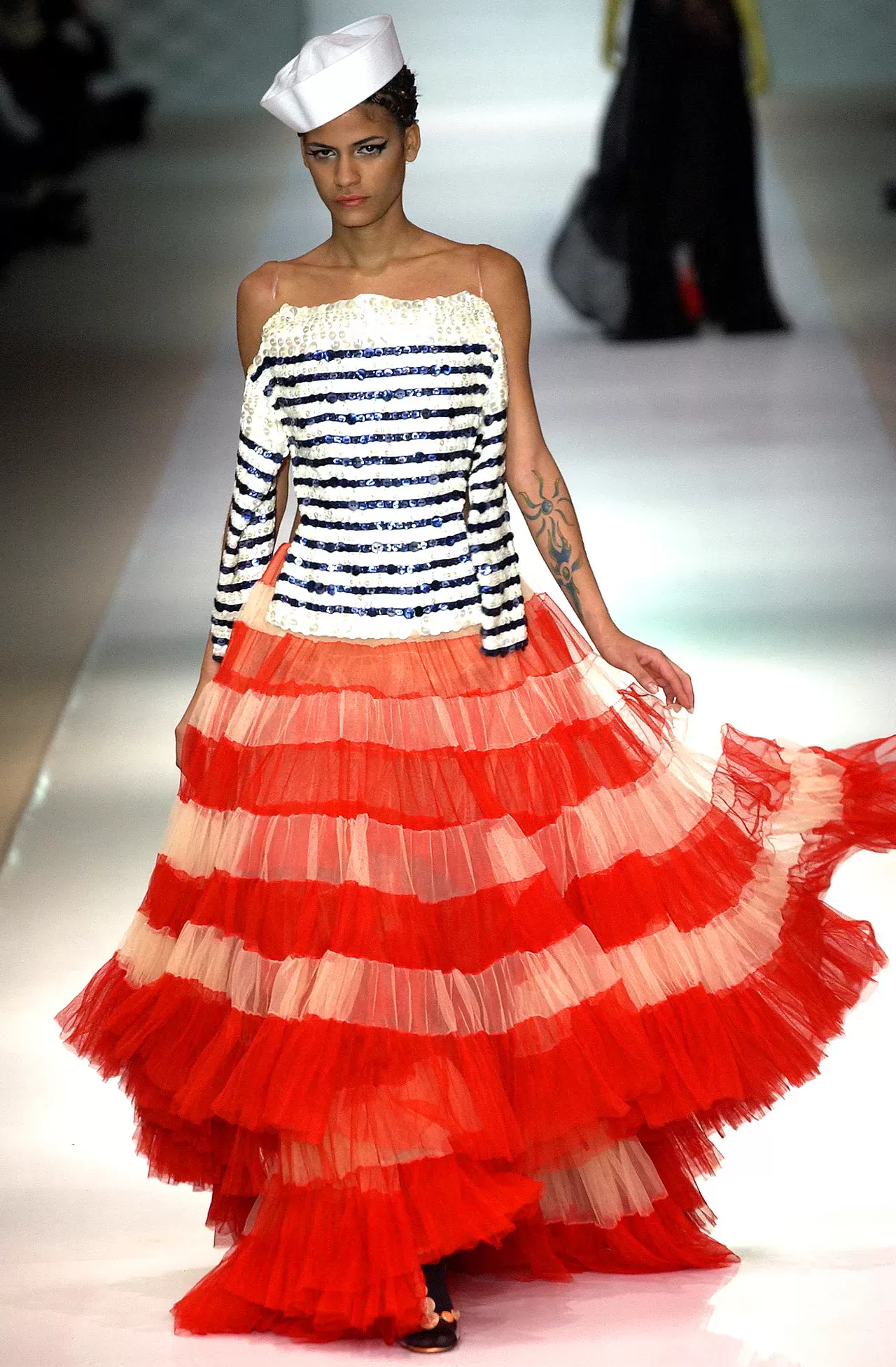 Ma anche con il suo founder in pensione, la marinière continua a impregnare il DNA di Jean Paul Gaultier attraverso i suoi guest designers, in particolare Olivier Rousteing, Glenn Martens e più recentemente Duran Lantink che anche nelle collezioni del suo brand personale si diverte a reinterpretare il motivo a righe in tutte le sue forme e colori. Sarà forse questa ripresa dei codici della Maison Gaultier ad avergli valso la nomina alla direzione artistica del marchio? Chi lo sa. Quello che sappiamo è che la nuova ondata di stilisti, come il duo McCollough e Hernandez di Proenza Schouler (di cui si attendono con impazienza i debutti da Loewe) o Daniel Roseberry da Schiaparelli, non esita a perpetuare l’eredità della marinière lasciata dalla storia, che sia classica, blu, rossa, nera, sotto forma di abito, giacca strutturata o anche velo. Gli anni passano, le tendenze si susseguono e si rincorrono, alcune si spengono per sempre, ma la marinière resta.