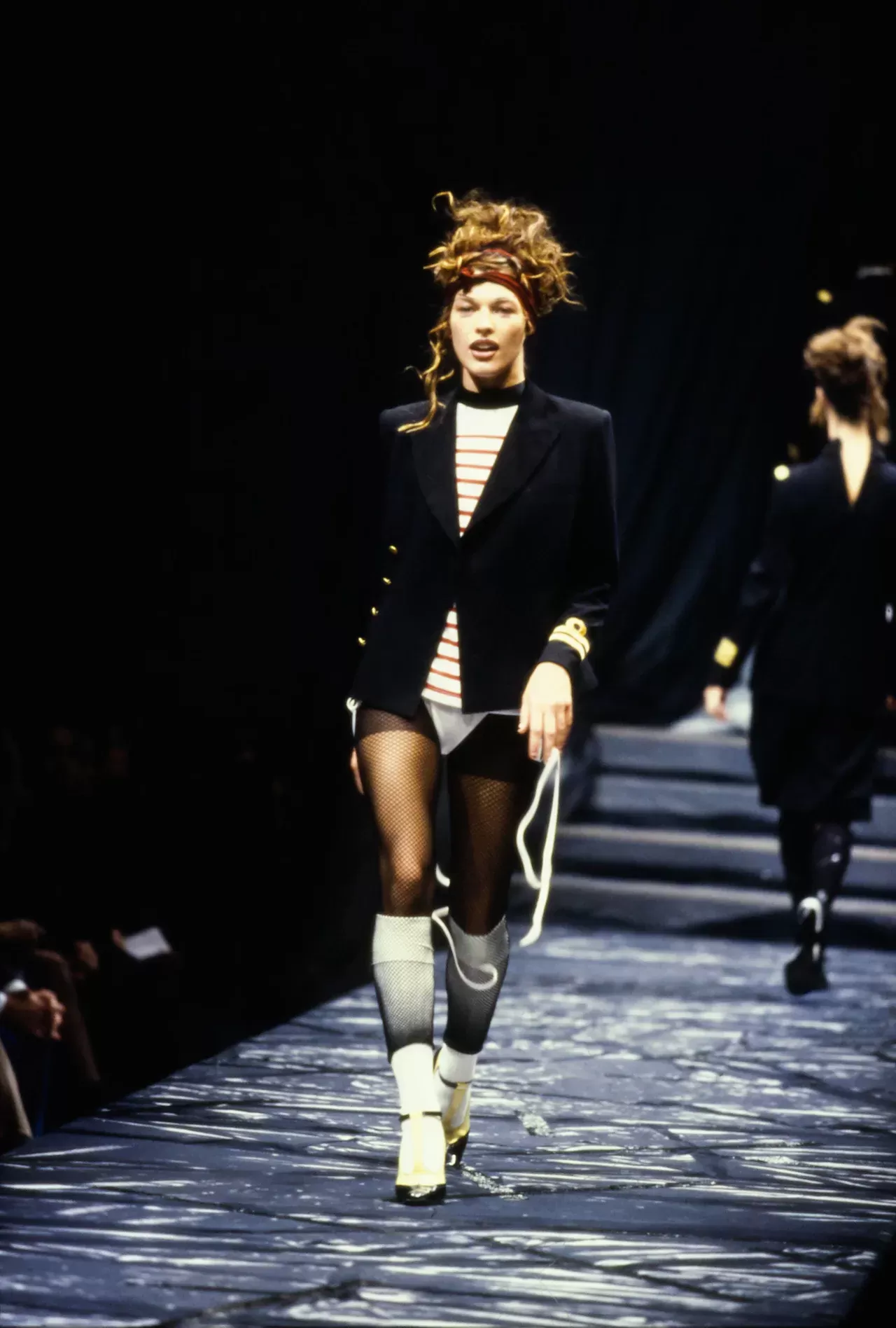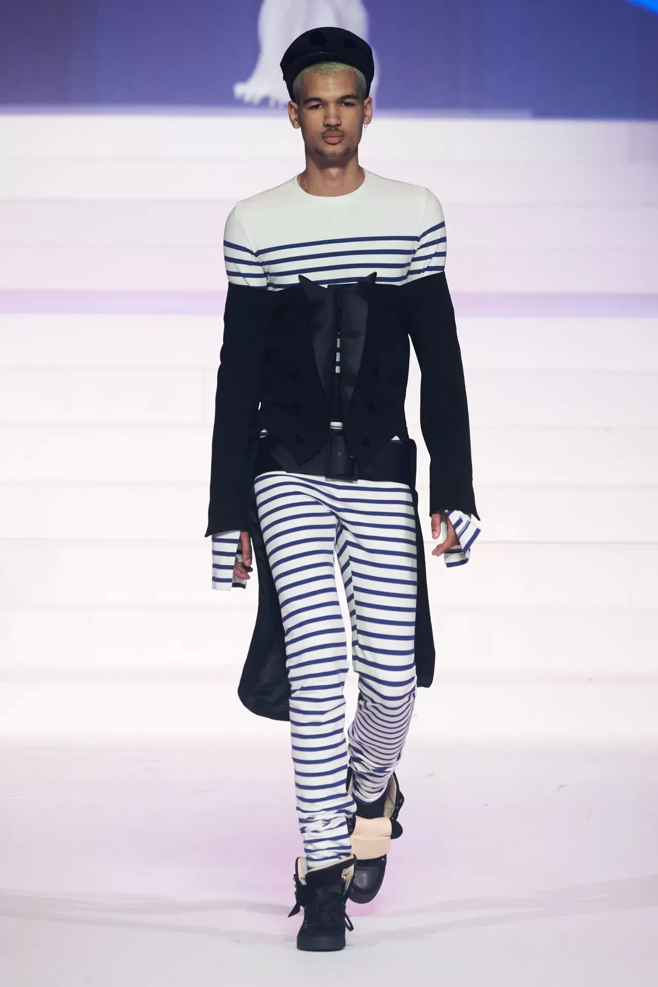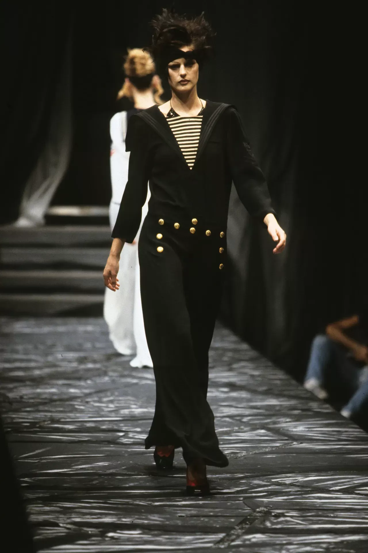 Ma rallentiamo un attimo. Qualche anno dopo Coco Chanel e i primi passi della marinière sulla scena della moda, il tricot conoscerà un nuovo slancio di popolarità grazie a un altro canale: il cinema. Nel 1938, Jean Seberg, il suo taglio corto, ma soprattutto la sua marinière diventeranno le muse di molte donne grazie al film Fino all’ultimo respiro, seguite da Brigitte Bardot e il suo tricot a righe altrettanto sexy nel 1963 in Il disprezzo. All’inizio degli anni ’80, arriva poi Querelle de Brest, un film un po’ meno conosciuto e un po’ più trasgressivo certo, ma che susciterà comunque un’ondata d’ispirazione senza pari in un creatore molto speciale: Jean Paul Gaultier. Il colpo di fulmine tra l’Enfant terrible e i muscoli scolpiti di Brad Davis e la sua estetica marina è immediato. Se la marinière faceva già parte del linguaggio visivo e vestimentario dello stilista, che salutatava già il pubblico della sua prima sfilata maschile nel 1978 indossando una marinière, il tricot a righe entra ufficialmente nel DNA del suo marchio omonimo nel 1983 con la collezione Toy Boy che celebra la t-shirt dei marinai. Molte saranno le collezioni di Gaultier che includeranno marinière, o addirittura ruoteranno attorno al suo concetto, come la sua SS97, che non si limita alla marinière ma riprende molti codici vestimentari della marina, la sua SS03, la collezione Couture 2015 e ovviamente la collezione SS20, l’ultima del designer.