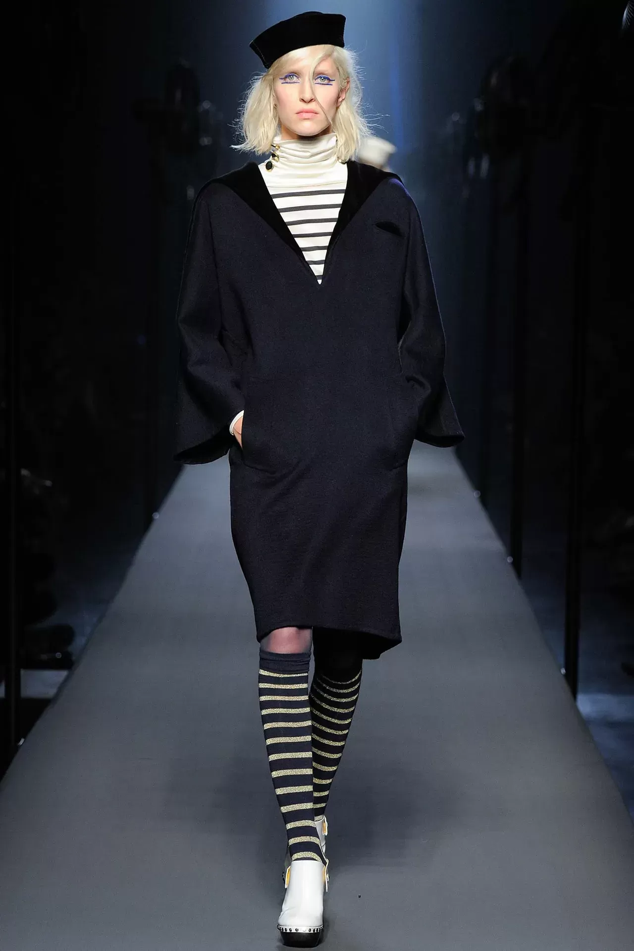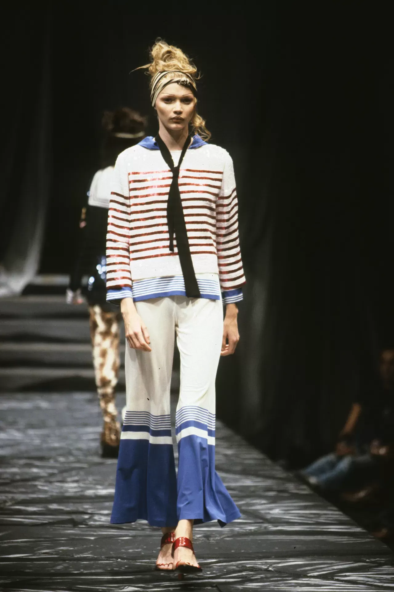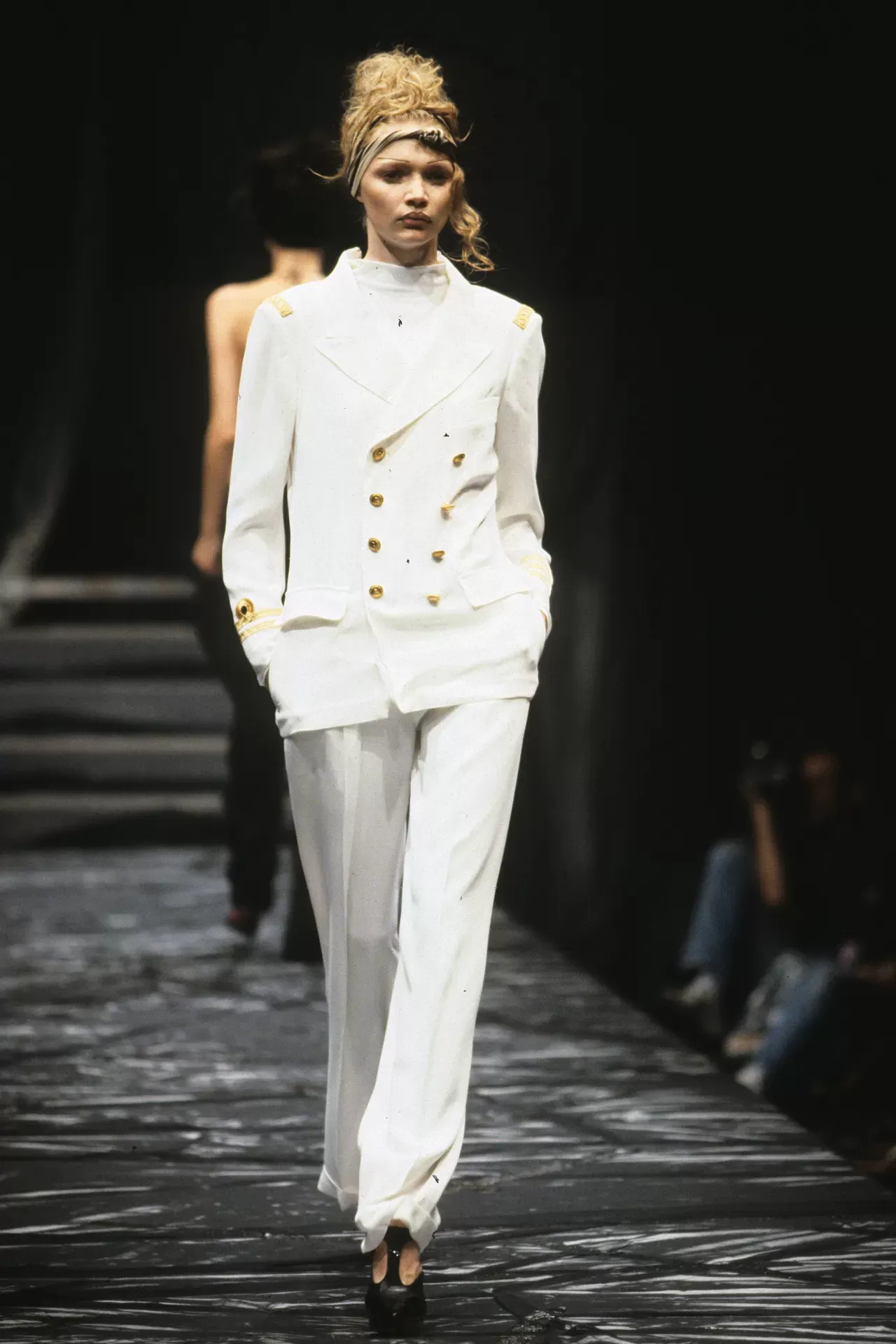 Ma rallentiamo un attimo. Qualche anno dopo Coco Chanel e i primi passi della marinière sulla scena della moda, il tricot conoscerà un nuovo slancio di popolarità grazie a un altro canale: il cinema. Nel 1938, Jean Seberg, il suo taglio corto, ma soprattutto la sua marinière diventeranno le muse di molte donne grazie al film Fino all’ultimo respiro, seguite da Brigitte Bardot e il suo tricot a righe altrettanto sexy nel 1963 in Il disprezzo. All’inizio degli anni ’80, arriva poi Querelle de Brest, un film un po’ meno conosciuto e un po’ più trasgressivo certo, ma che susciterà comunque un’ondata d’ispirazione senza pari in un creatore molto speciale: Jean Paul Gaultier. Il colpo di fulmine tra l’Enfant terrible e i muscoli scolpiti di Brad Davis e la sua estetica marina è immediato. Se la marinière faceva già parte del linguaggio visivo e vestimentario dello stilista, che salutatava già il pubblico della sua prima sfilata maschile nel 1978 indossando una marinière, il tricot a righe entra ufficialmente nel DNA del suo marchio omonimo nel 1983 con la collezione Toy Boy che celebra la t-shirt dei marinai. Molte saranno le collezioni di Gaultier che includeranno marinière, o addirittura ruoteranno attorno al suo concetto, come la sua SS97, che non si limita alla marinière ma riprende molti codici vestimentari della marina, la sua SS03, la collezione Couture 2015 e ovviamente la collezione SS20, l’ultima del designer.