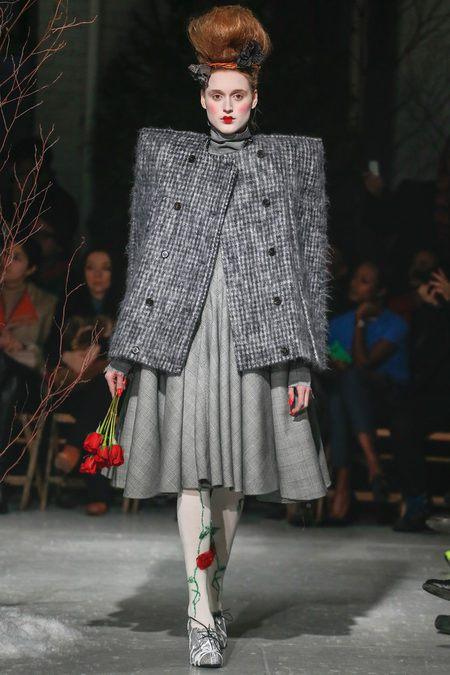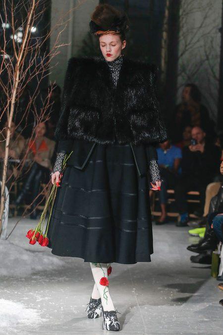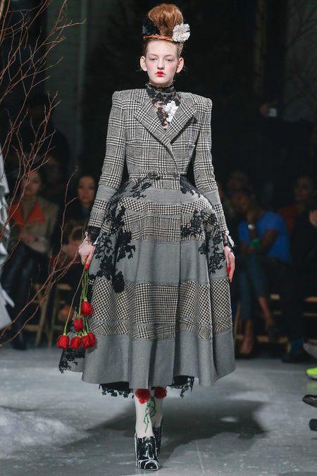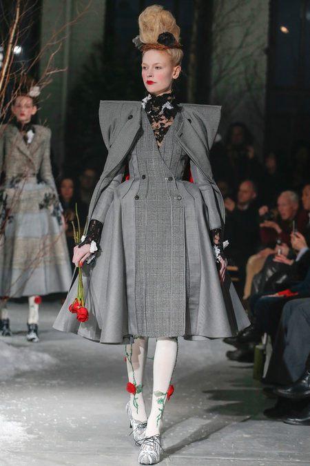 Thom Browne, stilista cresciuto in Pennsylvania ed ora di base a NY, sfila nella grande mela con una collezione fw 2013 che sembra uscita da un film di Tim Burton. Le modelle con il volto dipinto di bianco e le labbra rosse ricordano la Regina di cuori, versione Helena Bonham Carter, sono protagoniste di una fiaba gotica. Indossano capi realizzati con tessuti tipici del guardaroba maschile, principe di Galles, pied de poule, gabardine, declinati in colori rigorosi come il nero ed il grigio, addolciti da calze bianche sulle quali si inerpicano romantiche rose rosse in 3d, da gonne ampie e sprazzi di rosso. Le proporzioni sono esagerate, eredi del New look di Dior, la forma è a clessidra, le spalle, come già nella collezione maschile, sono il focus. Brown, alla sua prima vera sfilata con la collezione donna, si conferma un talento teatrale, ma scevro da concettualismi astrusi.
