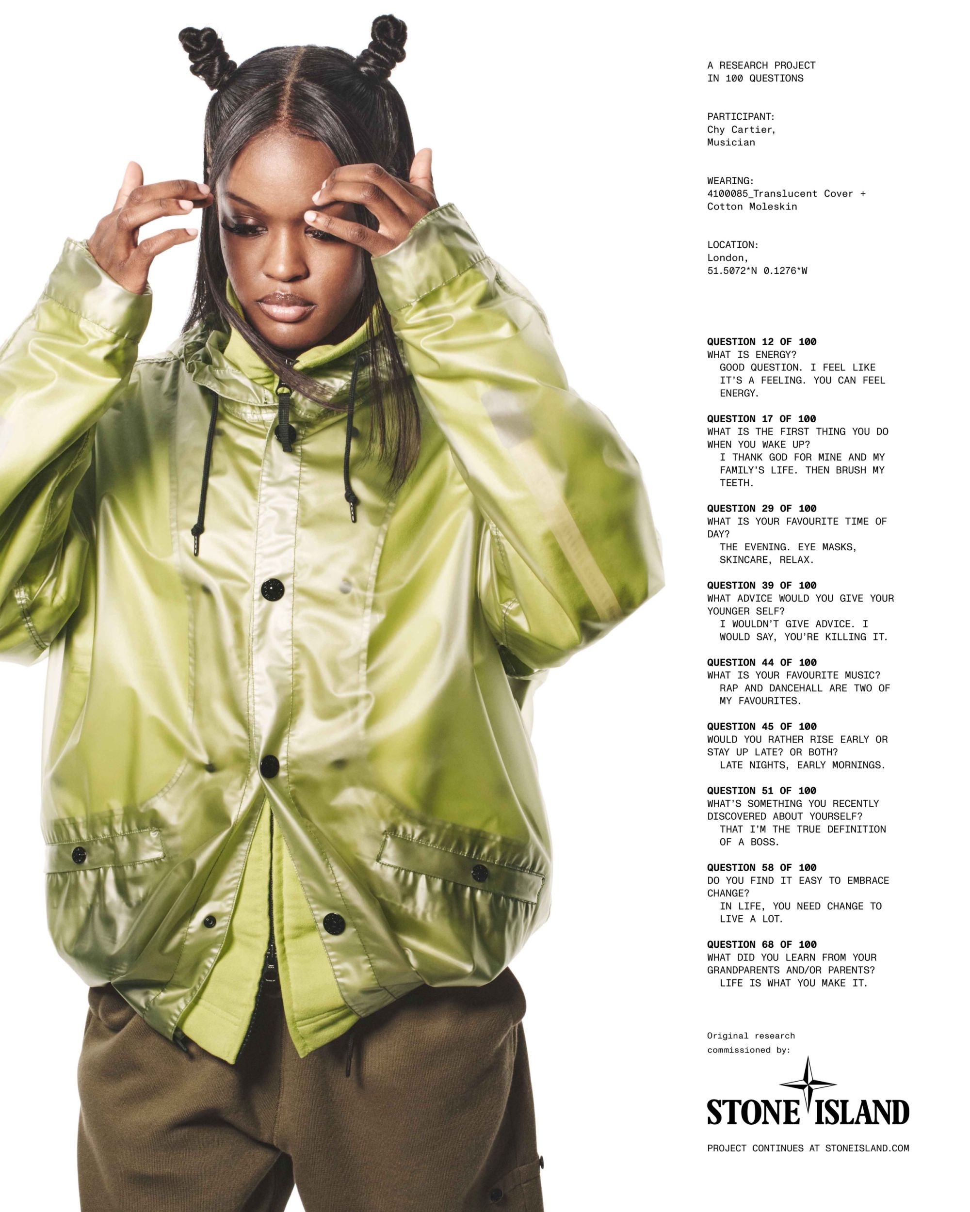 Dietro l’obiettivo troviamo David Sims, con lo styling curato da Max Pearmain e la direzione creativa di Ferdinando Verderi. Su un classico sfondo bianco, che da sempre funge da cornice neutra e riconoscibile, i ritratti valorizzano sia l’intensità dei personaggi che la ricerca tecnica dei capi. A intrecciare ulteriormente le immagini e i racconti, le domande firmate da Hans Ulrich Obrist, direttore artistico della Serpentine Gallery, che aggiungono un livello di riflessione inedito alla narrazione visiva. Con questa campagna, Stone Island riafferma la sua idea di moda come terreno comune, dove la ricerca non è solo materiale ma anche umana: un luogo in cui l’innovazione dei tessuti incontra la pluralità delle voci che li indossano.