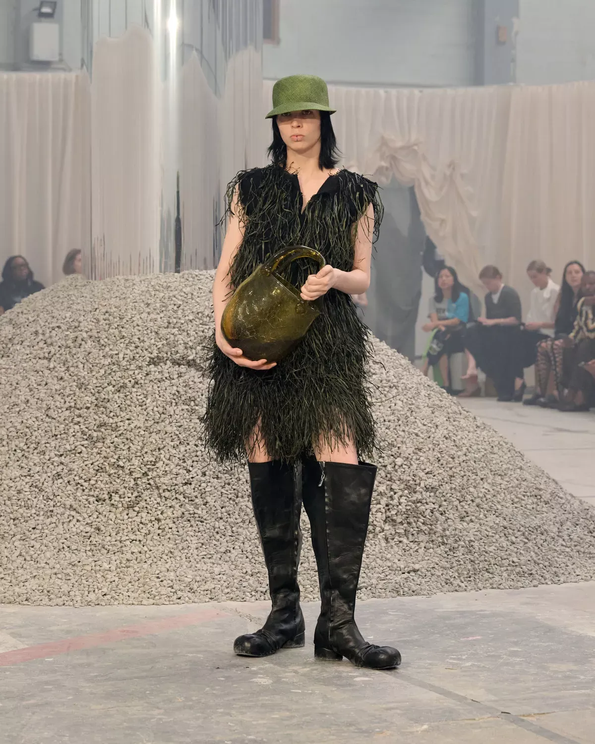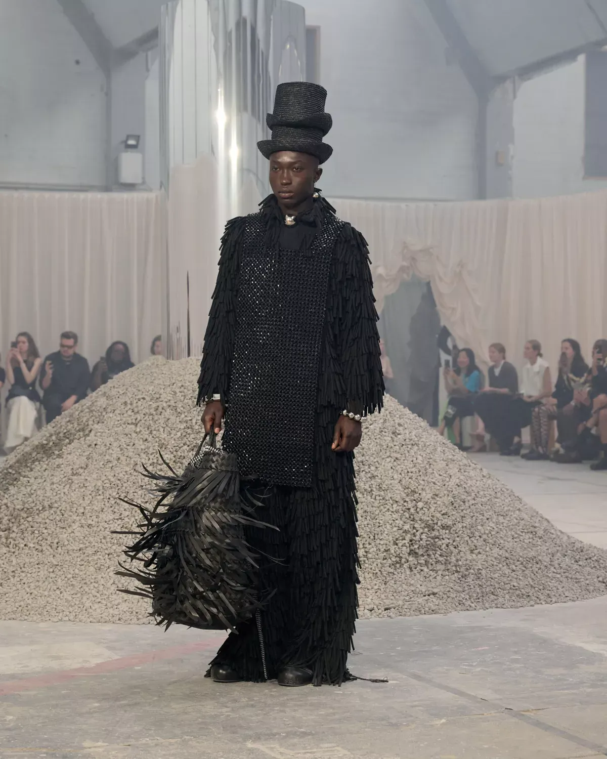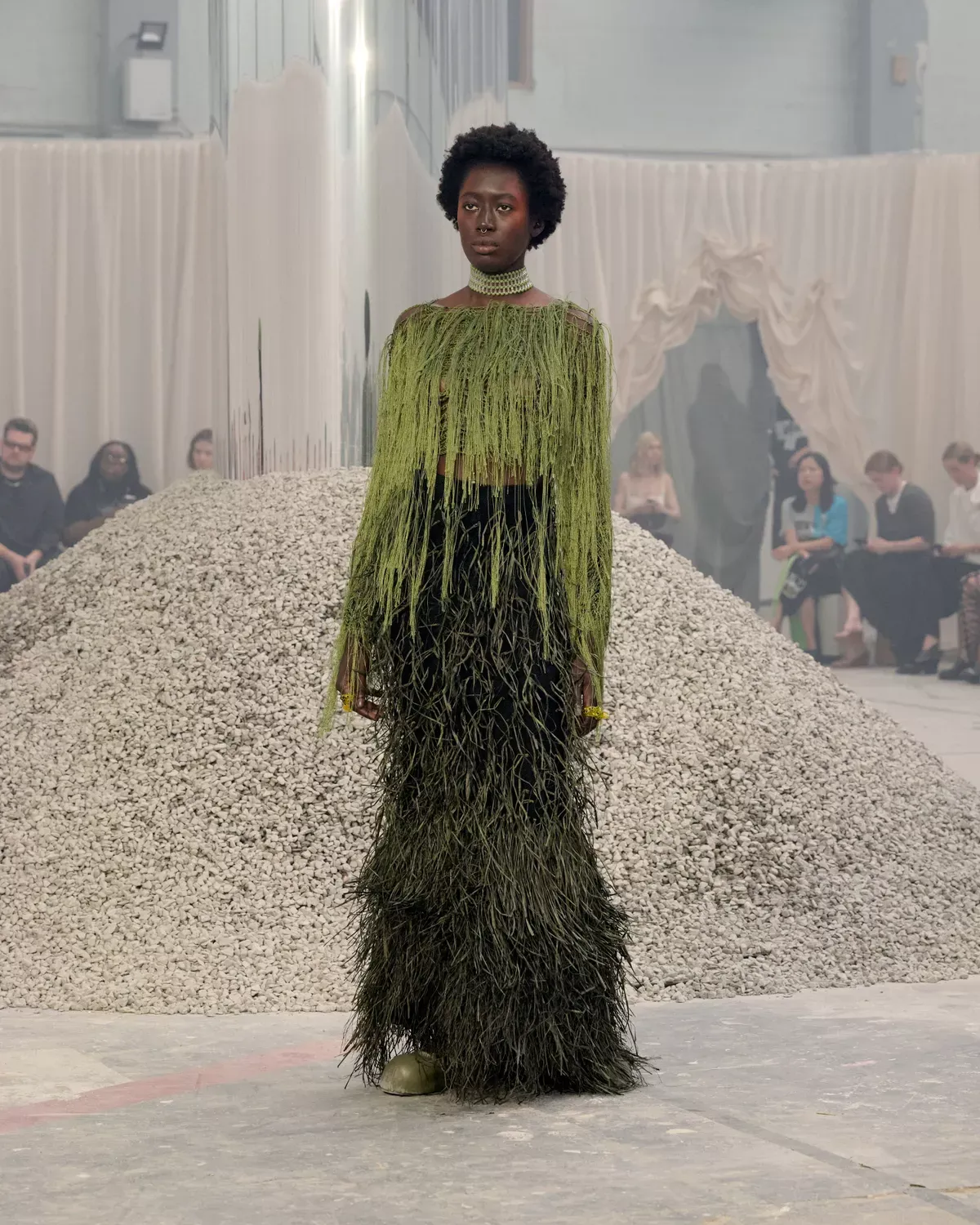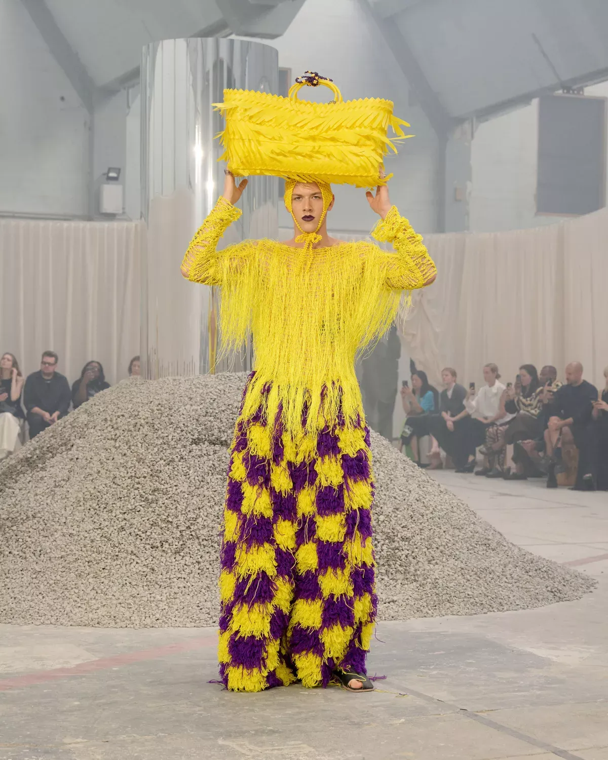 L’artigianato è stato il cuore pulsante della collezione, radicato nelle collaborazioni con artigiani in Nigeria, Kenya e altre regioni sub-sahariane. Tecniche come la tessitura manuale, la forgiatura di maglie metalliche, l’annodatura delle fibre e la soffiatura del vetro sono state utilizzate non come abbellimenti decorativi, ma come pratiche funzionali e spirituali. “Il patrimonio culturale è statico e l'artigianato è pittoresco. Entrambi sono tecnologie viventi”, ha spiegato il designer. “L'artigianato non è solo abilità, è cosmologia. Il patrimonio culturale non è rivolto al passato, è il passato, il presente e il futuro. È memoria strategica e l'industria spesso mercifica entrambi senza comprendere i sistemi da cui derivano”. Queste “tecnologie ancestrali” hanno trasformato materiali grezzi in narrazioni indossabili. Ad esempio, il pezzo scultoreo in rafia ha richiesto settimane di lavoro manuale meticoloso, mentre il cappotto con vetro incastonato ha dimostrato un’innovativa manipolazione dei materiali. Ogni capo testimonia l’impegno di IAMISIGO nel preservare le tradizioni artigianali africane a rischio, risvegliandole in un contesto contemporaneo senza perdere il loro significato culturale. Tra i pezzi più notevoli spiccano un abito scultoreo in rafia, con fibre oscillanti che si animano quando chi lo indossa cammina, e un cappotto in corteccia con frammenti di vetro incastonati che catturano la luce – e questo da solo una piccola misura di quanto Ogisi si sia spinta in là con la sperimentazione sui materiali. Gli accessori, come borse di vetro riempite d’acqua e cappelli intrecciati che possono trasformarsi in recipienti, si trovavano al confine tra funzionalità moderna e antico artigianato, esaltati dalla palette e dalle texture che spaziano da intrecci morbidi e tattili a superfici rigide e riflettenti.
