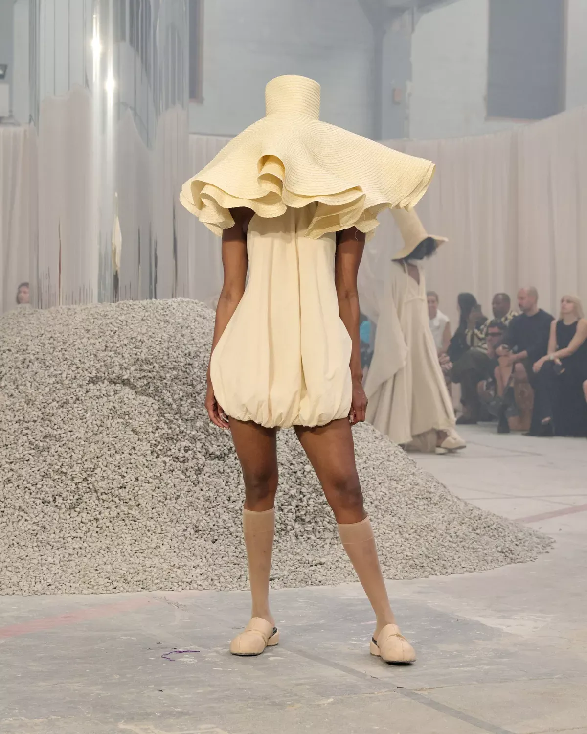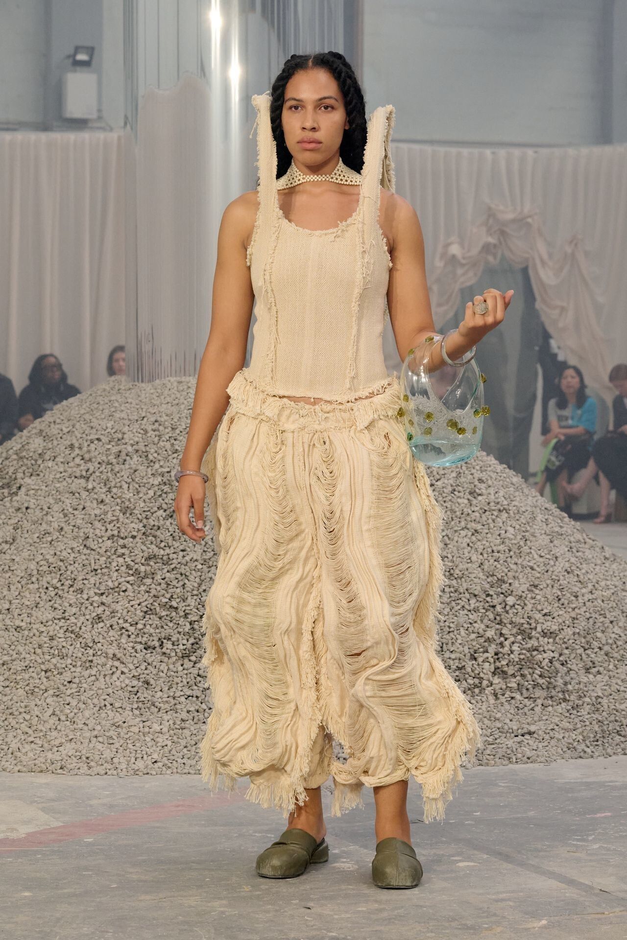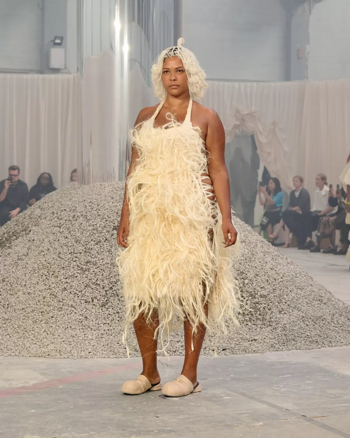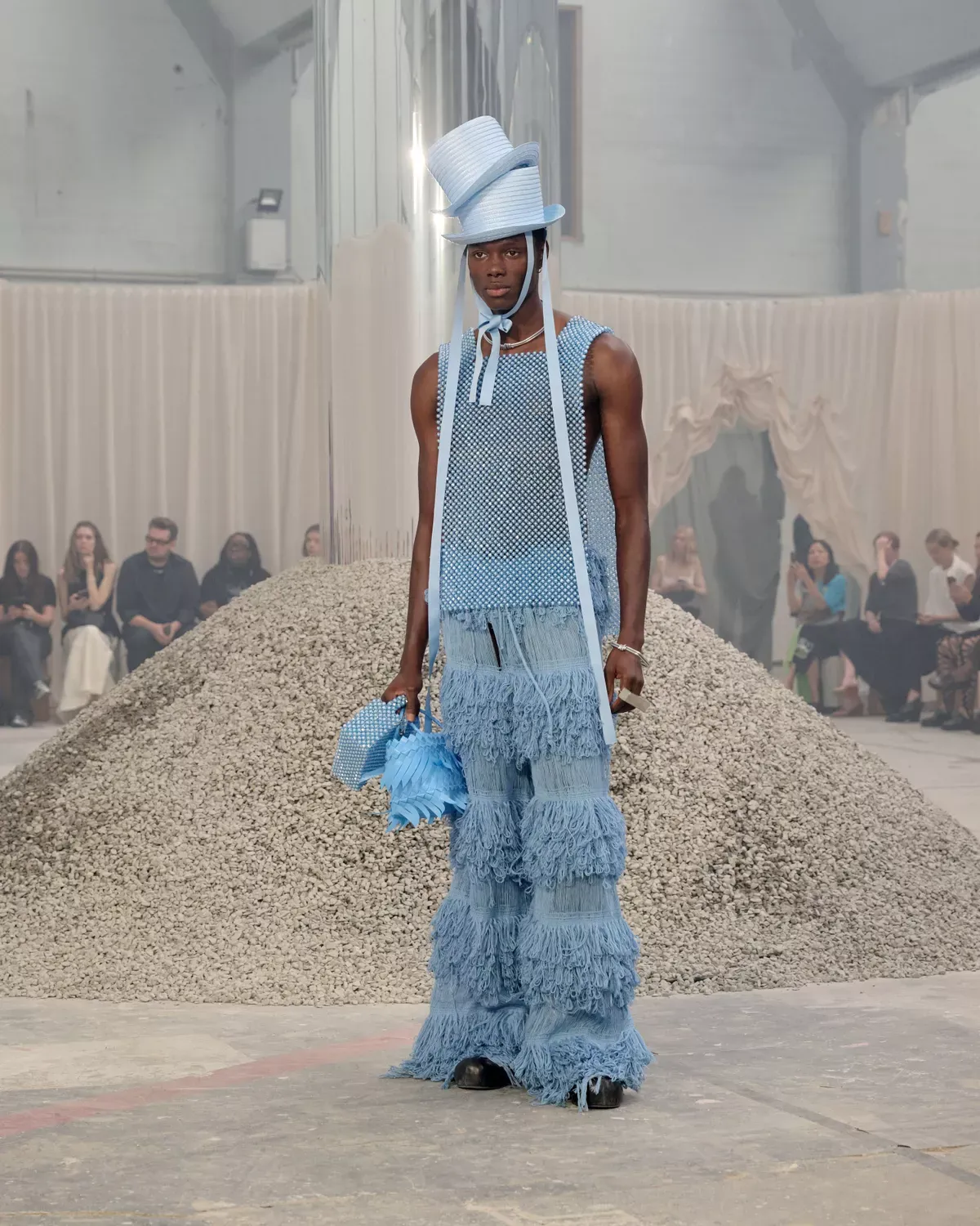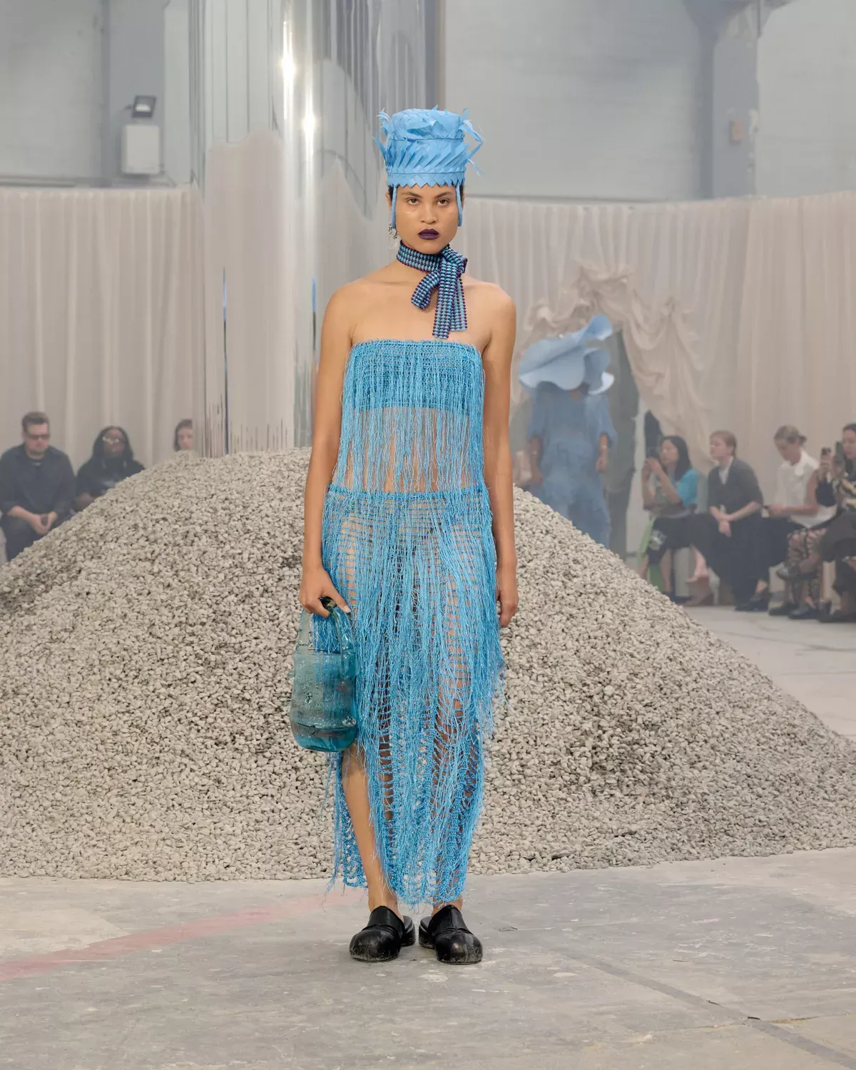 L’artigianato è stato il cuore pulsante della collezione, radicato nelle collaborazioni con artigiani in Nigeria, Kenya e altre regioni sub-sahariane. Tecniche come la tessitura manuale, la forgiatura di maglie metalliche, l’annodatura delle fibre e la soffiatura del vetro sono state utilizzate non come abbellimenti decorativi, ma come pratiche funzionali e spirituali. “Il patrimonio culturale è statico e l'artigianato è pittoresco. Entrambi sono tecnologie viventi”, ha spiegato il designer. “L'artigianato non è solo abilità, è cosmologia. Il patrimonio culturale non è rivolto al passato, è il passato, il presente e il futuro. È memoria strategica e l'industria spesso mercifica entrambi senza comprendere i sistemi da cui derivano”. Queste “tecnologie ancestrali” hanno trasformato materiali grezzi in narrazioni indossabili. Ad esempio, il pezzo scultoreo in rafia ha richiesto settimane di lavoro manuale meticoloso, mentre il cappotto con vetro incastonato ha dimostrato un’innovativa manipolazione dei materiali. Ogni capo testimonia l’impegno di IAMISIGO nel preservare le tradizioni artigianali africane a rischio, risvegliandole in un contesto contemporaneo senza perdere il loro significato culturale. Tra i pezzi più notevoli spiccano un abito scultoreo in rafia, con fibre oscillanti che si animano quando chi lo indossa cammina, e un cappotto in corteccia con frammenti di vetro incastonati che catturano la luce – e questo da solo una piccola misura di quanto Ogisi si sia spinta in là con la sperimentazione sui materiali. Gli accessori, come borse di vetro riempite d’acqua e cappelli intrecciati che possono trasformarsi in recipienti, si trovavano al confine tra funzionalità moderna e antico artigianato, esaltati dalla palette e dalle texture che spaziano da intrecci morbidi e tattili a superfici rigide e riflettenti.