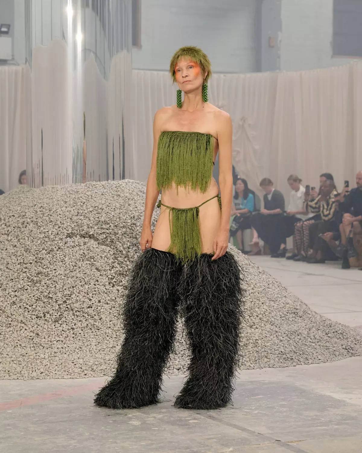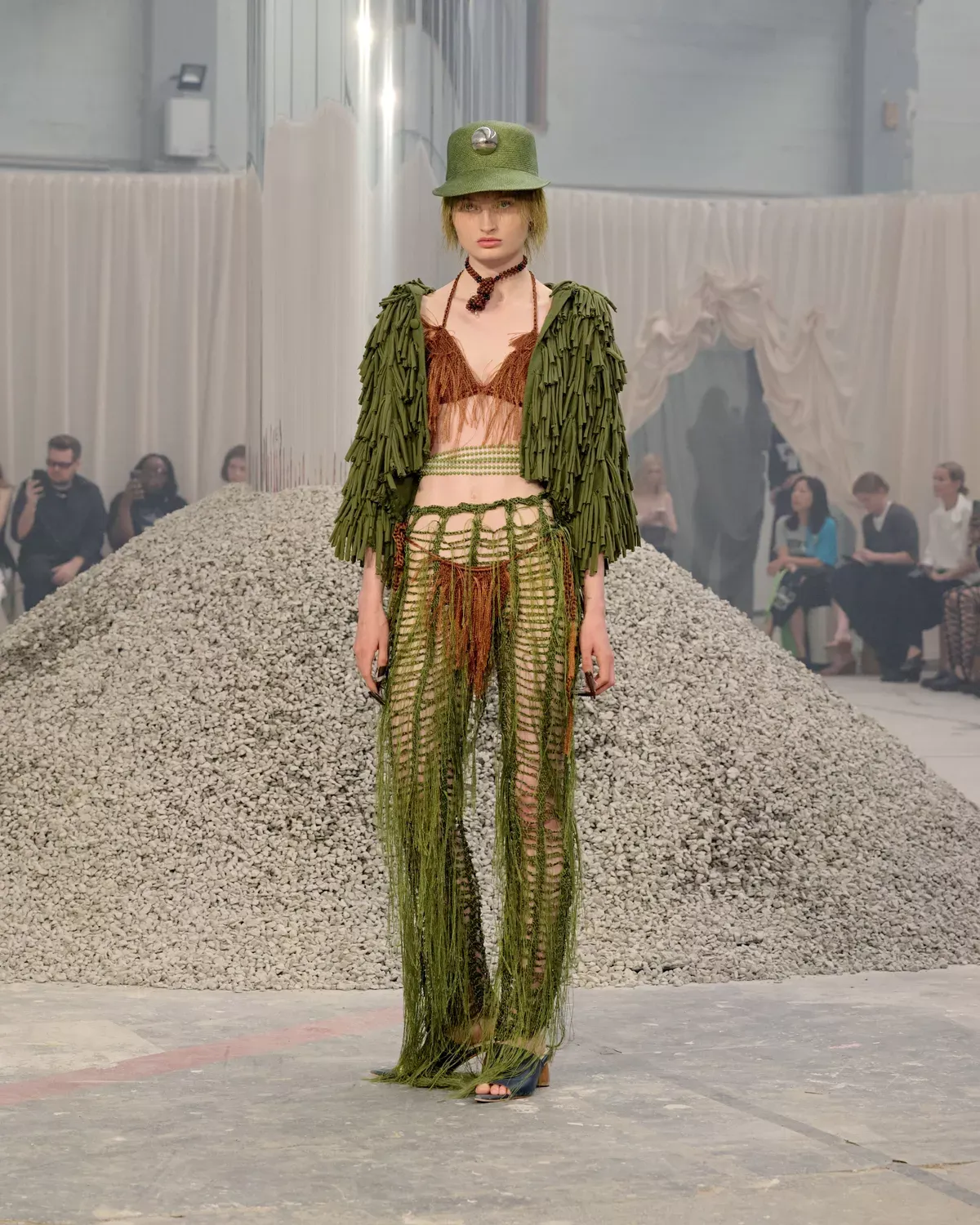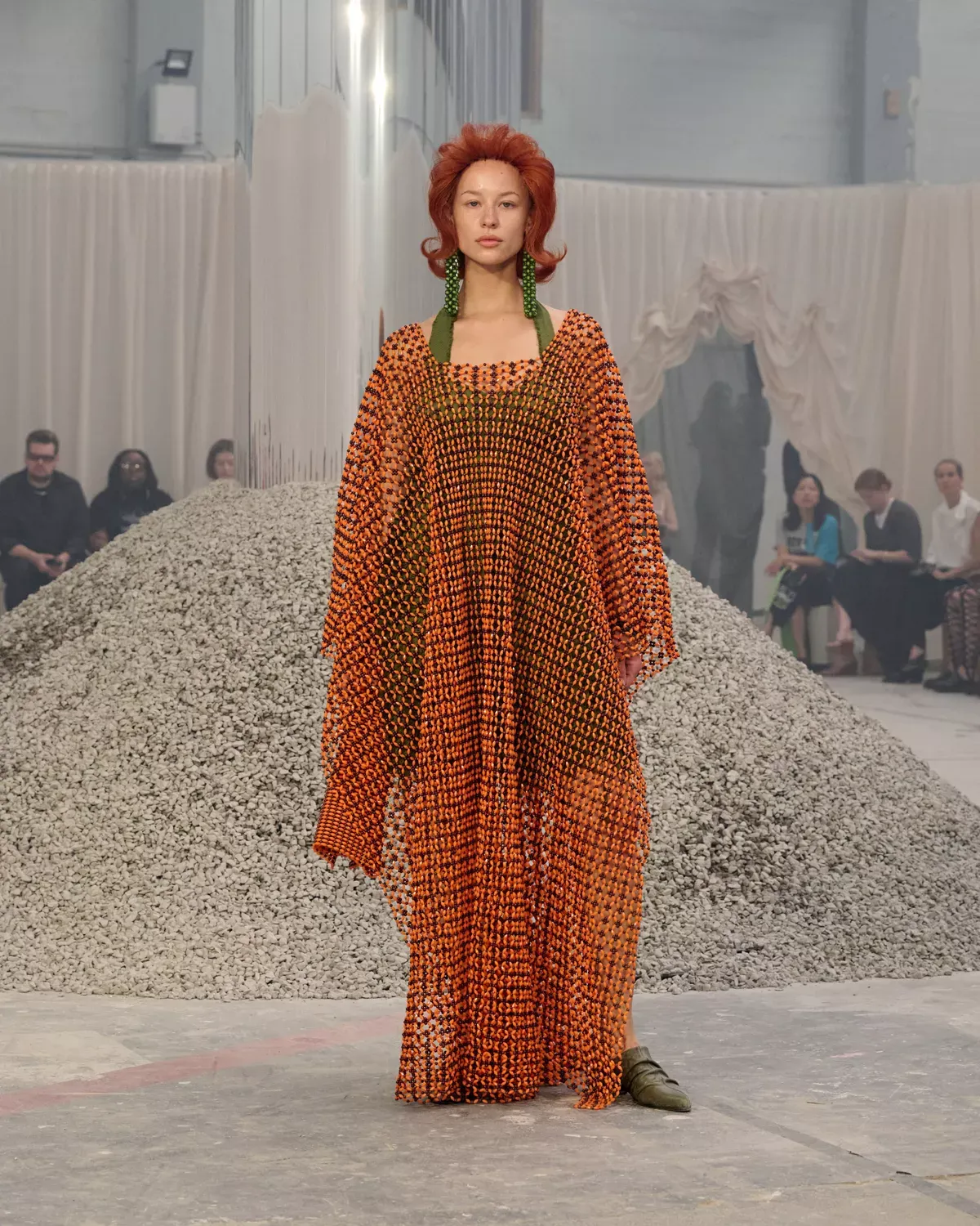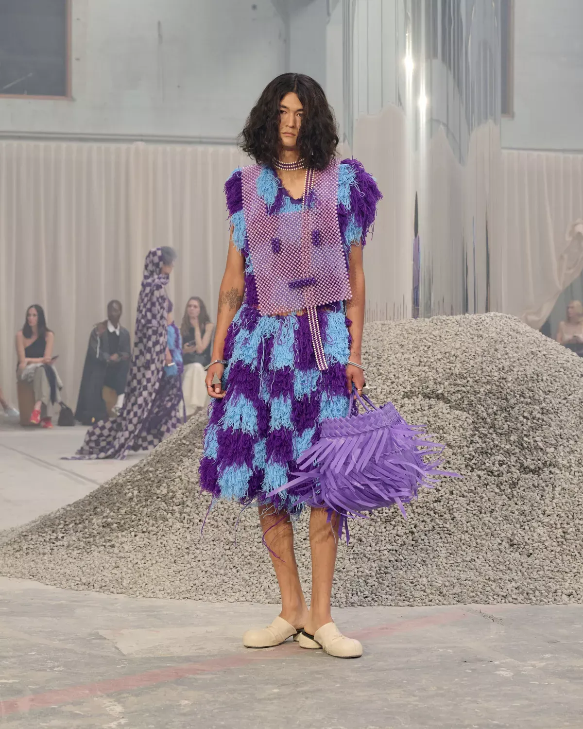 L’artigianato è stato il cuore pulsante della collezione, radicato nelle collaborazioni con artigiani in Nigeria, Kenya e altre regioni sub-sahariane. Tecniche come la tessitura manuale, la forgiatura di maglie metalliche, l’annodatura delle fibre e la soffiatura del vetro sono state utilizzate non come abbellimenti decorativi, ma come pratiche funzionali e spirituali. “Il patrimonio culturale è statico e l'artigianato è pittoresco. Entrambi sono tecnologie viventi”, ha spiegato il designer. “L'artigianato non è solo abilità, è cosmologia. Il patrimonio culturale non è rivolto al passato, è il passato, il presente e il futuro. È memoria strategica e l'industria spesso mercifica entrambi senza comprendere i sistemi da cui derivano”. Queste “tecnologie ancestrali” hanno trasformato materiali grezzi in narrazioni indossabili. Ad esempio, il pezzo scultoreo in rafia ha richiesto settimane di lavoro manuale meticoloso, mentre il cappotto con vetro incastonato ha dimostrato un’innovativa manipolazione dei materiali. Ogni capo testimonia l’impegno di IAMISIGO nel preservare le tradizioni artigianali africane a rischio, risvegliandole in un contesto contemporaneo senza perdere il loro significato culturale. Tra i pezzi più notevoli spiccano un abito scultoreo in rafia, con fibre oscillanti che si animano quando chi lo indossa cammina, e un cappotto in corteccia con frammenti di vetro incastonati che catturano la luce – e questo da solo una piccola misura di quanto Ogisi si sia spinta in là con la sperimentazione sui materiali. Gli accessori, come borse di vetro riempite d’acqua e cappelli intrecciati che possono trasformarsi in recipienti, si trovavano al confine tra funzionalità moderna e antico artigianato, esaltati dalla palette e dalle texture che spaziano da intrecci morbidi e tattili a superfici rigide e riflettenti.