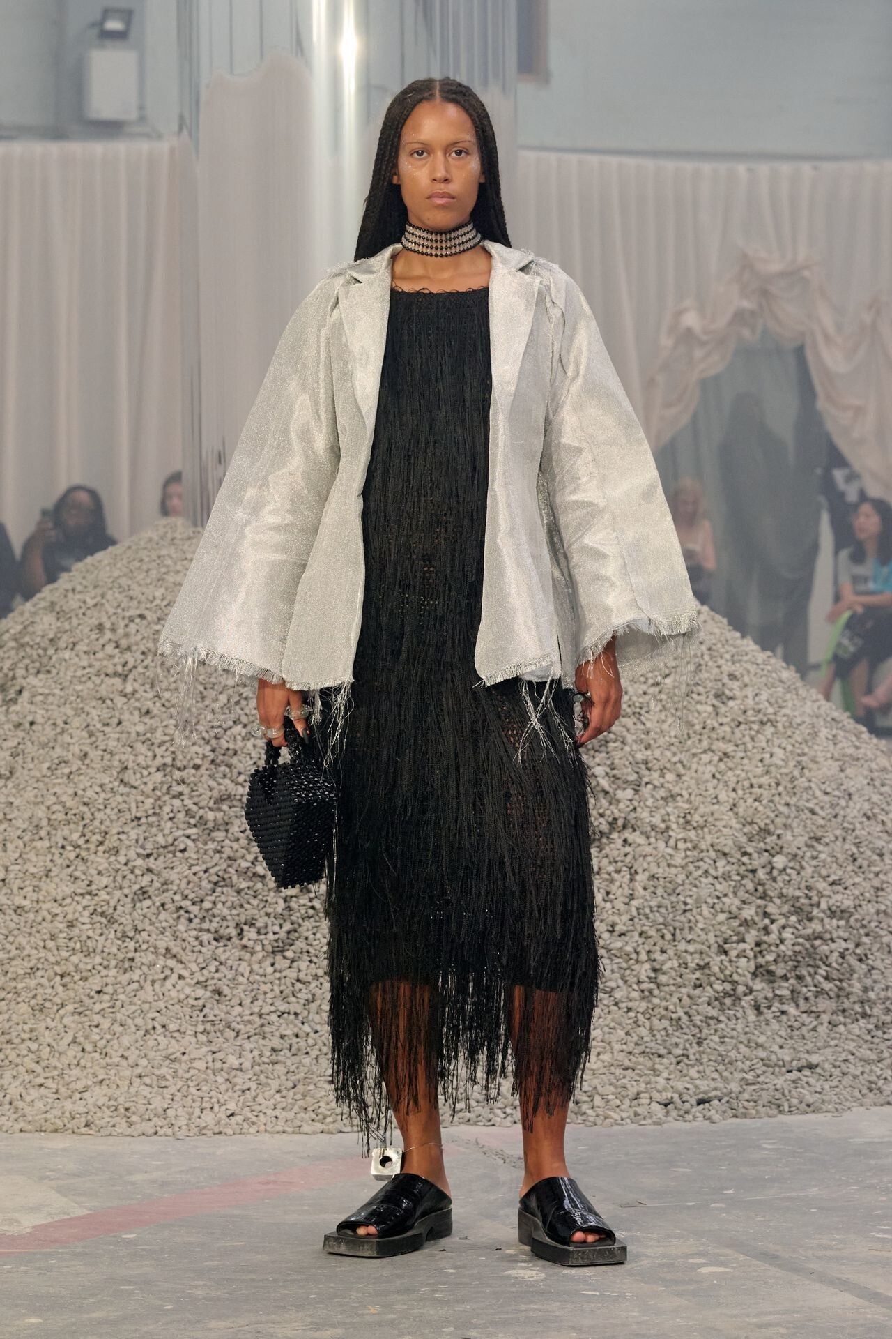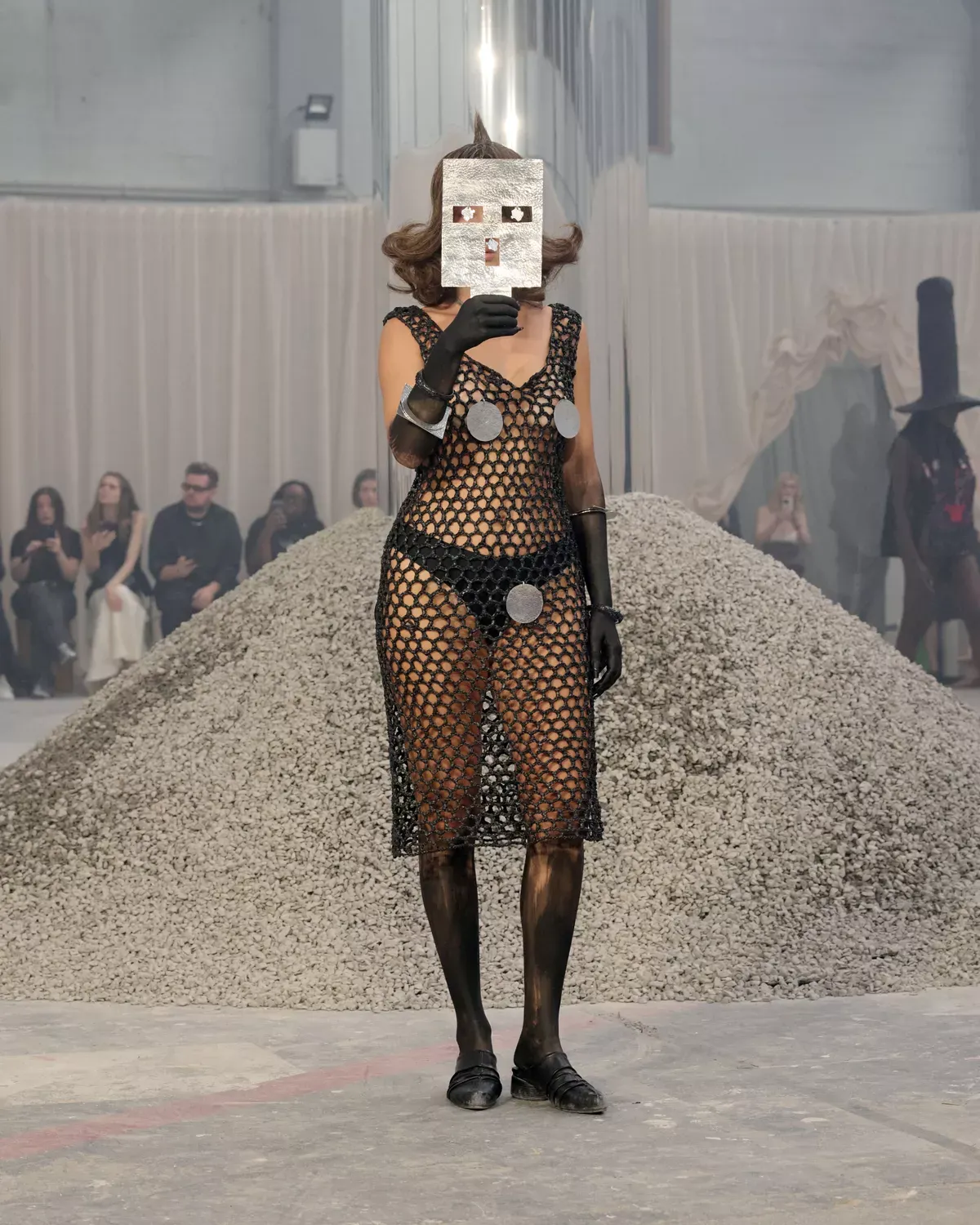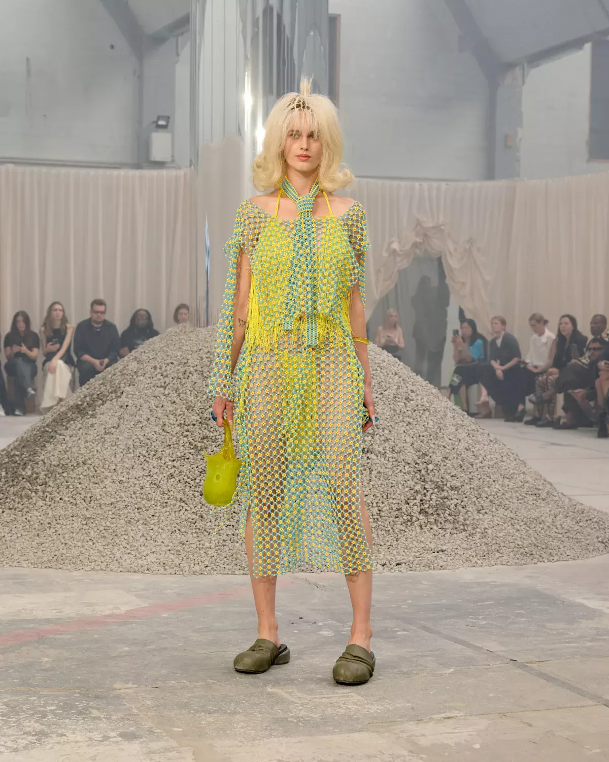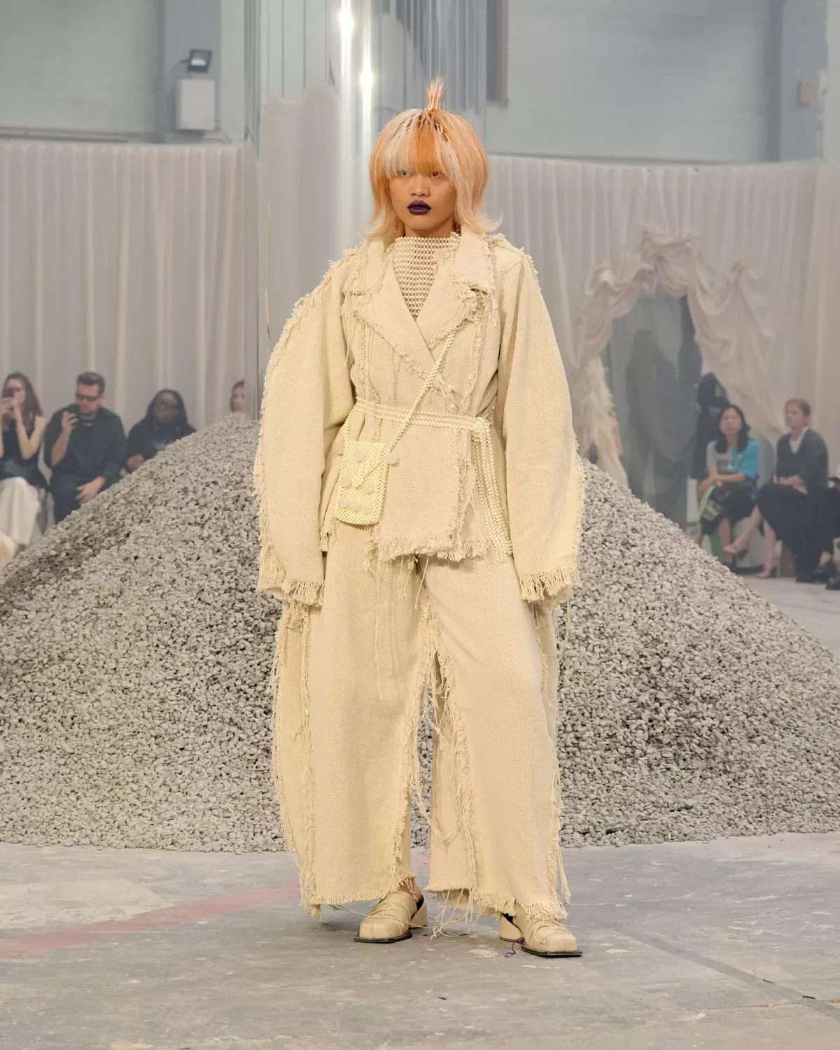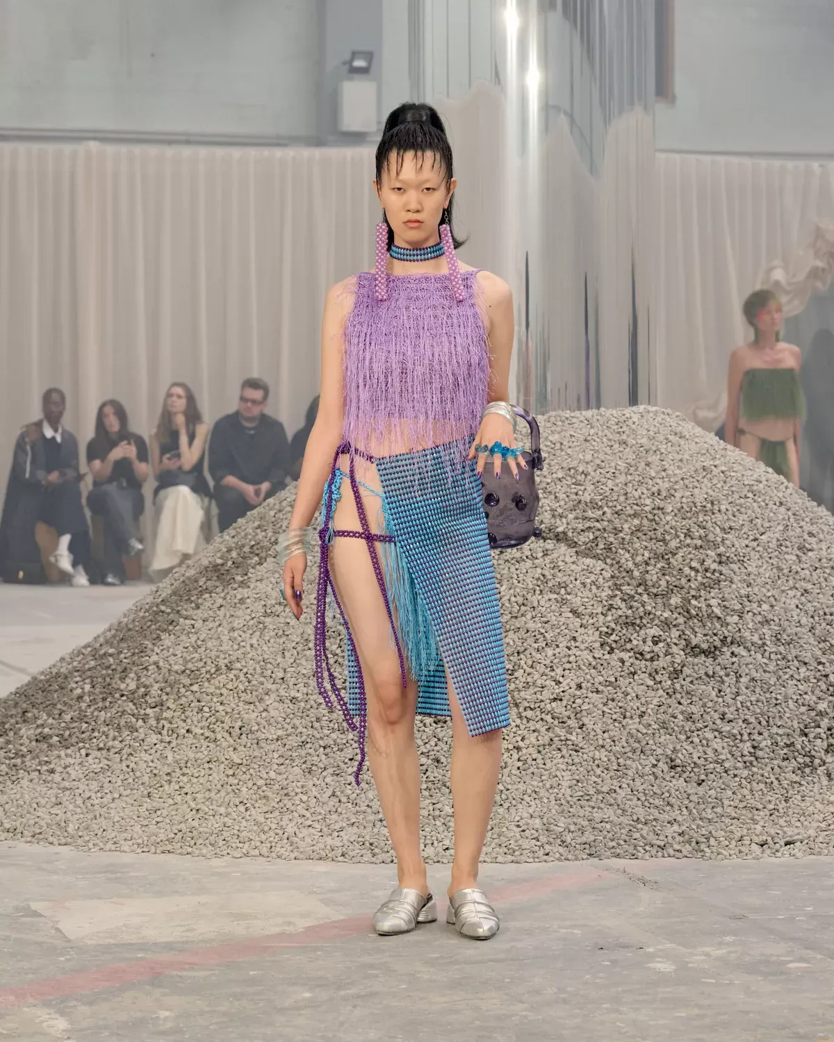 L’artigianato è stato il cuore pulsante della collezione, radicato nelle collaborazioni con artigiani in Nigeria, Kenya e altre regioni sub-sahariane. Tecniche come la tessitura manuale, la forgiatura di maglie metalliche, l’annodatura delle fibre e la soffiatura del vetro sono state utilizzate non come abbellimenti decorativi, ma come pratiche funzionali e spirituali. “Il patrimonio culturale è statico e l'artigianato è pittoresco. Entrambi sono tecnologie viventi”, ha spiegato il designer. “L'artigianato non è solo abilità, è cosmologia. Il patrimonio culturale non è rivolto al passato, è il passato, il presente e il futuro. È memoria strategica e l'industria spesso mercifica entrambi senza comprendere i sistemi da cui derivano”. Queste “tecnologie ancestrali” hanno trasformato materiali grezzi in narrazioni indossabili. Ad esempio, il pezzo scultoreo in rafia ha richiesto settimane di lavoro manuale meticoloso, mentre il cappotto con vetro incastonato ha dimostrato un’innovativa manipolazione dei materiali. Ogni capo testimonia l’impegno di IAMISIGO nel preservare le tradizioni artigianali africane a rischio, risvegliandole in un contesto contemporaneo senza perdere il loro significato culturale. Tra i pezzi più notevoli spiccano un abito scultoreo in rafia, con fibre oscillanti che si animano quando chi lo indossa cammina, e un cappotto in corteccia con frammenti di vetro incastonati che catturano la luce – e questo da solo una piccola misura di quanto Ogisi si sia spinta in là con la sperimentazione sui materiali. Gli accessori, come borse di vetro riempite d’acqua e cappelli intrecciati che possono trasformarsi in recipienti, si trovavano al confine tra funzionalità moderna e antico artigianato, esaltati dalla palette e dalle texture che spaziano da intrecci morbidi e tattili a superfici rigide e riflettenti.