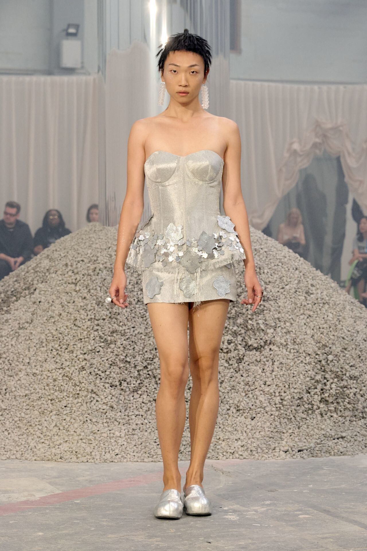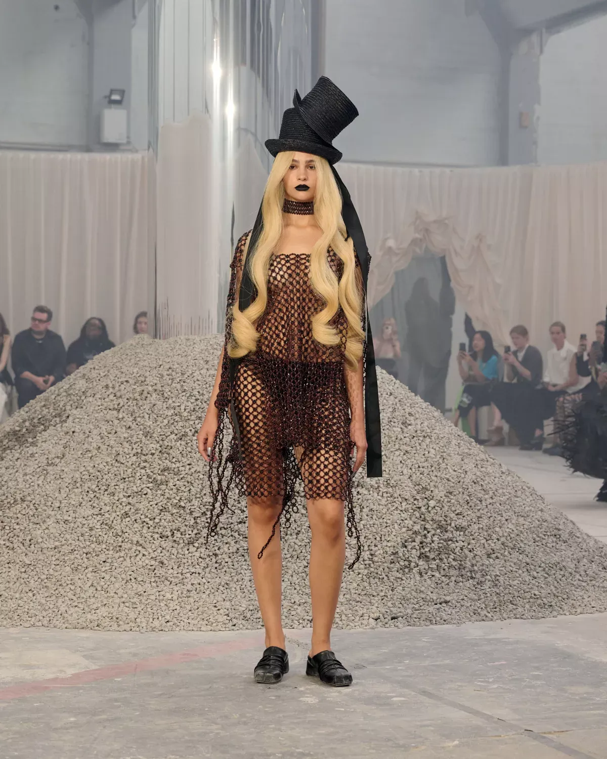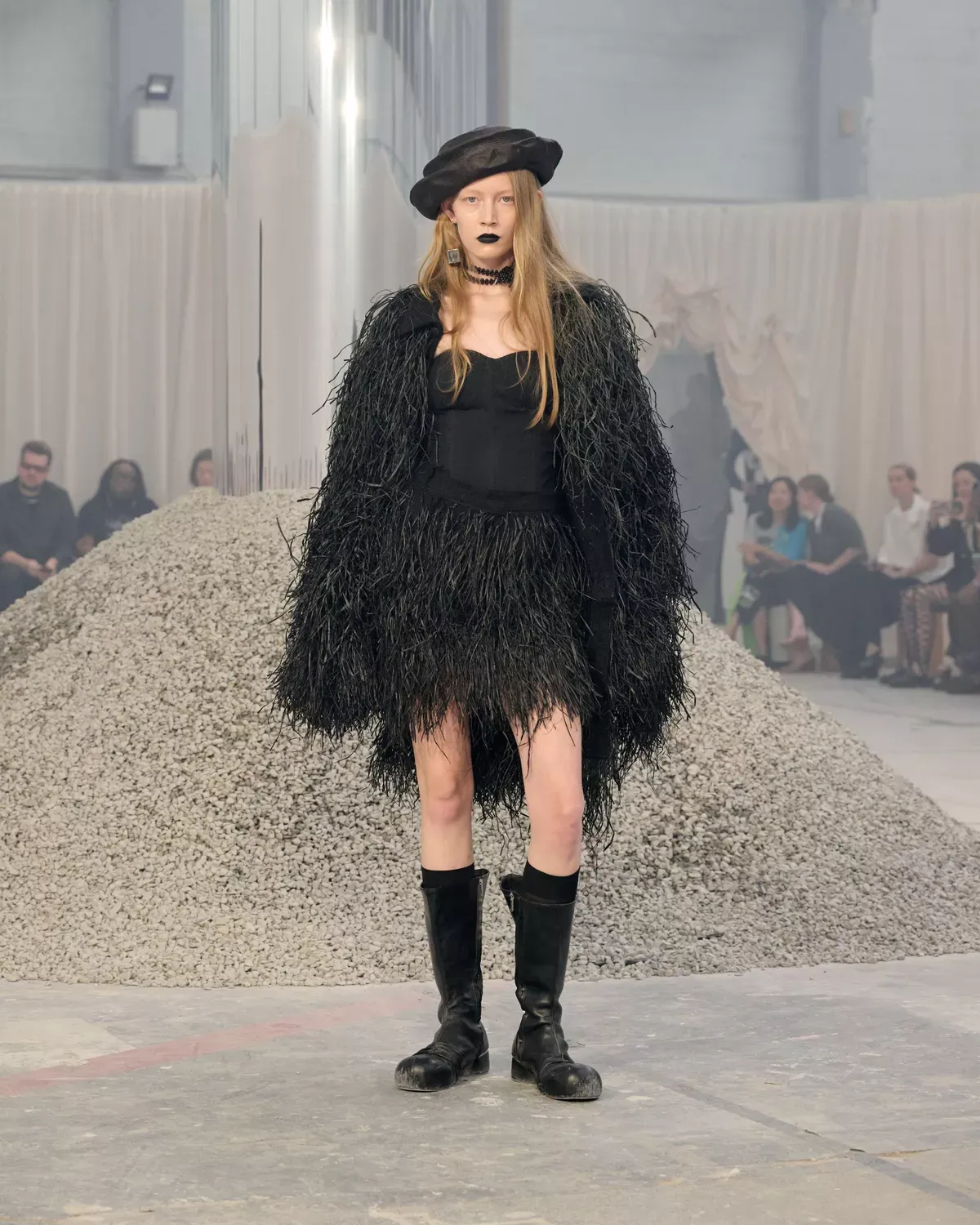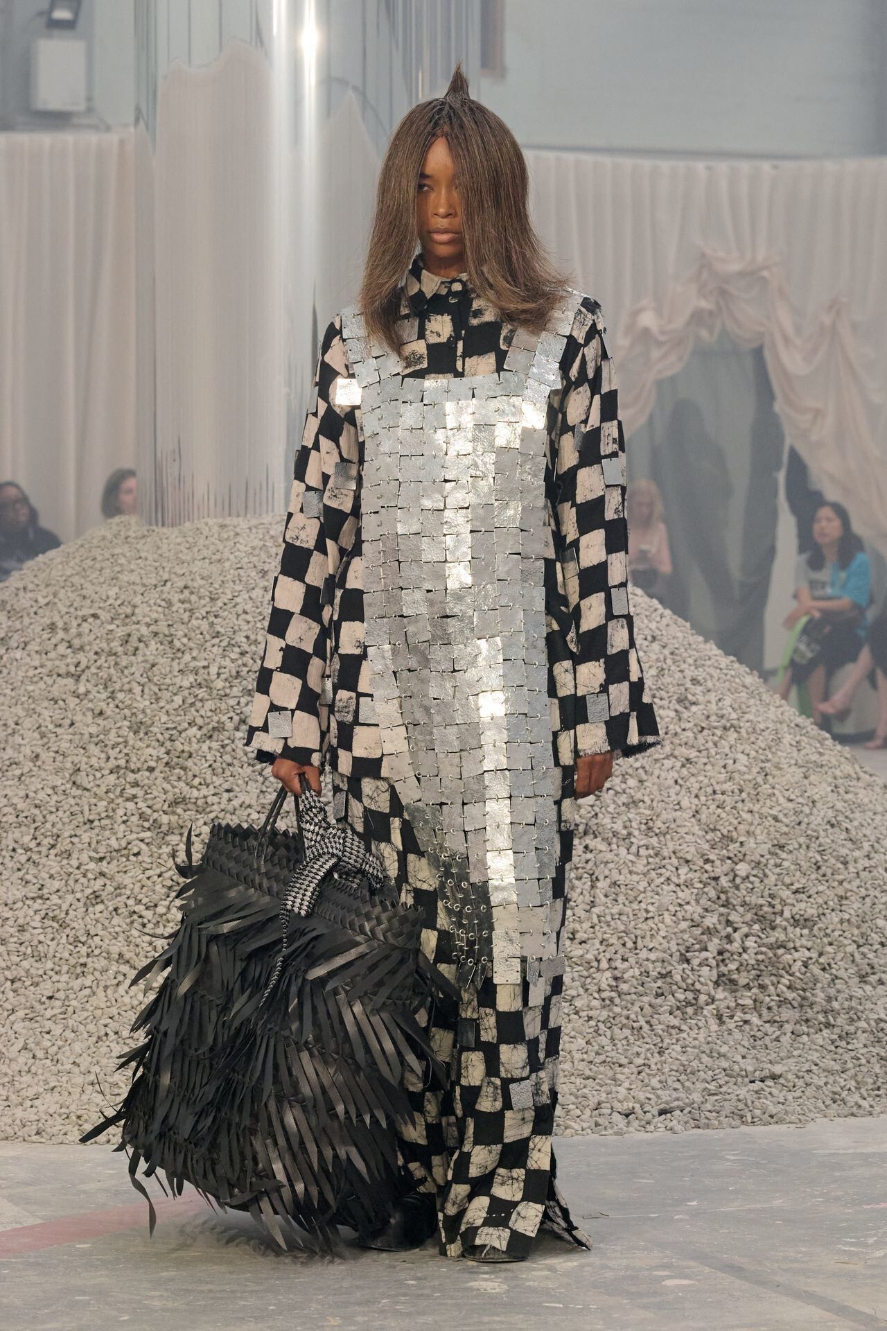 L’artigianato è stato il cuore pulsante della collezione, radicato nelle collaborazioni con artigiani in Nigeria, Kenya e altre regioni sub-sahariane. Tecniche come la tessitura manuale, la forgiatura di maglie metalliche, l’annodatura delle fibre e la soffiatura del vetro sono state utilizzate non come abbellimenti decorativi, ma come pratiche funzionali e spirituali. “Il patrimonio culturale è statico e l'artigianato è pittoresco. Entrambi sono tecnologie viventi”, ha spiegato il designer. “L'artigianato non è solo abilità, è cosmologia. Il patrimonio culturale non è rivolto al passato, è il passato, il presente e il futuro. È memoria strategica e l'industria spesso mercifica entrambi senza comprendere i sistemi da cui derivano”. Queste “tecnologie ancestrali” hanno trasformato materiali grezzi in narrazioni indossabili. Ad esempio, il pezzo scultoreo in rafia ha richiesto settimane di lavoro manuale meticoloso, mentre il cappotto con vetro incastonato ha dimostrato un’innovativa manipolazione dei materiali. Ogni capo testimonia l’impegno di IAMISIGO nel preservare le tradizioni artigianali africane a rischio, risvegliandole in un contesto contemporaneo senza perdere il loro significato culturale. Tra i pezzi più notevoli spiccano un abito scultoreo in rafia, con fibre oscillanti che si animano quando chi lo indossa cammina, e un cappotto in corteccia con frammenti di vetro incastonati che catturano la luce – e questo da solo una piccola misura di quanto Ogisi si sia spinta in là con la sperimentazione sui materiali. Gli accessori, come borse di vetro riempite d’acqua e cappelli intrecciati che possono trasformarsi in recipienti, si trovavano al confine tra funzionalità moderna e antico artigianato, esaltati dalla palette e dalle texture che spaziano da intrecci morbidi e tattili a superfici rigide e riflettenti.