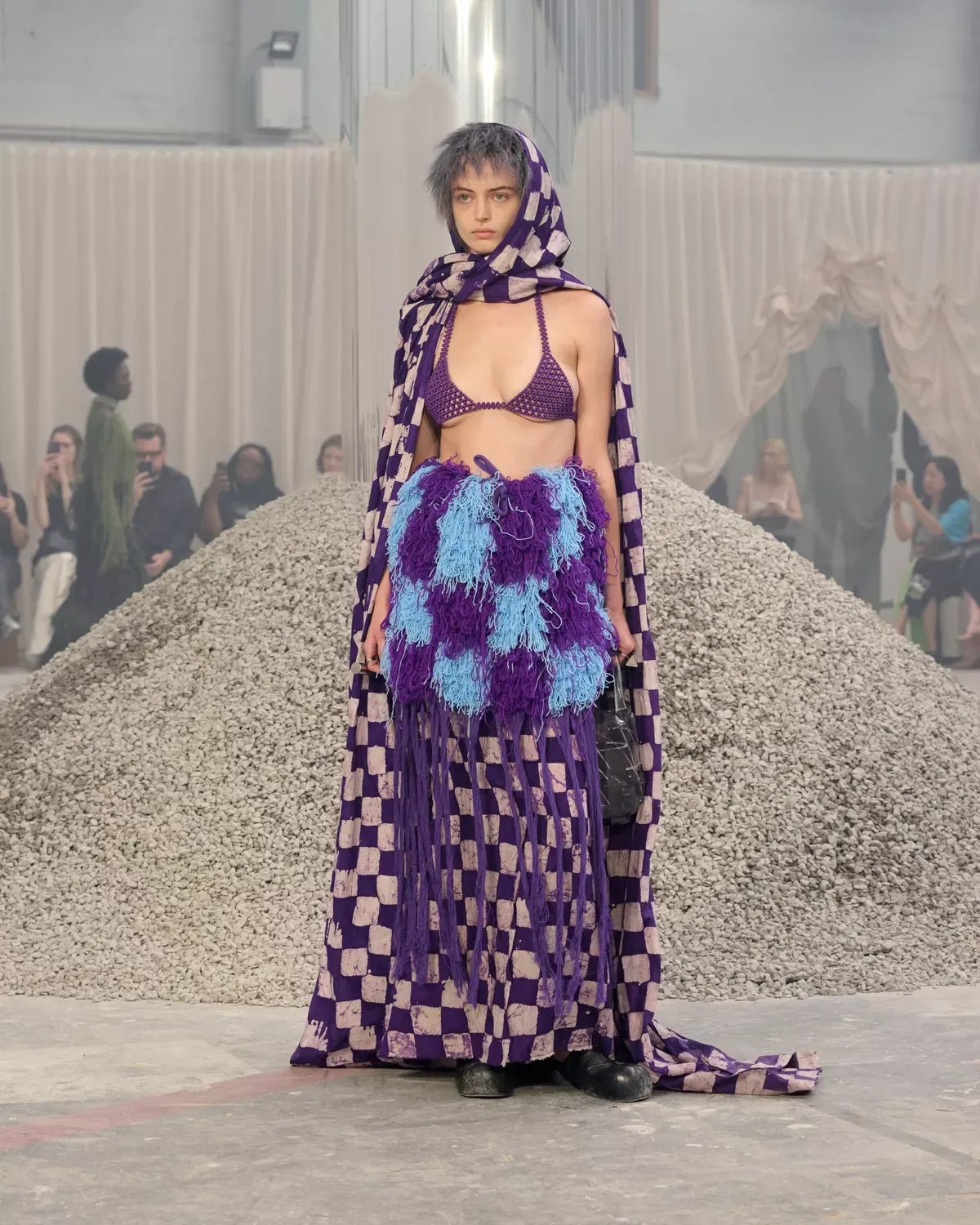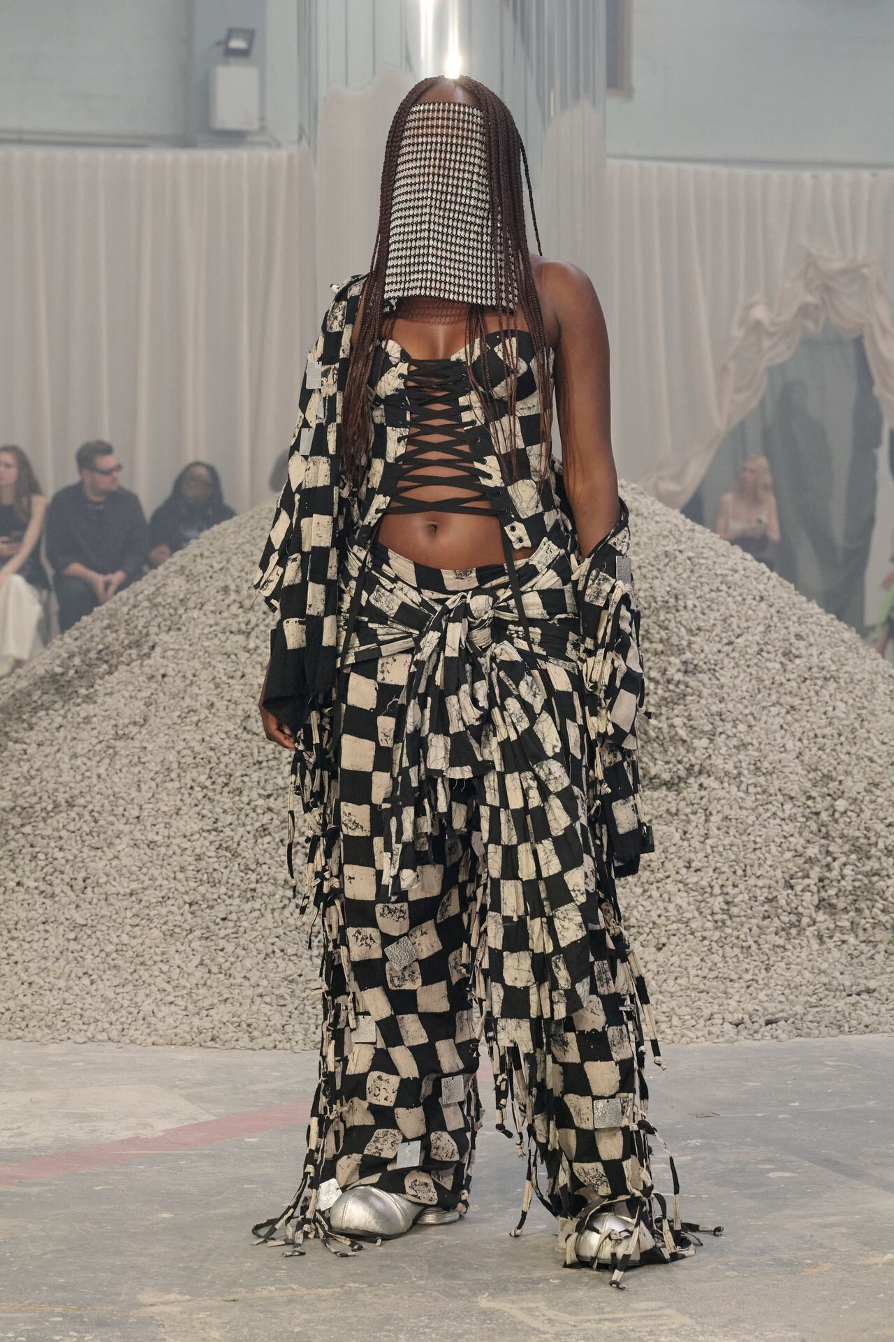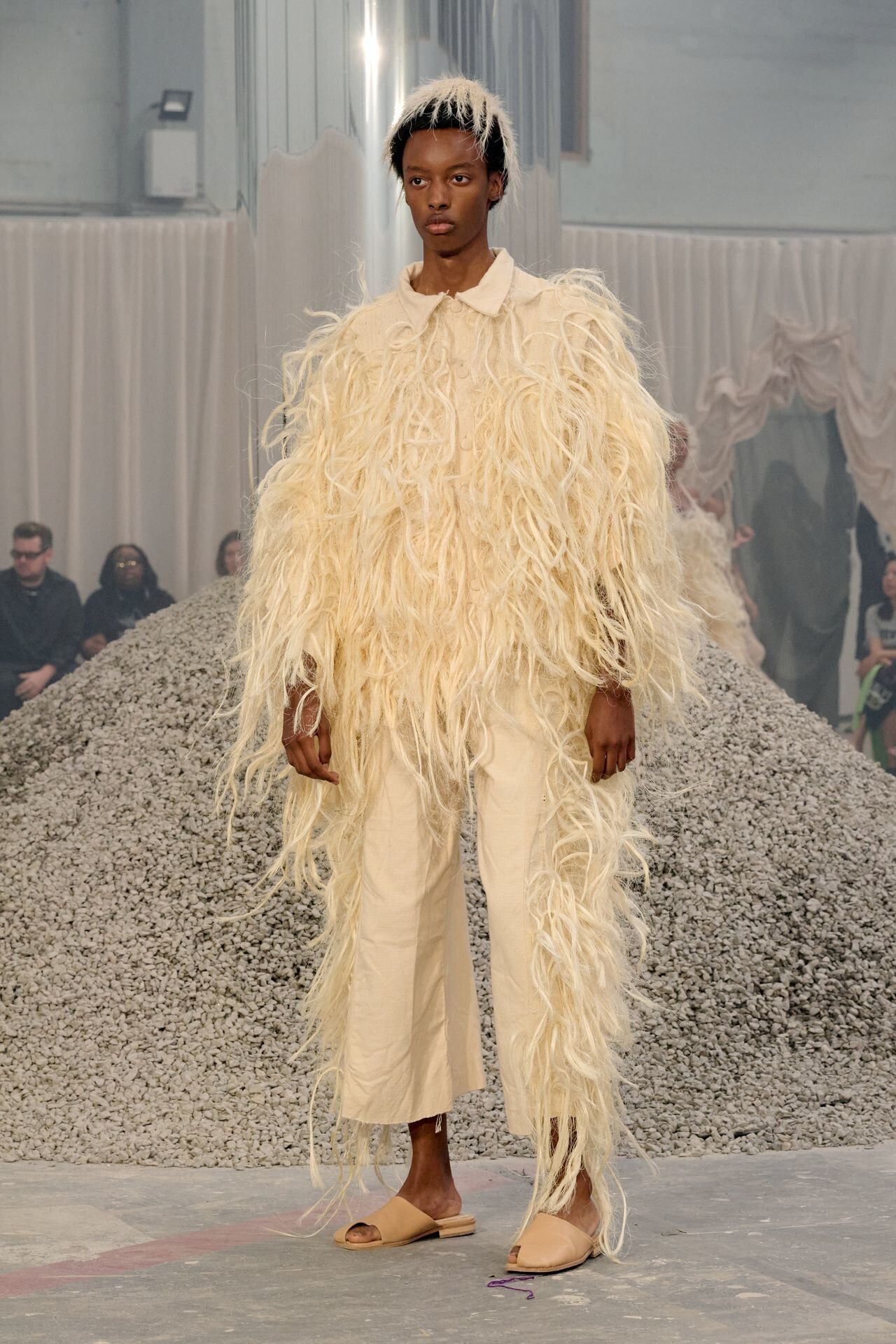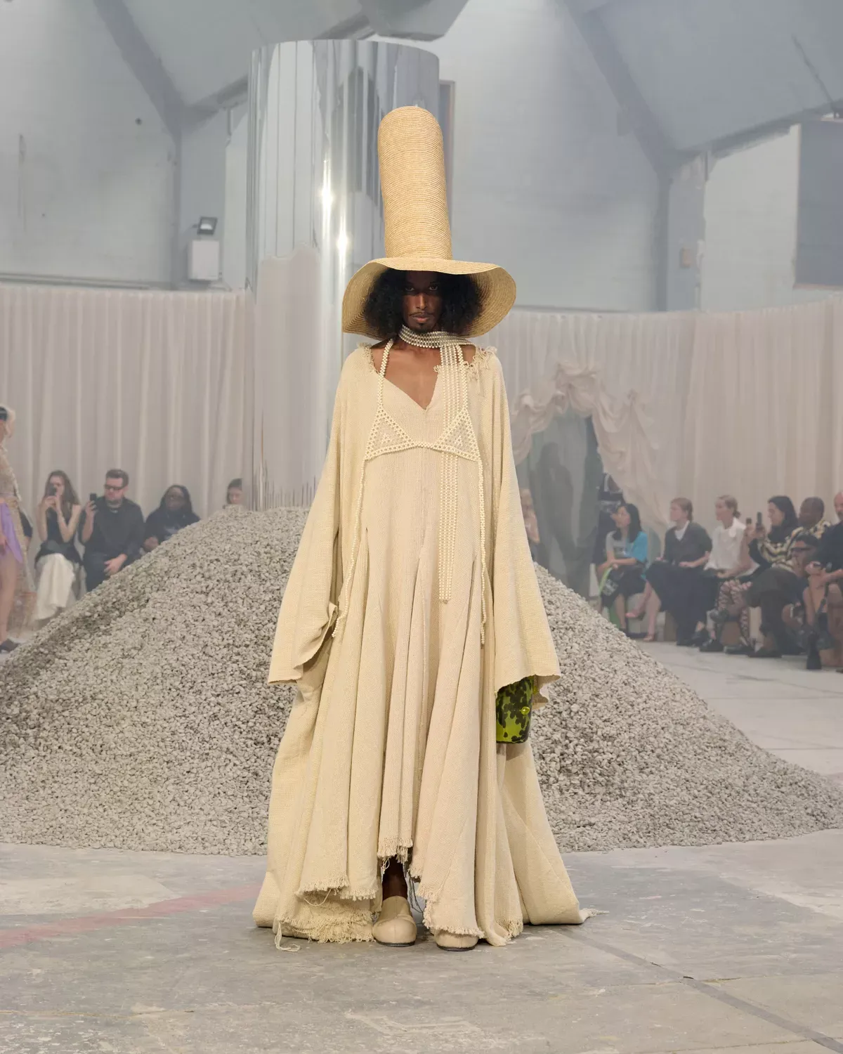 Proprio il lavoro sull’artigianato è parso notevole, dato che è servito da antologia per tutta una serie di tecniche e lavorazioni tipiche di numerosi paesi dell’Africa Centrale portate finalmente davanti a un’audience che forse non le aveva ancora scoperte e sufficientemente apprezzate. Il brand, fondato nel 2009 e poi rilanciato nel 2013, ha sede a Lagos, come dicevamo, ma il suo lavoro si svolge anche tra Nairobi e Accra. Bubu Ogisi, ispirata dai viaggi d’infanzia attraverso l’Africa con sua madre, ha fondato il marchio per preservare il patrimonio culturale immateriale dell’Africa attraverso il proprio concept di arte indossabile. L'idea è quella di ridefinire le narrazioni della moda e, soprattutto, creare capi che siano al tempo stesso antichi e futuristici: o, come l'ha definita il fondatore, “un'accademia itinerante, un santuario culturale, un istituto di ricerca che fonde la scienza dei materiali con la pratica rituale e l'indagine spirituale. È sempre stato più che moda: è un sistema vivente di rievocazione e reimmaginazione”. La filosofia del marchio rifiuta il commercialismo, abbracciando un artigianato nomade e principi di design circolare. Collaborando con comunità artigiane in tutto il continente, IAMISIGO promuove uno scambio reciproco, garantendo che le tecniche tradizionali evolvano pur rimanendo radicate nelle loro origini culturali. E lo show ha dimostrato la capacità di Ogisi di tessere narrazioni complesse, affrontando temi importanti come quello del colonialismo mentre celebra allo stesso tempo un’identità personale e collettiva.
