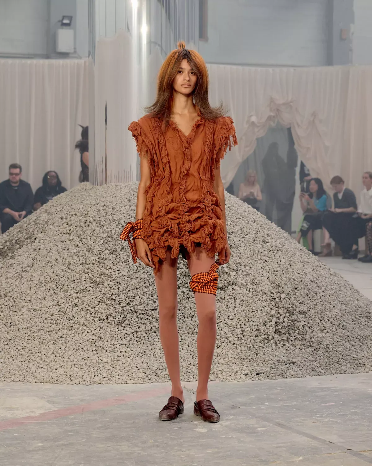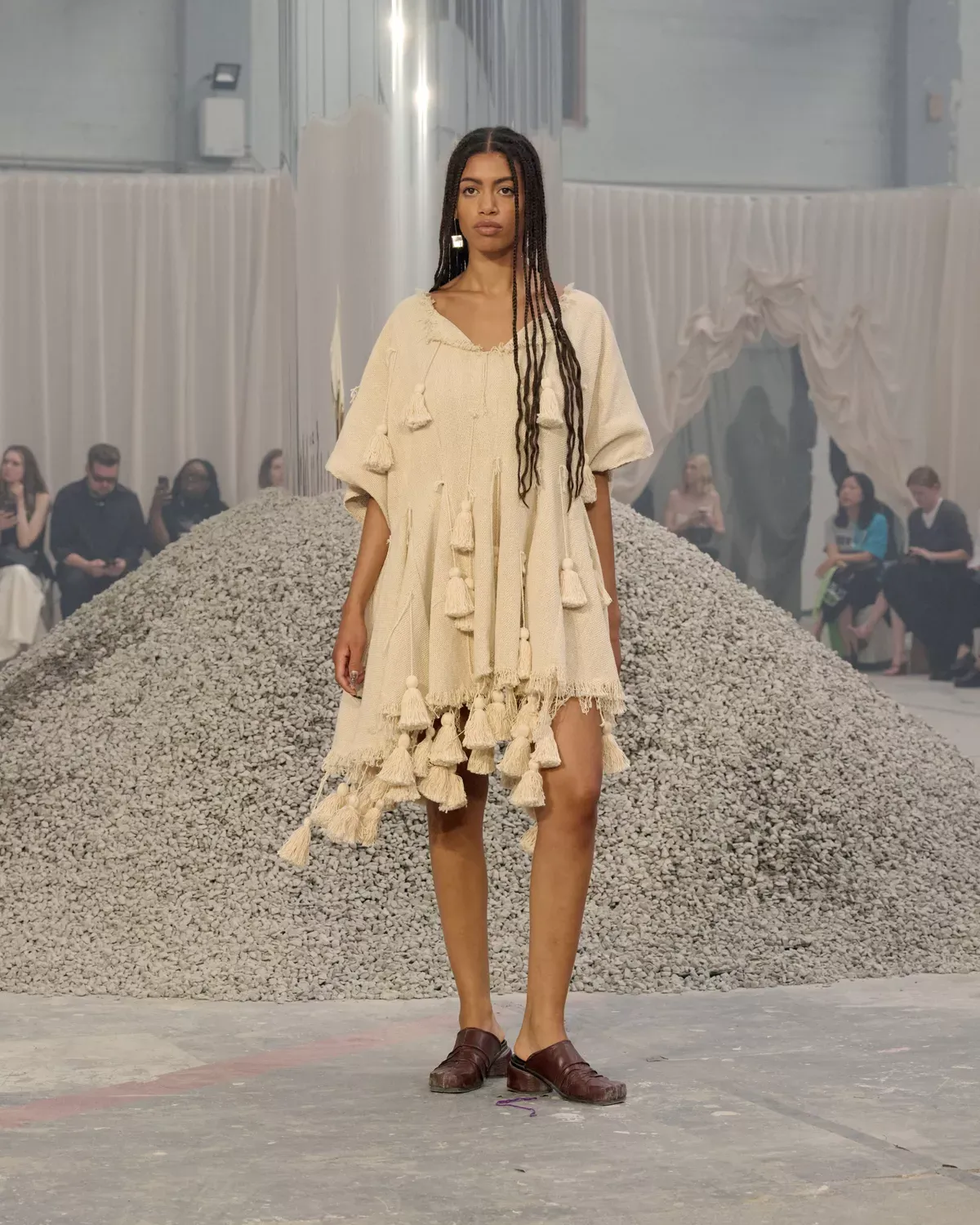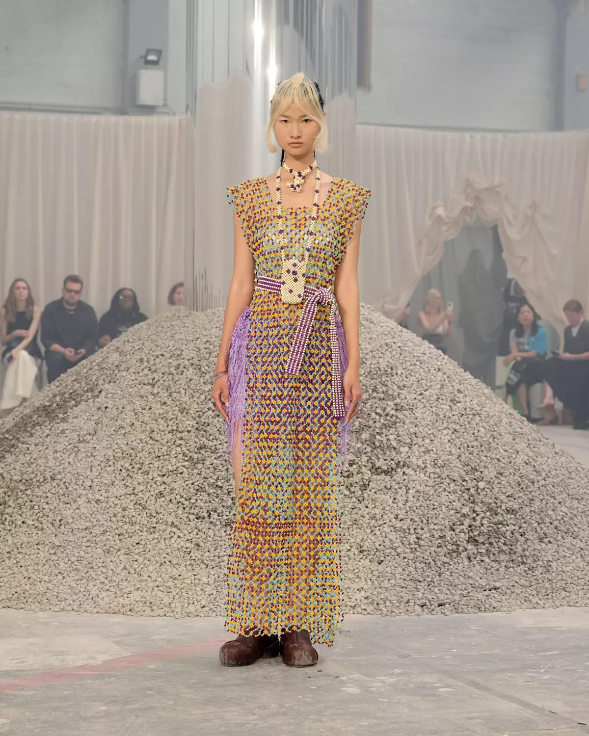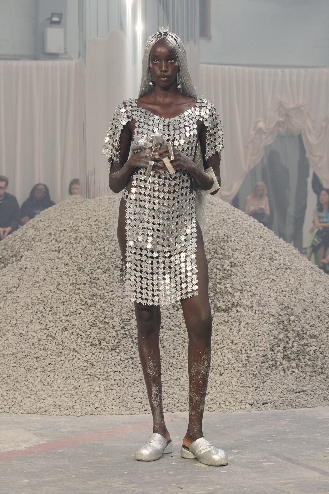 Proprio il lavoro sull’artigianato è parso notevole, dato che è servito da antologia per tutta una serie di tecniche e lavorazioni tipiche di numerosi paesi dell’Africa Centrale portate finalmente davanti a un’audience che forse non le aveva ancora scoperte e sufficientemente apprezzate. Il brand, fondato nel 2009 e poi rilanciato nel 2013, ha sede a Lagos, come dicevamo, ma il suo lavoro si svolge anche tra Nairobi e Accra. Bubu Ogisi, ispirata dai viaggi d’infanzia attraverso l’Africa con sua madre, ha fondato il marchio per preservare il patrimonio culturale immateriale dell’Africa attraverso il proprio concept di arte indossabile. L'idea è quella di ridefinire le narrazioni della moda e, soprattutto, creare capi che siano al tempo stesso antichi e futuristici: o, come l'ha definita il fondatore, “un'accademia itinerante, un santuario culturale, un istituto di ricerca che fonde la scienza dei materiali con la pratica rituale e l'indagine spirituale. È sempre stato più che moda: è un sistema vivente di rievocazione e reimmaginazione”. La filosofia del marchio rifiuta il commercialismo, abbracciando un artigianato nomade e principi di design circolare. Collaborando con comunità artigiane in tutto il continente, IAMISIGO promuove uno scambio reciproco, garantendo che le tecniche tradizionali evolvano pur rimanendo radicate nelle loro origini culturali. E lo show ha dimostrato la capacità di Ogisi di tessere narrazioni complesse, affrontando temi importanti come quello del colonialismo mentre celebra allo stesso tempo un’identità personale e collettiva.