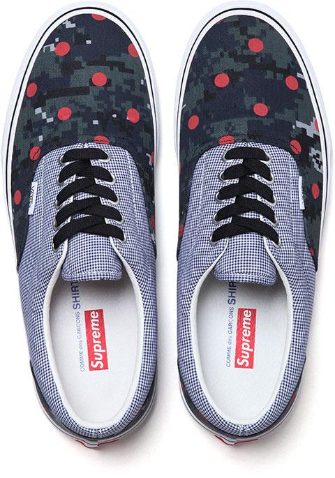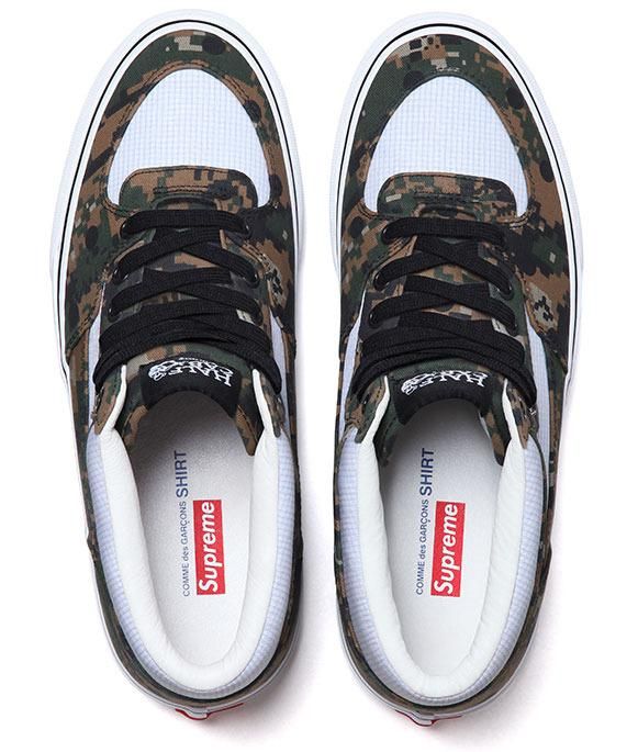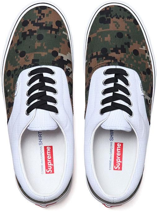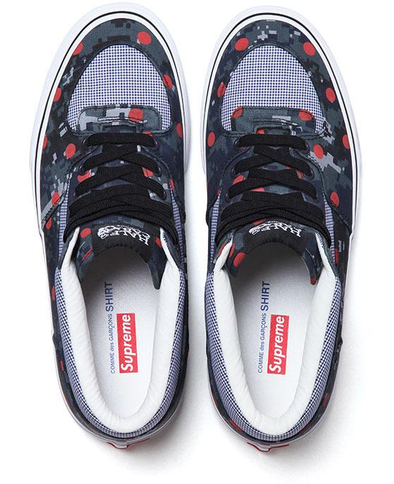 Oltre alla collaborazione con CDG di camicie e T-shirts, Supreme nella stessa Capsule Collection, include due modelli di Vans Classiche, le Half Cab, del leggendario Skater Steve Caballero, e le Era, nei colori e fantasie usate per la collezione. Un Camouflage rivisitato in chiave moderna e mixato agli iconici pois distinitivi di Comme Des Garçons. Disponibili dal 14 marzo online.