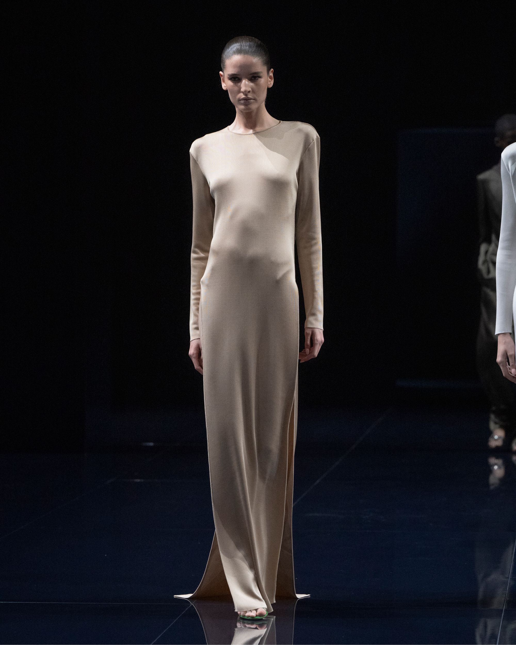 Come spiega Ackerman: «C’è una dignità nella purezza, nell’atto di togliere piuttosto che ornare, nel trasformare l’ornamento in forme architettoniche che completano o accessorizzano sottilmente il corpo.» In questa seconda collezione, il designer ci dimostra che less è davvero more, e che il buon gusto risiede precisamente nella misura e nell’equilibrio, senza cadere nell’eccesso di controllo. Dai lunghi abiti dalle linee pulite alle camicie da notte più seducenti, passando per short che sembrano quasi costumi da bagno fino ai completi tre pezzi, Ackerman riesce a raggiungere il perfetto livello di rivelazione, lasciando giusto quel tanto di tessuto da farci desiderare di vedere di più, senza però mostrare ciò che non serve scoprire. Proprio come una festa privata dal profumo di champagne costoso e seta, la SS26 di Tom Ford è una celebrazione che inizia al mattino e finisce a tarda notte, un’ode alla leggerezza dell’essere, del suo corpo e del suo spirito. Con questa collezione, Ackerman ci dimostra così che il sexy può rappresentare anche la quintessenza dello chic. La seduzione non è più un tabù, non è più soggetta al giudizio, è un dialogo aperto, a portata di mano, al quale tutti vogliono partecipare, anche a costo di parlarsi sopra.