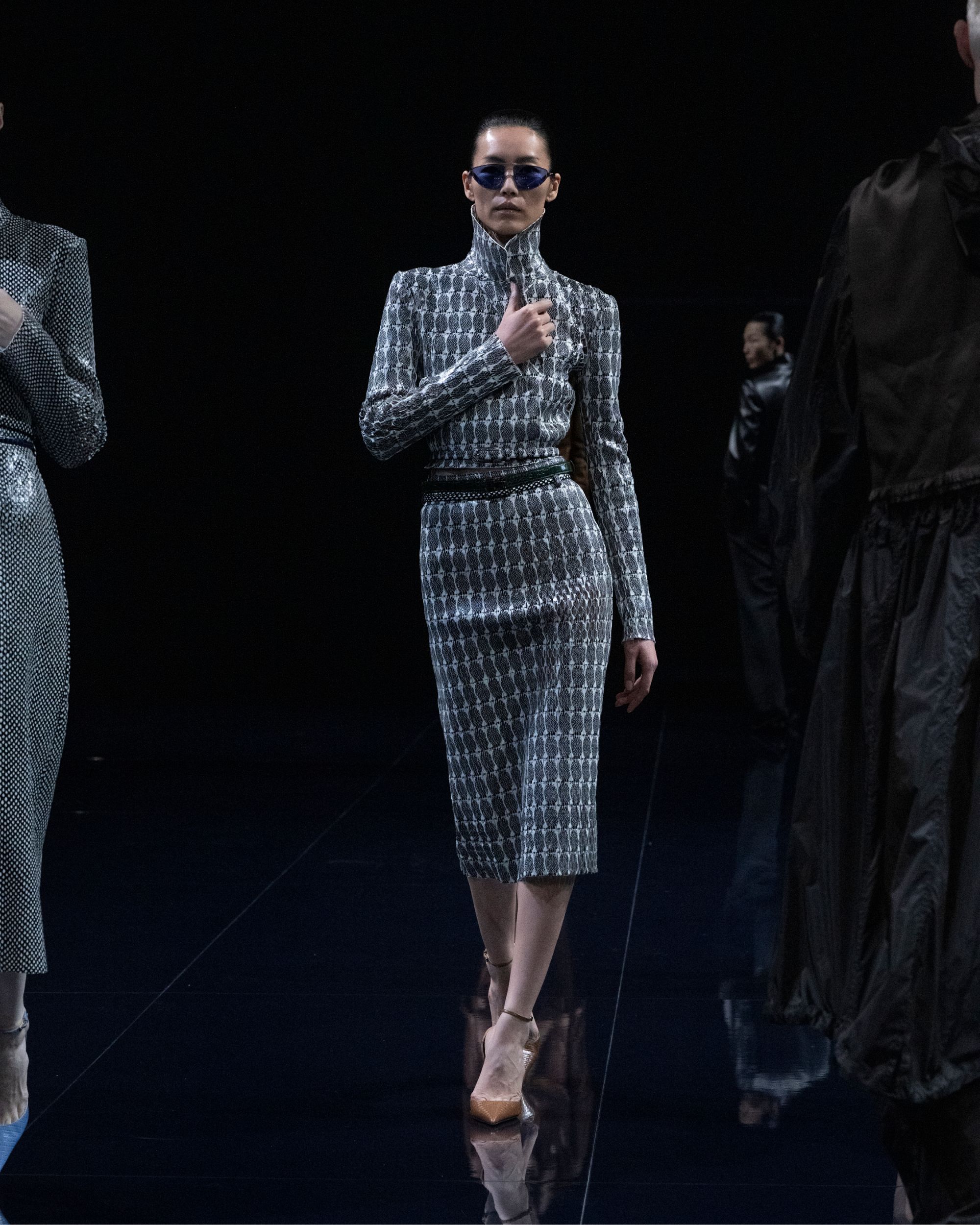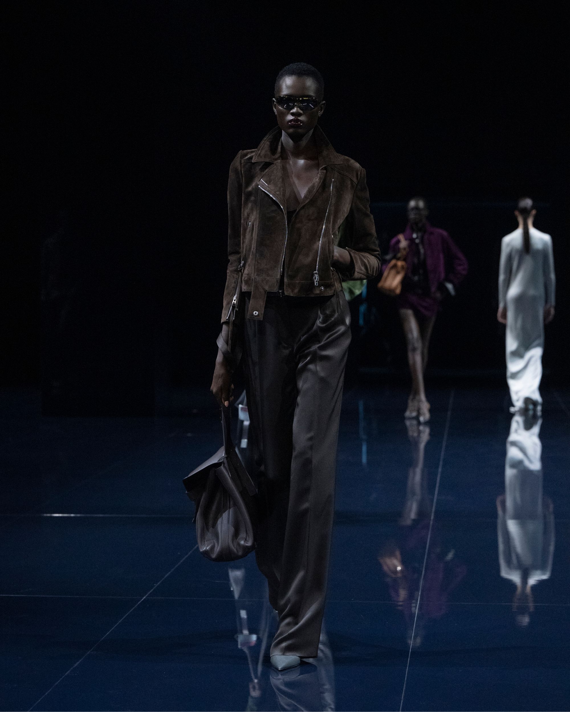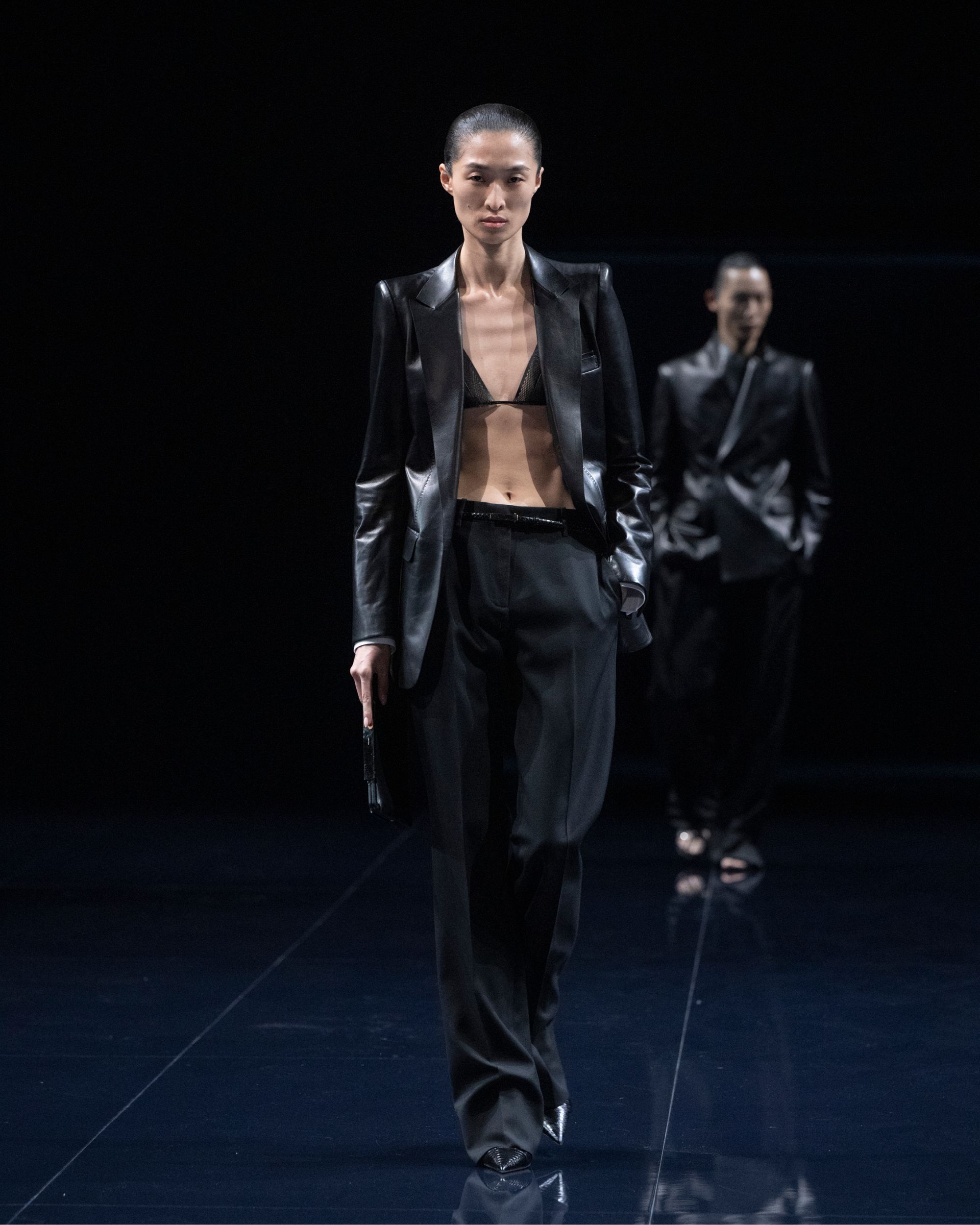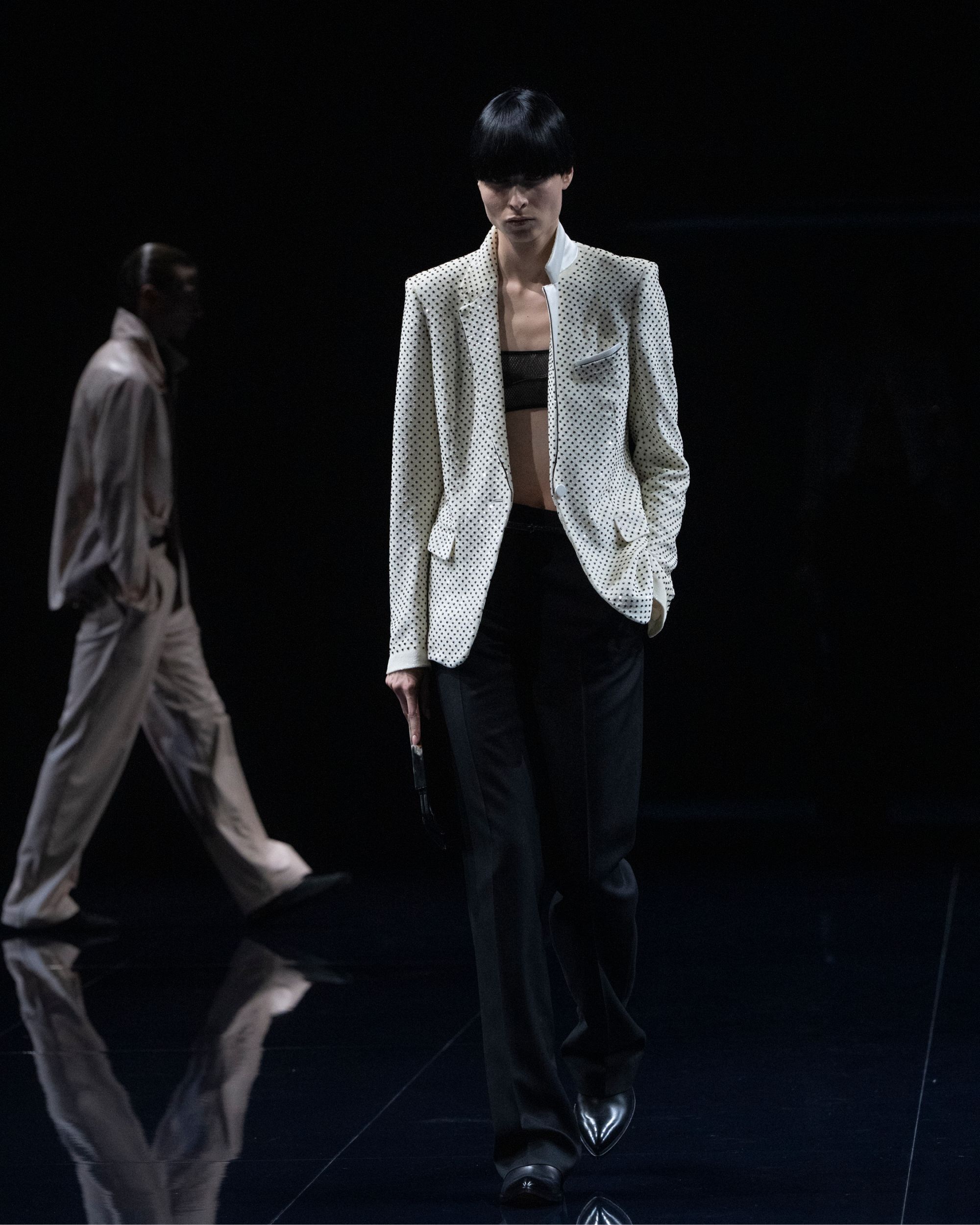 Se pensate ancora che il giorno e la notte non possano brillare simultaneamente, che sia impossibile che sexy e chic convivano in armonia e che desiderabilità faccia rima con volgarità, Haider Ackerman vi dimostrerà il contrario. Su uno sfondo blu notte e accompagnata dalla voce a cappella di David Bowie, la SS26 di Tom Ford, la seconda collezione di Ackerman per la maison americana, è stata presentata ieri a Parigi. Una collezione di silhouette intessute di desiderio e intrise di un allure che profuma di club privato, quello che si intravede da lontano, che si desidera, che si vuole vivere, ma il cui ingresso va meritato. Da Tom Ford la seduzione è un dialogo. Un dialogo poliglotta, a giudicare da questa SS26, che non si ferma davanti alle barriere linguistiche per incantare, sedurre e soprattutto conquistare. I primi look a calcare la passerella annunciano subito il tono: la collezione sarà sexy ma non volgare, chic ma non noiosa, enigmatica, quasi irraggiungibile eppure perfettamente a portata di mano.
