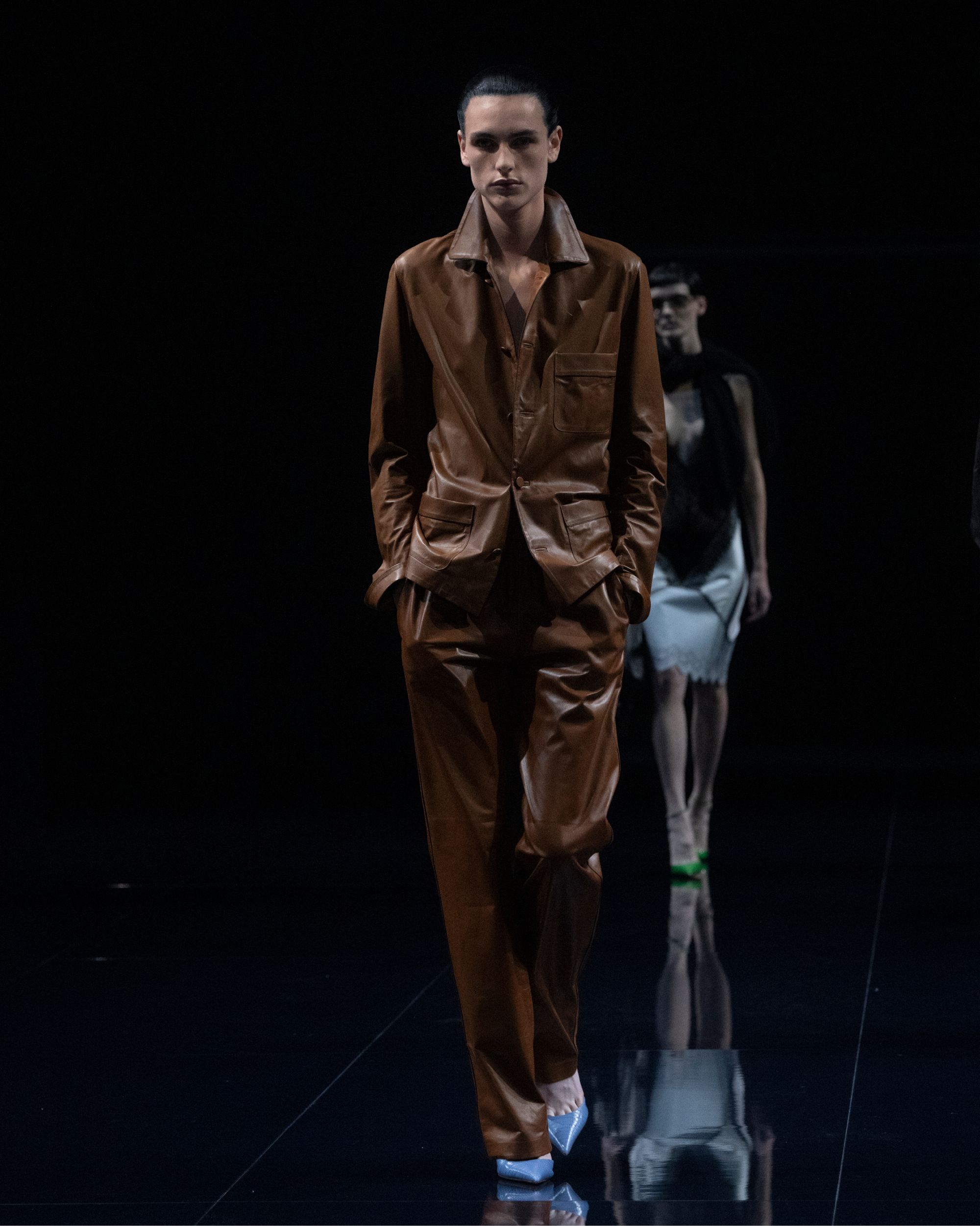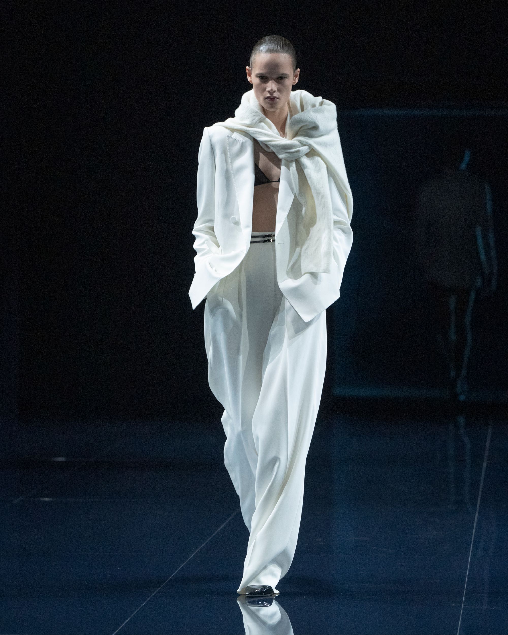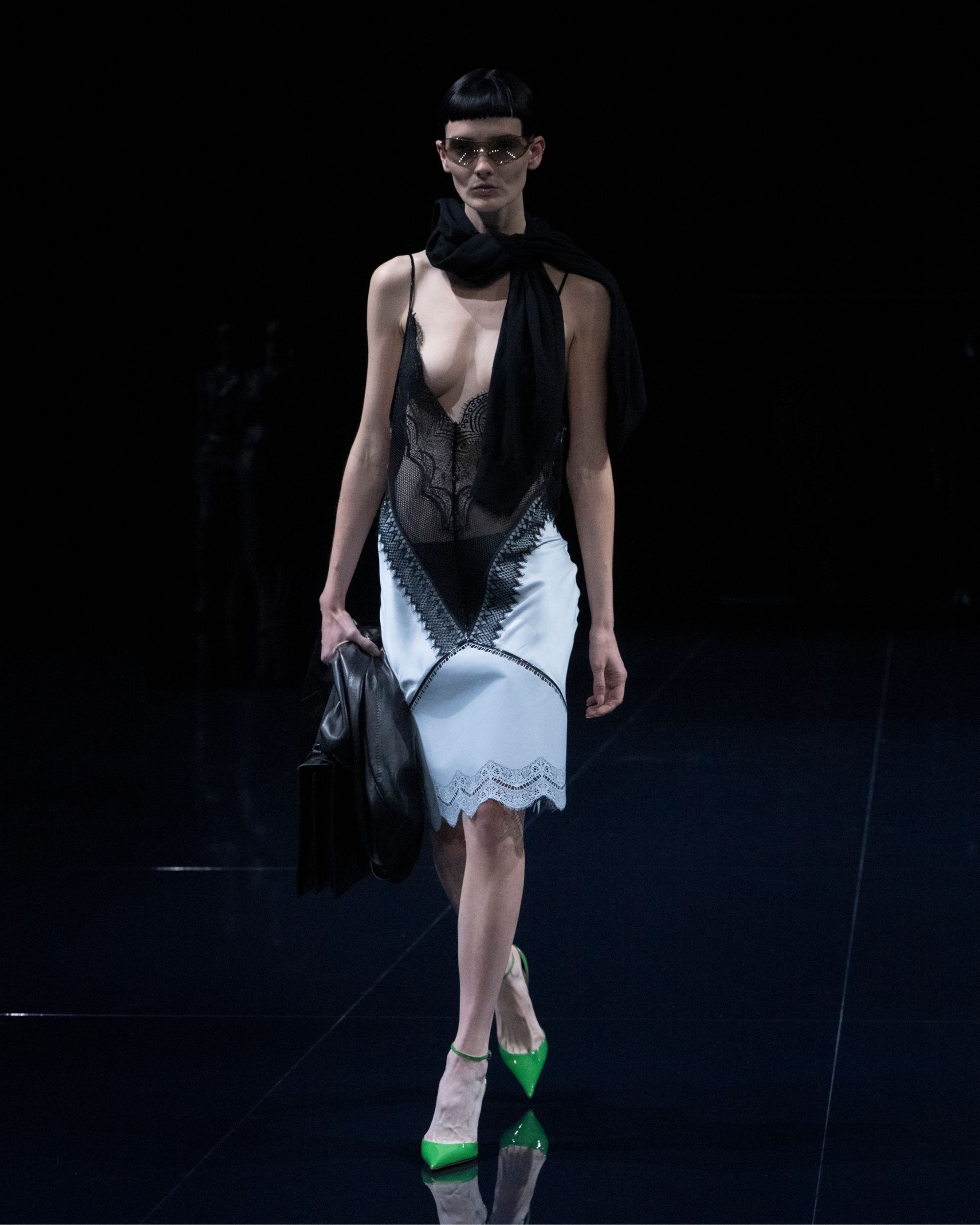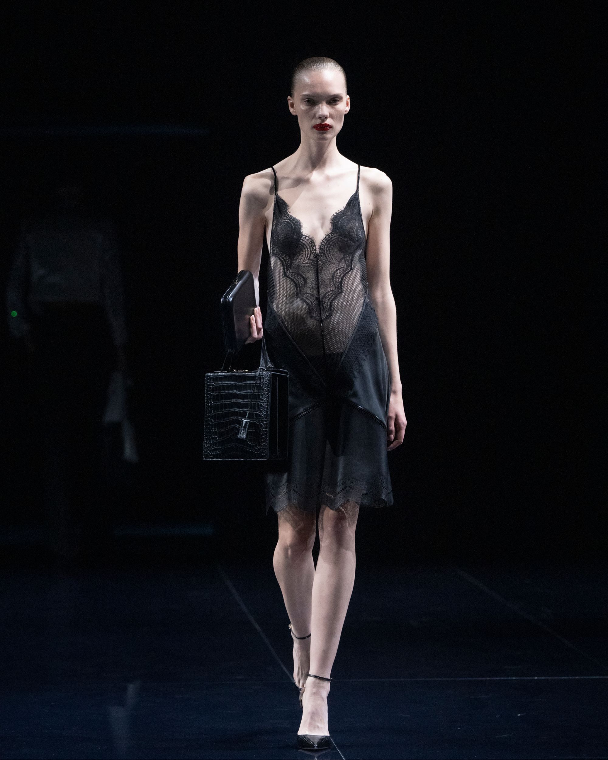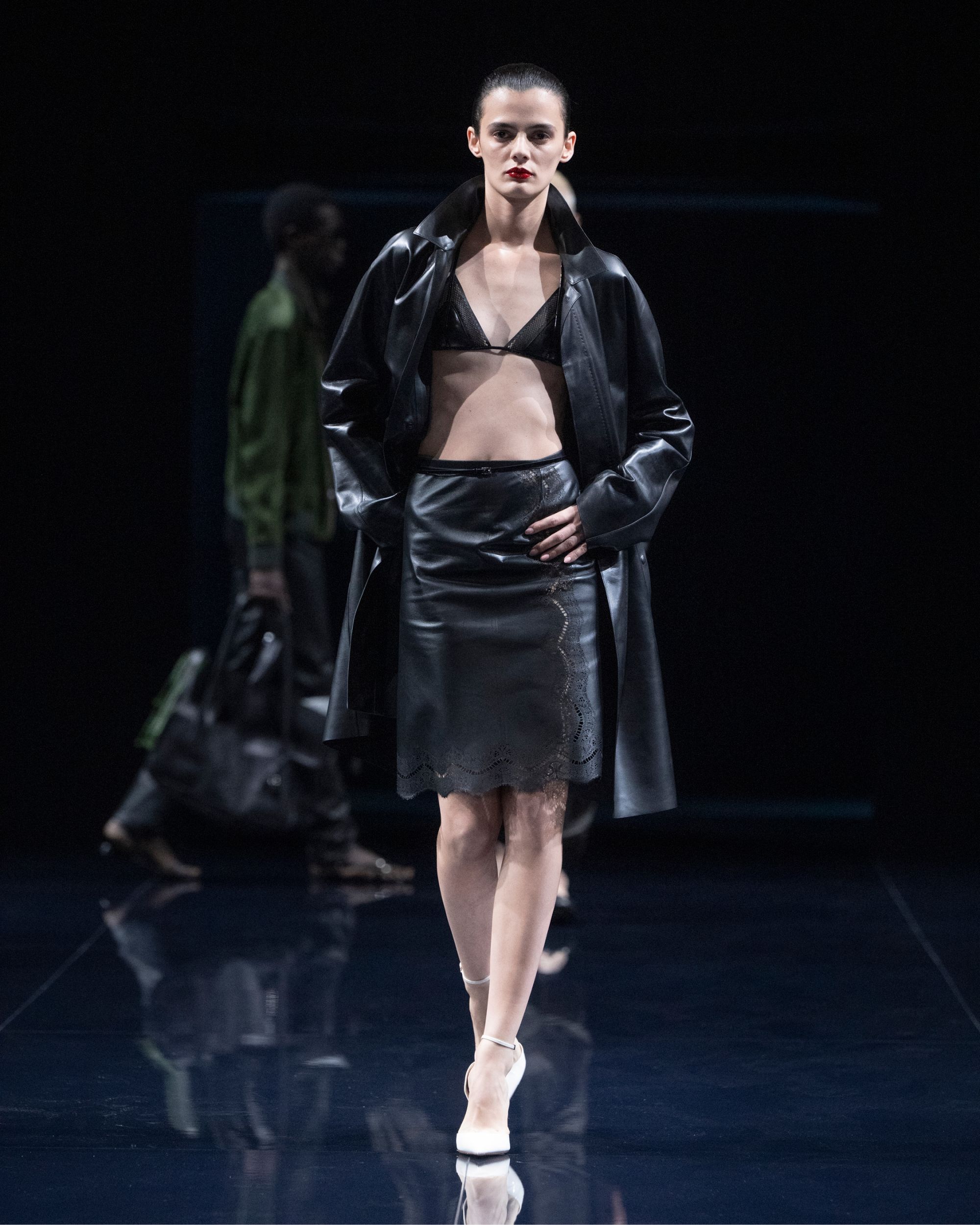 La collezione si apre con un trio di look glamour e misteriosi, composti da trench lucidi abbottonati fino al mento, accompagnati da décolleté semplici ma efficaci. Arriva poi un bianco puro, immacolato, quasi astratto, declinato in completi ora coprenti ora rivelatori. Seguono in un contrasto profondo ma controllato l’intensità dei colori, come il verde abete e il viola, applicati a giacche di velluto altrettanto denso, che tuttavia presto lasciano spazio al nero, alla pelle, a un lato oscuro verso cui ci si lascia trascinare senza resistenza né contestazione. La frivolezza ritorna però rapidamente, grazie a micro-short trasparenti, camicie da notte scoperte, gonne opalescenti o camicie aperte. L’andata e ritorno tra formale e informale è costante, eppure il mal d’auto non ci coglie mai. Il confine tra ciò che deve restare nascosto e ciò che può essere svelato è sottile, pericoloso, eppure la paura di attraversarlo non esiste. La sfera della casa, del privato e della festa si mescolano, dandoci l’impressione che l’uno si inviti continuamente nell’altro senza mai essere di troppo. In pochi look la passerella si trasforma in un salotto privato, in una discoteca, in una camera da letto, persino in un ufficio, eppure ogni silhouette sembra adatta all’occasione.