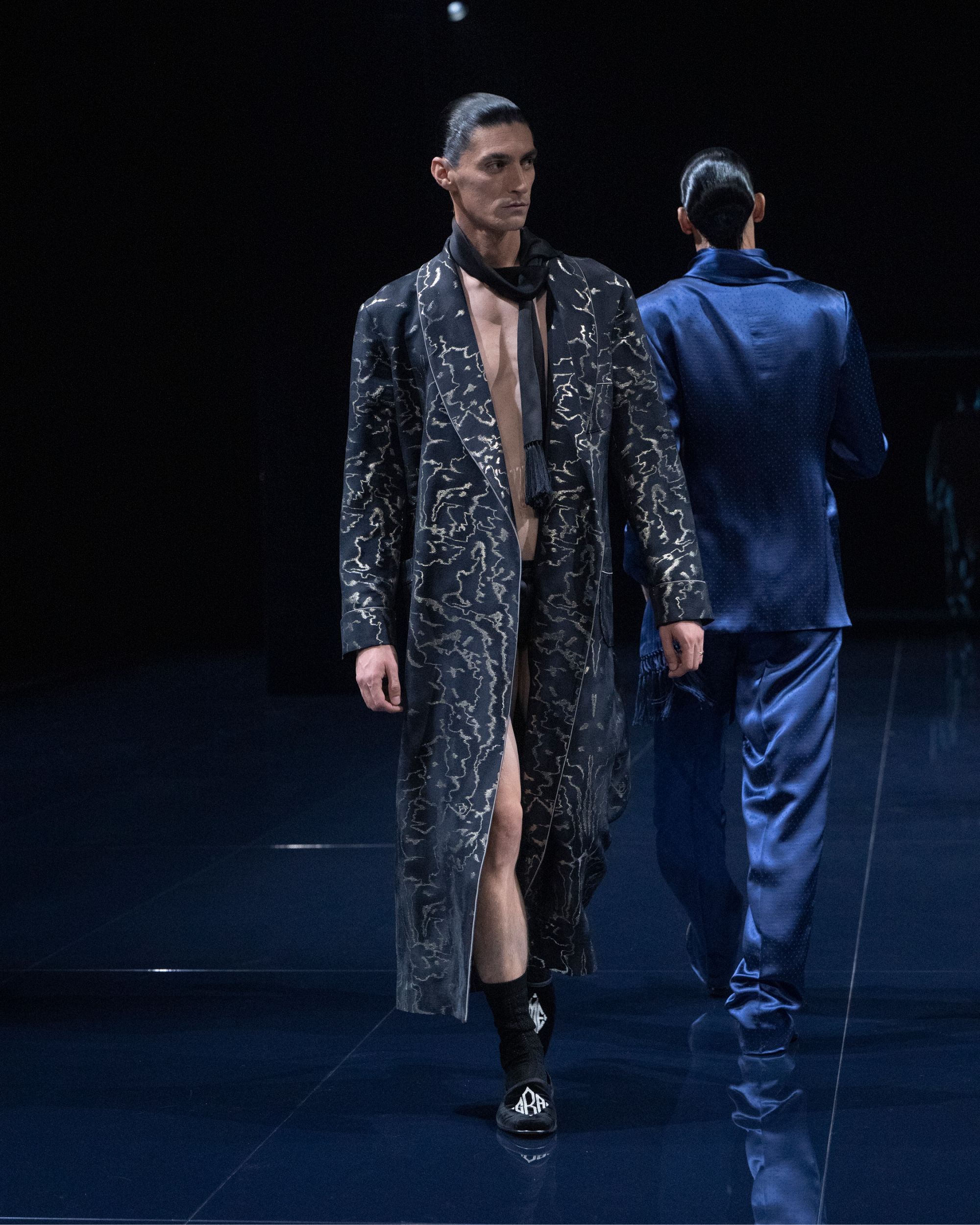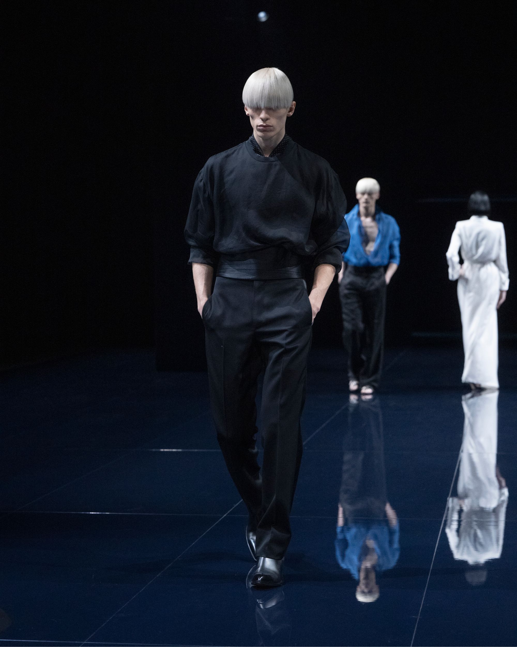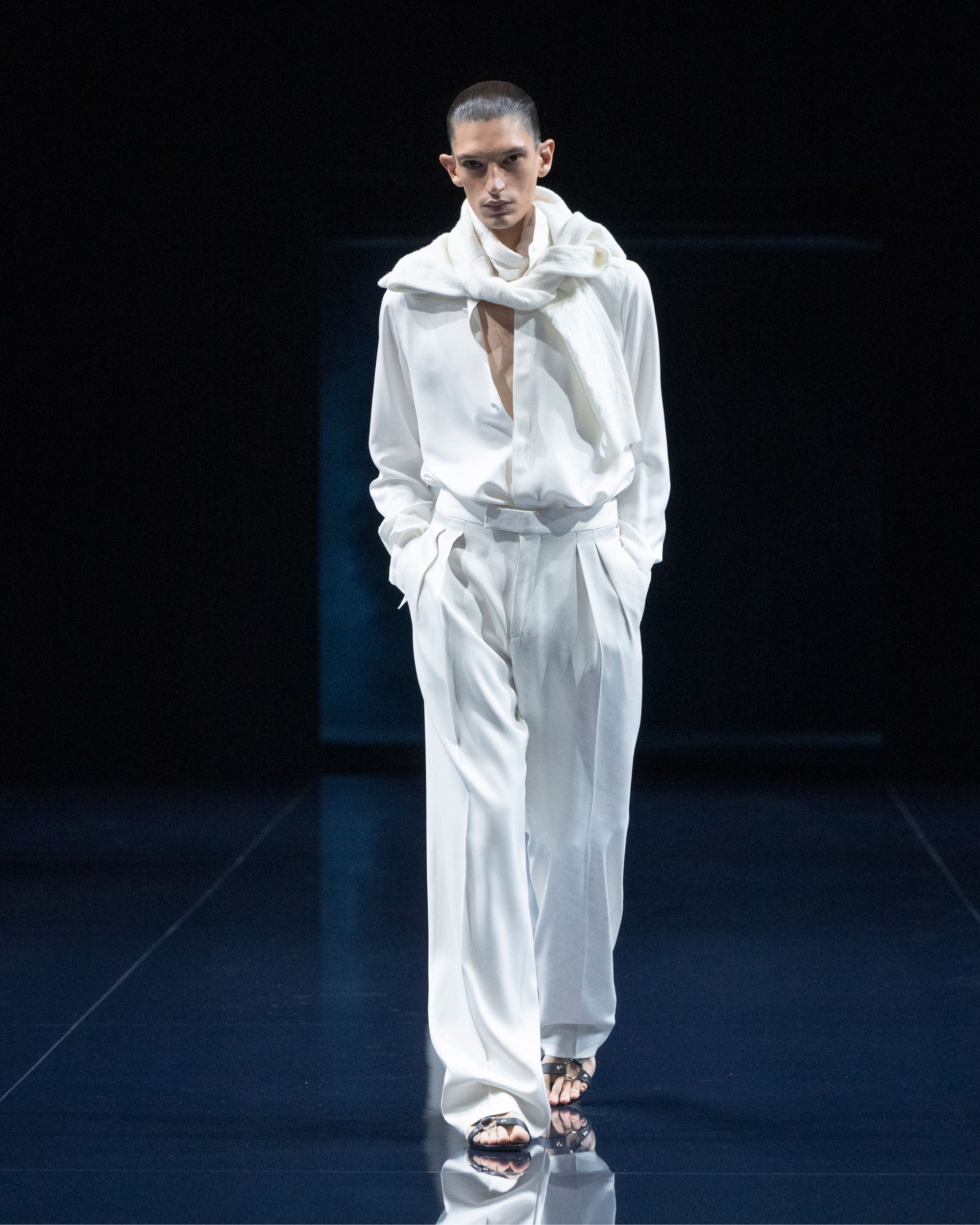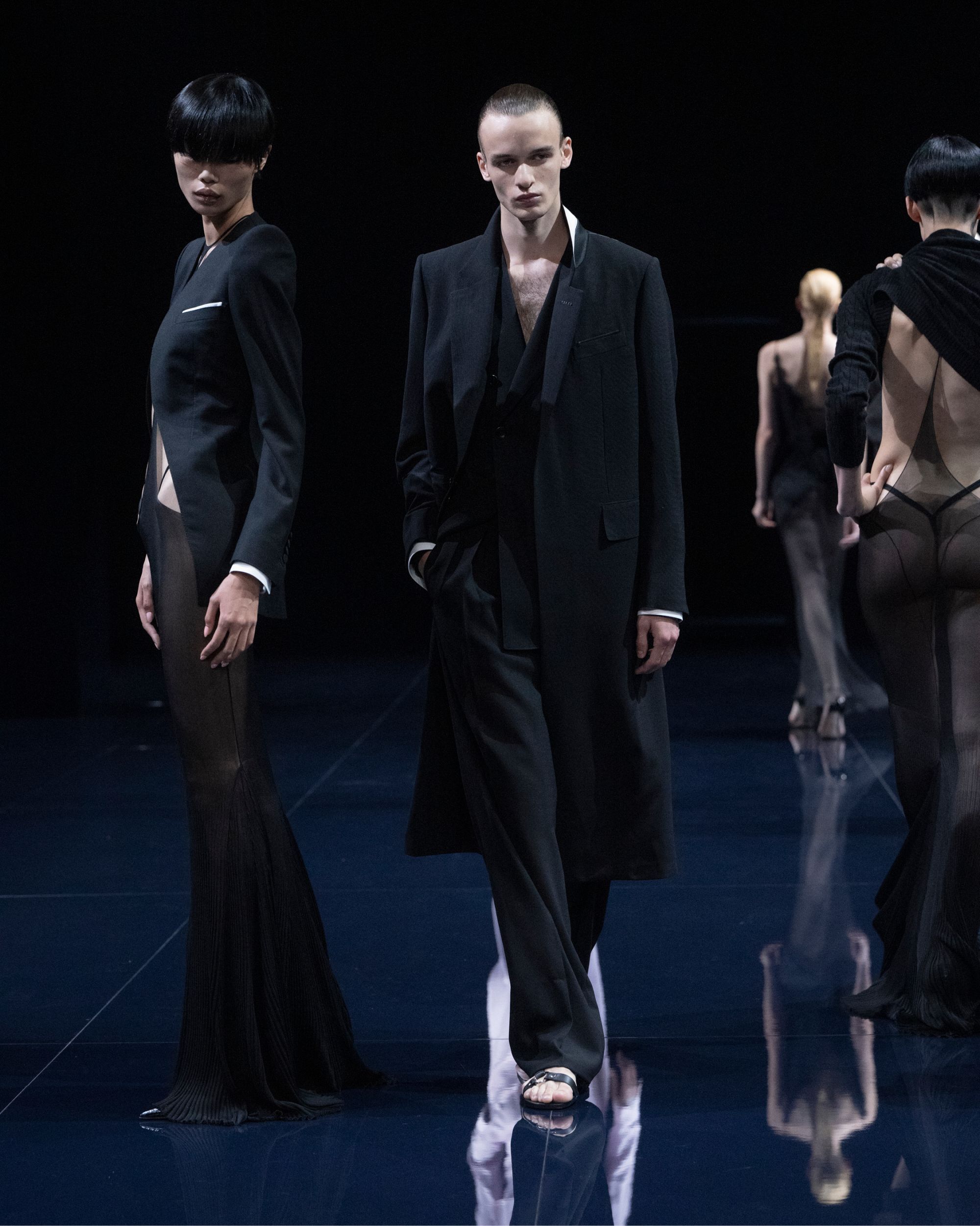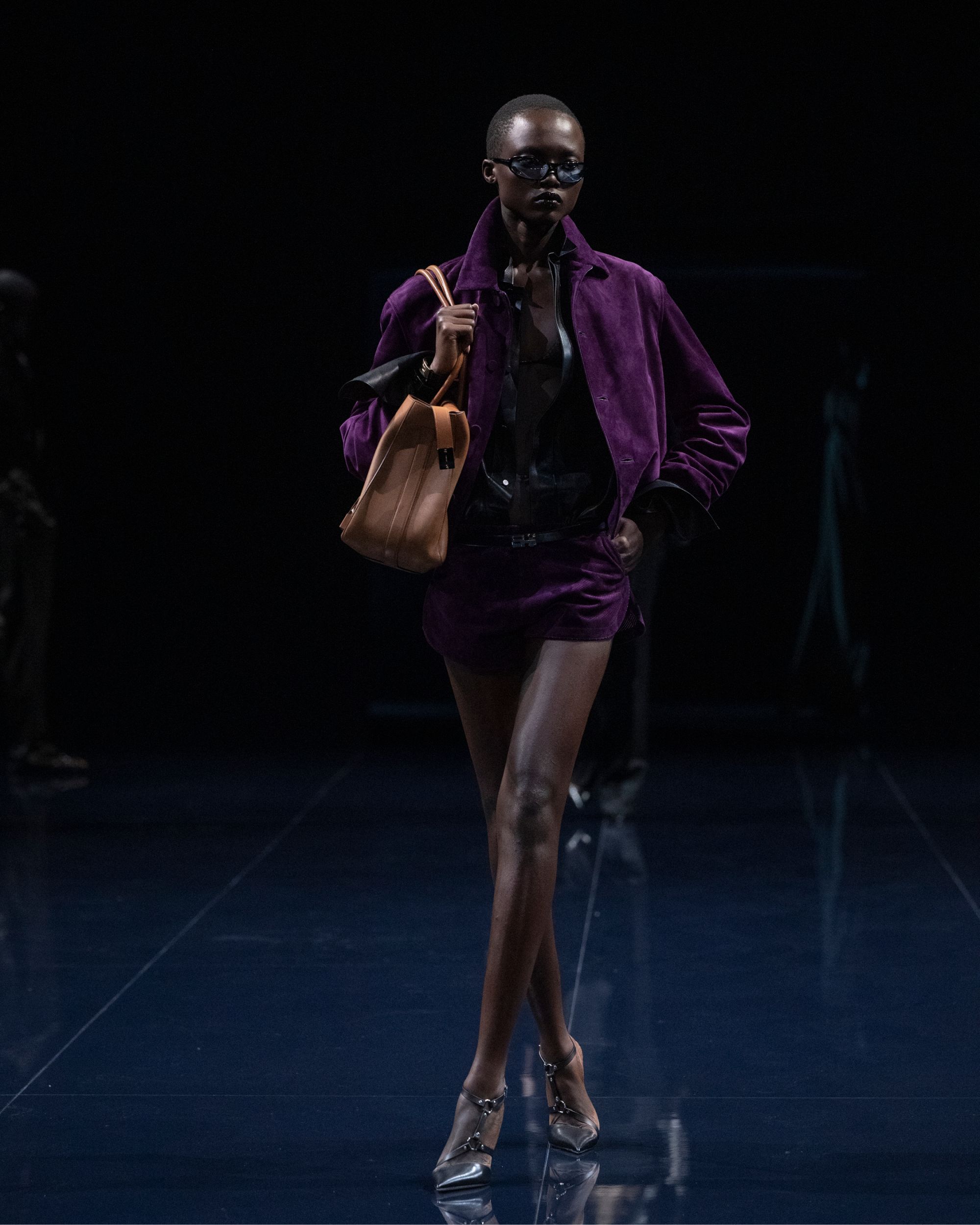 La collezione si apre con un trio di look glamour e misteriosi, composti da trench lucidi abbottonati fino al mento, accompagnati da décolleté semplici ma efficaci. Arriva poi un bianco puro, immacolato, quasi astratto, declinato in completi ora coprenti ora rivelatori. Seguono in un contrasto profondo ma controllato l’intensità dei colori, come il verde abete e il viola, applicati a giacche di velluto altrettanto denso, che tuttavia presto lasciano spazio al nero, alla pelle, a un lato oscuro verso cui ci si lascia trascinare senza resistenza né contestazione. La frivolezza ritorna però rapidamente, grazie a micro-short trasparenti, camicie da notte scoperte, gonne opalescenti o camicie aperte. L’andata e ritorno tra formale e informale è costante, eppure il mal d’auto non ci coglie mai. Il confine tra ciò che deve restare nascosto e ciò che può essere svelato è sottile, pericoloso, eppure la paura di attraversarlo non esiste. La sfera della casa, del privato e della festa si mescolano, dandoci l’impressione che l’uno si inviti continuamente nell’altro senza mai essere di troppo. In pochi look la passerella si trasforma in un salotto privato, in una discoteca, in una camera da letto, persino in un ufficio, eppure ogni silhouette sembra adatta all’occasione.
