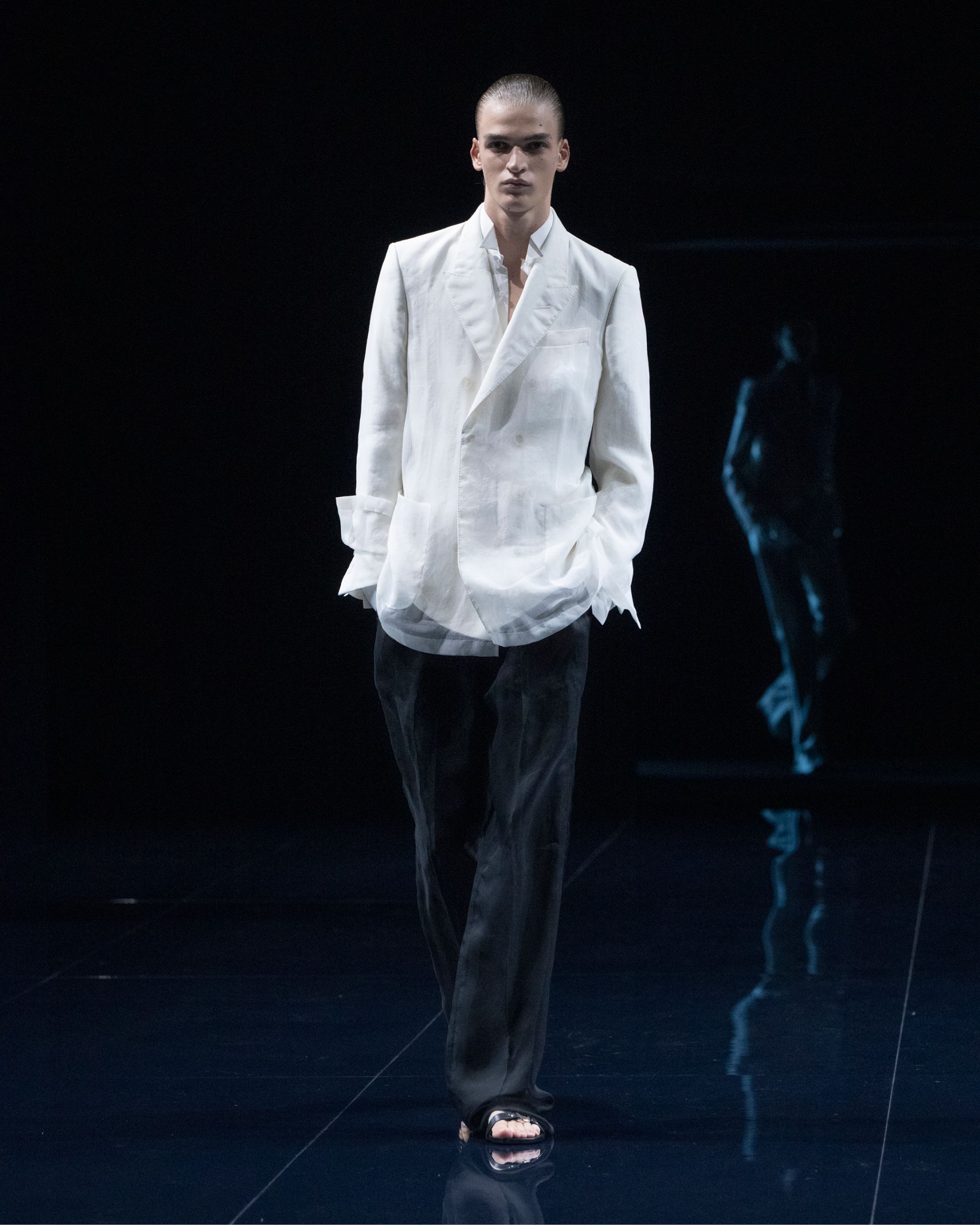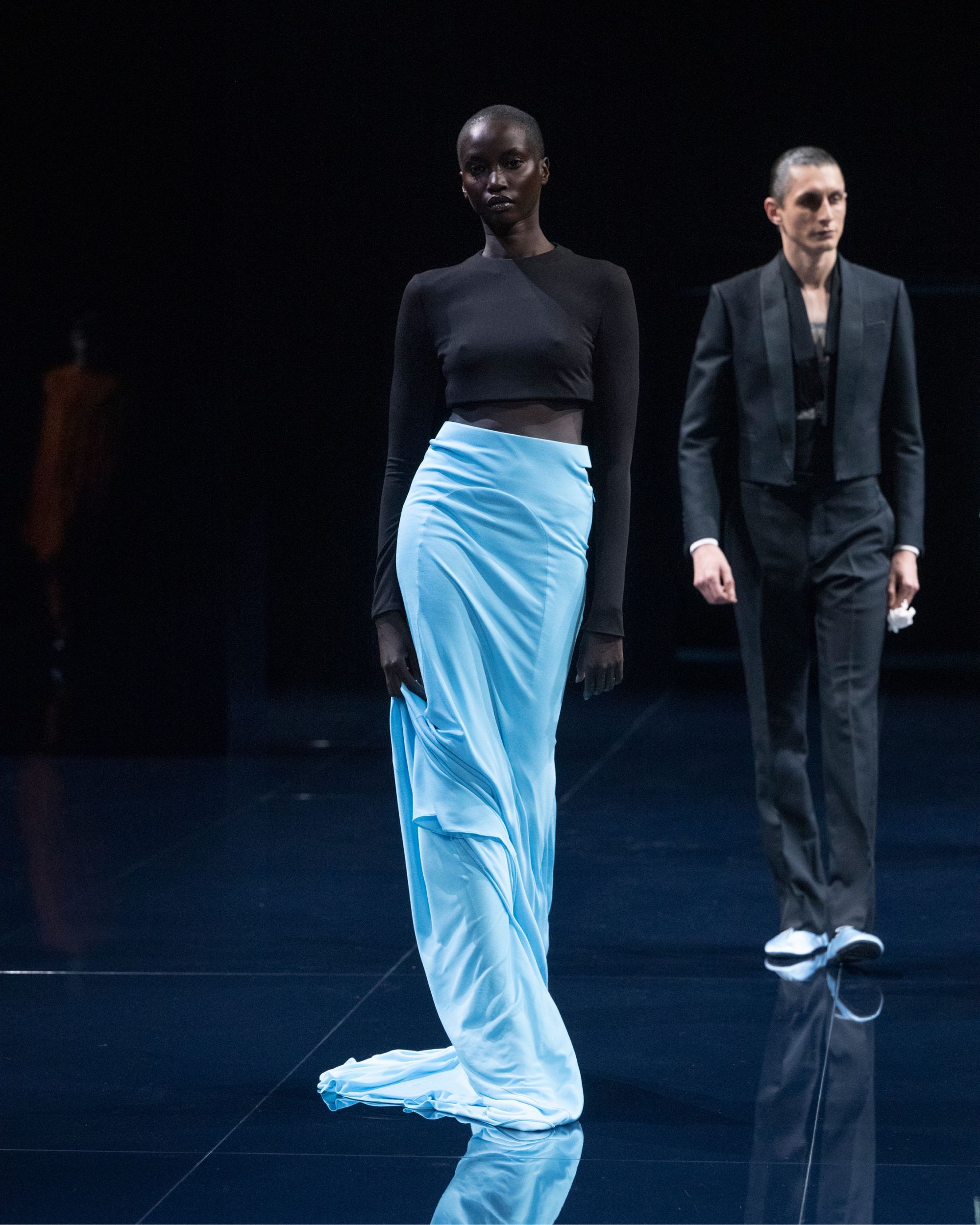 La collezione si concentra su una silhouette verticale e precisa, rigida e quasi architettonica. Una silhouette che viene regolarmente spezzata da dettagli sensuali che non mancano di catturare lo sguardo e il desiderio, come spacchi inattesi, tocchi di pizzo o accessori audaci, in particolare un reggiseno in pelle a vista o anelli di metallo che decorano i sandali. Anche la palette cromatica è votata alla desiderabilità, con le sue “colori della gioia” sotto forma di pastelli vivaci e luminosi su capi protagonisti che hanno tuttavia la semplicità di una t-shirt. Ovviamente, il grigio e il nero assoluto restano immancabili, fedeli all’identità storica della maison.