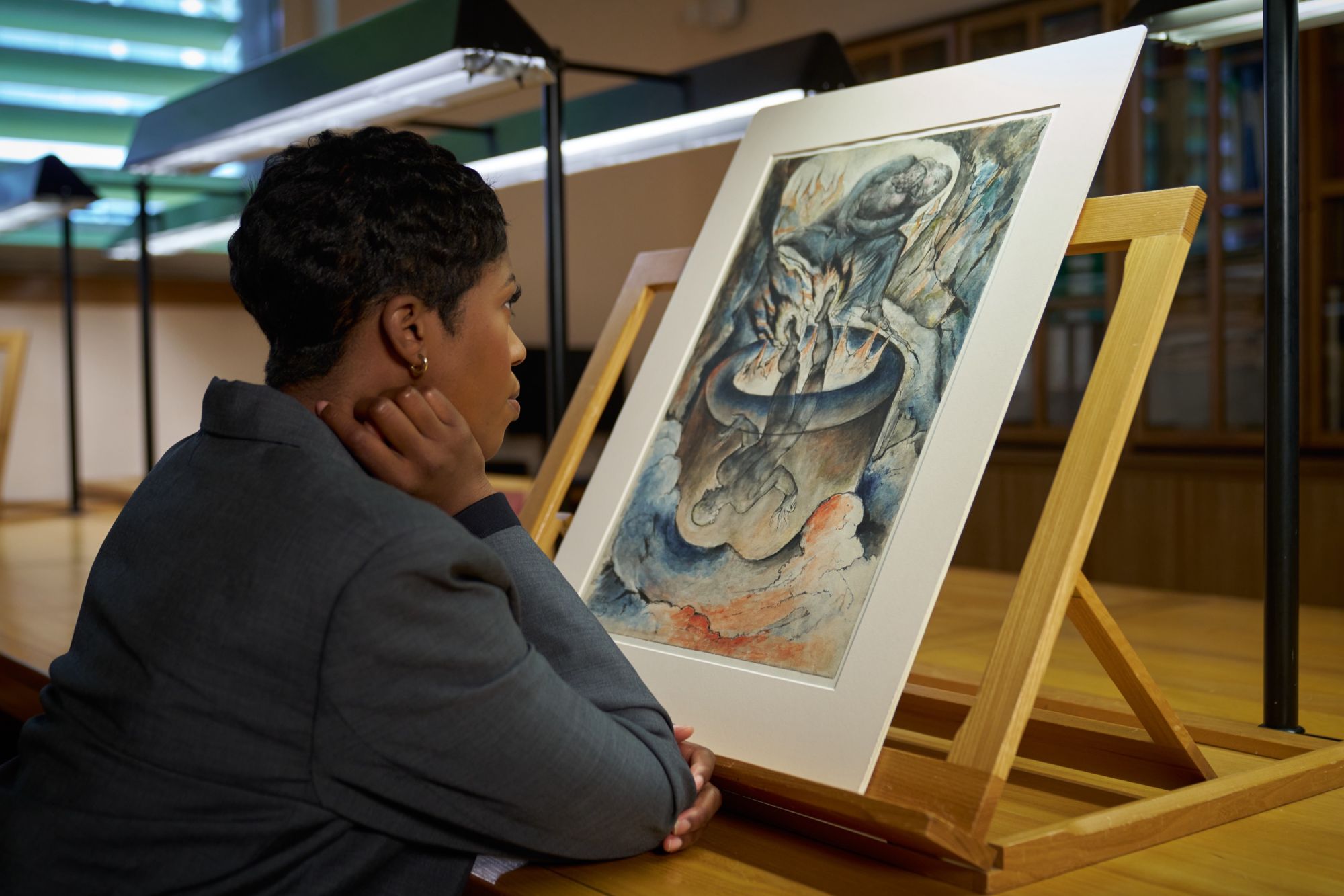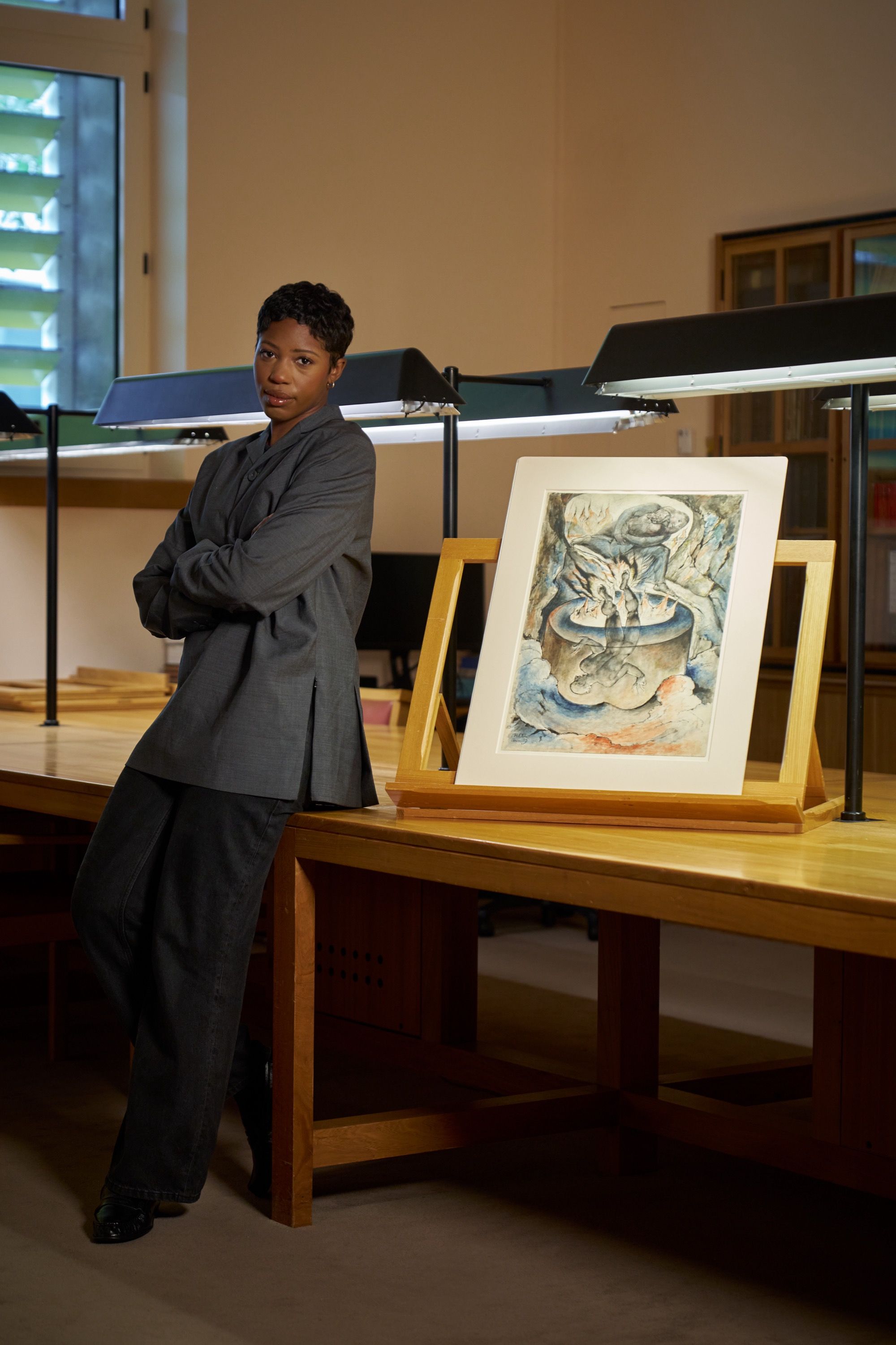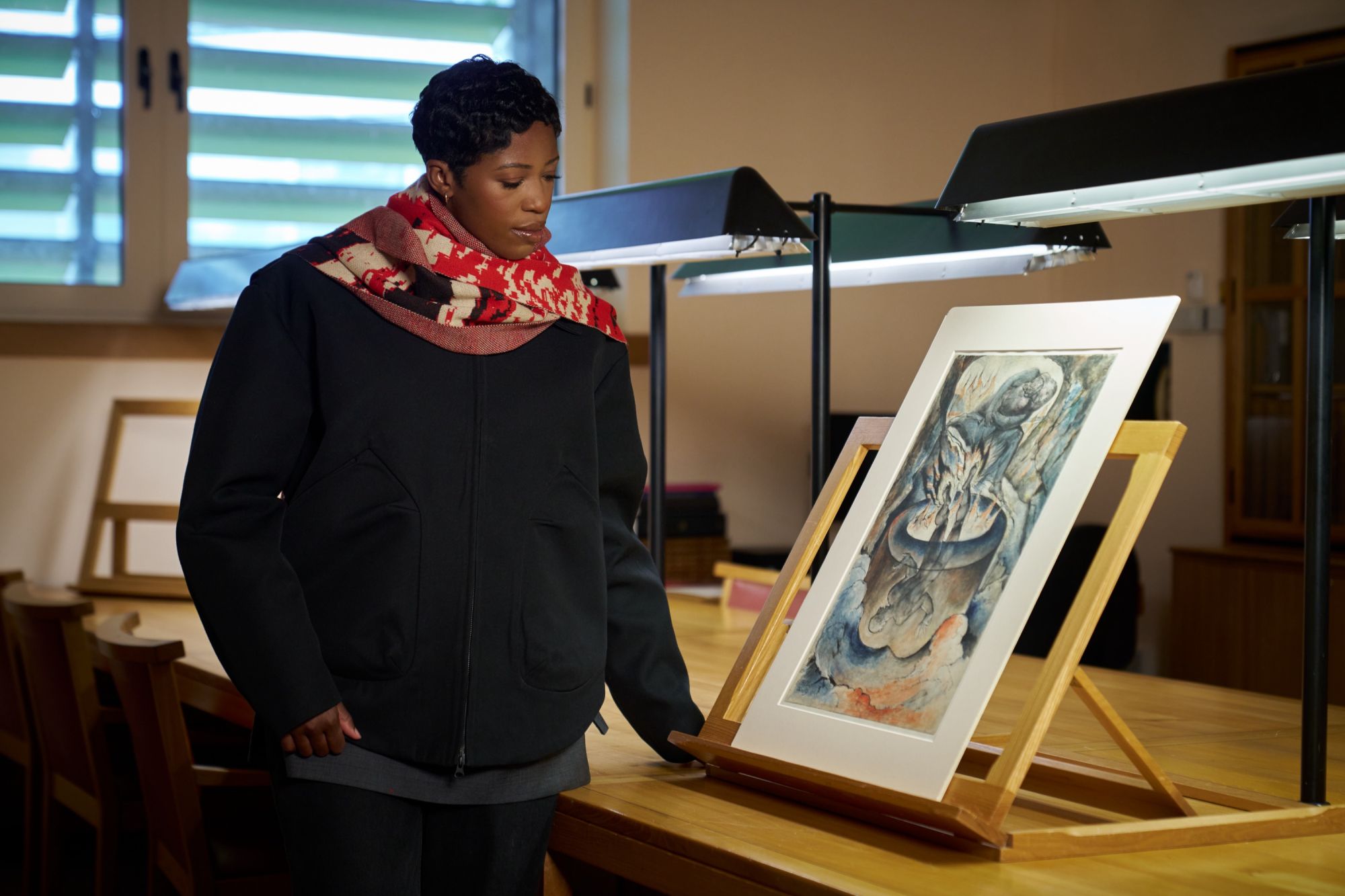 «Poiché si tratta di una capsule piccola, il progetto è stato mirato e intenzionale», ci racconta Saunders della collezione che include infatti solamente un maglione, una maglietta, una sciarpa e un cappello. Prendendo ispirazione dal lavoro di William Blake, in particolare The Good and Evil Angels e The Simoniac Pope, la stilista ha voluto concentrare tutte le sue forze in un progetto che mescolasse tanto la sensibilità pittorica dell’artista di fine ‘800 quanto la sua profondità poetica. «Ho dedicato del tempo allo studio delle sue composizioni e delle sue tavolozze di colori, poi ho cercato dei modi per tradurre tutto ciò in arte indossabile - ha continuato Saunders - Si trattava di creare capi delicati ma di grande impatto, che potessero essere collezionati, come estensioni dell'opera d'arte, ma comunque radicati nel mio mondo con silhouette fluide». Ciò che ha colpito particolarmente Saunders del lavoro di Blake è stata la dualità narrativa del pittore, che nei suoi lavori ha sempre incluso giochi di luci e ombre per raccontare come il bene e male, lo spirituale e l'umano non possono fare a meno l'uno dell'altro. «Volevo catturare parte di quell'intensità emotiva nei capi di abbigliamento - ha aggiunto la designer - Tradurre le sue immagini su tessuto è diventato un modo per dare vita a quei contrasti attraverso il movimento e la texture, celebrando al contempo la sua visione profondamente britannica, ma senza tempo».