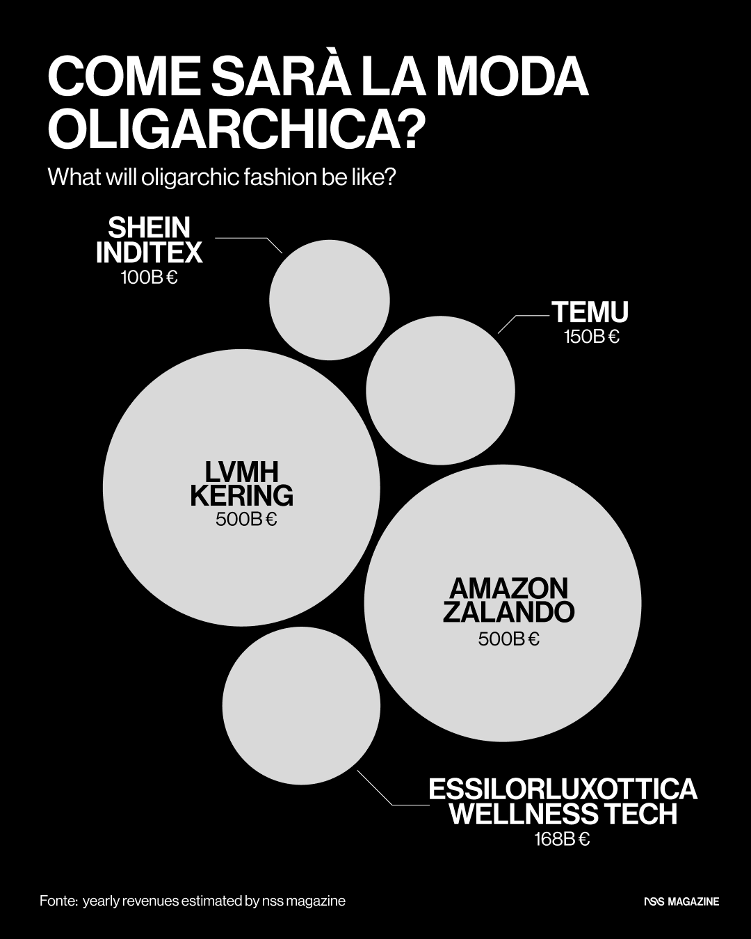 In questo scenario, Temu e i suoi 292 milioni di utenti attivi mensili globali rimarrebbe un blocco unico, mentre, EssilorLuxottica con il wellness tech potrebbe formare un hub visivo da 168 miliardi di dollari, controllando il 20% del mercato eyewear e crescendo esaponenzialmente nel mercato del wearable tech, integrando AI come nei Ray-Ban Meta (che hanno già 1 milione di unità vendute nel 2024) per l’unione definitiva tra industrie della moda e della salute. Le potenzialità di monitoraggio fitness personalizzato sarebbero rivoluzionarie, ma rischi di oligopolio su dati sanitari in mano alle AI sarebbero un incubo regolatorio e burocratico, oltre che etico. In questo scenario, l'idea di un oligopolio promette scala per innovazione, ma ci presenta la visione distopica di un lusso omogeneo, che tradirebbe le premesse stesse del concetto di lusso.