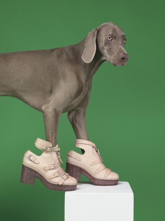 The Scandinavian ultramodern brand Acne, chooses the American photographer and painter William Wegman to showcase some pieces from the brand’s summer collection 2013 in a very original and astonishing way. The artist’s distinguishing feature has been for years and years to portray his beloved Weimaraner dogs, that now, taking the place of human models, wear shoes, bags and jackets. They all lay on a pedestal with neutral and inscrutable facial expressions that give infinite space to the viewer’s imagination. The outcome has particularly pleased Jonny Johansson, creative director of Acne, who shows one more time, his ultra contemporary and edgy artistic vision.