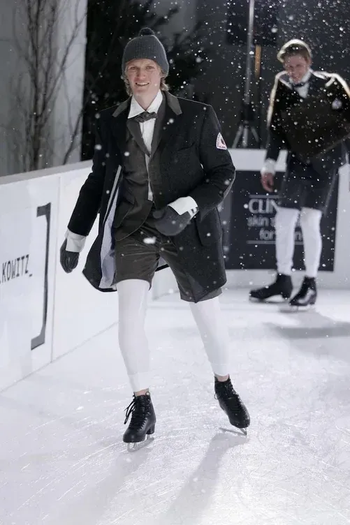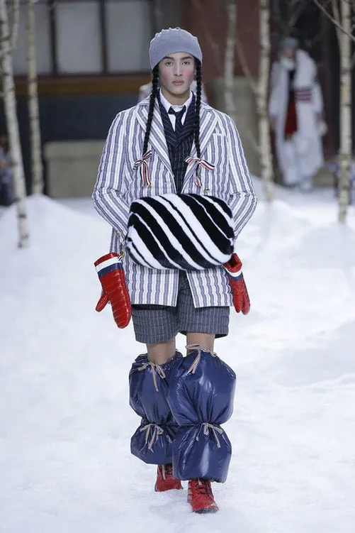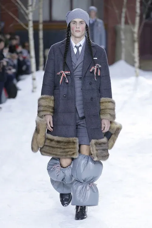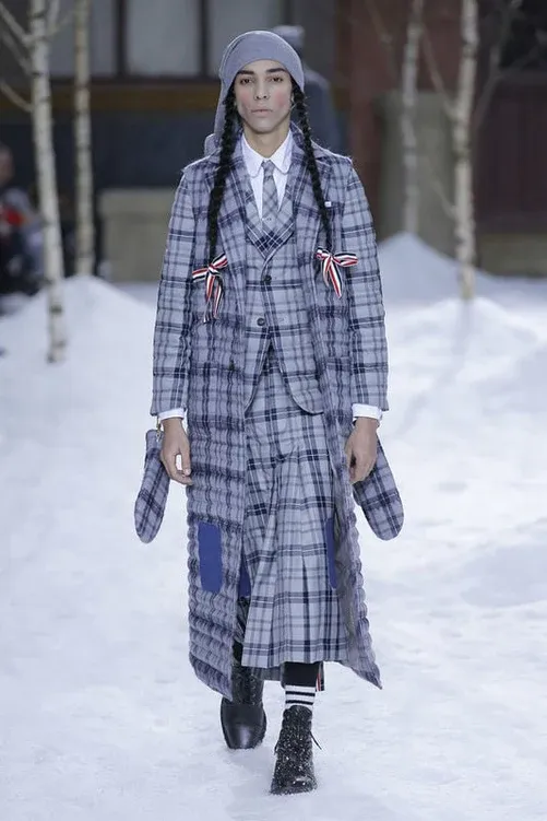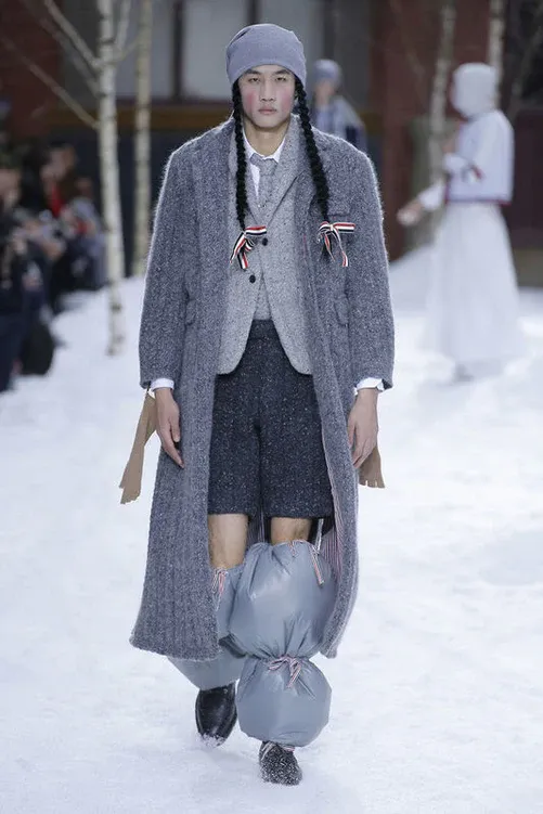 A Thom Browne la neve piace. Non a caso il designer americano, nel corso della sua carriera, ha deciso ben quattro volte di sfilare in paesaggi prettamente candidi e invernali (ma stranamente si tratta quasi sempre di menswear). La prima volta fu con la FW06, dove il concept dello show era far pattinare i modelli su una piccola pista di ghiaccio nel bel mezzo di Manhattan. Poi, dopo quasi dieci anni, Browne è tornato a fare dell’inverno una sua musa con la FW18, dove, tra guancie rosse e lunghe trecce alla Pippi Calzelunghe, il designer ha portato 33 look tutti ispirati alla vita di montagna nei mesi più freddi, tra giochi di volumi e tessuti.