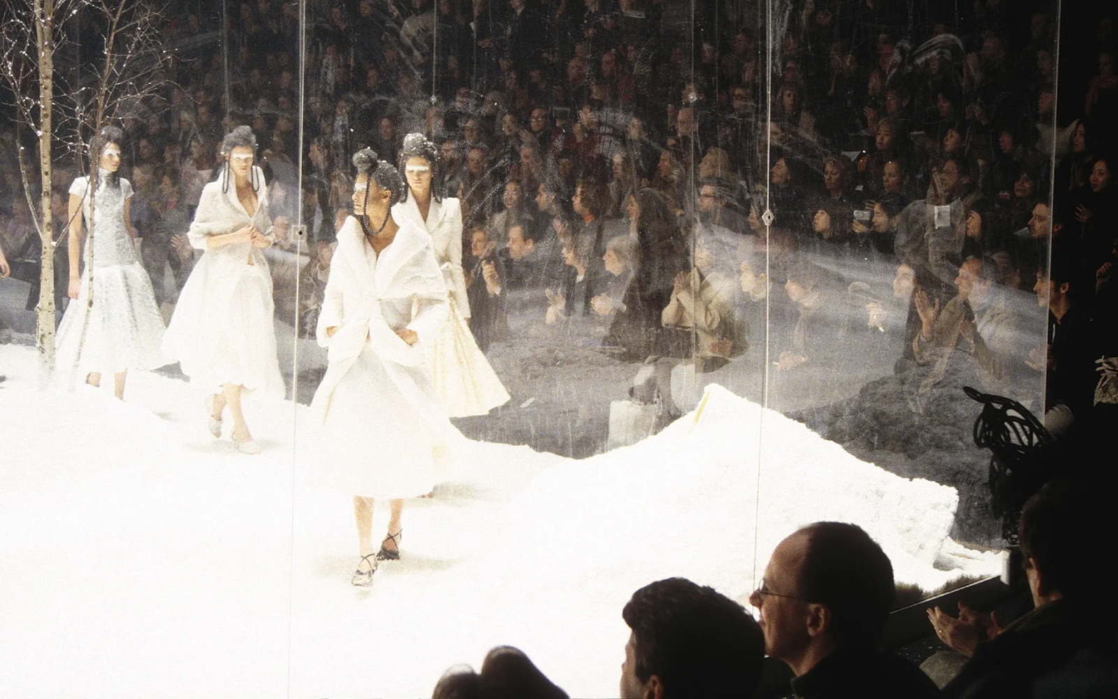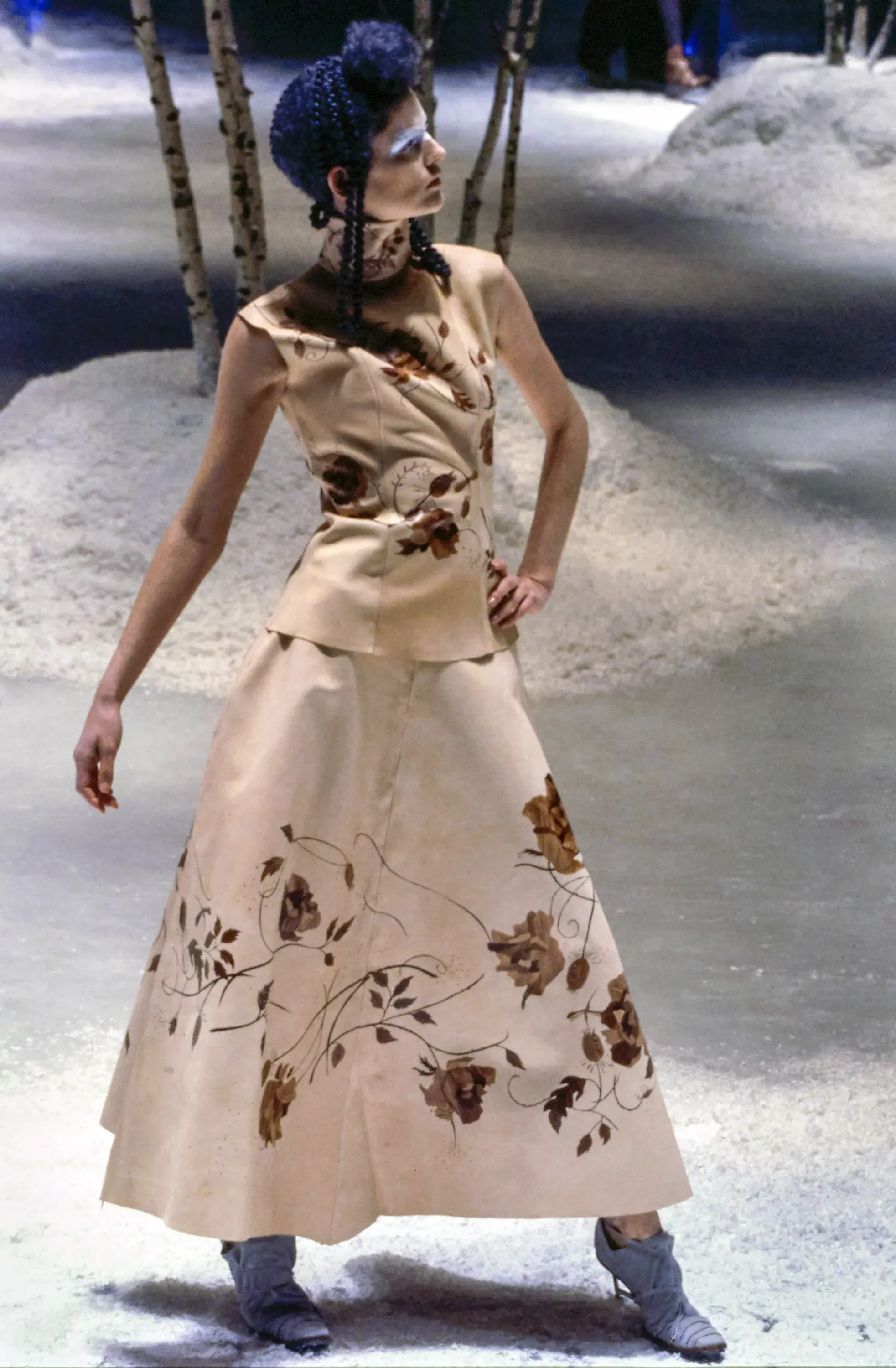 Una palla di neve da scuotere per stupire i bambini con la miniatura di un paesaggio alpino: sembrerebbe la suggestione più ovvia dietro all’Overlook Show dell'autunno 1999 di Alexander McQueen. Invece, come d'abitudine, la fonte d’ispirazione per la collezione presentata dentro una teca di vetro il 23 febbraio 1999 al Gatliff Road Warehouse di Londra, era ben più macabra: il film horror The Shining di Stanley Kubrick, ambientato nell'hotel Overlook che dona il nome allo show. Una fantasia invernale tra pattinatori sul ghiaccio, splendidi maglioni fatti a mano, caldi shearling e intricati patchwork in una foresta di betulle, look prevalentemente dai toni scuri in contrasto con il candore del paesaggio. Tra le modelle, truccate tramite una sorta di mascherina iridescente a celare lo sguardo, Frankie Rayder e Kate Moss, quest’ultima avvolta in un corsetto di stagno che dall’altra parte della teca di vetro, ricordava quasi una camicia di forza.
