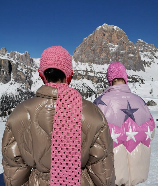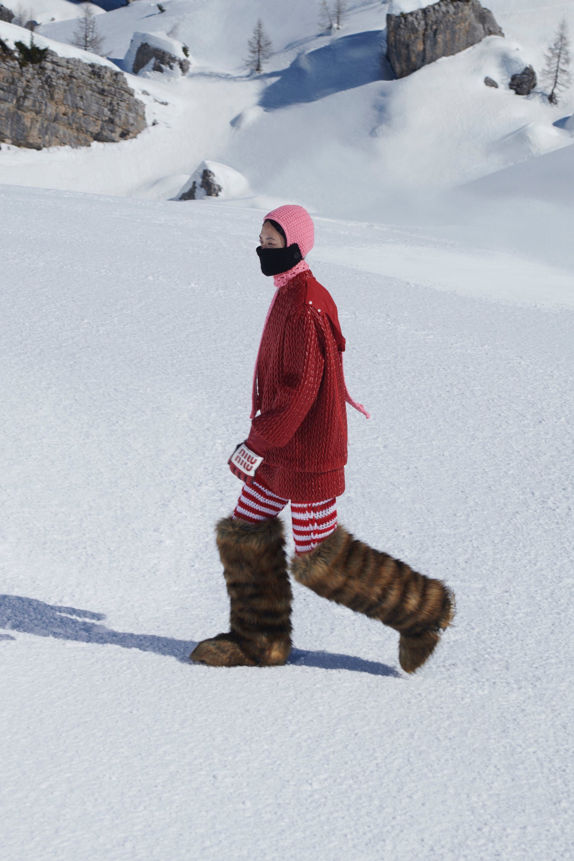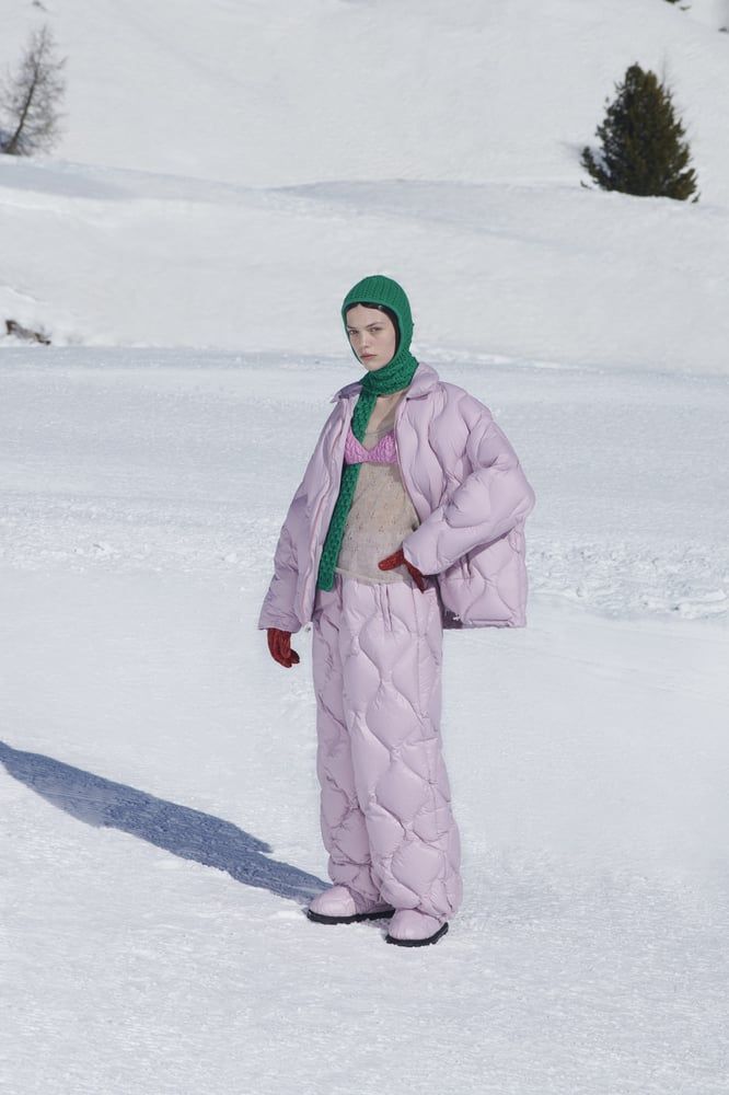 Cortina D’Ampezzo, un paesaggio epico ad alta quota sulle Dolomiti, è stato il quadro perfetto per celebrare una grande passione della signora Prada: la neve. Una collezione ispirata allo shift, portato all’estremo, tra abbigliamento indoor e outdoor, tra confinamento e liberazione, traendo ispirazione dalle contraddizioni della Pandemia: parka oversize e balaclava in lana, abiti corti e top a vista abbinati a yeti boots. In senso figurato, era una metafora dello stato post-lockdown: uno sfogo materiale del nostro stato mentale, il desiderio di liberazione (e di svestizione nonostante le temperature) tramite una sorta di lingerie alpina ("Per me, roba molto sexy", ha commentato Miuccia Prada).