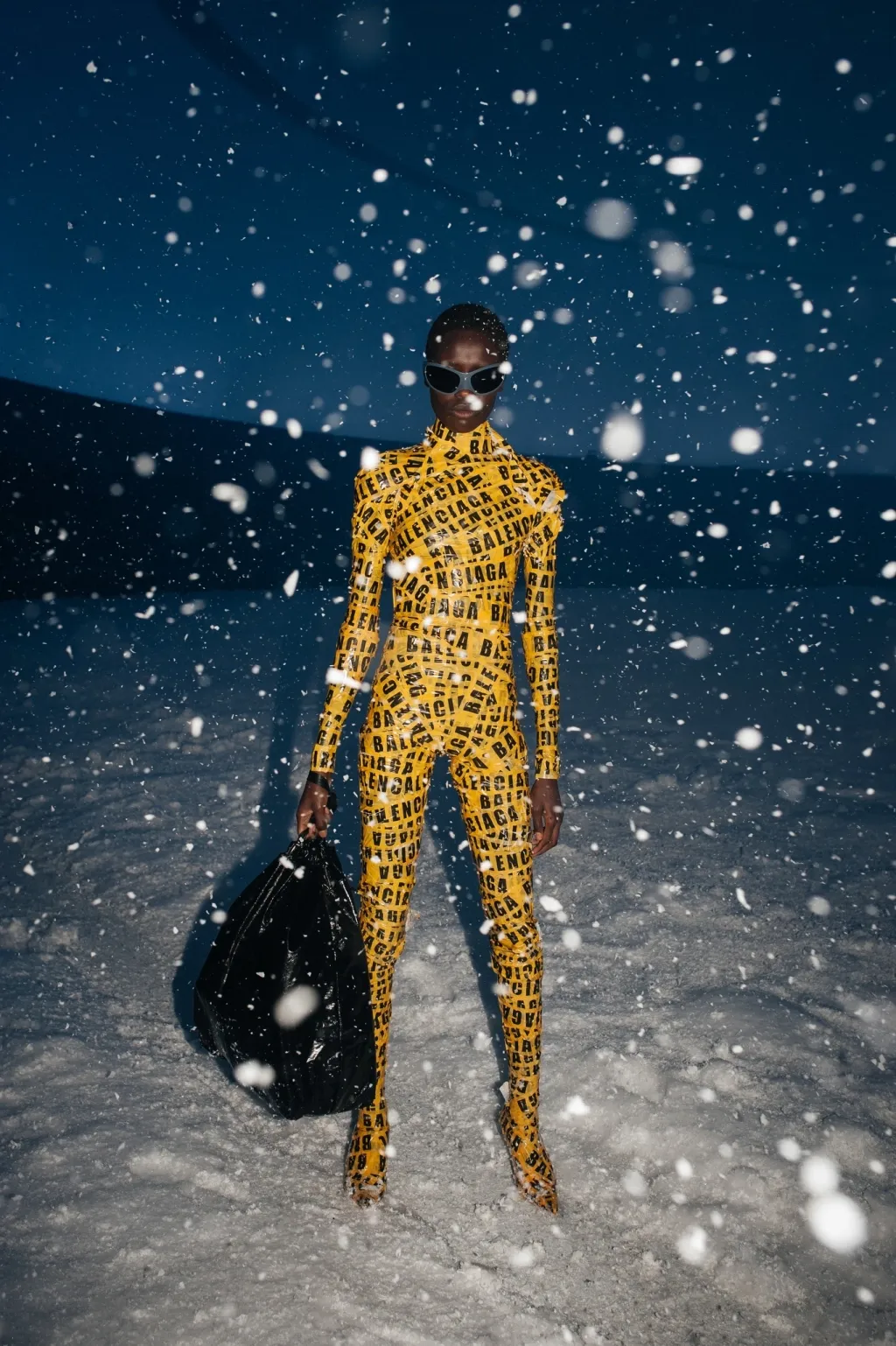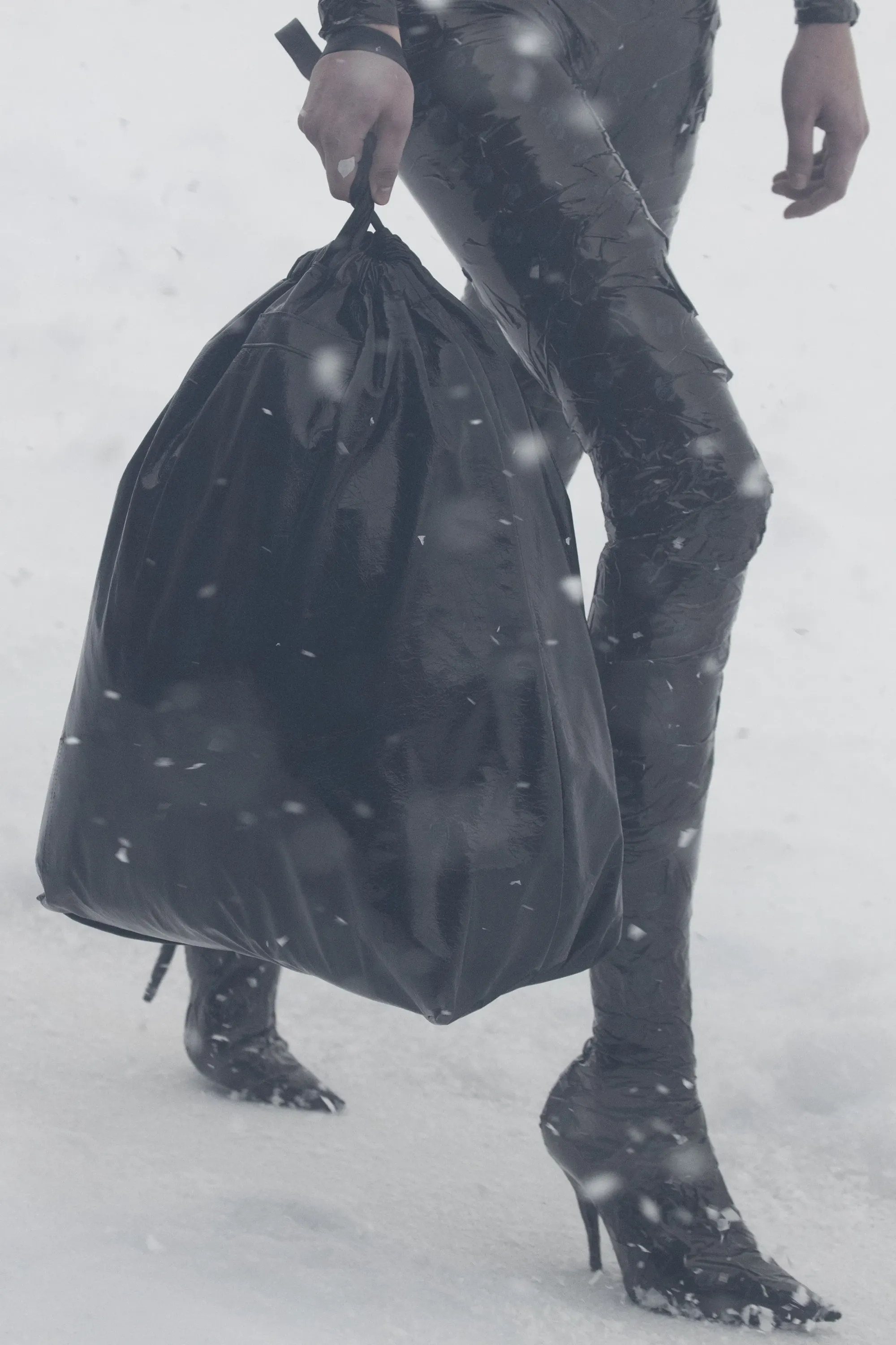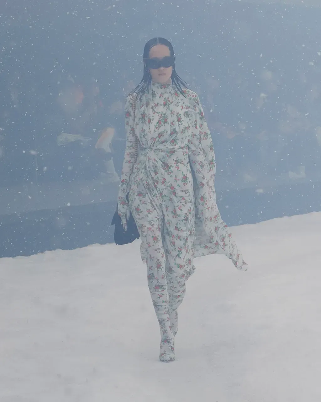 Una tormenta di neve in una teca di vetro e i modelli flebili fuscelli al vento vestiti d’alta moda, lo show di Balenciaga per la collezione FW22 andato in scena a Parigi ha avuto un doppio tema: la visione distopica di un mondo in cui l'inverno non esiste più e la neve appare come qualcosa di esotico, e il sostegno alla causa ucraina tramite la rappresentazione dell'attualissimo tema dei profughi di guerra. Un messaggio suggestivo a cui si accompagna un altissimo grado di ricerca, sia nel design dei modelli - dalla Trash Bag fatte di cuoio all’asciugamano di cachemire, passando per il total look in simil scotch loggato - sia nella tecnica, tra tessuti pre-stropicciati e le costruzioni “pieghevoli” di trench e completi a doppio petto, borse create a partire da stivali rifunzionalizzati, una sneaker HD composta da un singolo pezzo flessibile e, soprattutto, il nuovo materiale bio-based prodotto a partire dal micelio.