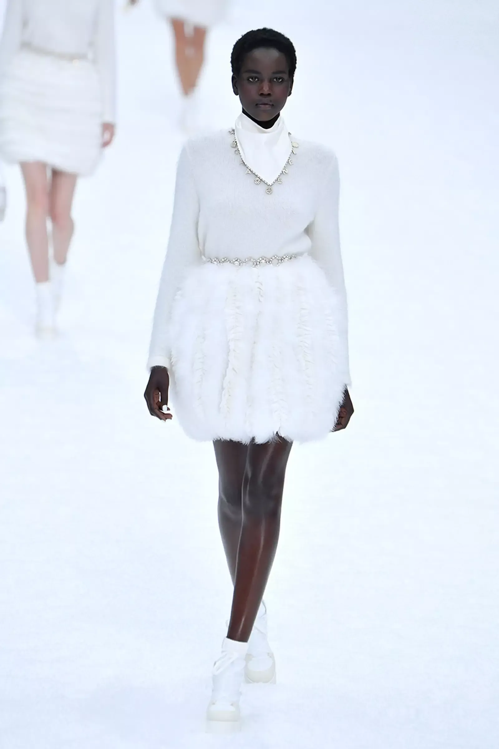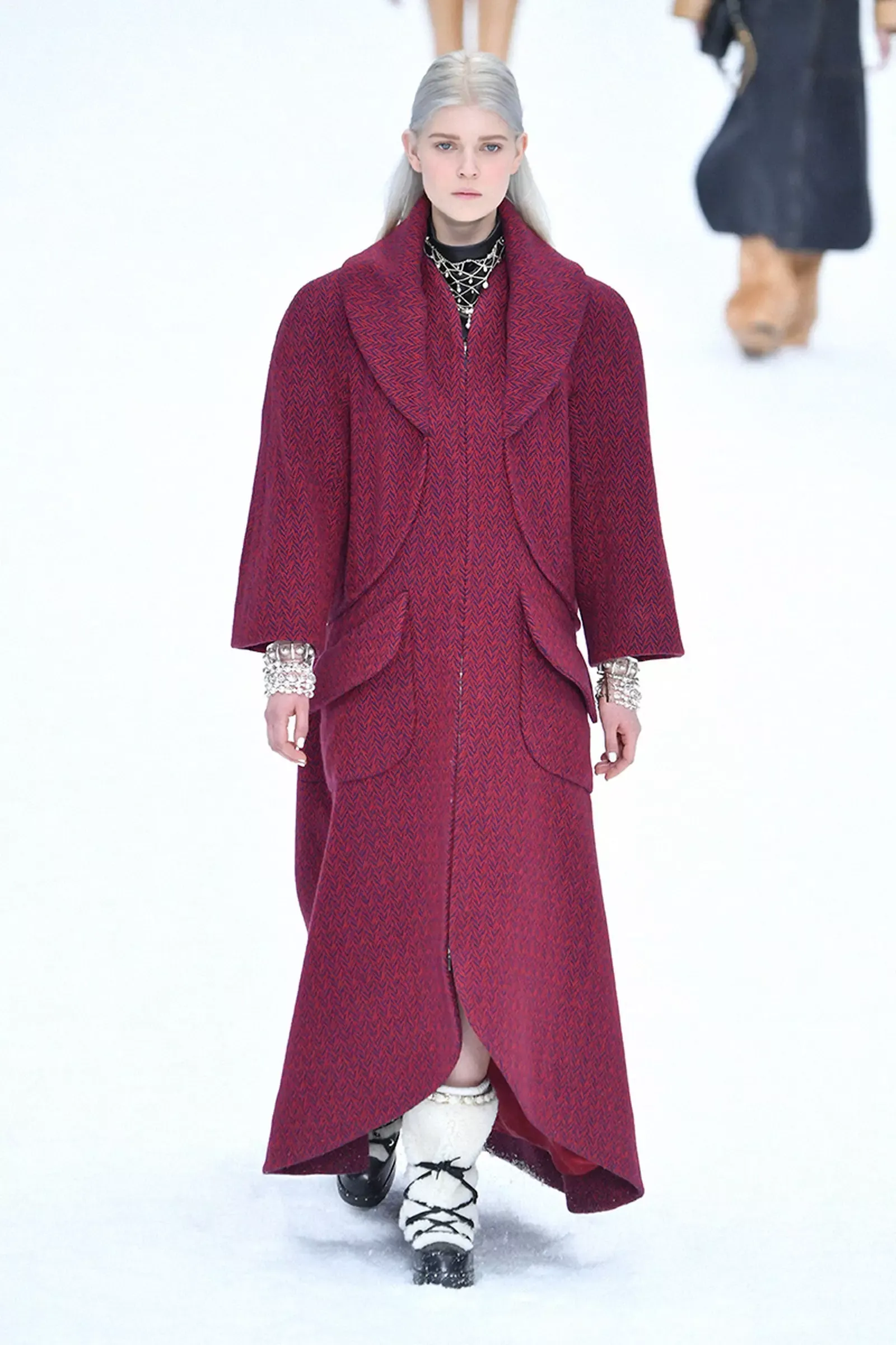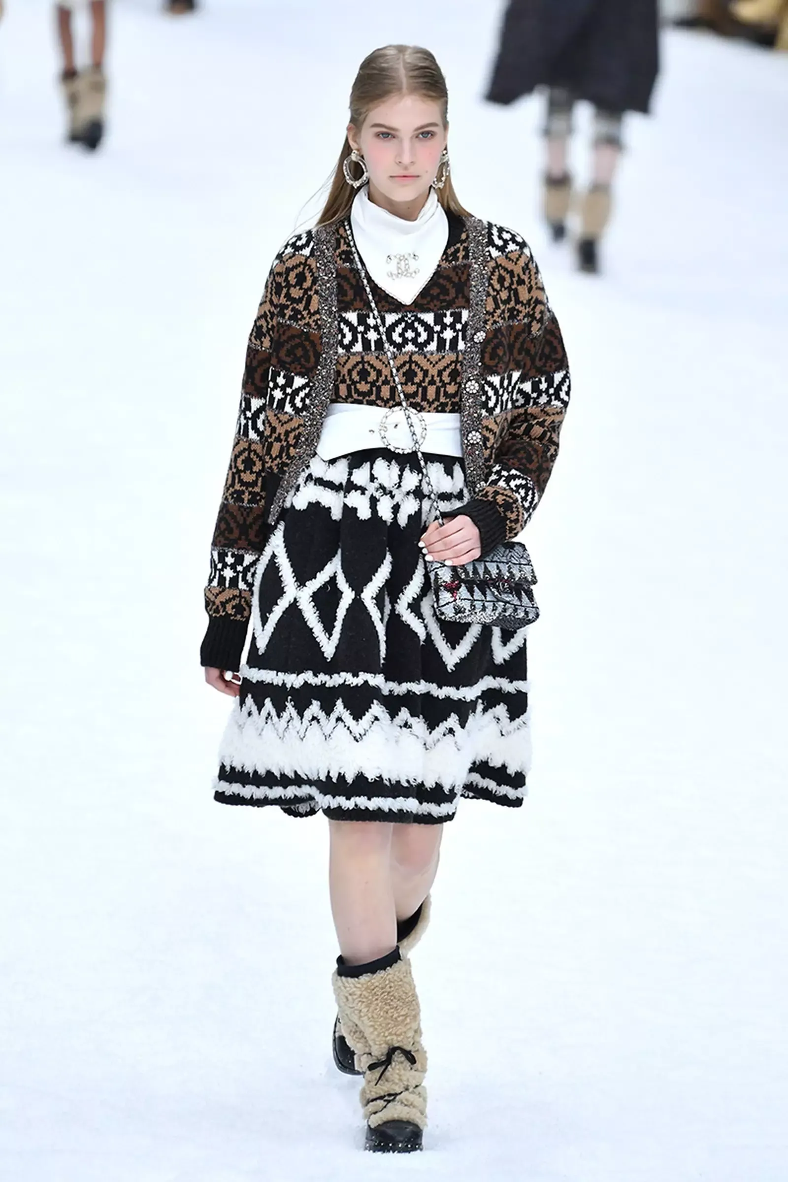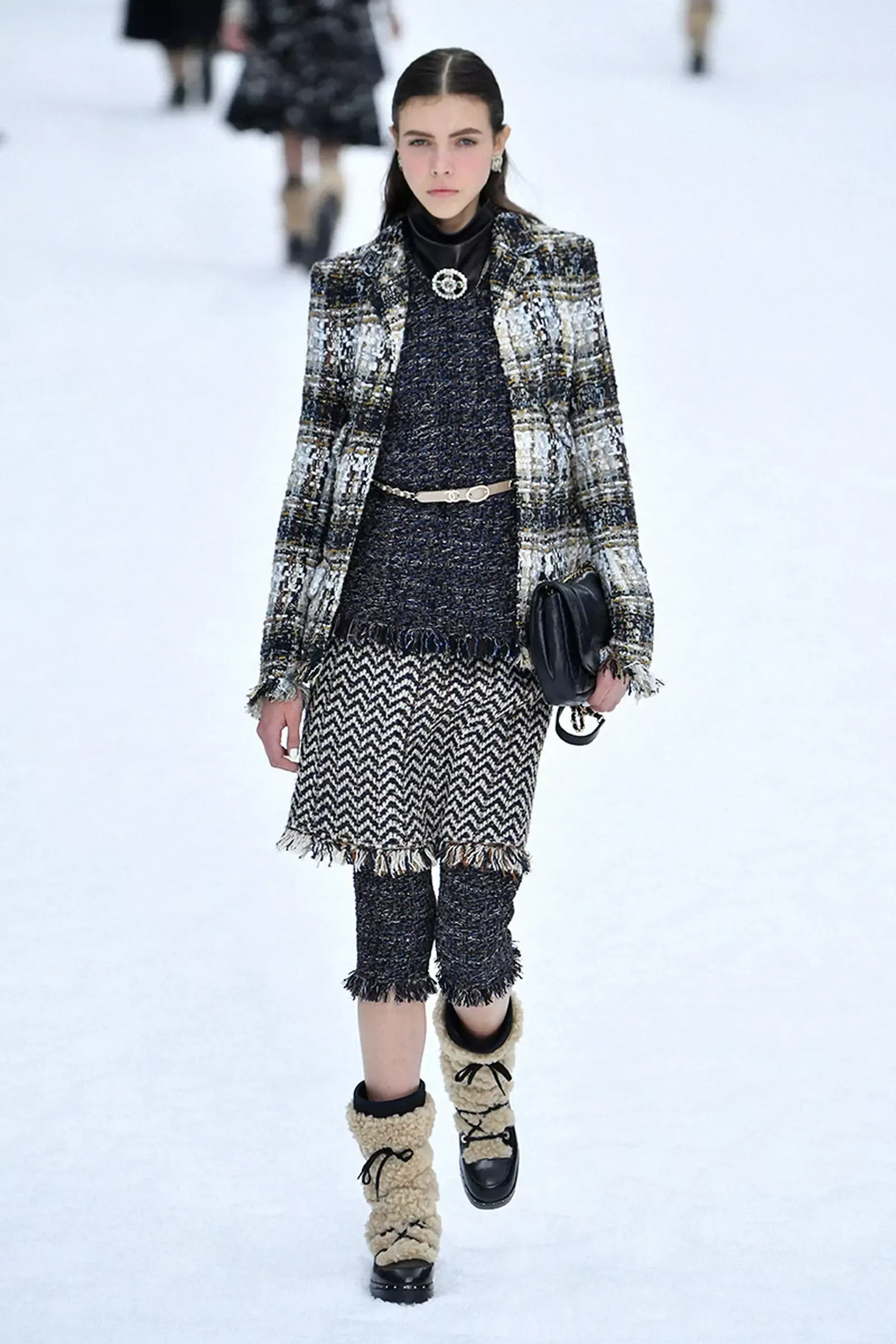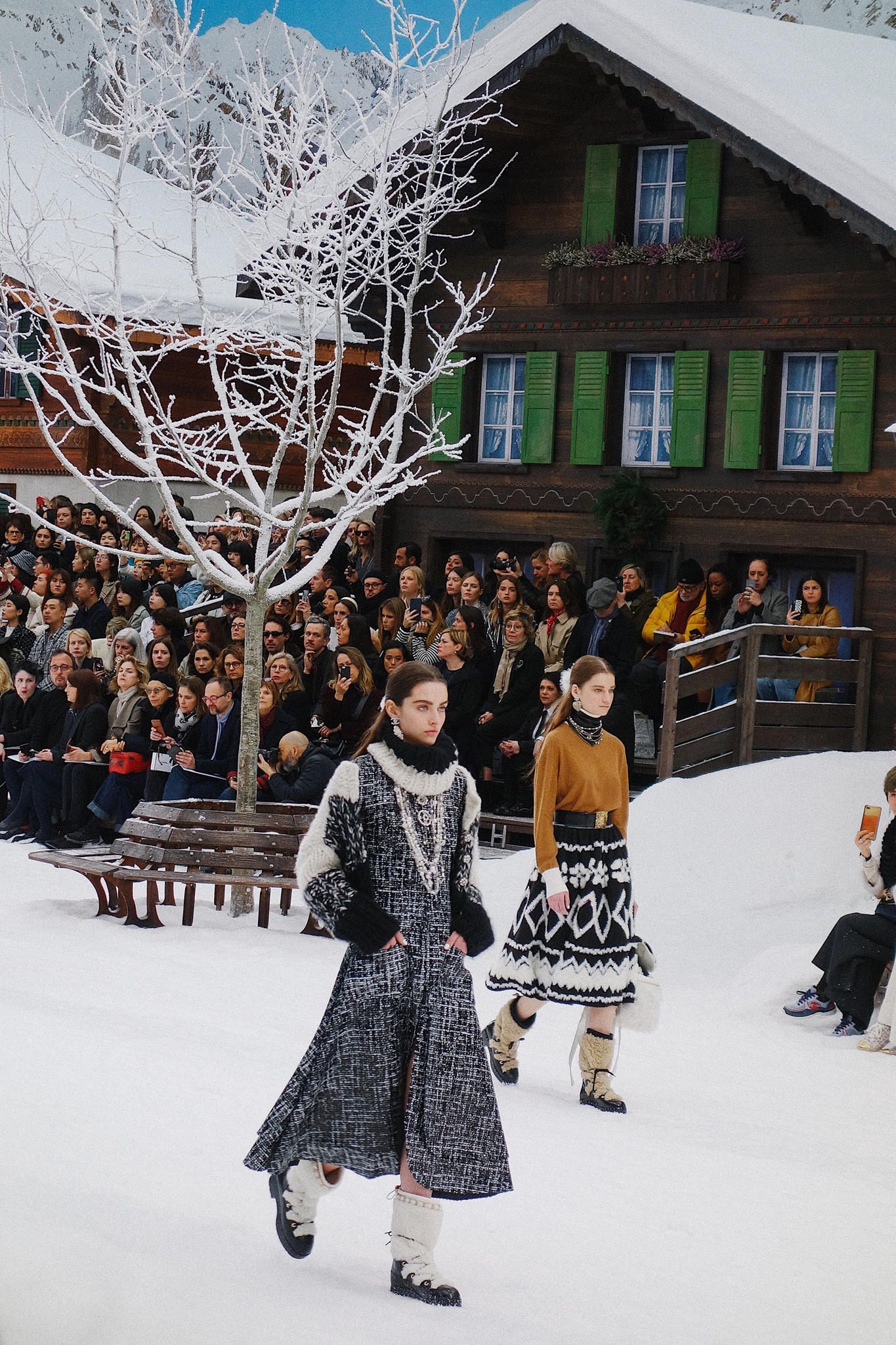 L'addio all'immenso talento di Karl Lagerfeld è stato incorniciato da un paradiso innevato, tra modelle ammassate l’una sull’altra sui gradini di una finta osteria alpina, la Chanel Gardenia, in un omaggio sereno, sobrio come era stato Lagerfeld nel corso della sua vita. C'è stato un minuto di silenzio, poi la voce fuori campo dello stilista ad accompagnare l’ultima collezione realizzata in collaborazione con il braccio destro di lunga data (e attuale direttore creativo della maison) Virginie Viard: ha parlato in francese, fino ad un’ultima frase in inglese, un commento sul piacere che gli suscitava vedere la sorpresa nel pubblico durante uno show: "Oh! È come camminare in un quadro!". A sfilare tra completi in tweed, cappotti sartoriali e cappelli a falda larga, le muse dello stilista, da Cara Delevingne a Penelope Cruz.