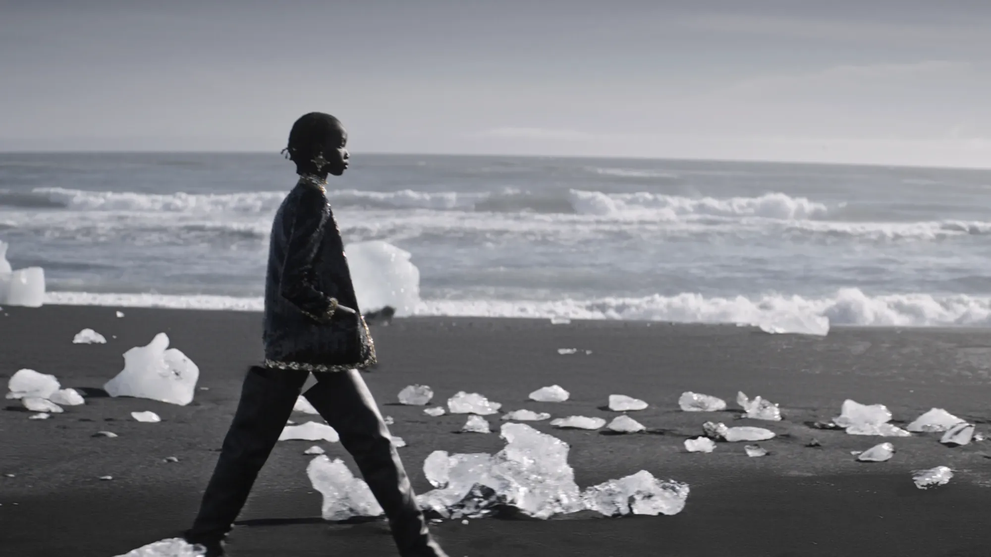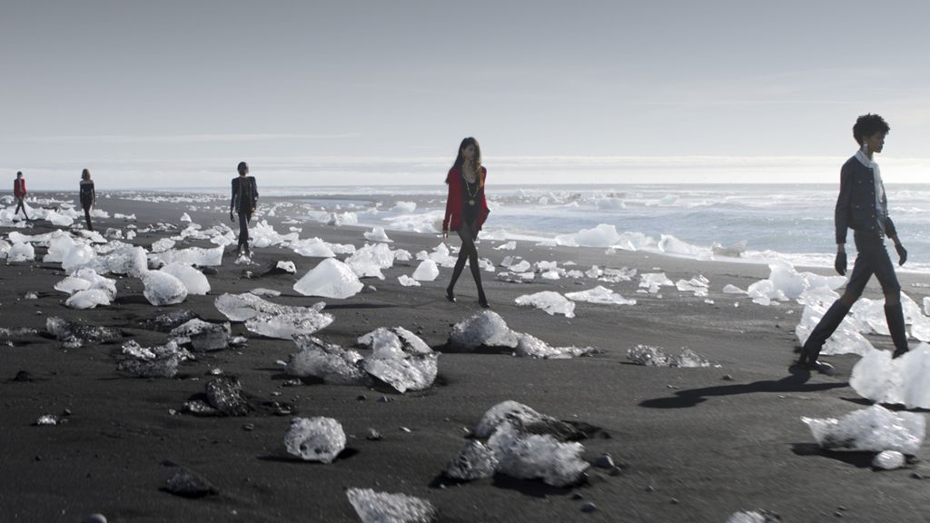 Una cascata gigante, ghiacciai, pareti a strapiombo, onde che si infrangono e una spiaggia nera che brilla quanto l'ardesia: il paesaggio invernale secondo Anthony Vaccarello è estremo, alieno, quasi inospitale, sicuramente in contrasto con le eteree fanciulle che sfilano acconciate e ingioiellate tra capi in glitter e colori sgargianti. Si intitola "Where the Silver Wild Blows", la collezione d'ispirazione anni '60 che incorpora vari pezzi metallici con silhouette più nitide in tonalità vibranti, unendo stili tipicamente francesi con elementi glam rock.