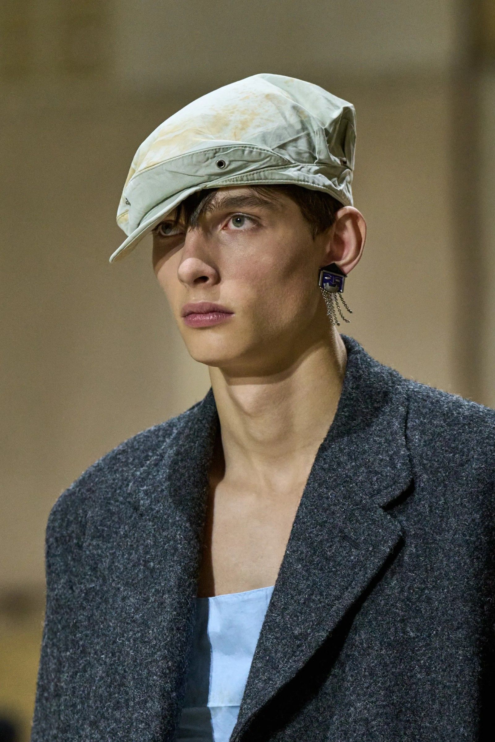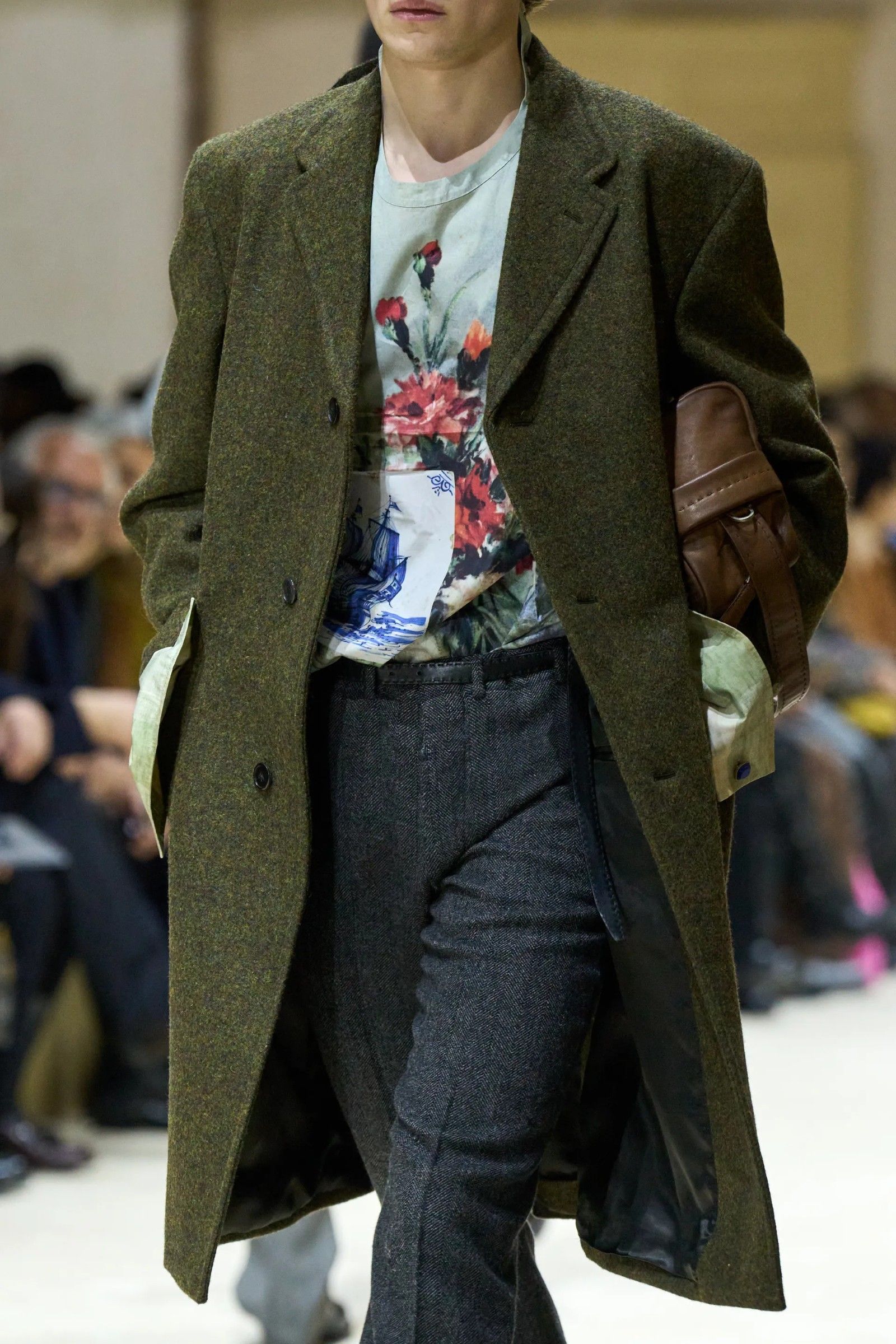 Per Miuccia Prada e Raf Simons invece il vestire è una dichiarazione intellettuale, un gesto culturale che, nella sua cerebralità, tramuta gli abiti a cui siamo abituati in forme nuove e strane. E dunque, per domandarsi «Cosa siamo in grado di creare partendo da quanto già conosciamo?» i due direttori creativi trasformano gli impermeabili in mozzette clericali, allungano drammaticamente i polsini di camicie macchiate di umido o muffa, cappotti e cappelli sono spiegazzati e schiacciati, erodono i cappotti di pelle con finte usure, simulano gli orli divorati dalle tarme applicando sui capispalla inserti di tessuti diversi a rappresentare un tessuto sottostate rivelato dalla rottura del soprastante.
