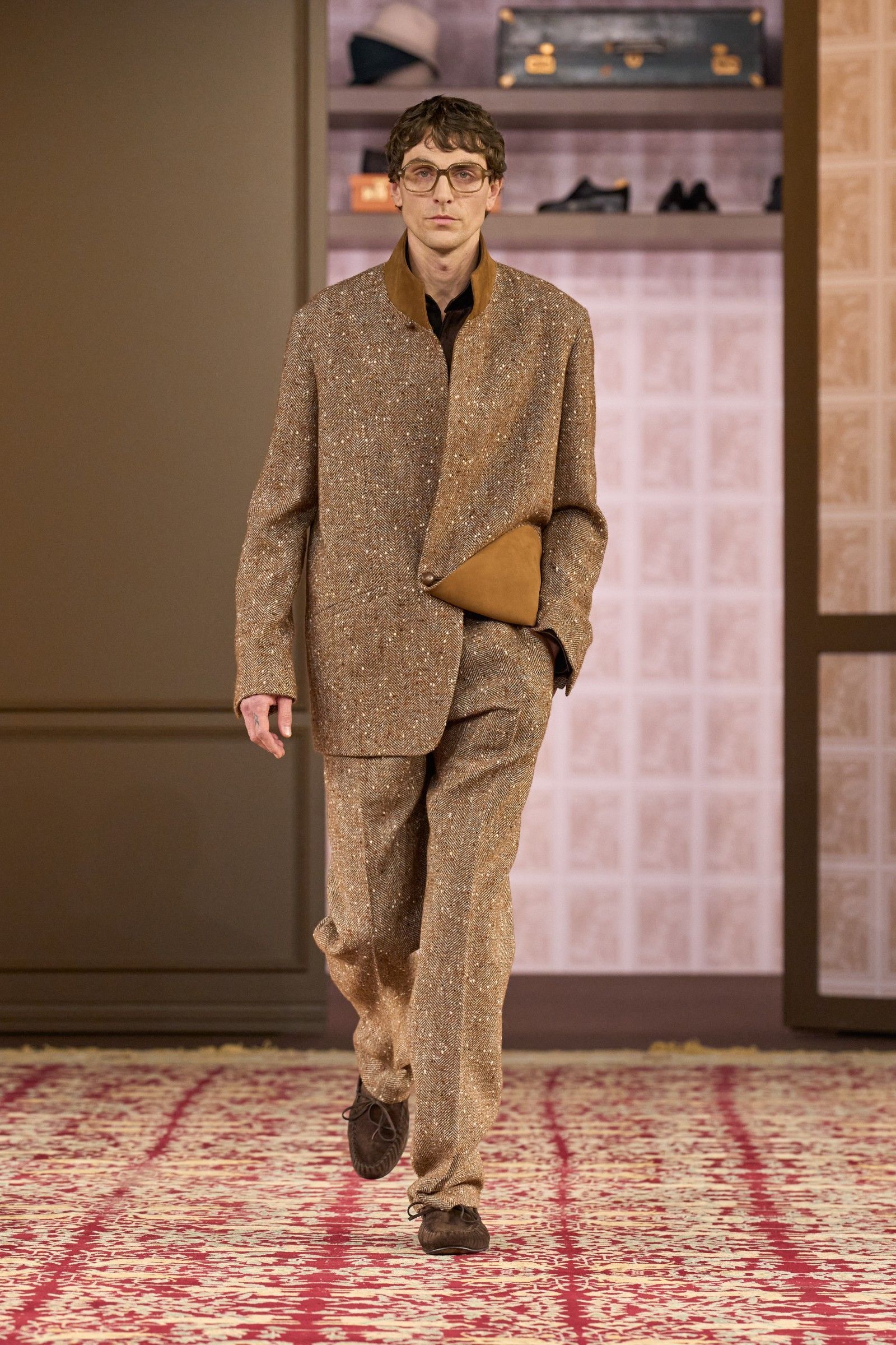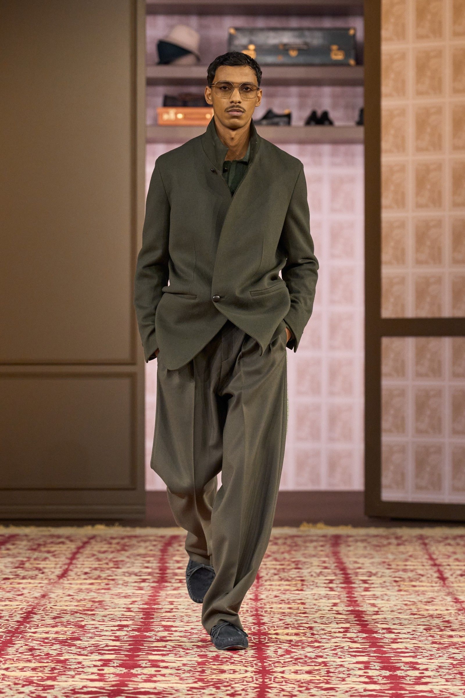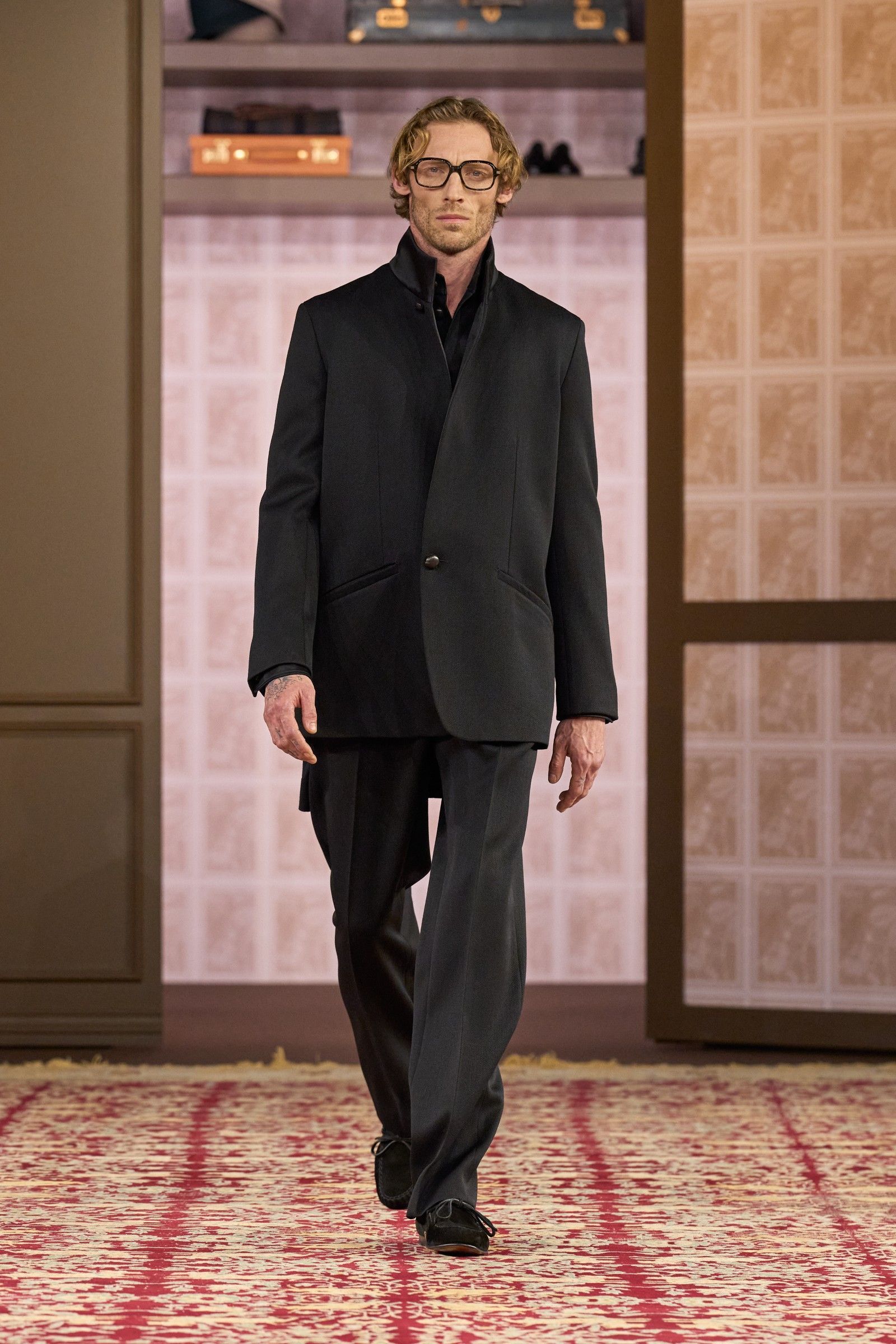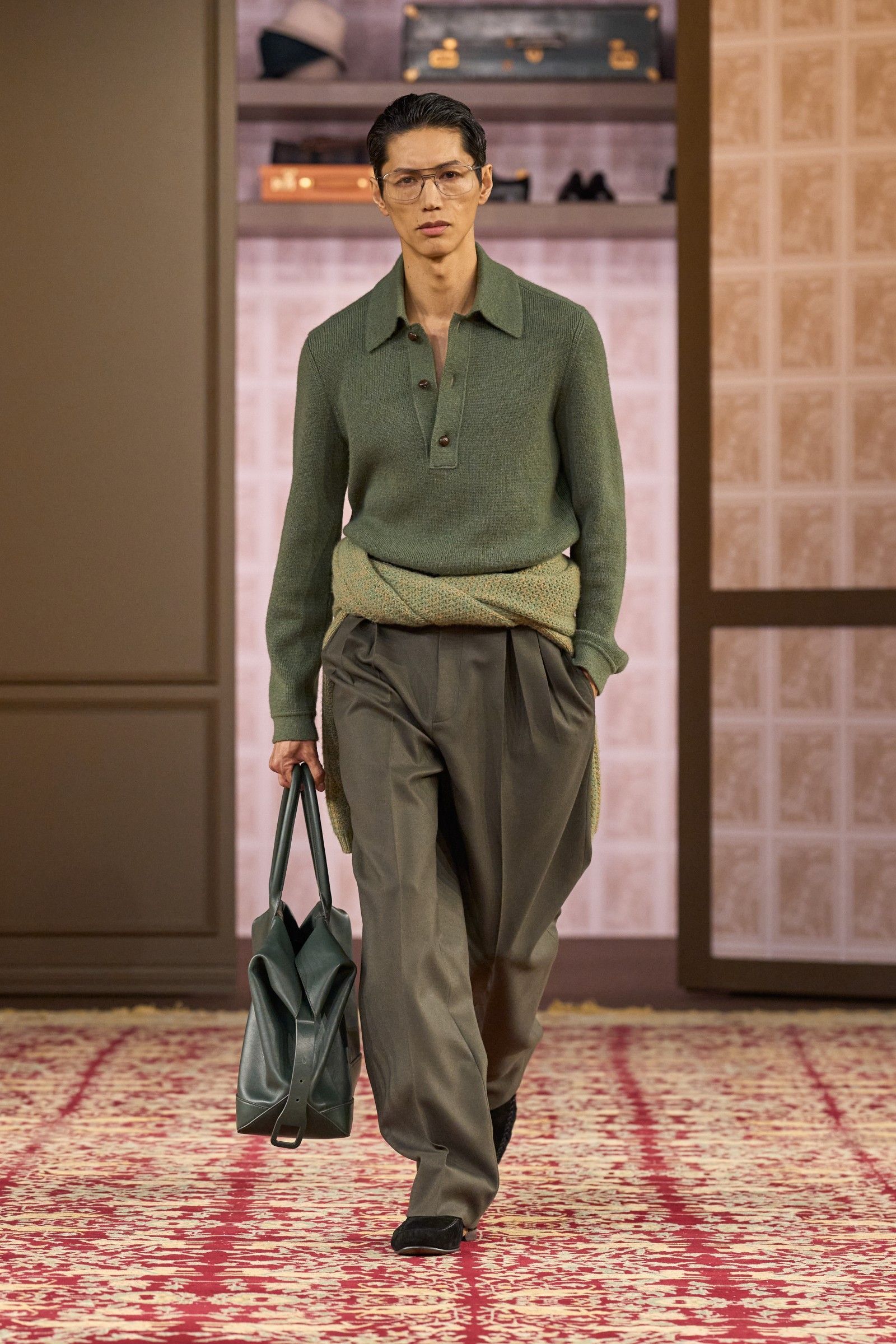 - Alessandro Sartori ha immaginato l’armadio delle generazioni Zegna come fonte di abiti che “sono venuti da lontano per andare lontano”, ha valorizzato materiali pregiati, sartoria eccellente e innovazione pratica, come la giacca con tre bottoni rotanti che ha brevettato poco prima della sfilata.
