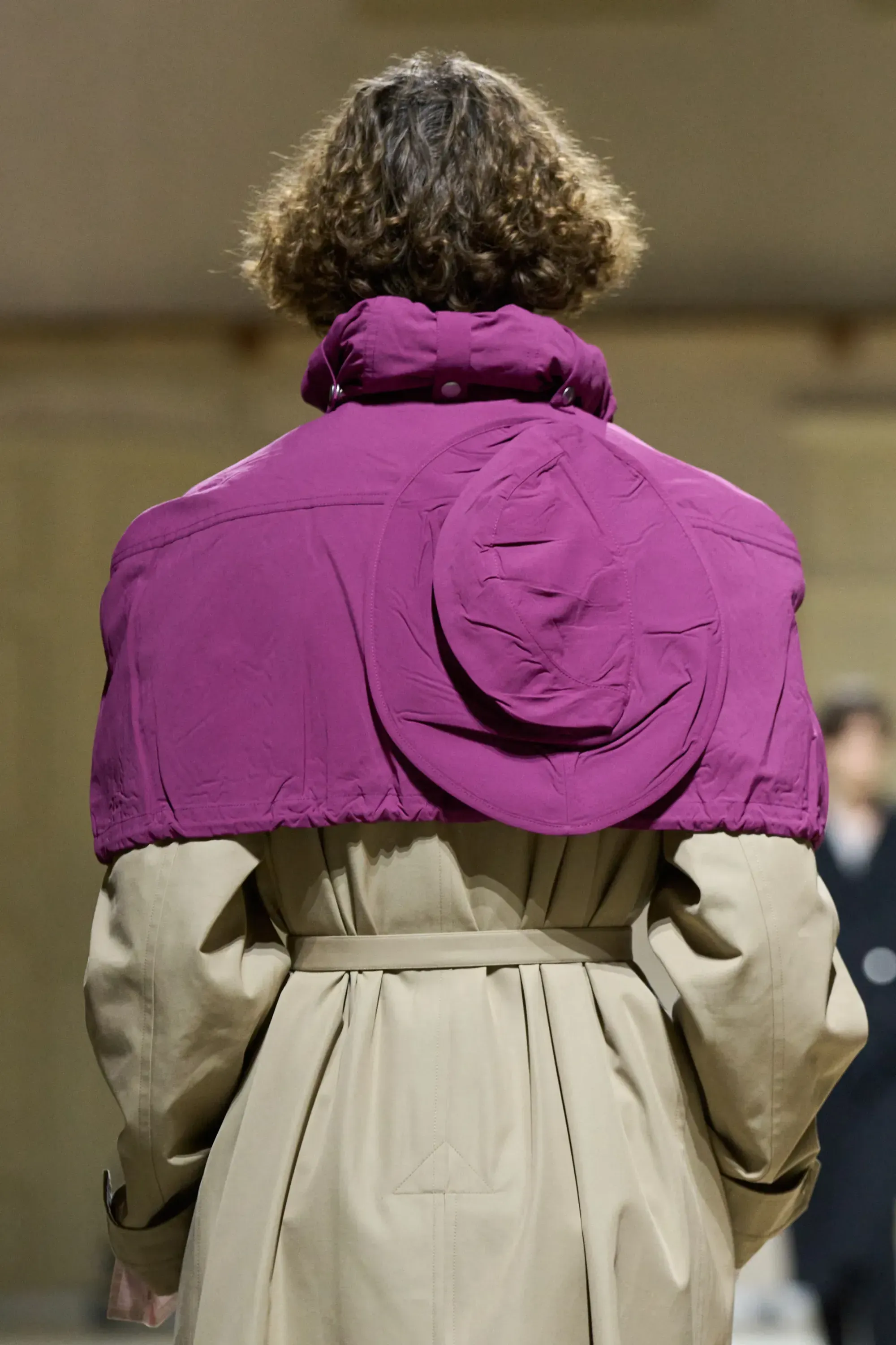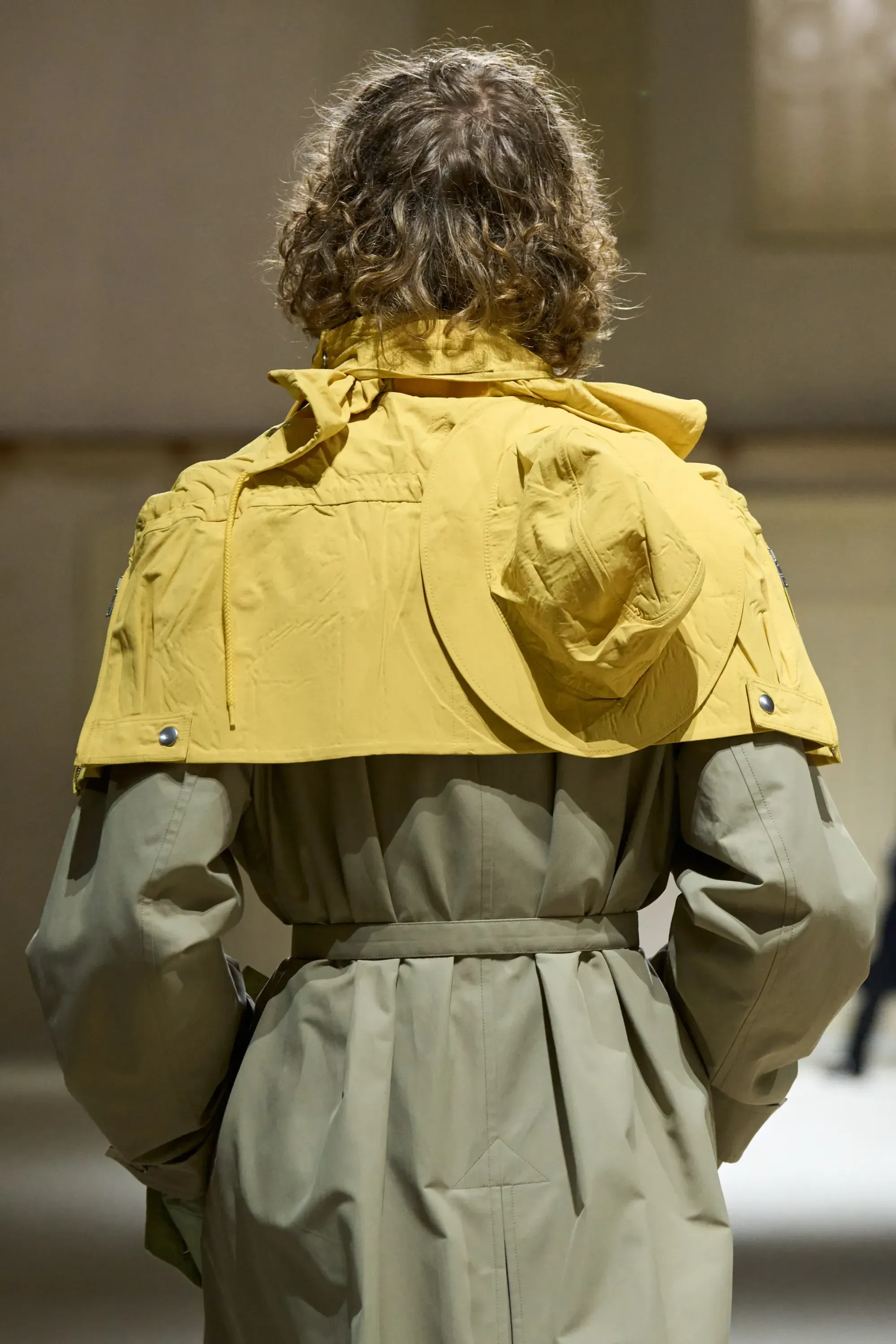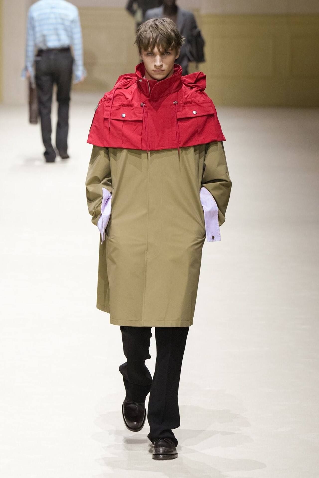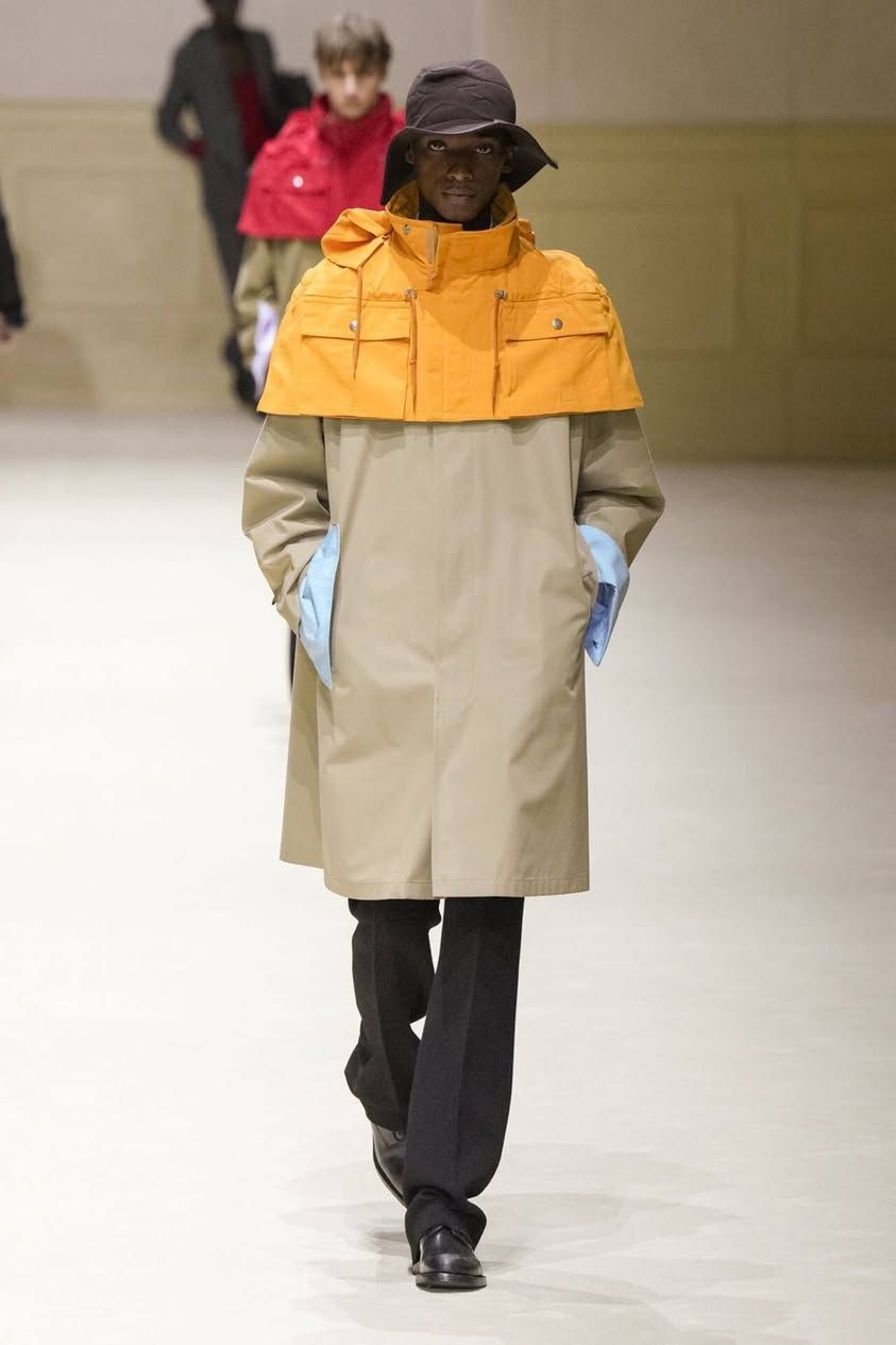 Considerato il meteo imprevedibile delle stagioni più fredde, Prada ha voluto pensare a un modo per proteggere i cappotti in lana: non un ombrello, non una giacca impermeabile, bensì una mini mantella impermeabile da appoggiare sulle spalle come un golf su una polo. Nei colori più brillanti e imprevedibili della collezione, come il verde turchese, il magenta o il giallo banana. Mettere un accessorio colorato, inaspettato, su un look estremamente basico è forse il trucco di styling più Pradesco della collezione.