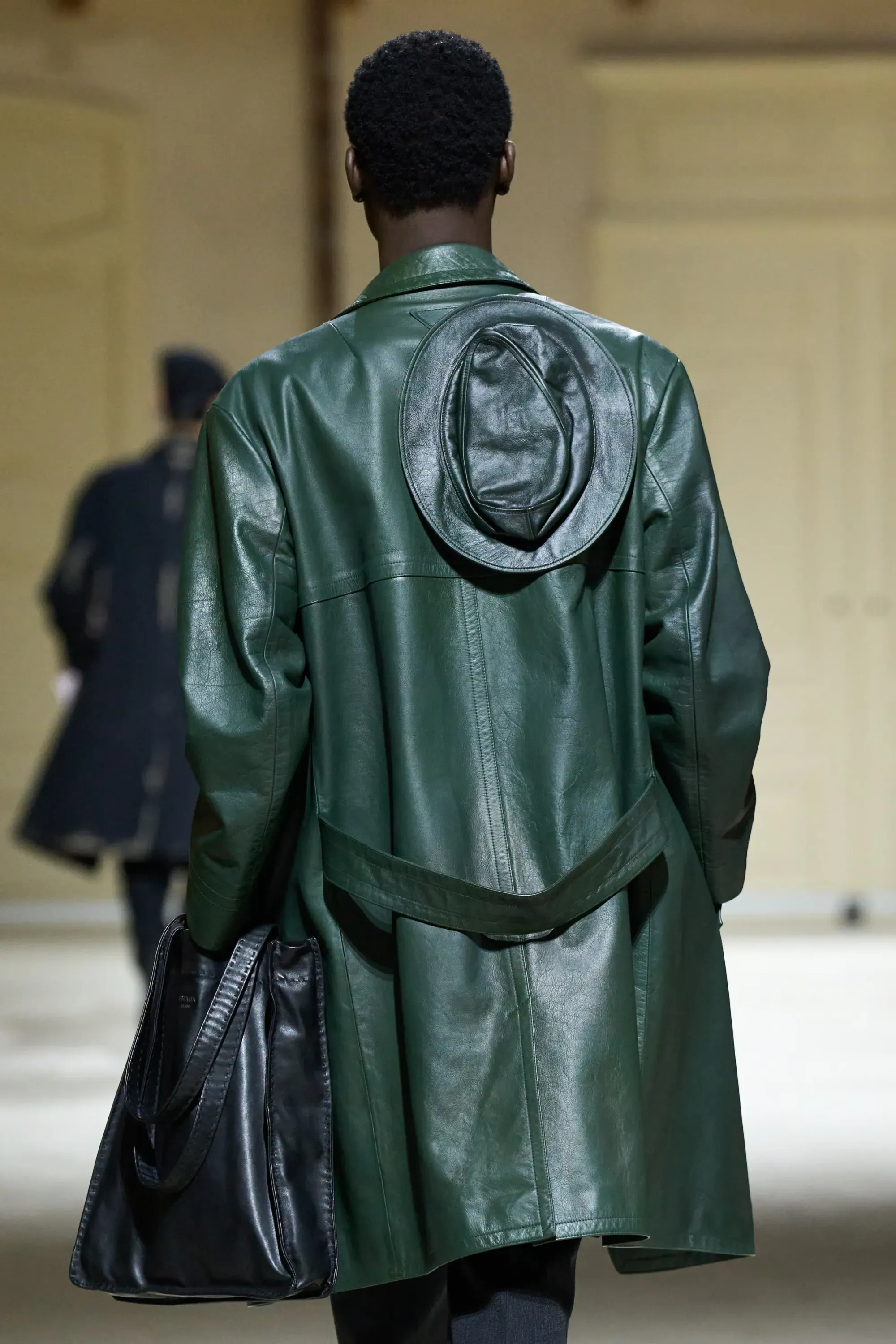 Per la FW26, Prada ha detto che non c'è nulla di più chic di un cappello in lana abbinato al cappotto o alla giacca e allacciato sulla schiena, mimetizzato con il resto del look. Realizzati nello stesso materiale dei copricapi, dalla lana grigia al tessuto tecnico colorato, berretti da postino e da pescatori si sono rivestiti di qualità camaleontiche.