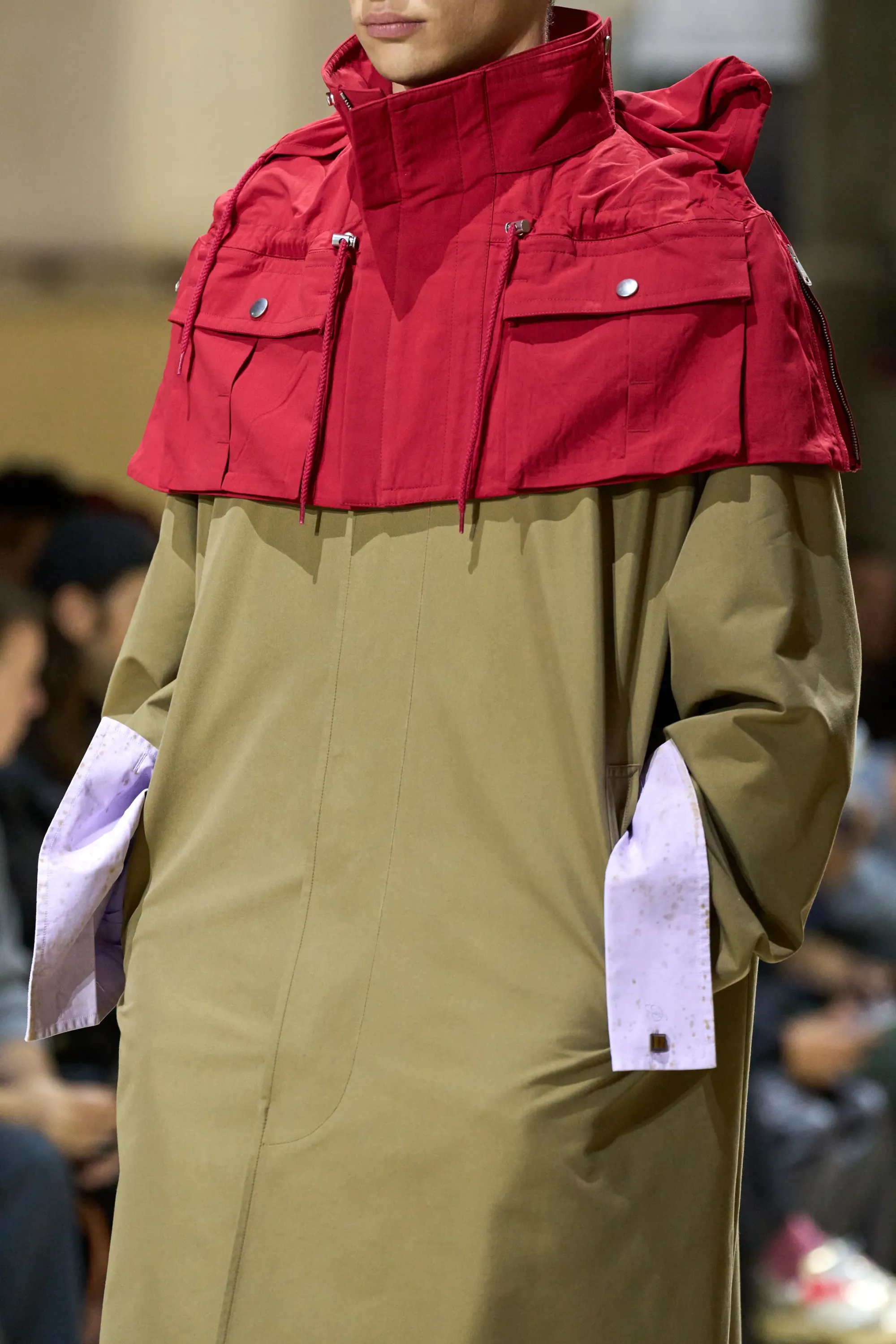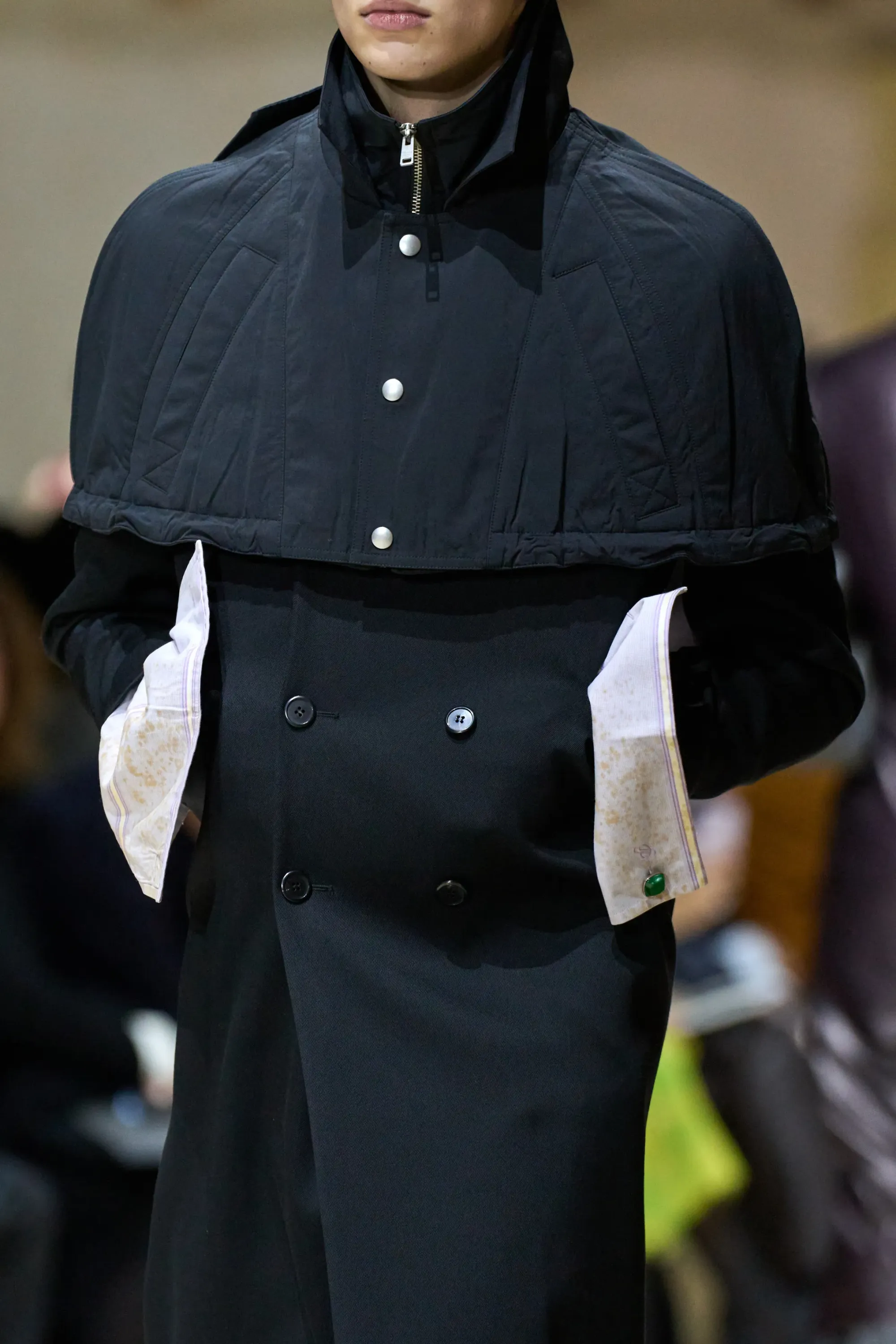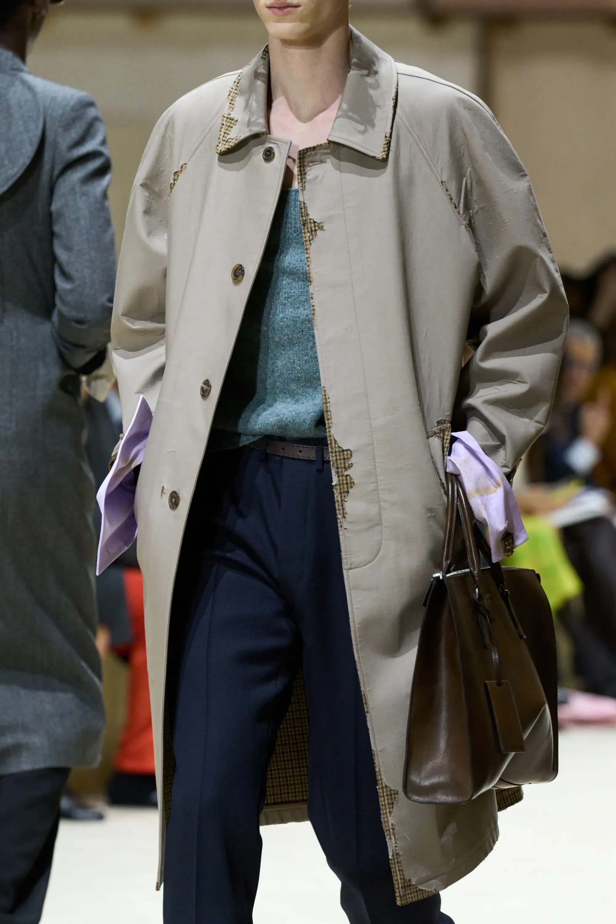 Avete presente quando rovistate al mercato dell'usato e vi imbattete in un capo visibilmente rovinato, rimasto piegato in una cantina polverosa così a lungo da aver sviluppato delle linee tutte nuove? Ecco, questo è il dettaglio su cui hanno voluto giocare Miuccia Prada e Raf Simons per la Men's FW26. Camicie incrostate, bruciacchiate, sporche e spiegazzate facevano capolino dai cappotti, decorate da gemelli colorati che non ne nascondevano assolutamente i difetti.