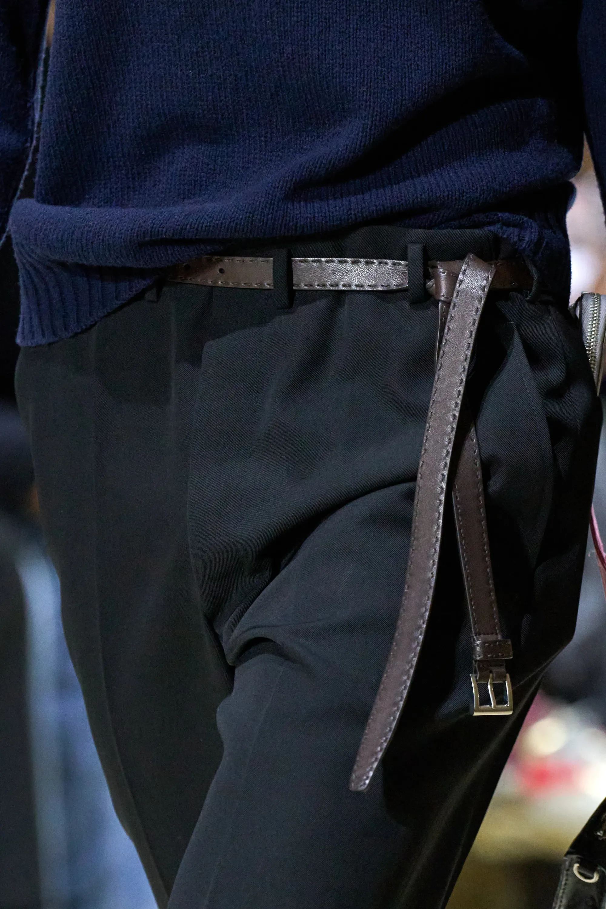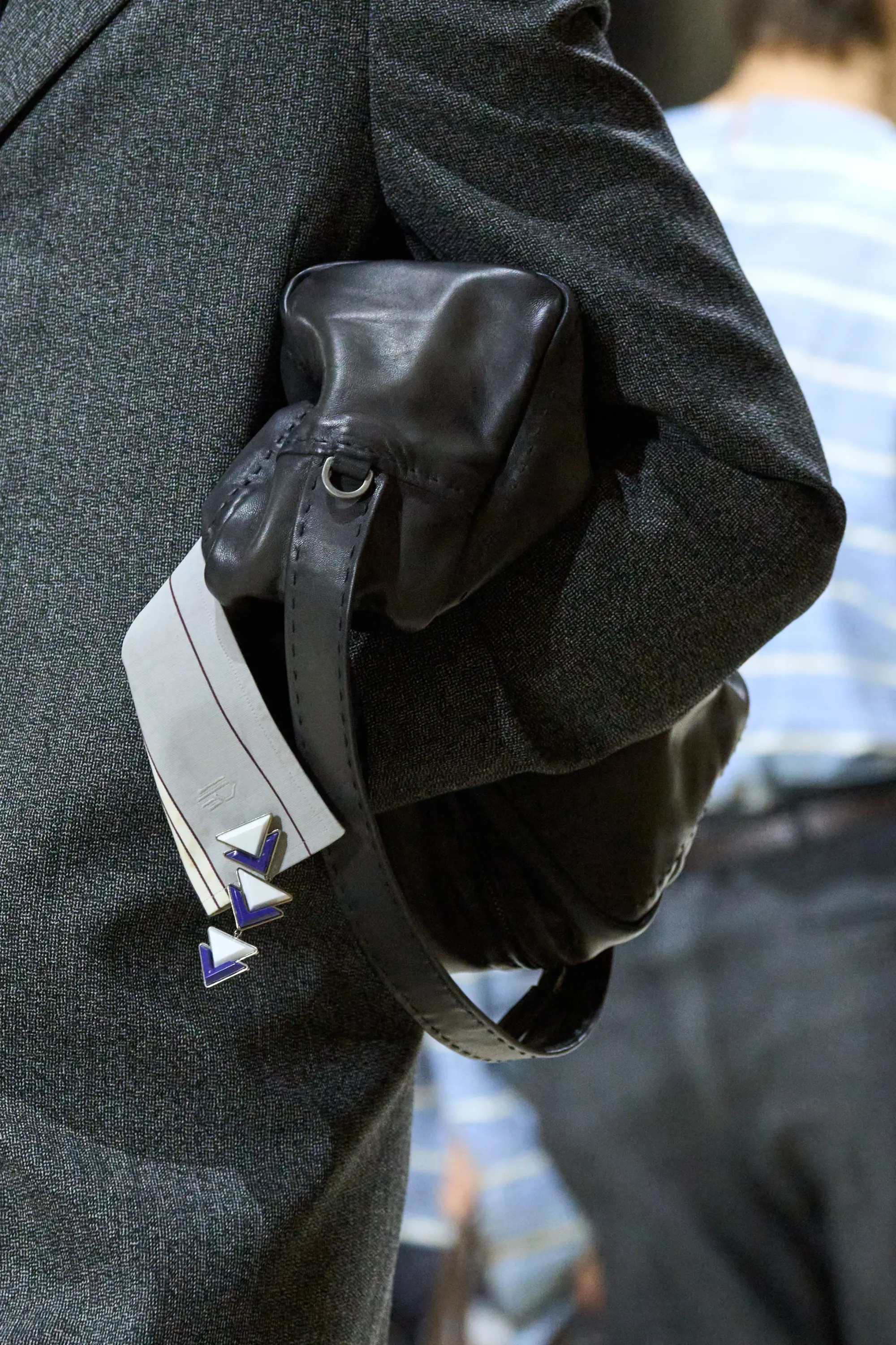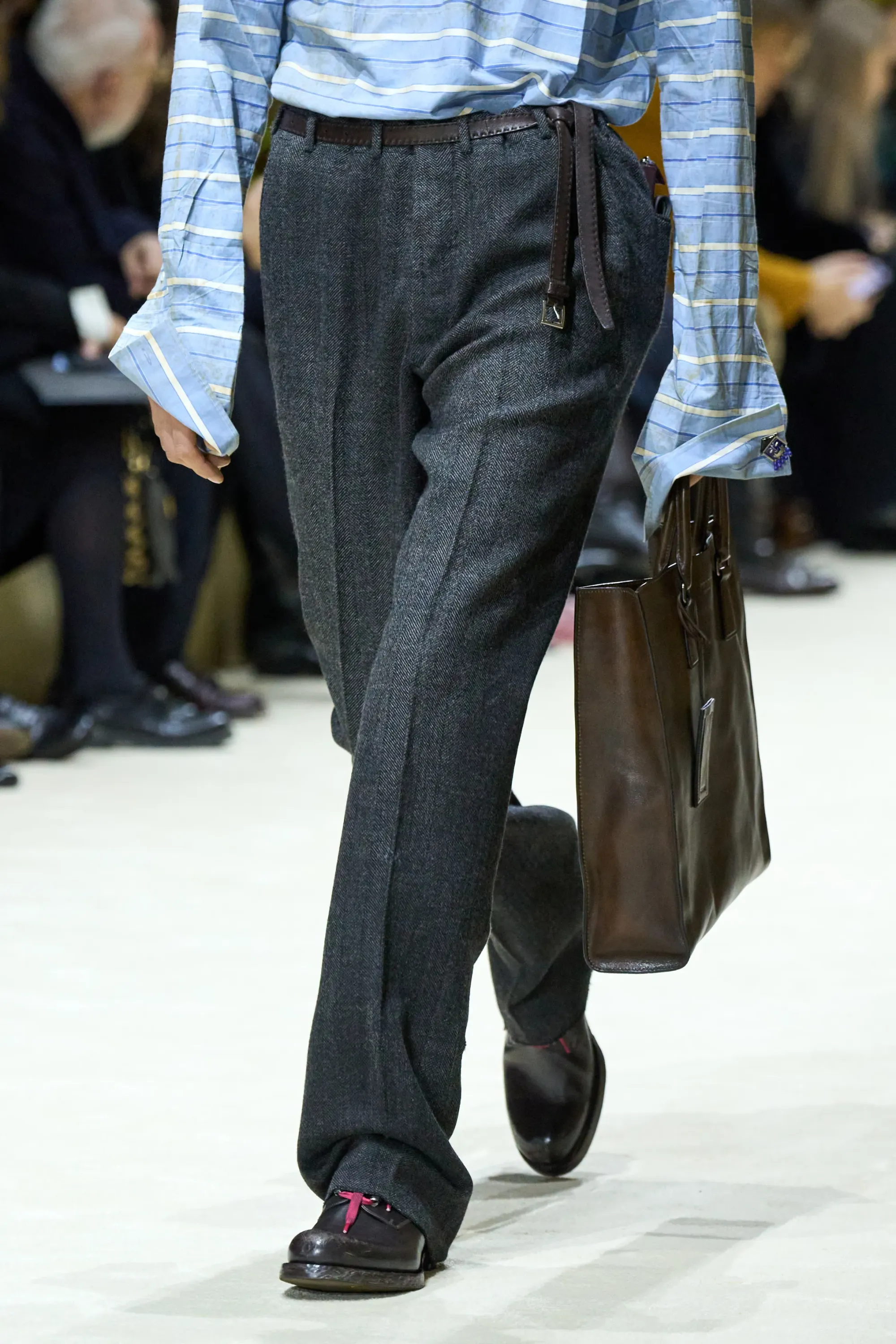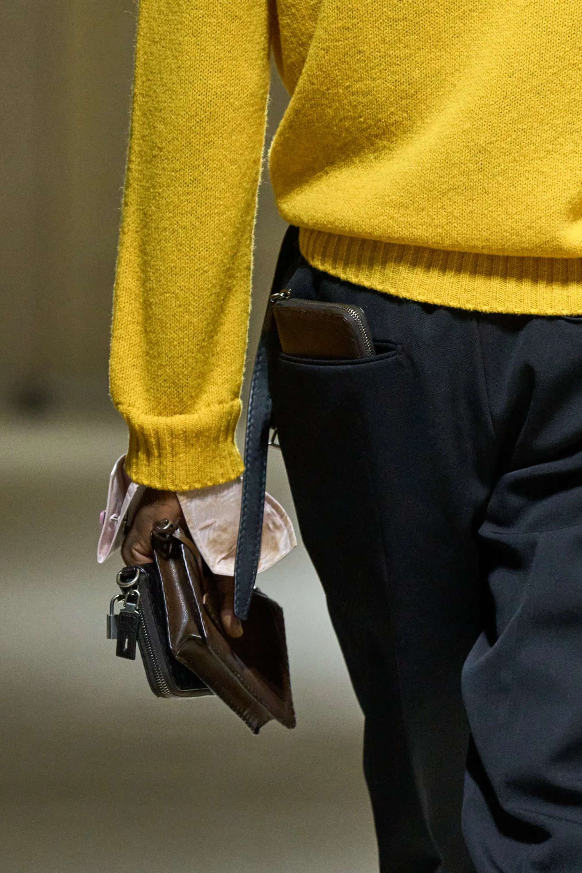 Ci sono alcuni dettagli del dadcore che la moda non aveva ancora scoperto, come il portafoglio infilato in tasca distrattamente che sbuca dai pantaloni rischiando di cadere o di essere rubato. Questa stagione Prada ha reinterpretato il look - se così si può chiamare - a modo proprio, infilando lunghi portafogli nelle tasche dei pantaloni o dando una manciata di questi piccoli borselli in mano ai modelli.