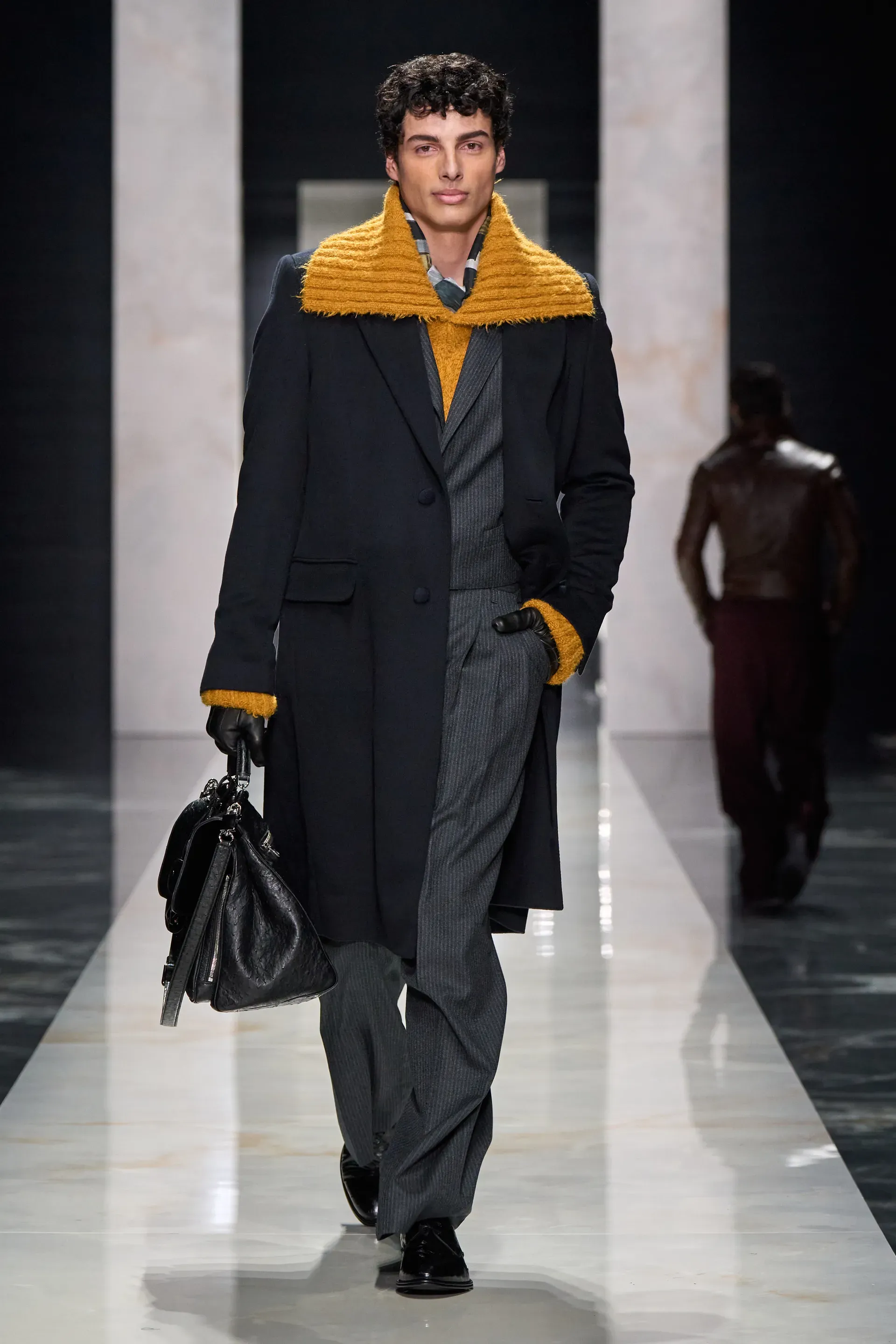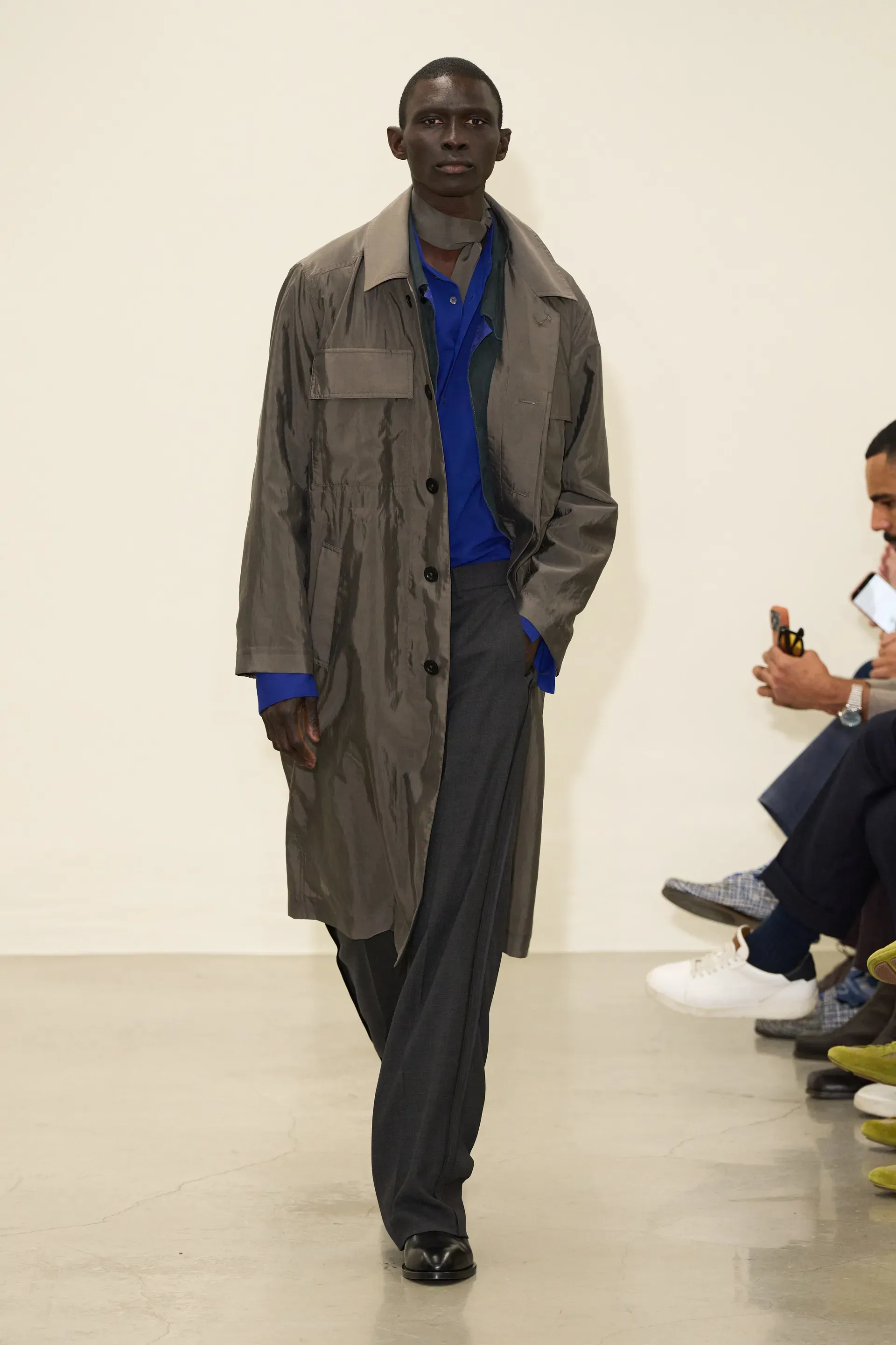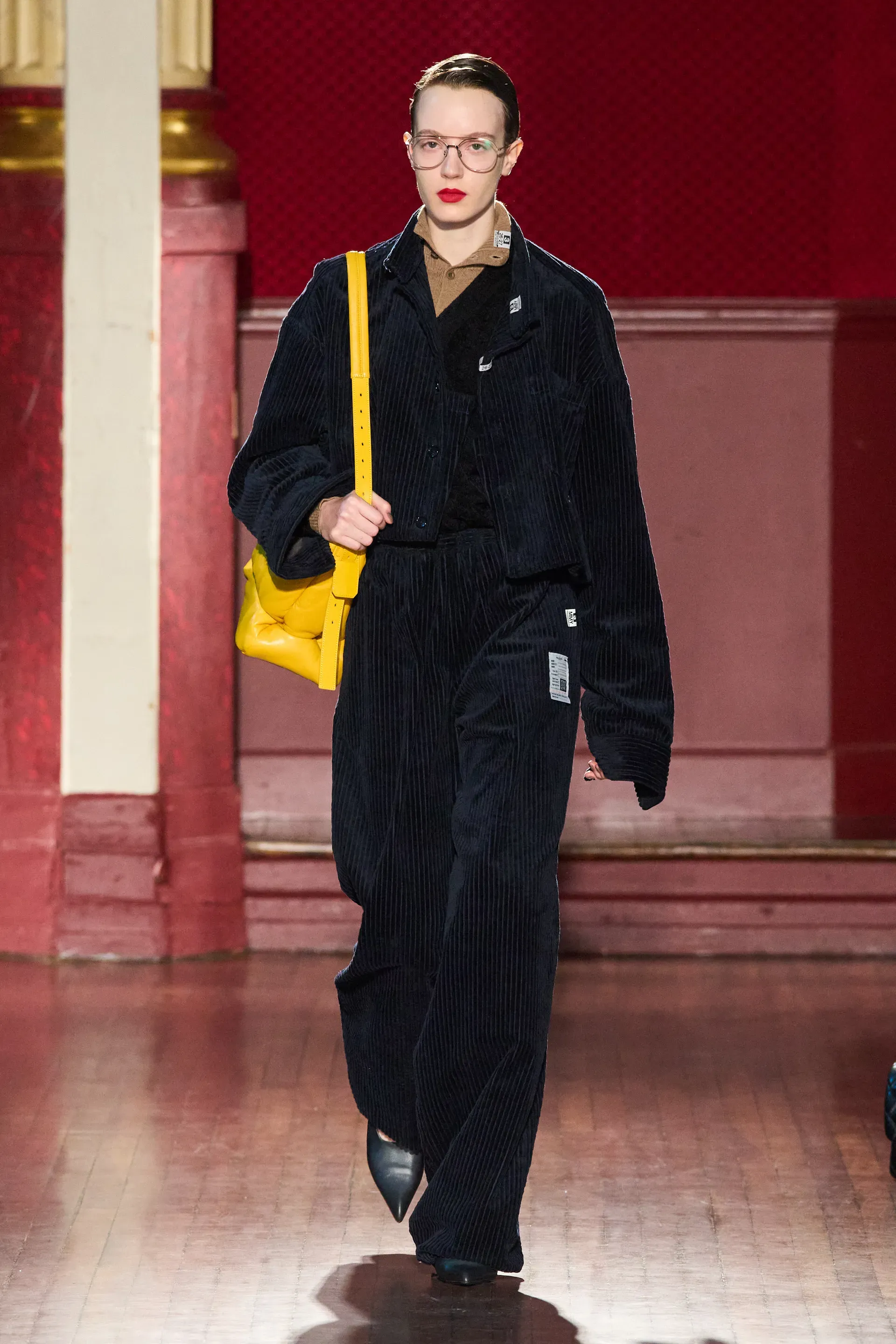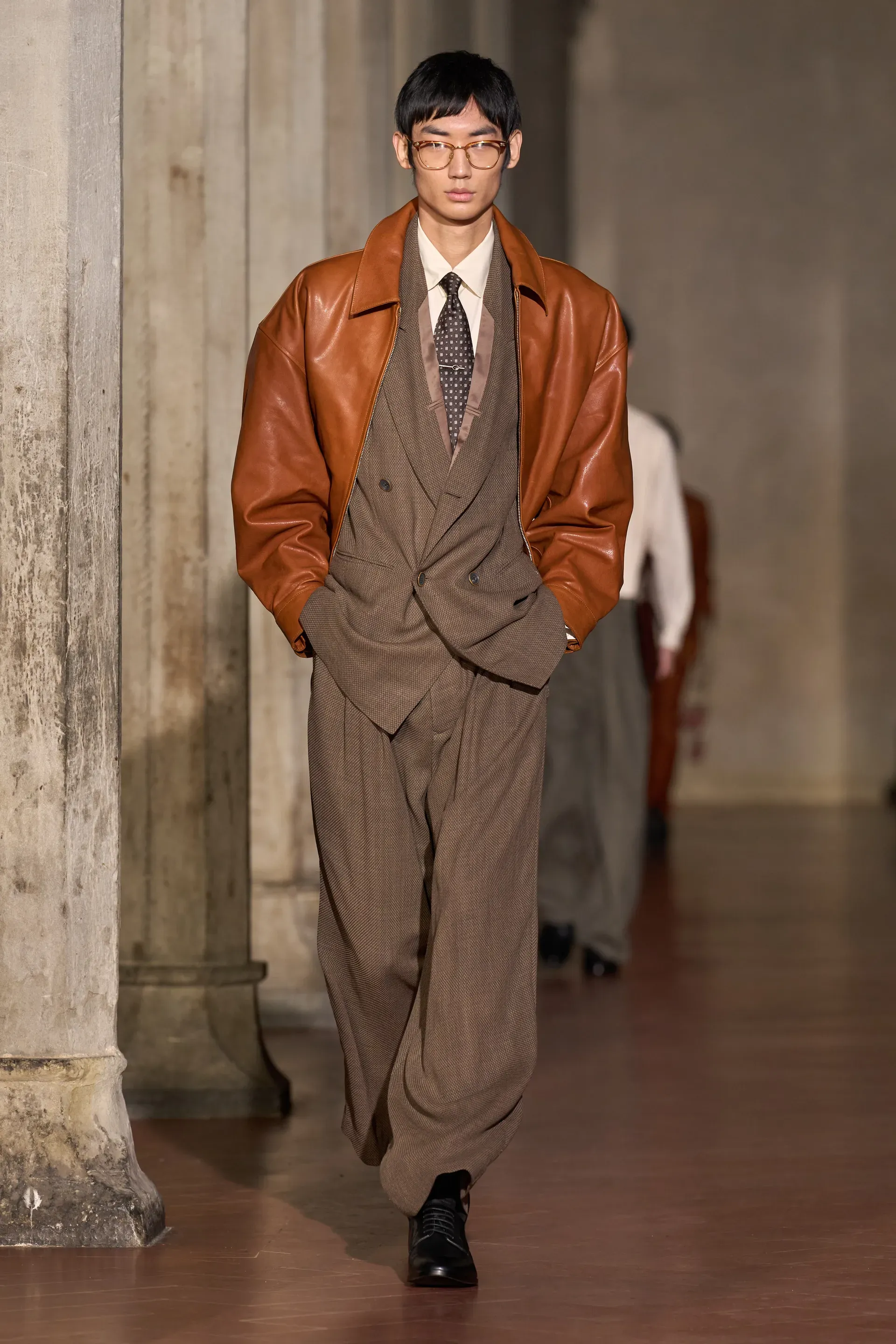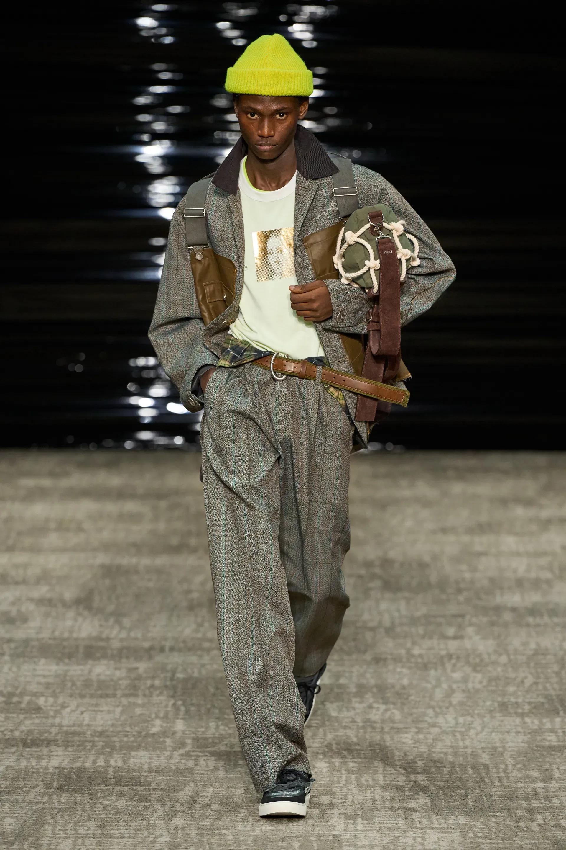 Il giallo è anche emerso tra i protagonisti: sotto forma di maglione da Magliano, una polo di lana nascosta sotto la giacca nel lookbook di Umit Benan, una borsa da Maison Mihara Yasuhiro e ovviamente da Dior dove erano gialle le parrucche dei modelli e anche le polo decorate con spalline cerimoniali di cristalli. Da Lemaire invece si è preferito un leggero accento di verde brillante, da Soshiotsuki e Dolce&Gabbana c’è invece stato del marrone, mentre da Setchu e da Hermès è apparso timidamente del rosa antico.