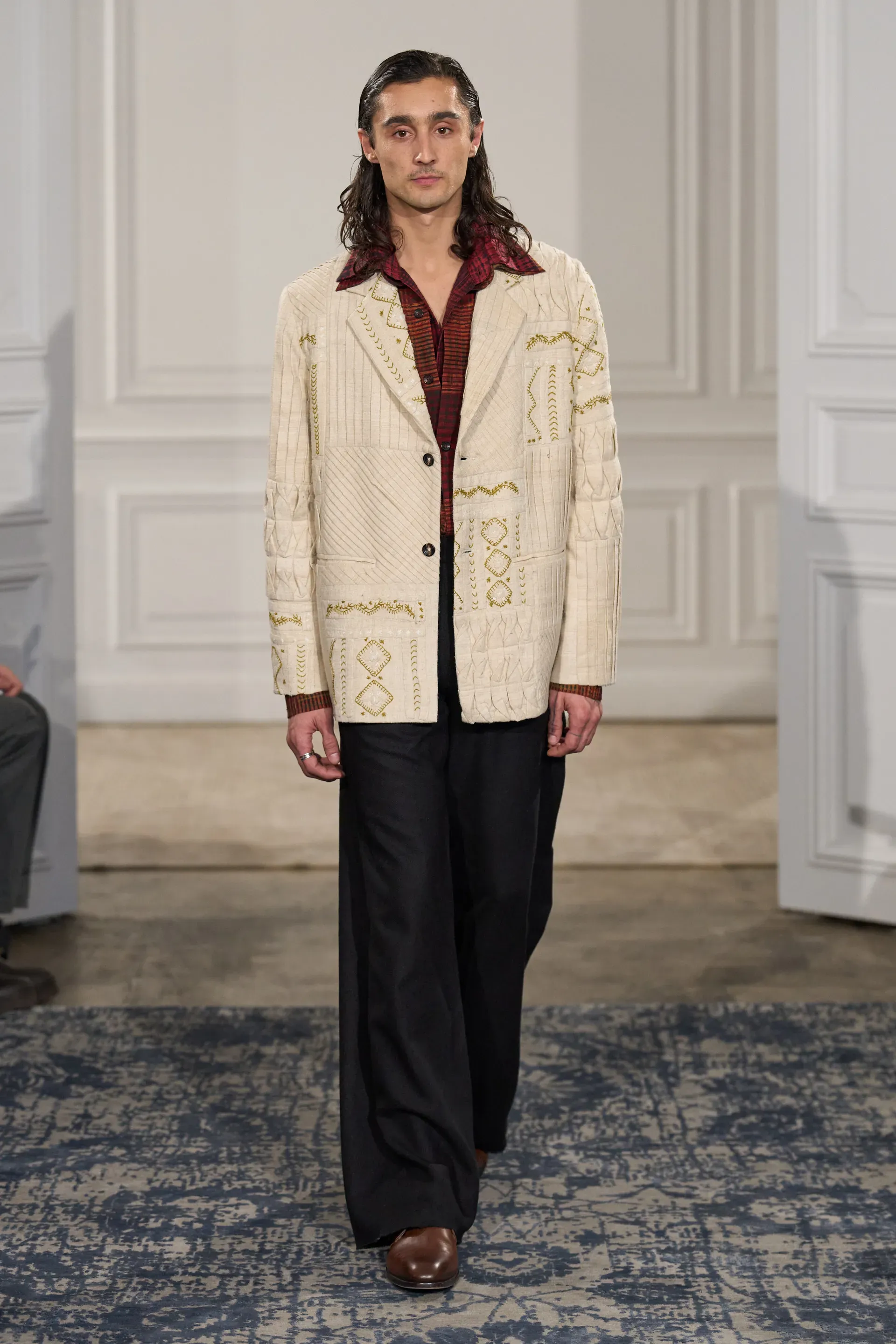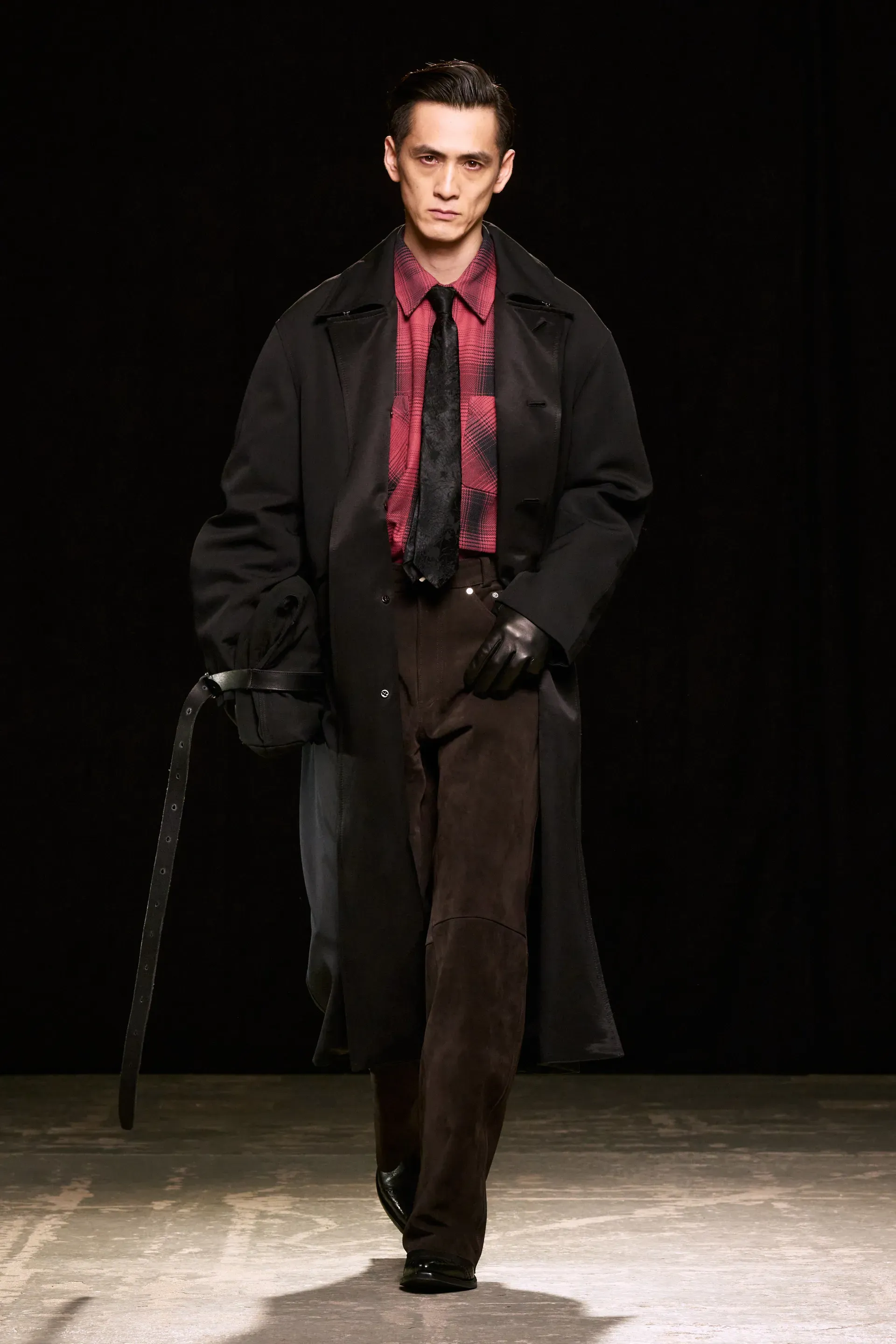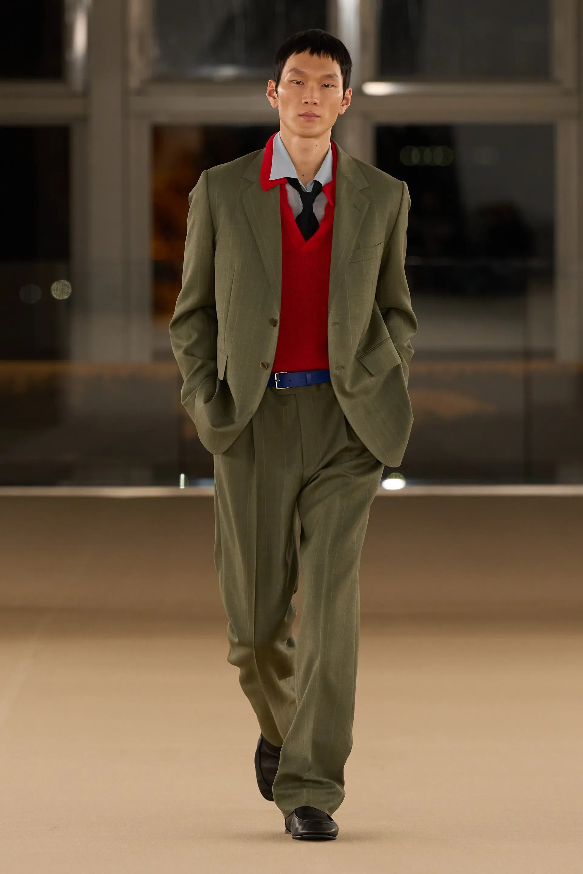 Il colore più ricorrente di questi giorni tra le tinte comprimarie di una settimana dominata da toni relativamente neutri è stata il rosso. E nello specifico una camicia rossa il cui colletto emergeva da insiemi sartoriali cromaticamente tradizionali: c’era una camicia rossa abbinata a un completo di jeans da Ralph Lauren, colletto e polsini rossi che emergevano da sotto un maglione scuro da Willy Chavarria (e lì i tocchi di colore sono stati parecchi, incluso il giallo) e sia da Amiri, che da Louis Vuitton, Junya Watanabe, Kartik Research, Auralee e Kidsuper si è vista la combinazione di completo maschile scuro decorato da uno strato di rosso intenso. Persino da Zegna si è visto un colletto rosso emergere da un cappotto color crema.