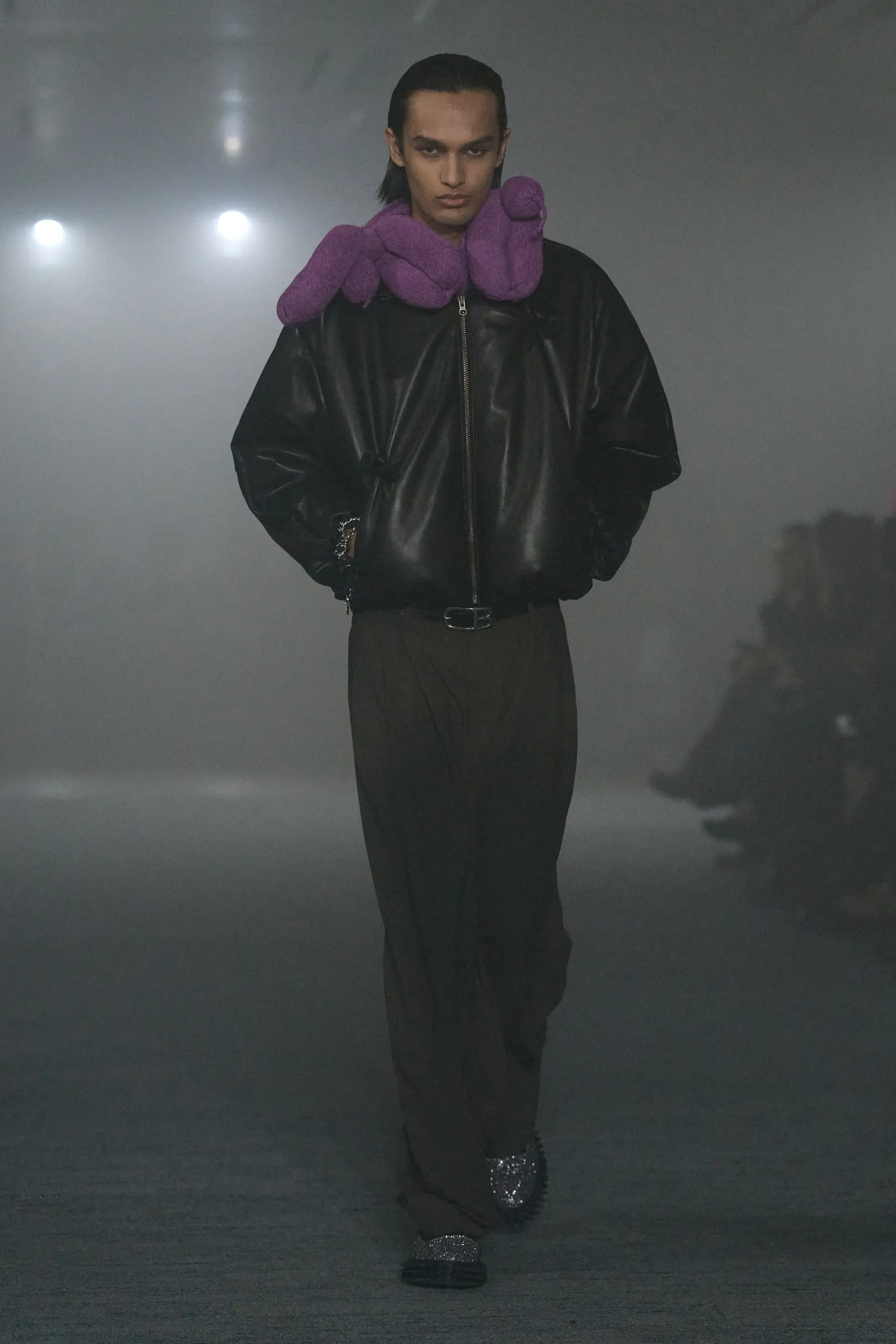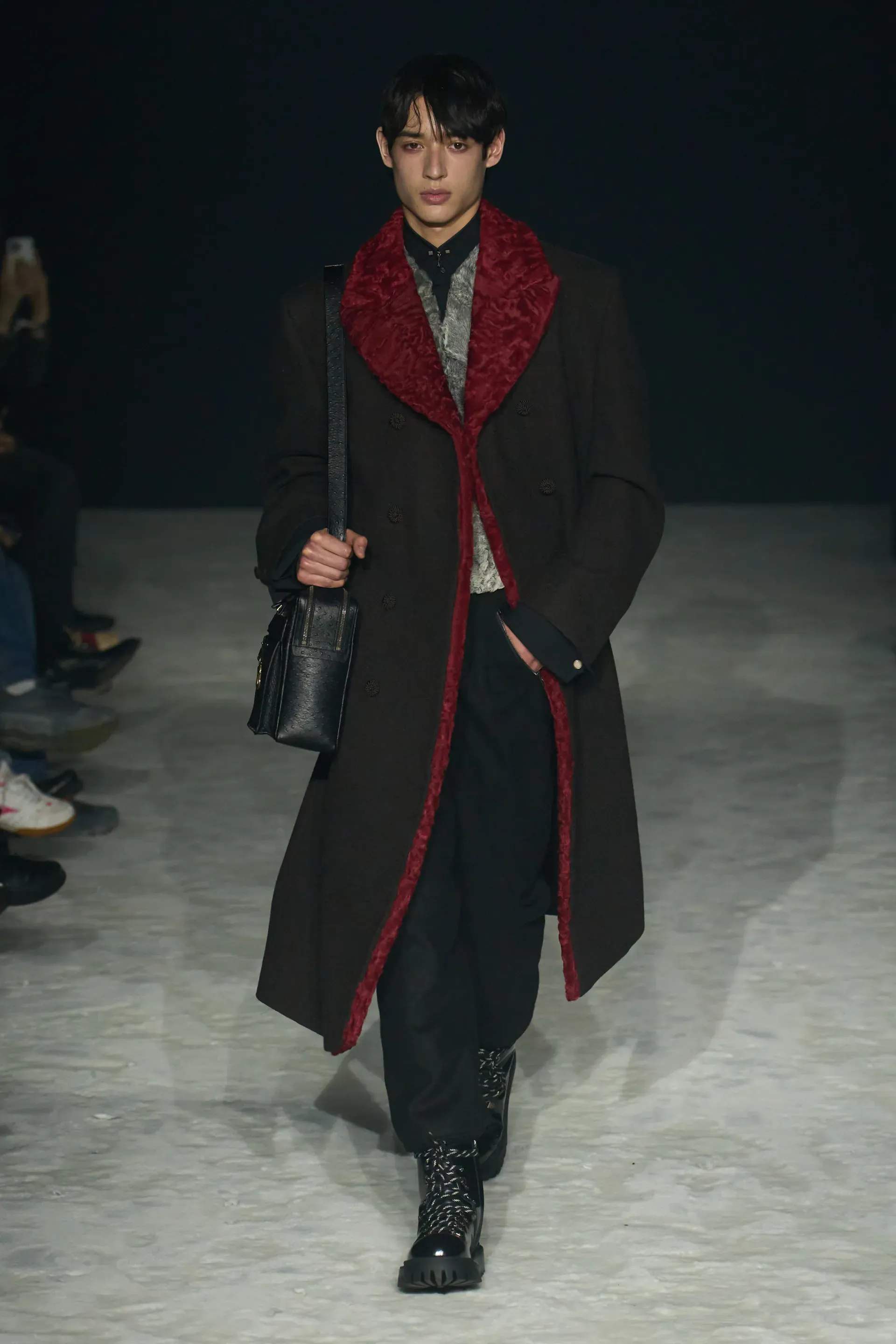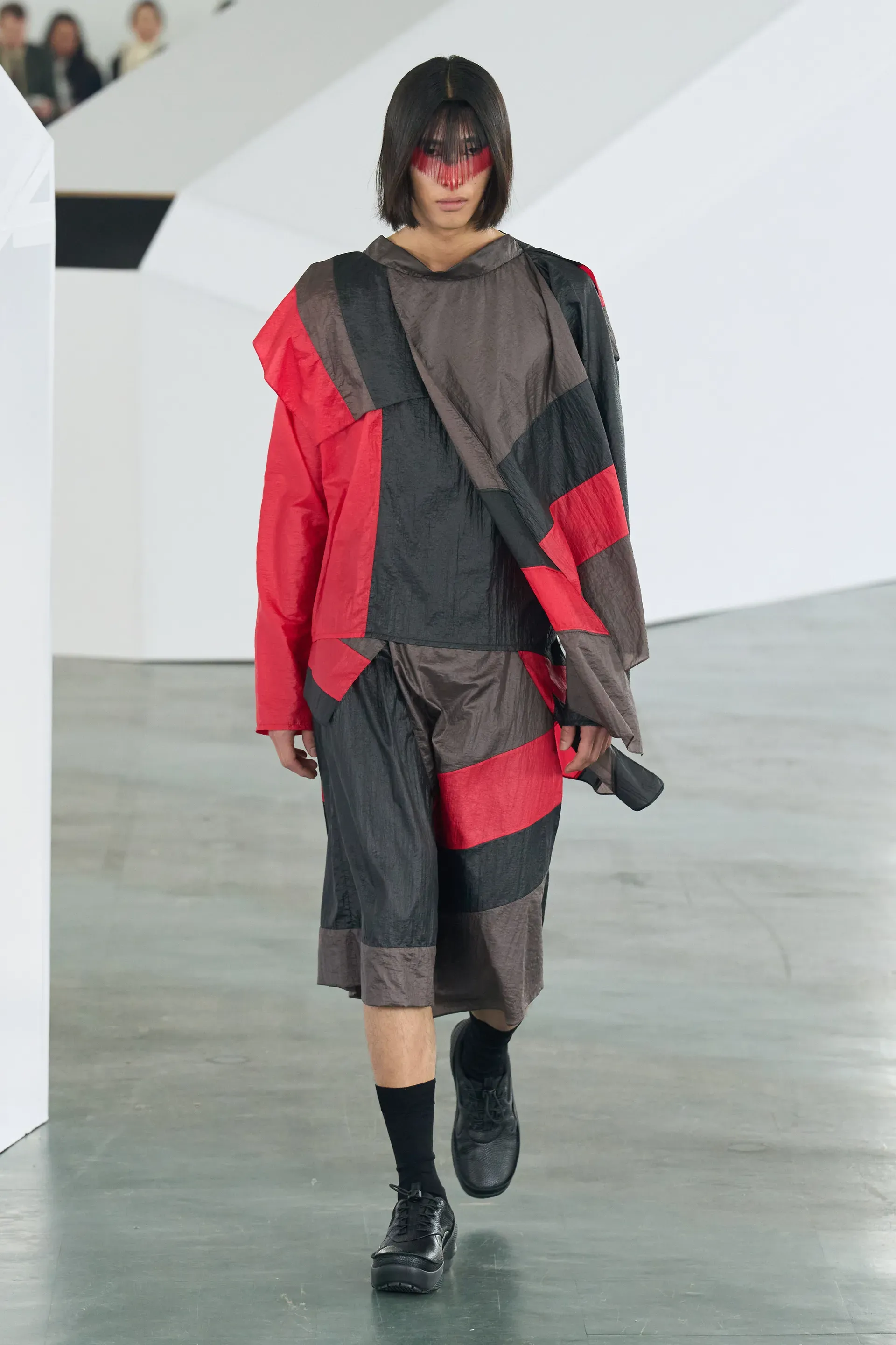 Altrove gli accenti rossi sono rimasti ma hanno assunto forme nuove: un cappellino rosso insieme a un completo grigio da Ami Paris, un colletto rosso jacquard su un cappotto nero da Dries Van Noten, un panciotto rosso da Yohji Yamamoto, un’incredibile giacca rossa anch’essa abbinata al total black nel debutto di ssstein di Kiichiro Asakawa, un tank top di maglia rossa sotto un completo di tweed grigio da Prada e un ensemble tecnico da Kiko Kostadinov i cui bordi erano decorati da accenti rossi. Da Wooyungmi gli accenni di rosso erano diversi, ma il più notevole era l’interno rosso di una giacca di montone rovesciato.