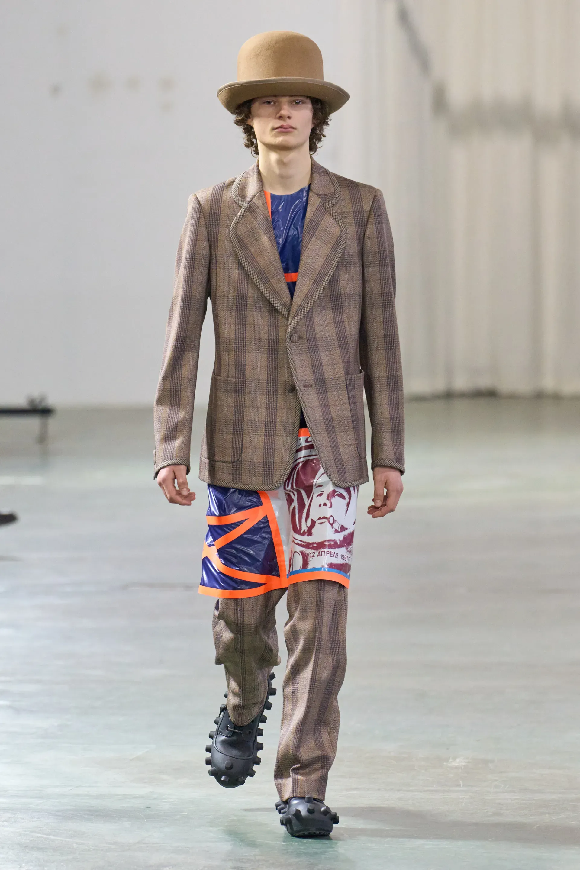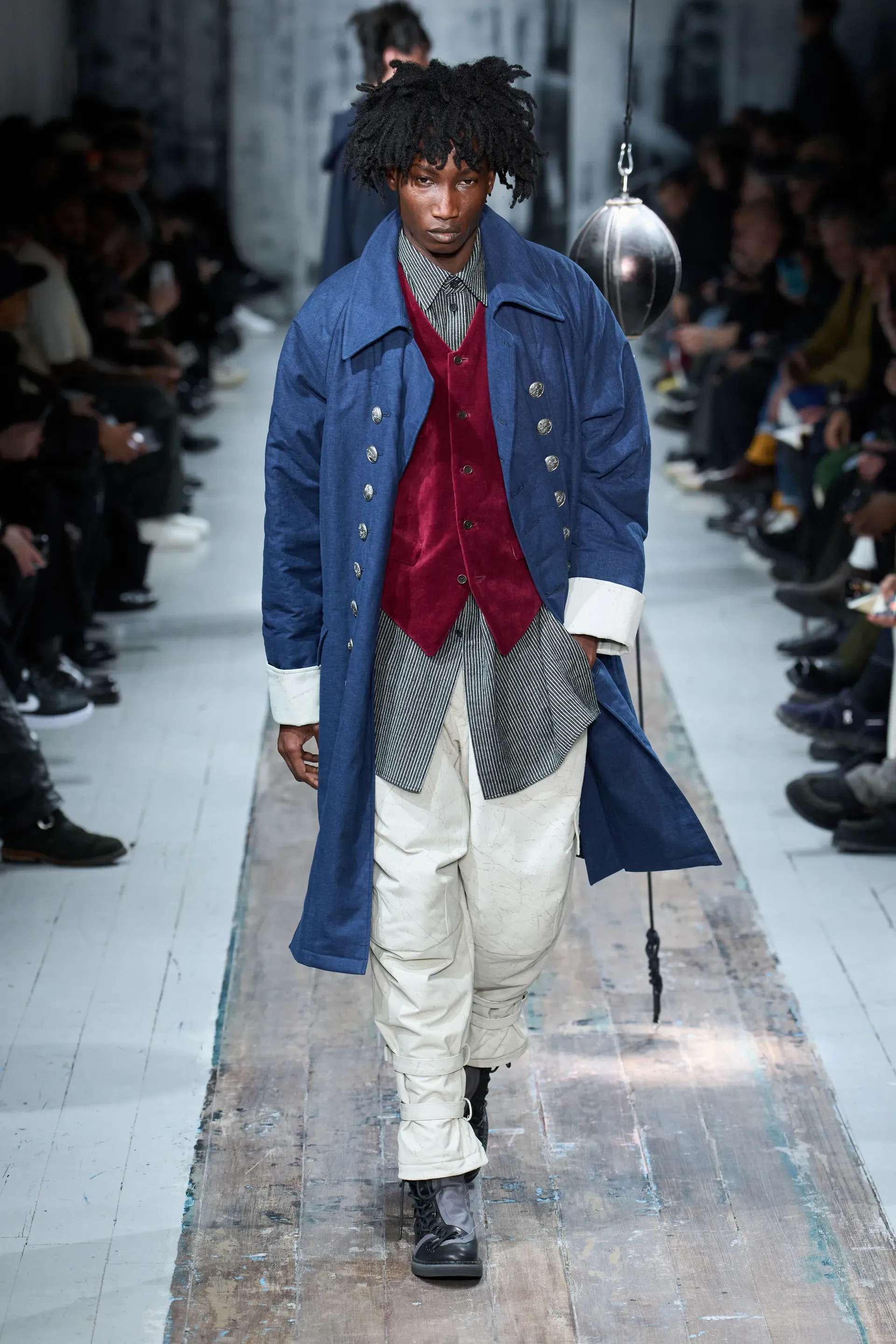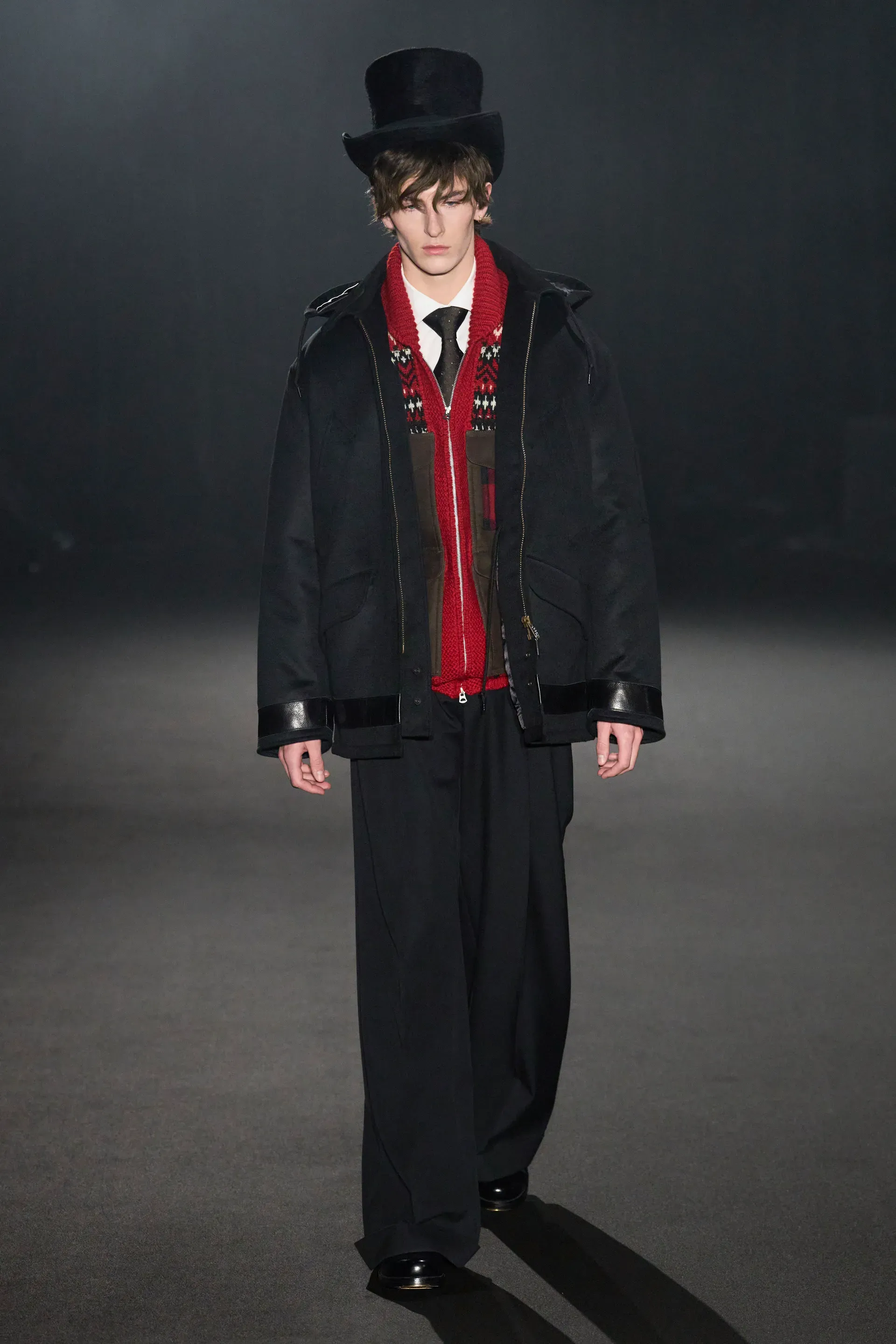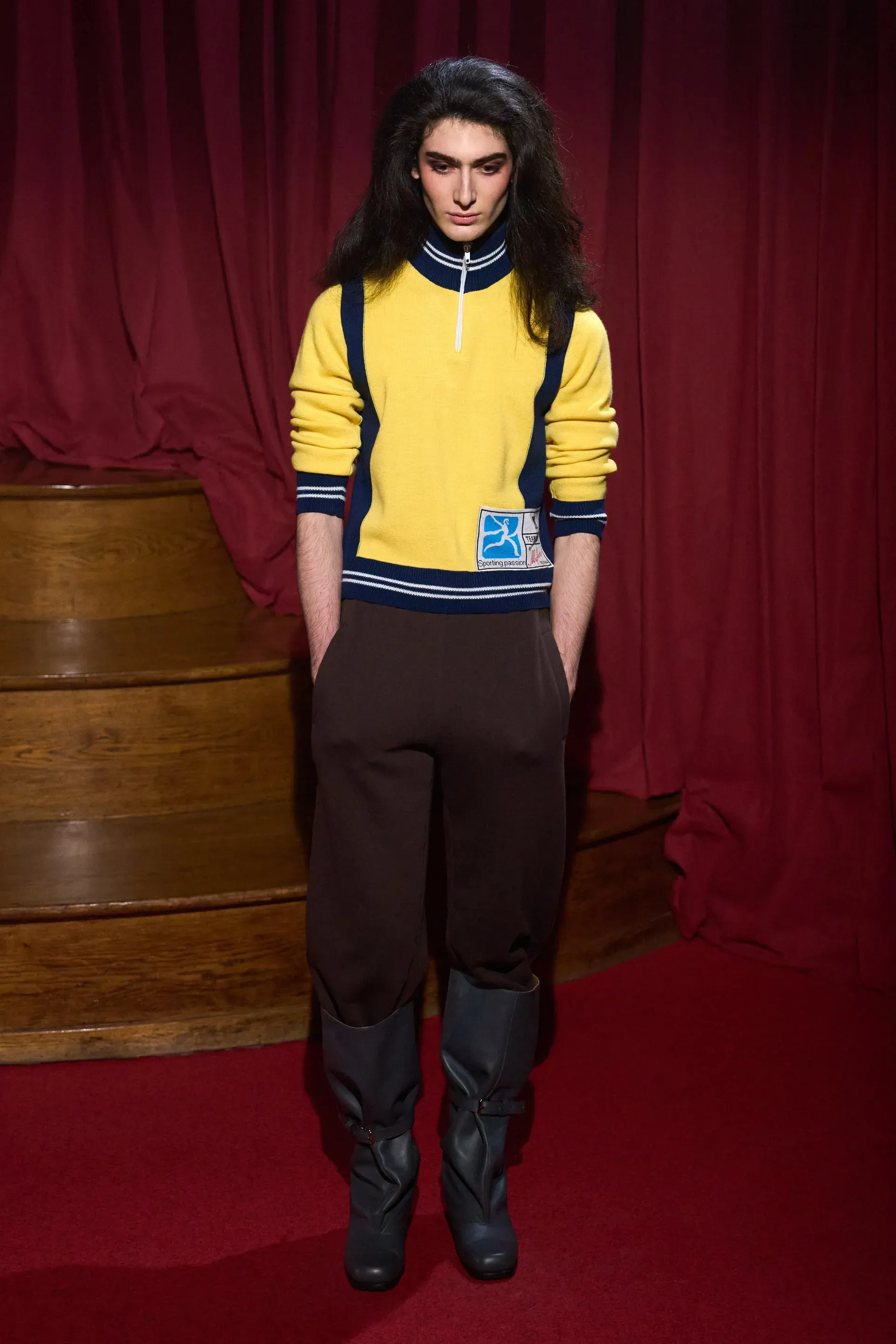 Altrove gli accenti rossi sono rimasti ma hanno assunto forme nuove: un cappellino rosso insieme a un completo grigio da Ami Paris, un colletto rosso jacquard su un cappotto nero da Dries Van Noten, un panciotto rosso da Yohji Yamamoto, un’incredibile giacca rossa anch’essa abbinata al total black nel debutto di ssstein di Kiichiro Asakawa, un tank top di maglia rossa sotto un completo di tweed grigio da Prada e un ensemble tecnico da Kiko Kostadinov i cui bordi erano decorati da accenti rossi. Da Wooyungmi gli accenni di rosso erano diversi, ma il più notevole era l’interno rosso di una giacca di montone rovesciato.