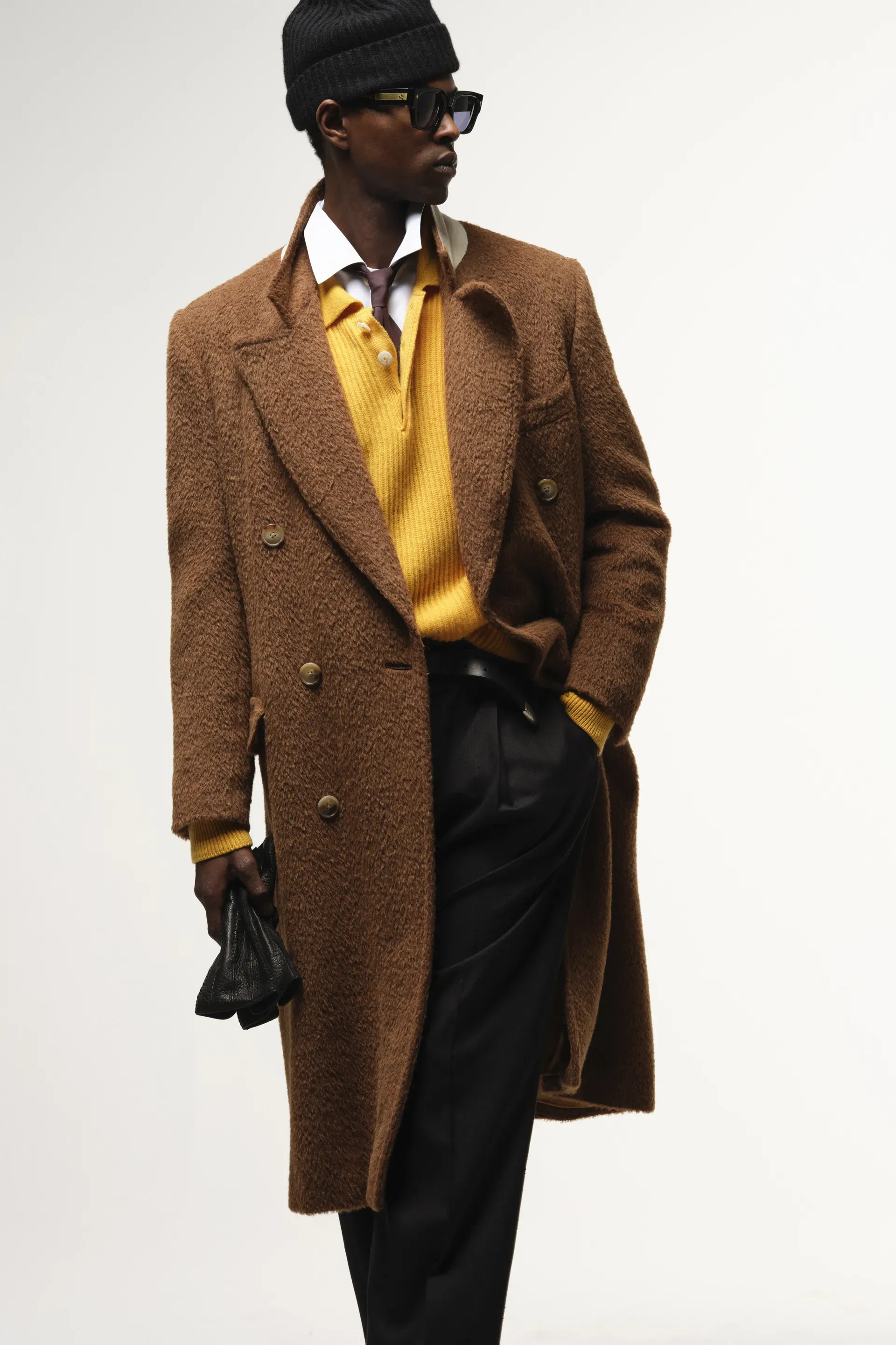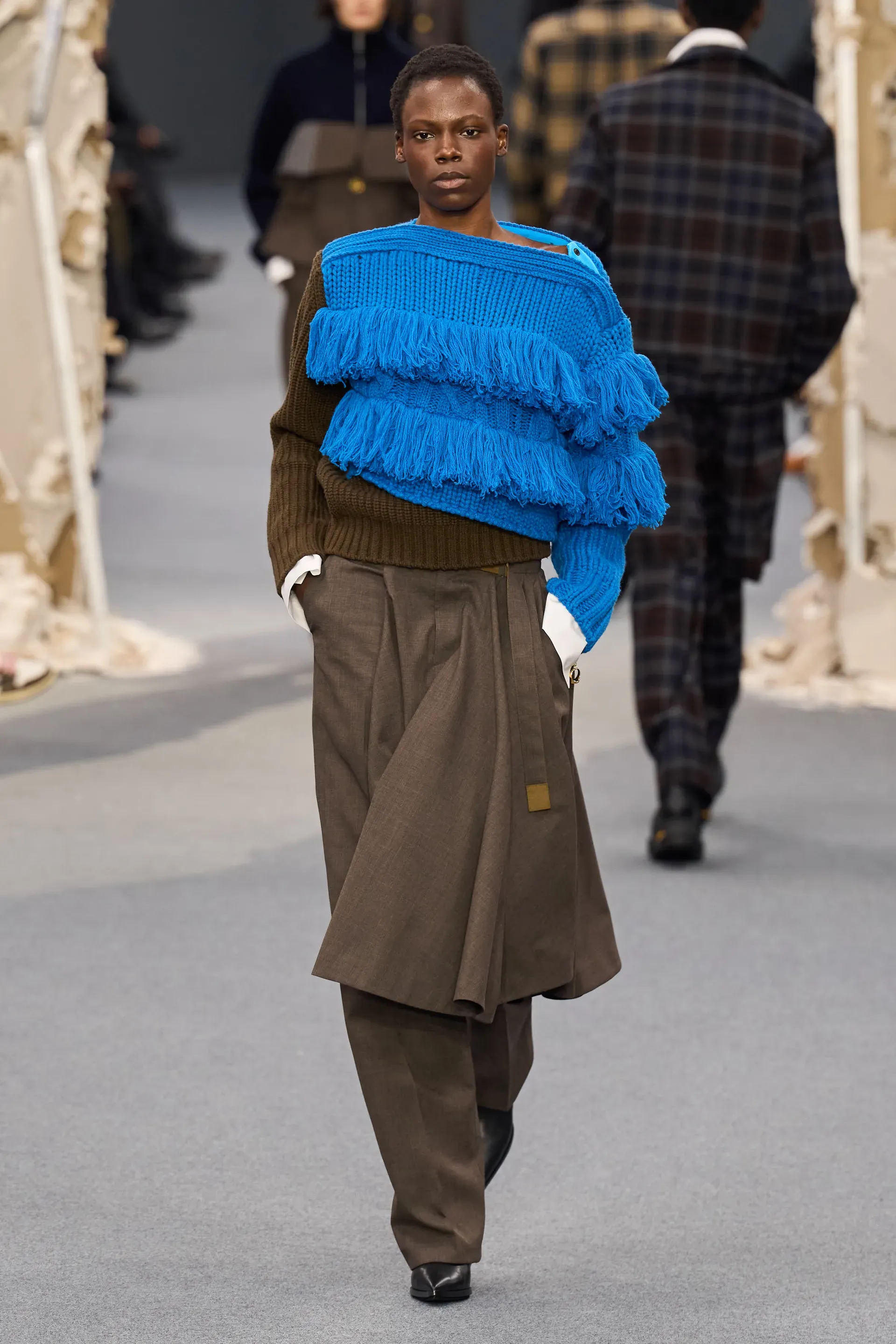 Ma di un blu intensissimo erano anche le piume dei top da Egonlab, o il piumino che uno dei modelli di Mordecai a Milano portava in mano come un accessorio insieme a uno dei completi color cammello re- ingegnerizzati da Ludovico Bruno. Da sacai invece c’era un maglione marrone il cui pannello anteriore era di un blu elettrico e decorato da frange.