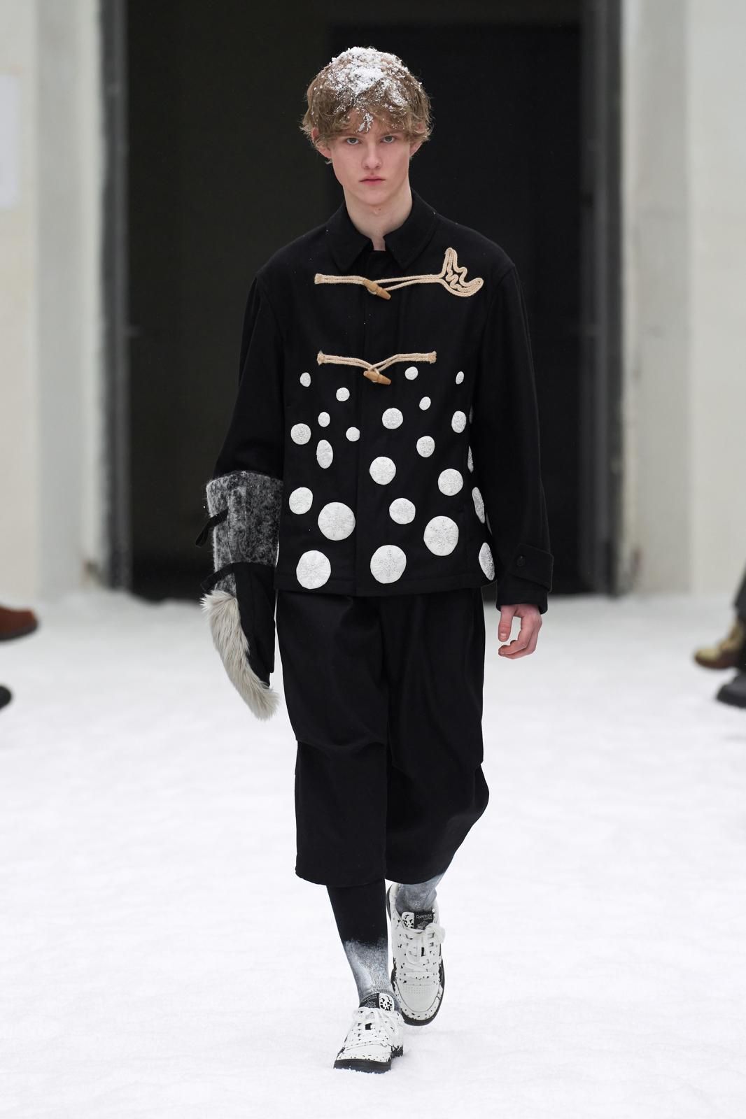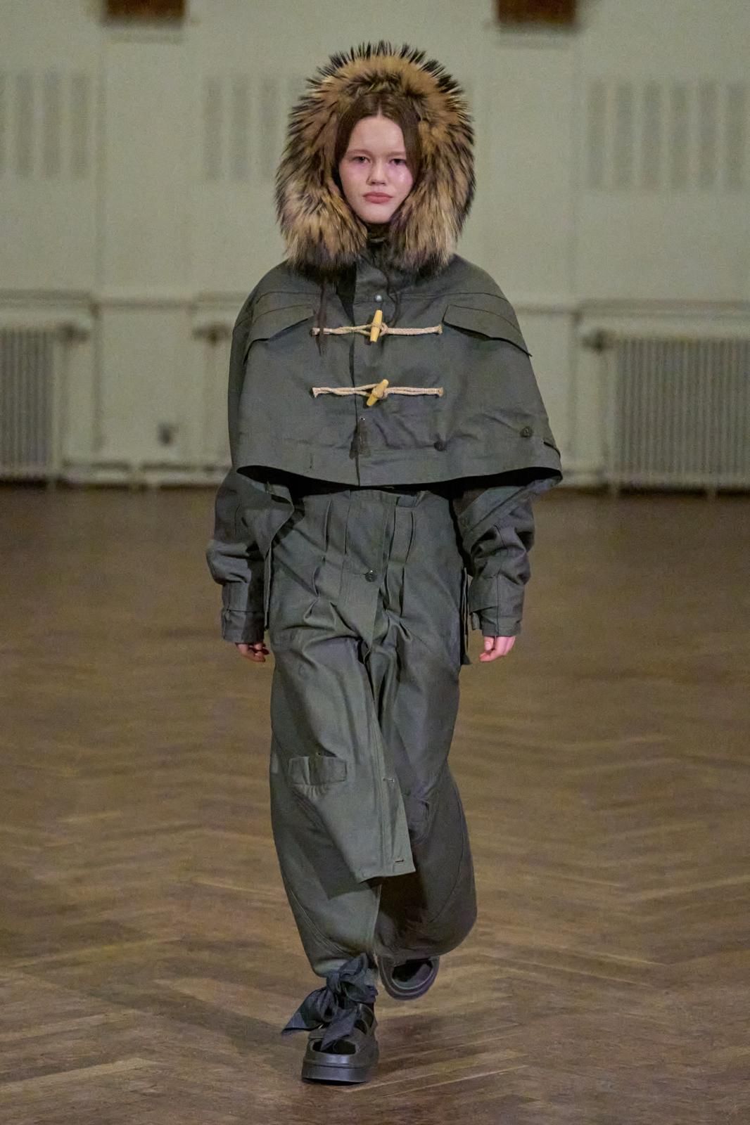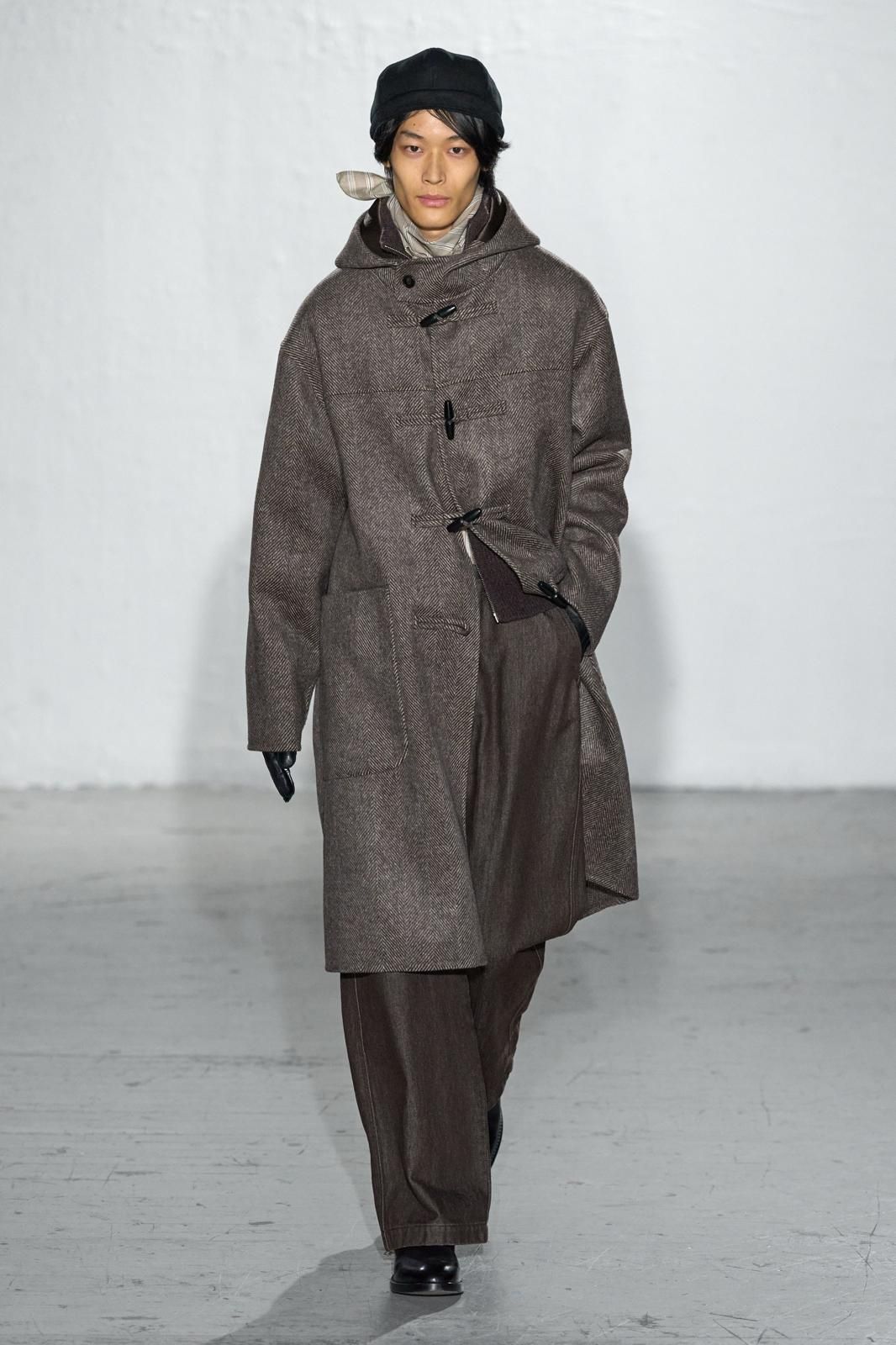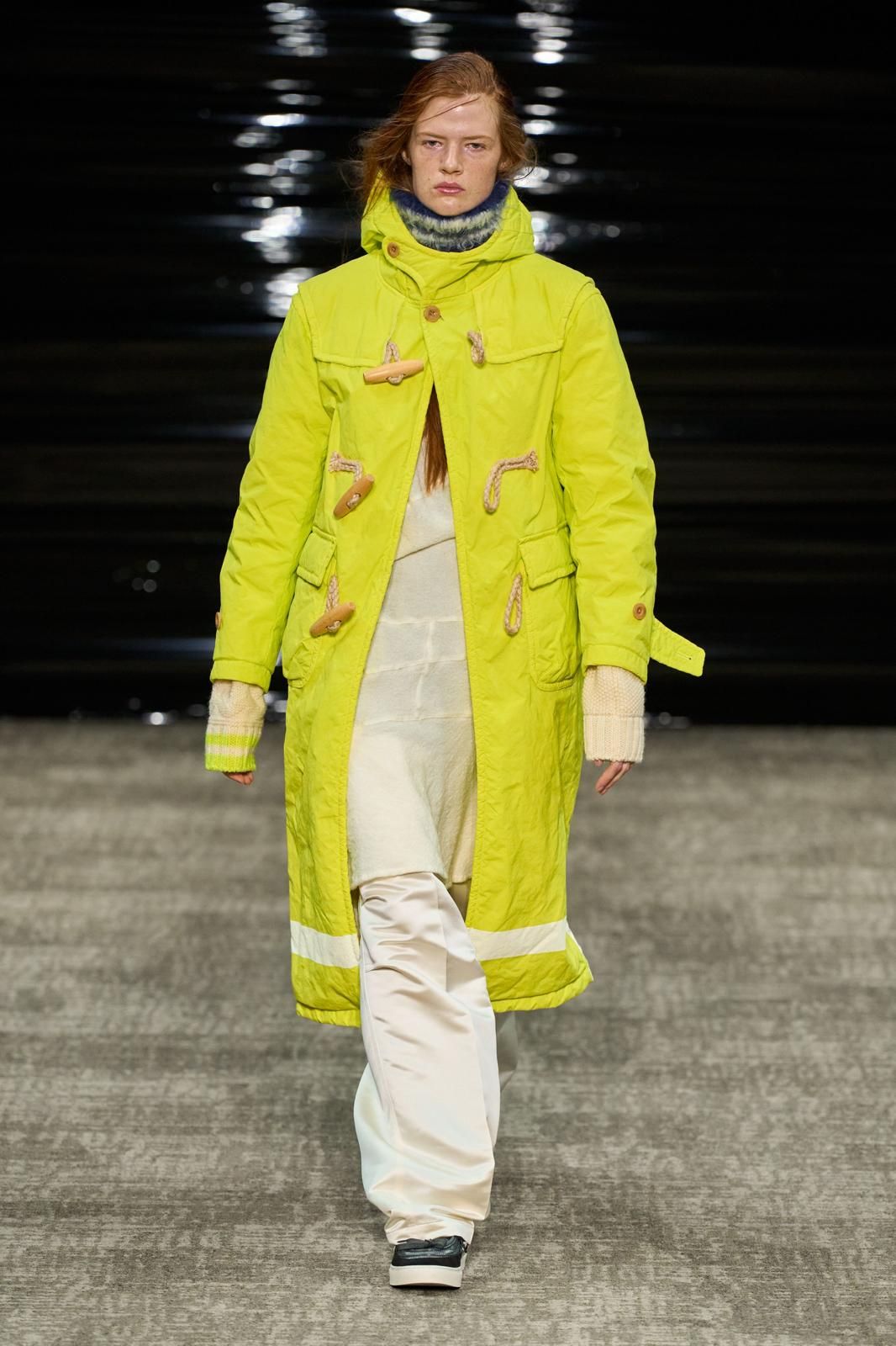 In alcuni casi il duffle coat conserva la sua attitudine preppy: Kenzo lo abbina a un maglione a scacchi, mentre nella FW26 di Thom Browne troviamo il cappotto in gabardine nel colore del classico trench inglese, portato sopra a un cardigan con trecce e una gonna a pieghe. Sempre preppy, Auralee ne ha proposto uno dalla silhouette anni ‘80, mentre da Officine Générale, Pierre Mahéo lo ha rifatto in spigato grigio. Sempre su questo genere, Henrik Vibskov ne firma uno nel classico blu navy, mentre da Maison Mihara Yasuhiro troviamo dei duffle coat “cropped” a doppiopetto che ricordano, per il taglio corto, il caban. Invece, Kolor ha presentati di lunghi e imbottiti con una striscia bianca alla base, quasi a ricordare le fasce catarifrangenti applicate sulle giacche dei pompieri.