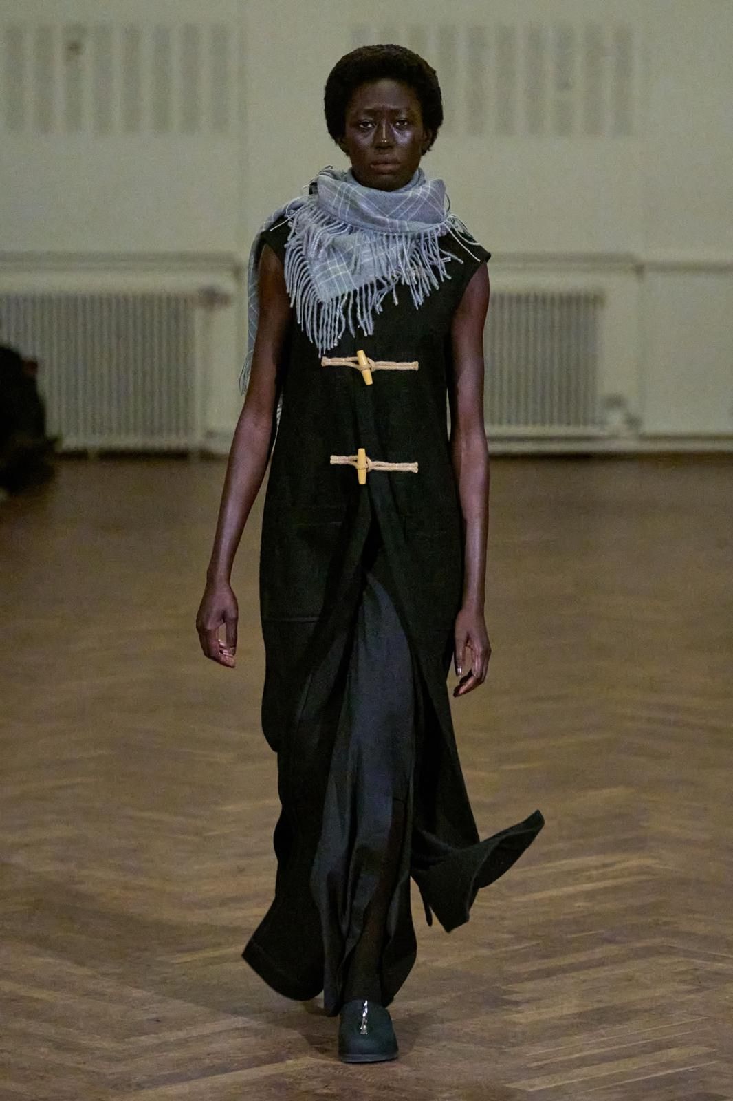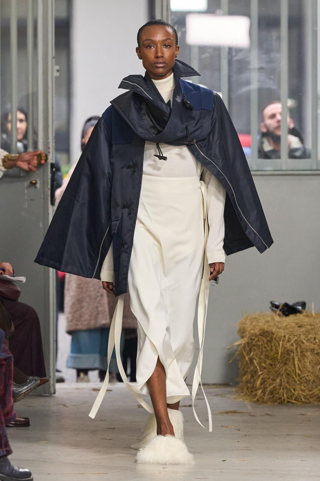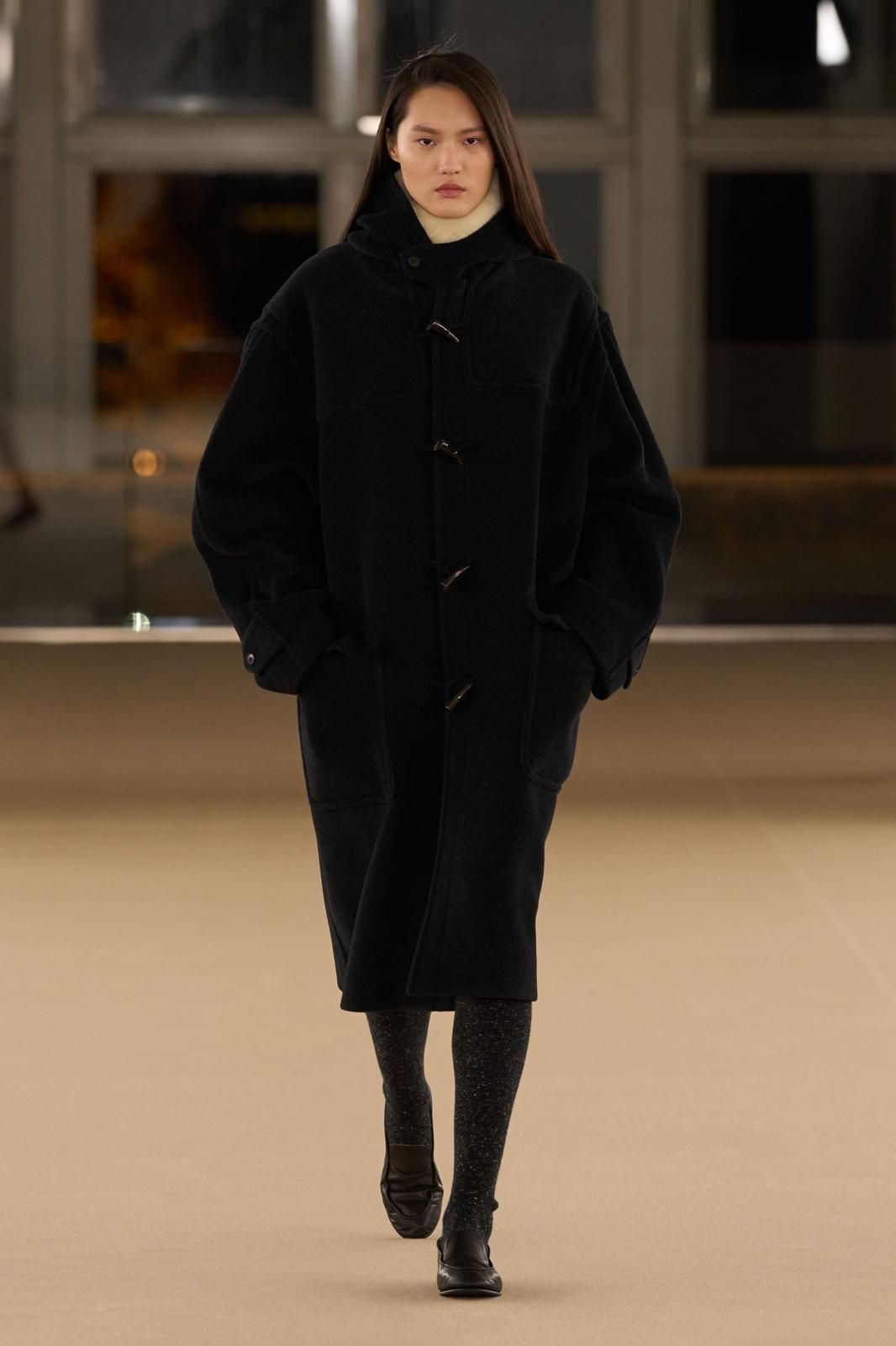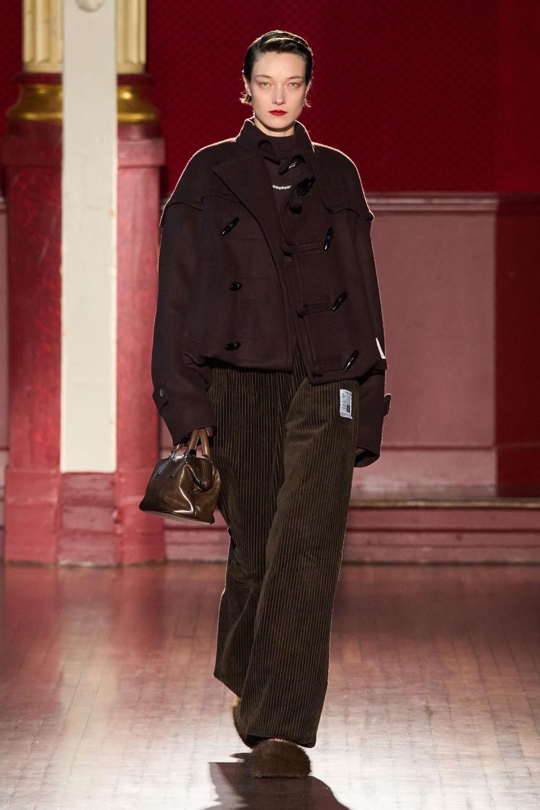 In alcuni casi il duffle coat conserva la sua attitudine preppy: Kenzo lo abbina a un maglione a scacchi, mentre nella FW26 di Thom Browne troviamo il cappotto in gabardine nel colore del classico trench inglese, portato sopra a un cardigan con trecce e una gonna a pieghe. Sempre preppy, Auralee ne ha proposto uno dalla silhouette anni ‘80, mentre da Officine Générale, Pierre Mahéo lo ha rifatto in spigato grigio. Sempre su questo genere, Henrik Vibskov ne firma uno nel classico blu navy, mentre da Maison Mihara Yasuhiro troviamo dei duffle coat “cropped” a doppiopetto che ricordano, per il taglio corto, il caban. Invece, Kolor ha presentati di lunghi e imbottiti con una striscia bianca alla base, quasi a ricordare le fasce catarifrangenti applicate sulle giacche dei pompieri.