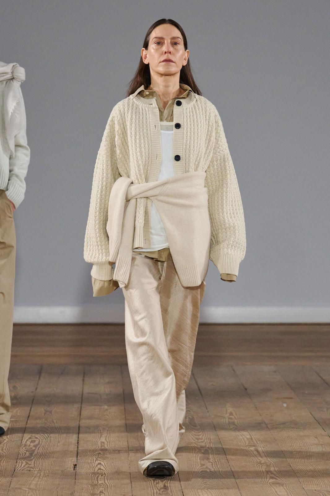 Per Alessandro Sartori da Zegna il maglione diventa un cimelio di famiglia attraversato da memorie e racconti, ripensato come un capo scomponibile e riutilizzabile: nell’ultima collezione FW26 si sono viste sciarpe che sembravano ricavate dalle maniche di un classico pullover che in alcuni look viene avvolto in vita come fosse una cintura. Da N. 21 e da Moschino si gioca con maglioni maculati e a strisce annodati in modo irregolare, mentre da Lanvin ne troviamo uno doppio a coste over che funge quasi da mantella. Anche durante la Berlin Fashion Week, SF1OG ha mostrato una sorta di sottile polo a righe annodata al collo come una skinny scarf, mentre Andrej Gronau ha abbinato maglioni in tonalità pastello legati in vita a stivali alti in pelle dalla punta quadrata.