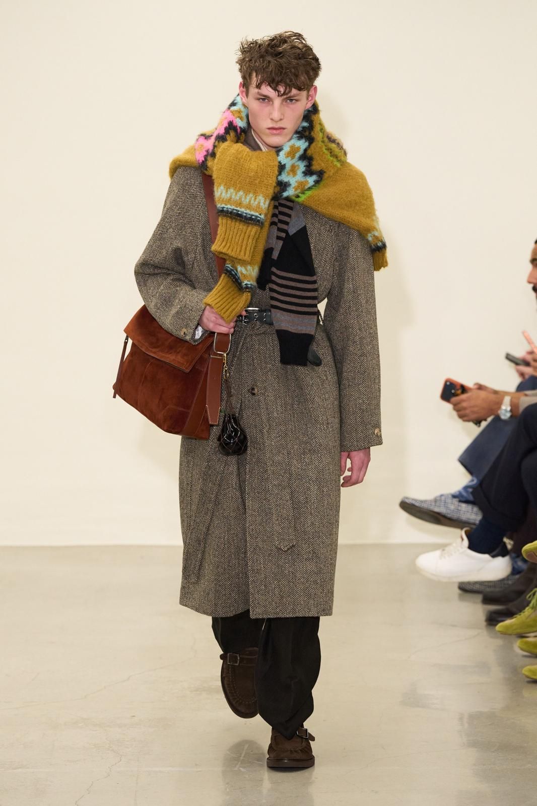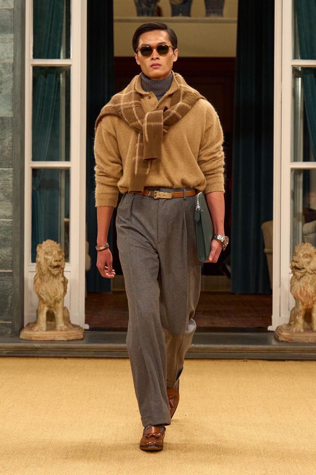 Questo “knot sweater effect” è stato avvistato anche nelle recenti fashion week maschili. Ralph Lauren, che questo stile l’ha praticamente inventato, ha mostrato a Milano una serie di pullover portati su polo in lana e su classici loden o legati in vita. Qualcosa di simile si è visto anche da Etro e Paul Smith. In particolare, nel caso di Smith, sono stati sovrapposti a un cappotto grigio diversi maglioni a righe colorate o con i classici motivi norvegesi. Anche Rocco Iannone da Ferrari ha adottato la stessa tecnica presentando nella sua ultima Pre-Fall dei maglioni dalle texture ruvide annodati in modo casual su completi di pelle o in tessuto tecnico.