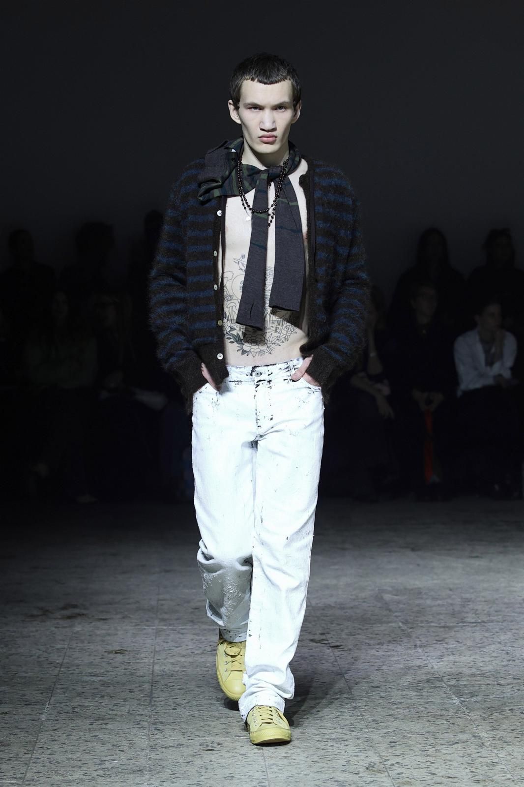 Sia ERL che Ami Paris richiamano lo stile preppy evocato dal maglione annodato sulle spalle: nel caso di quest’ultimo brand il pullover diventa una sorta di sciarpa di fortuna che aggiunge un tocco caotico di estro al look. E in questo e altri casi, il maglione annodato è stato usato per creare dei contrasti materici su look monocromatici: se Aiayu ha avvolto un maglioncino intorno a un cardigan, da ssstein il pullover annodato serve a definire la silhouette di una lunga canotta di seta.