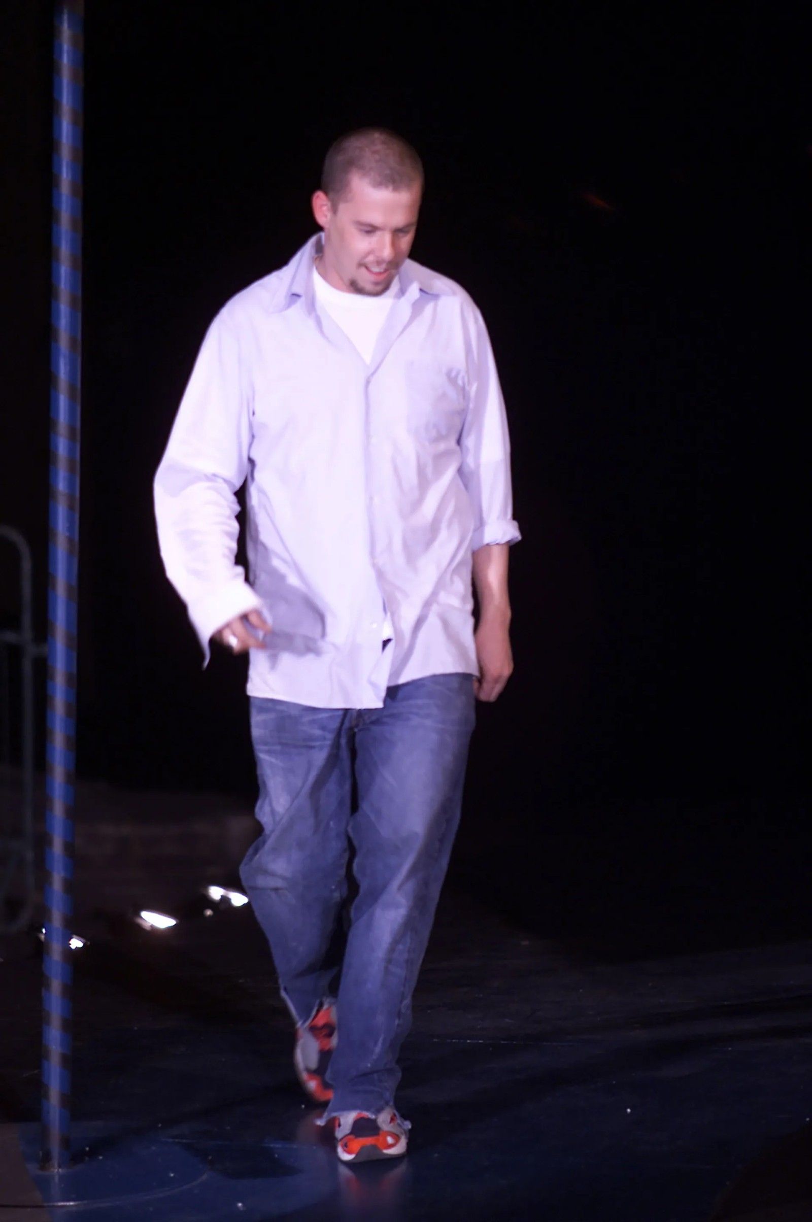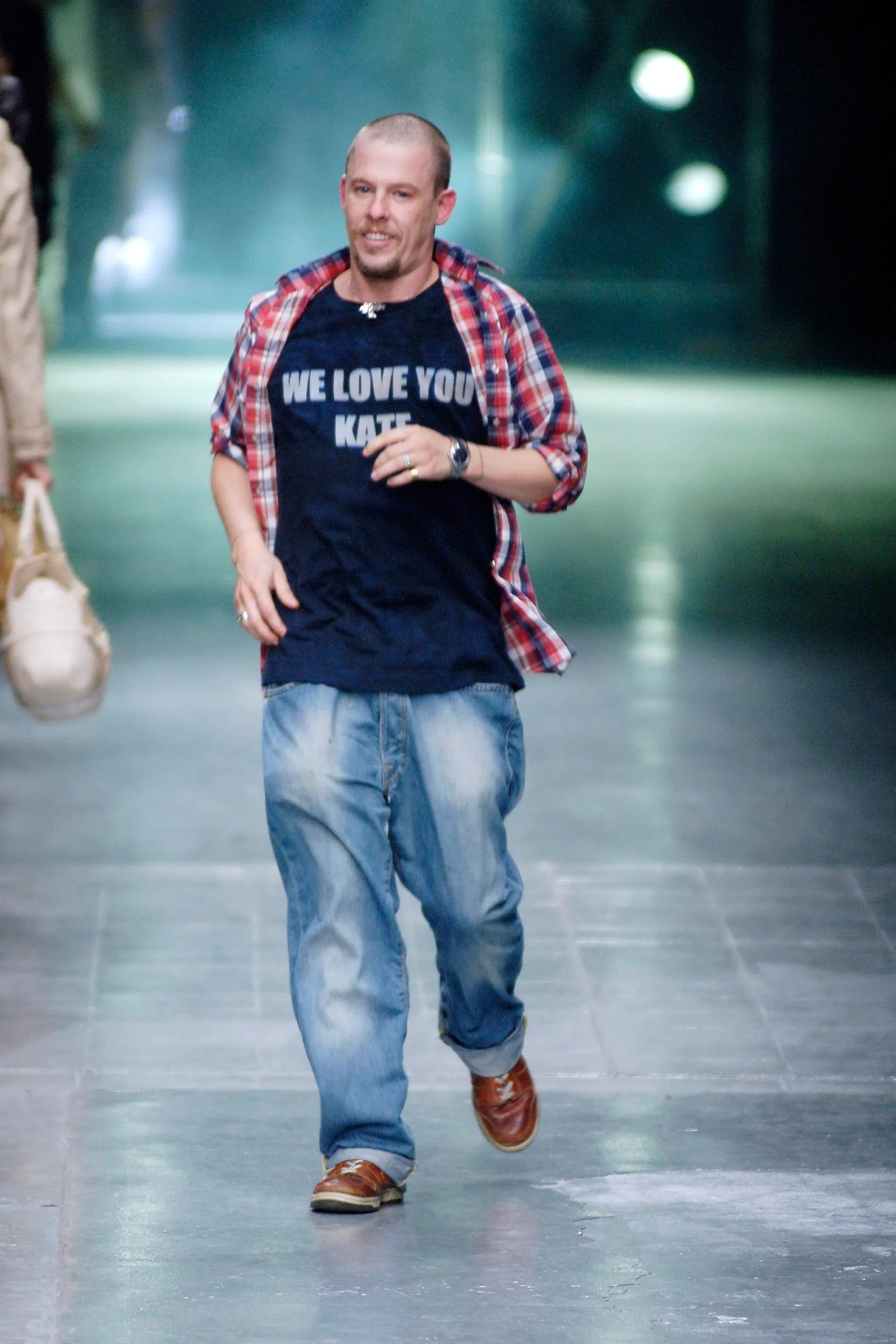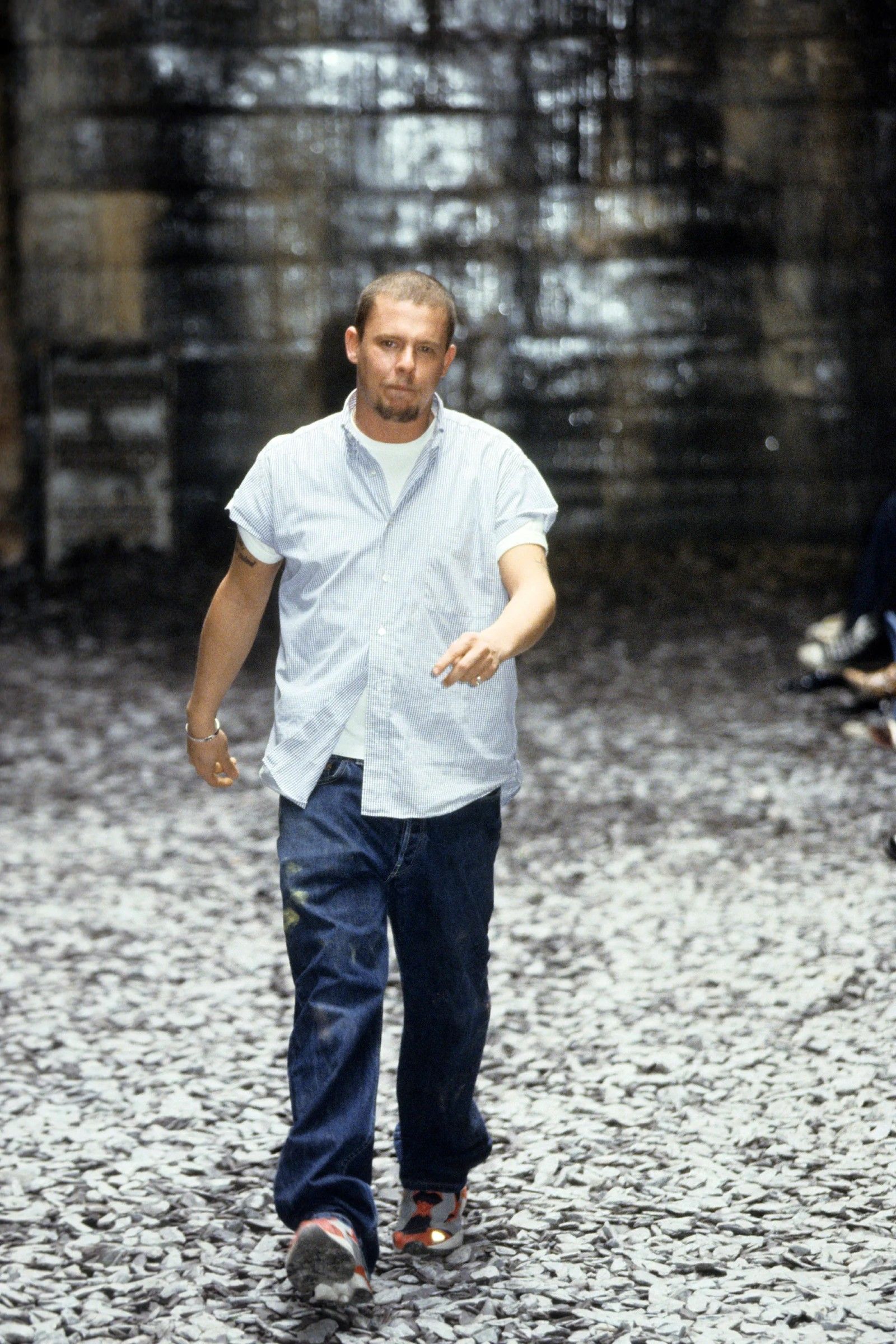 Ma aiutano ancora di più le descrizioni che vengono dalle sue biografie. In Gods & Kings, Dana Thomas dice che indossava logore t-shirt e jeans sia nei giorni spesi a Savile Row che alla London Fashion Week del ’93. Al suo primo giorno di scuola al CSM viene ricordato con jeans da raver a zampa e una giacca da baseball vintage. In Blood Beneath the Skin di Andrew Wilson invece si trovano altri riferimenti più variegati.
