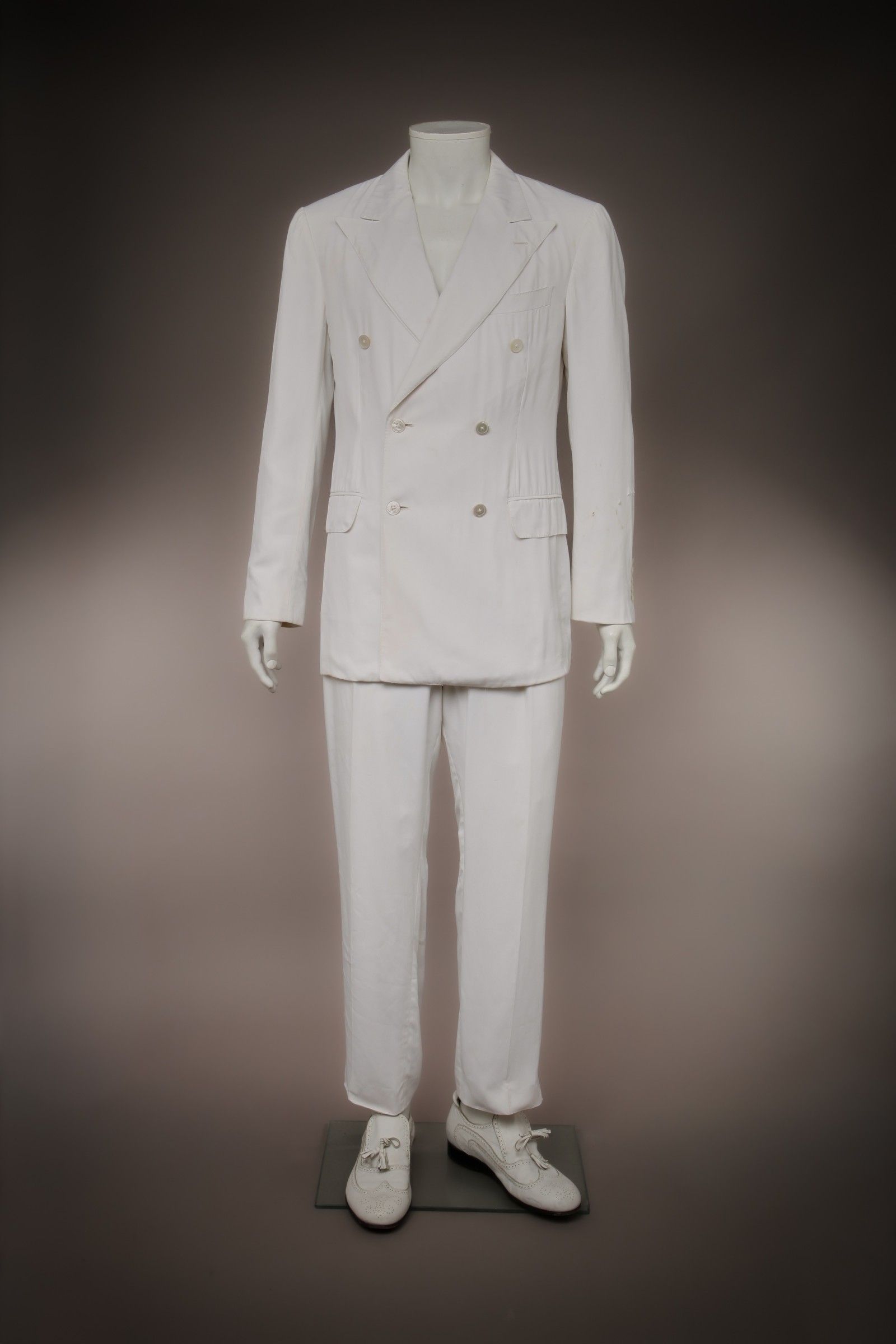 La selezione si apre con un completo doppiopetto bianco in viscosa della SS03 di Gucci indossato dal designer per il Gala del CFDA a New York nel 2003 e poi ancora nel finale dello show FW04 Pantheon ad Lucem. Sempre del Gucci di Tom Ford (di cui probabilmente McQueen amava la silhouette rigida e incisiva) ci sono anche due cappotti: uno di montone rovesciato e un altro, lungo e di pelle e privo di colletto, della collezione FW01.